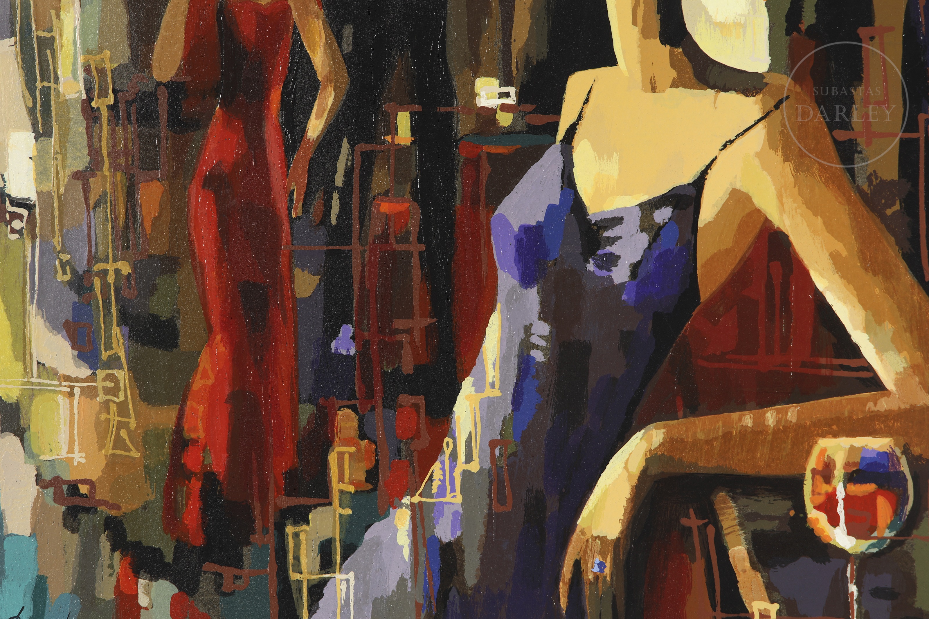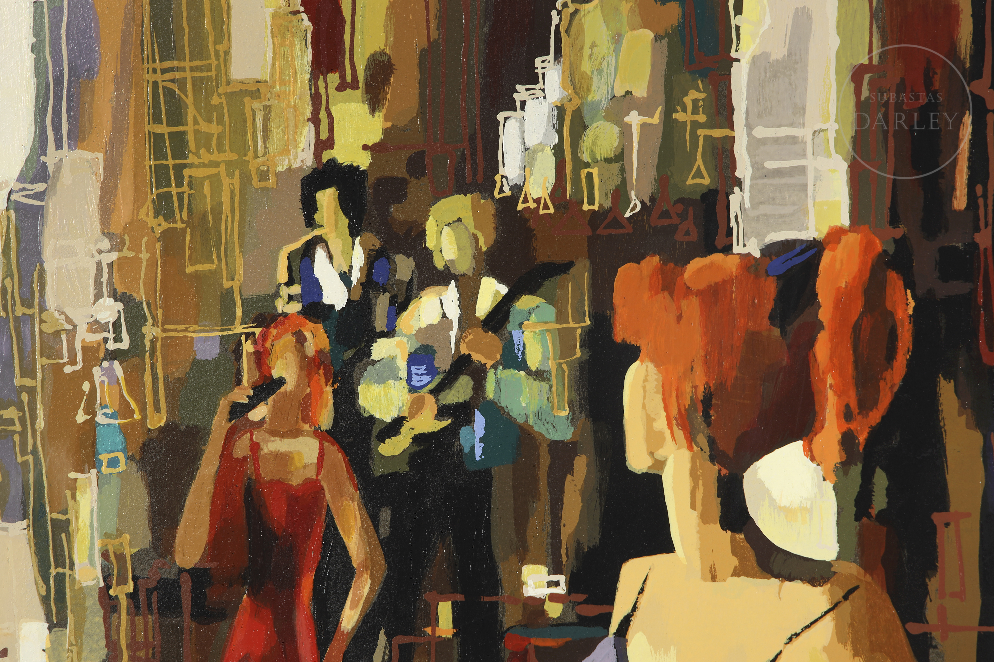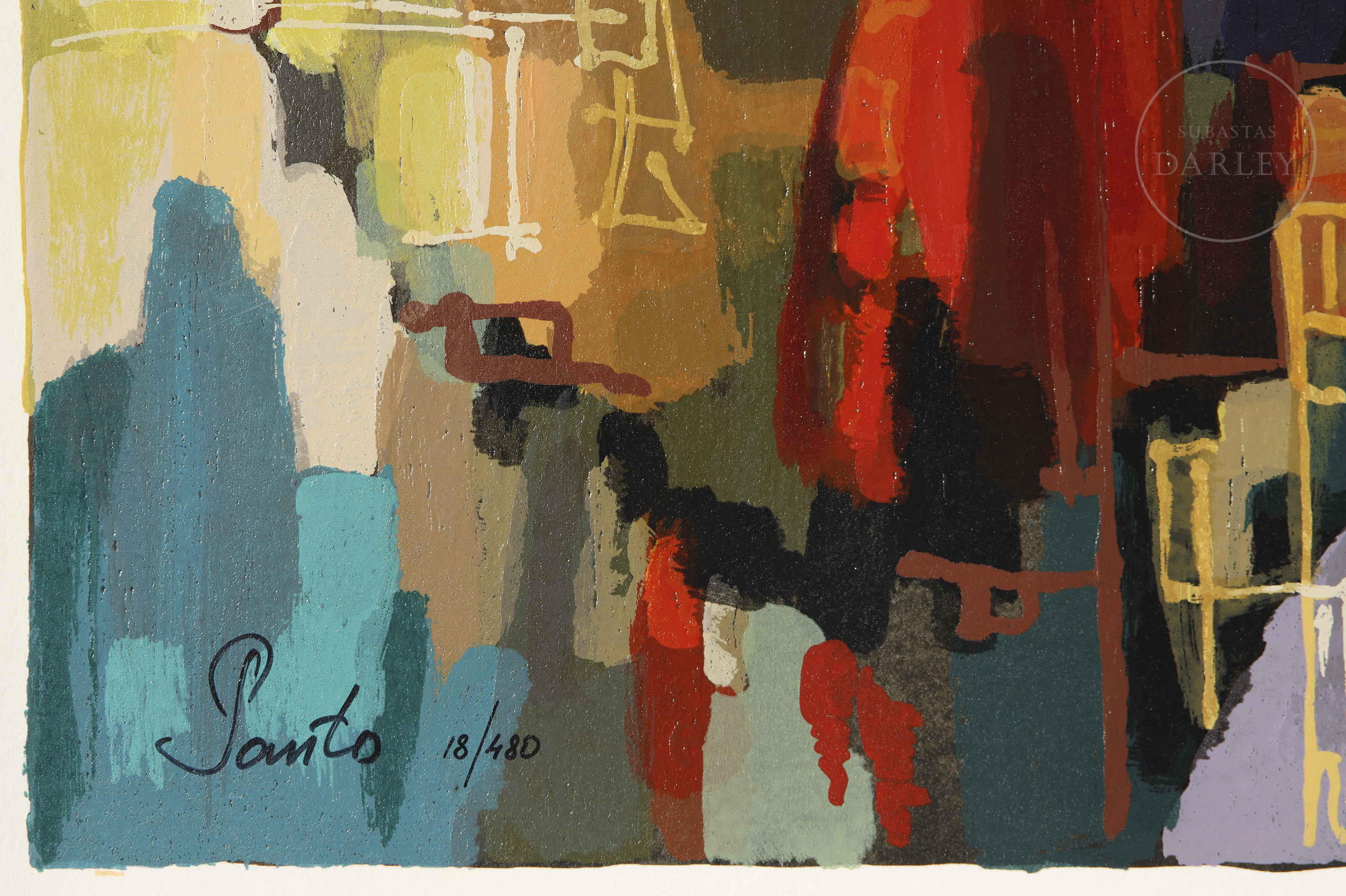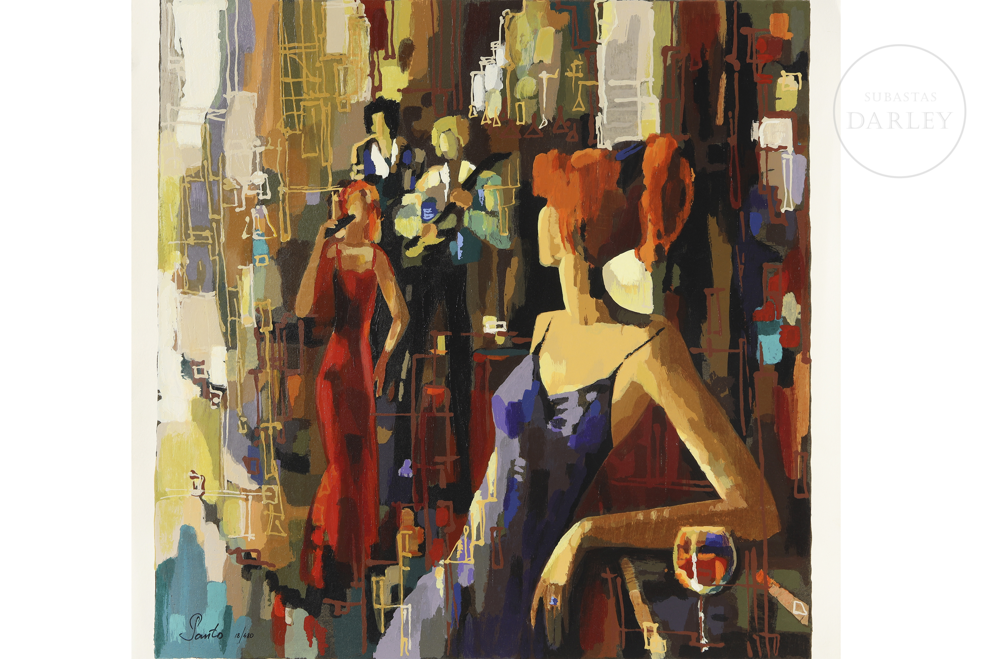 Silkscreen print on paper. Composition capturing a night scene in an entertainment venue. Notable for its vibrant colours. Signed and numbered ‘Santo 18/480’ in the lower left corner.
