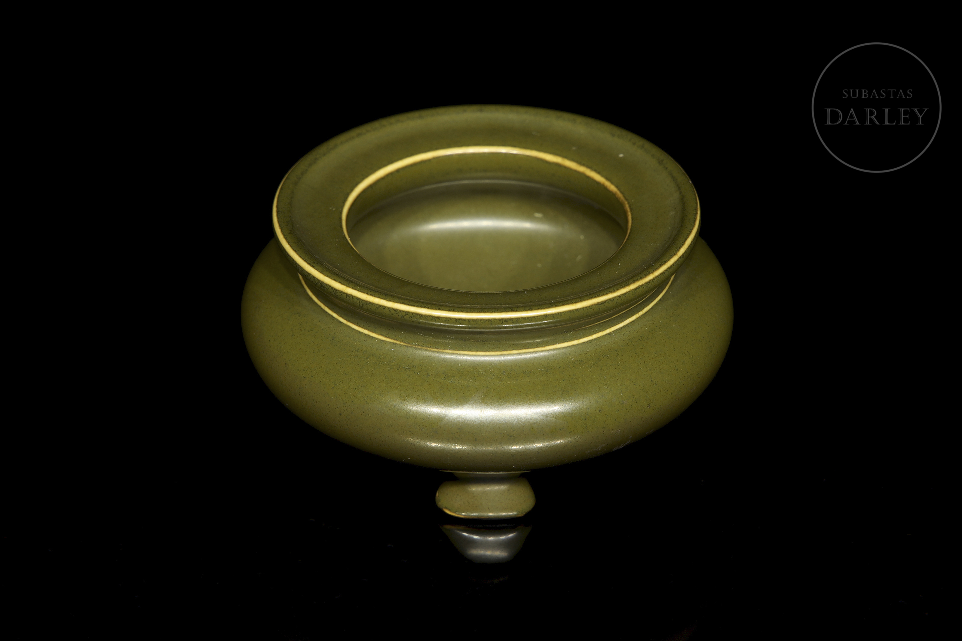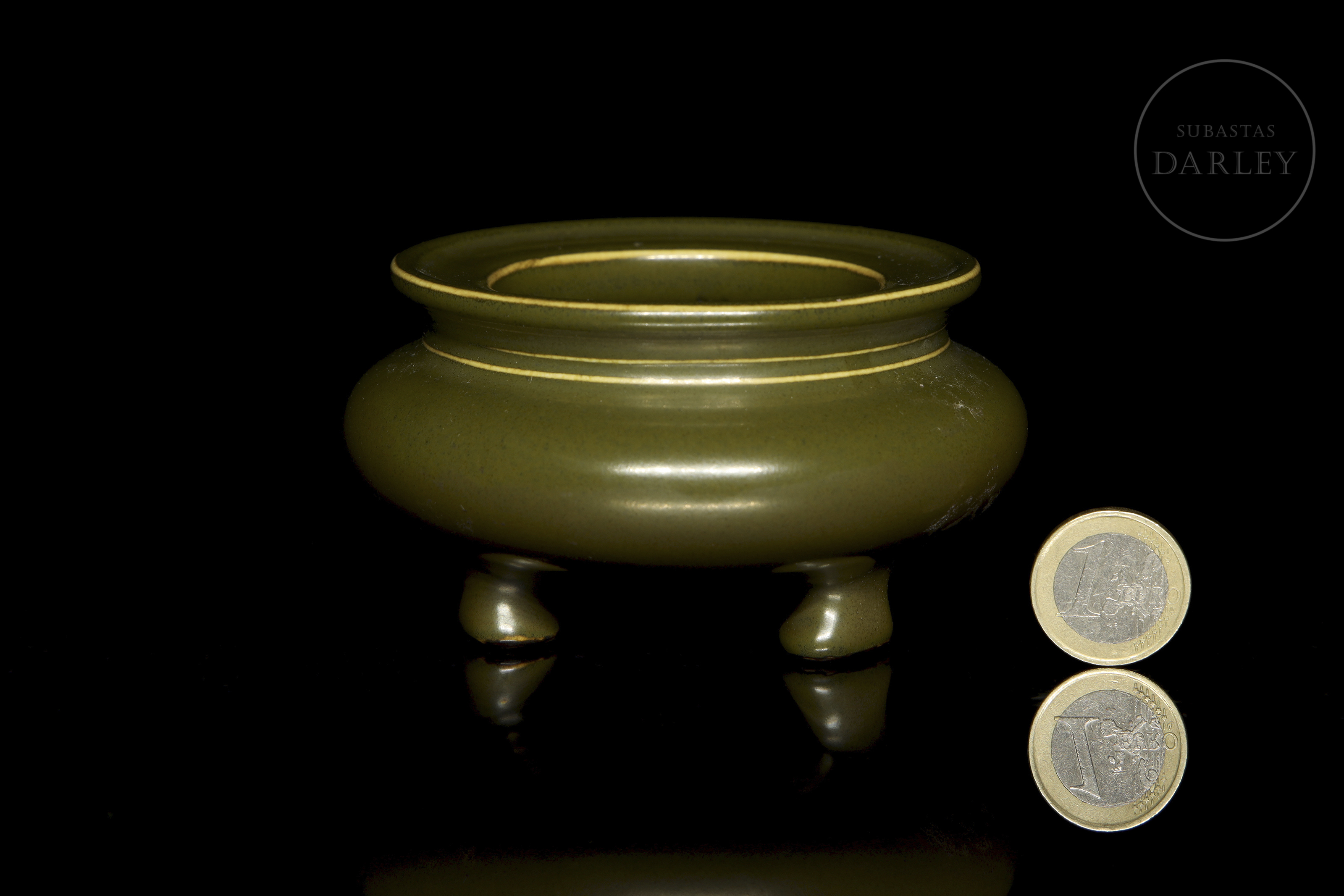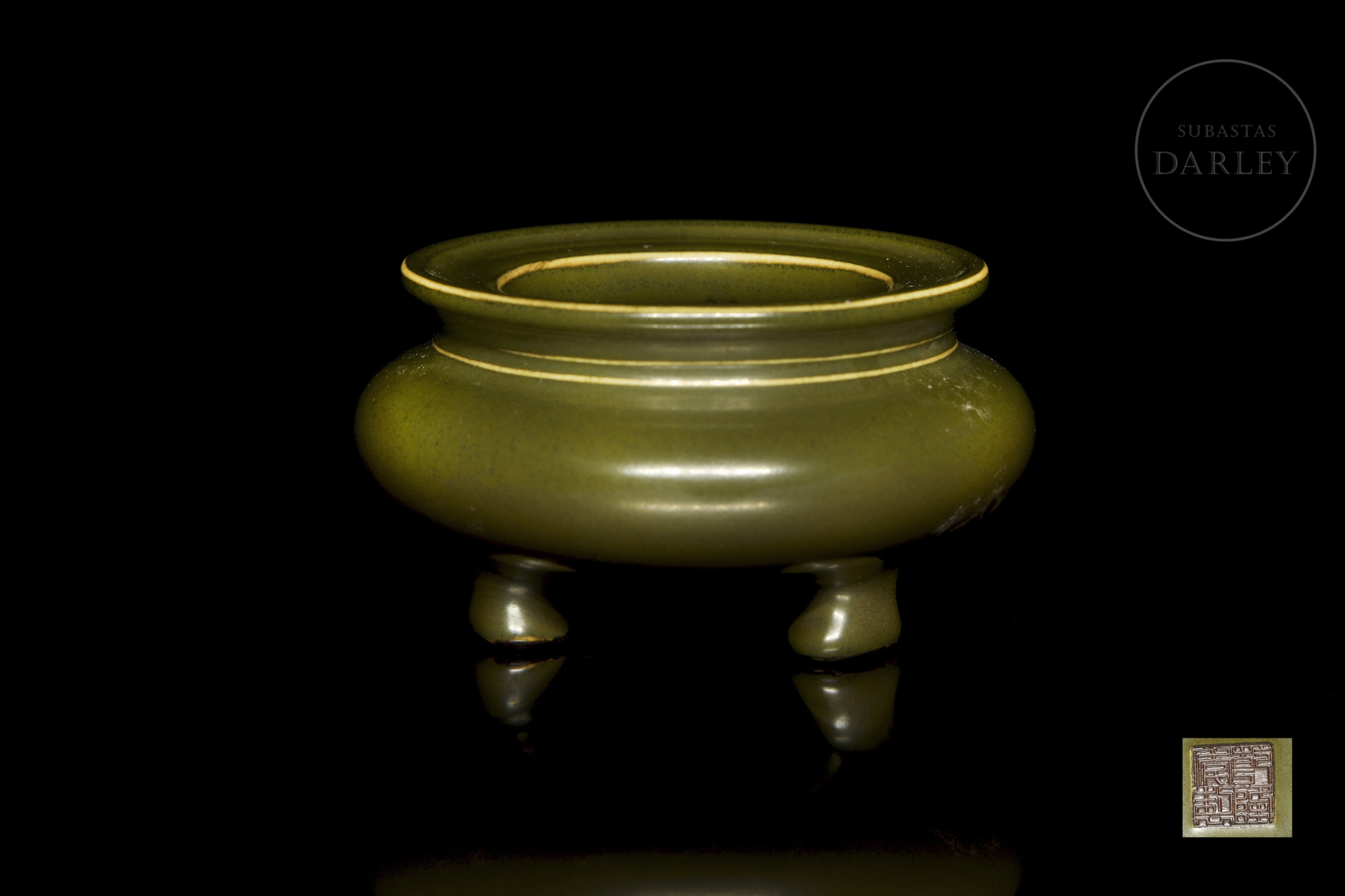Home > Direct Sale > Asian Porcelain & Ceramics > Olive green porcelain tripod incense burner, with Qianlong seal