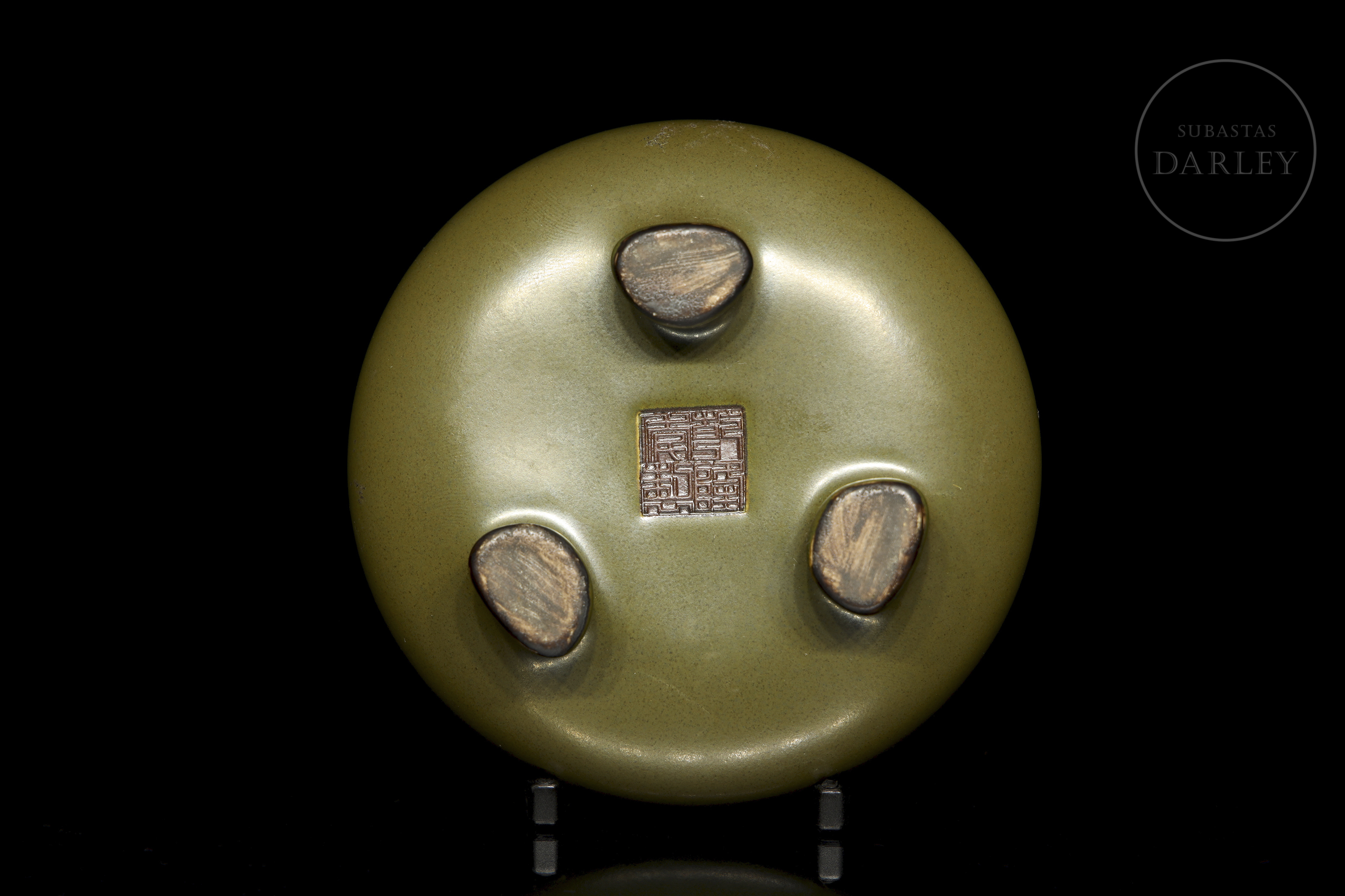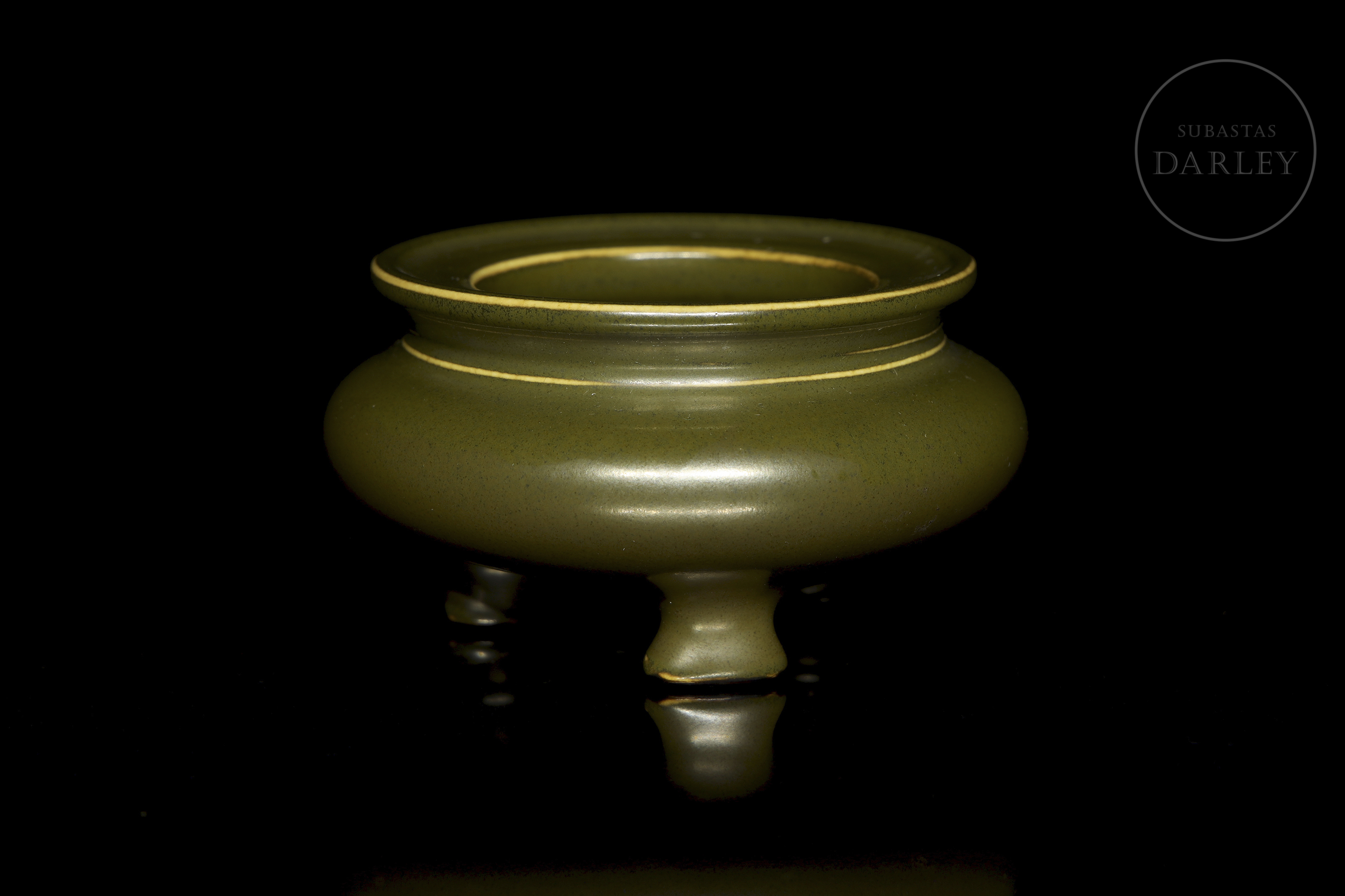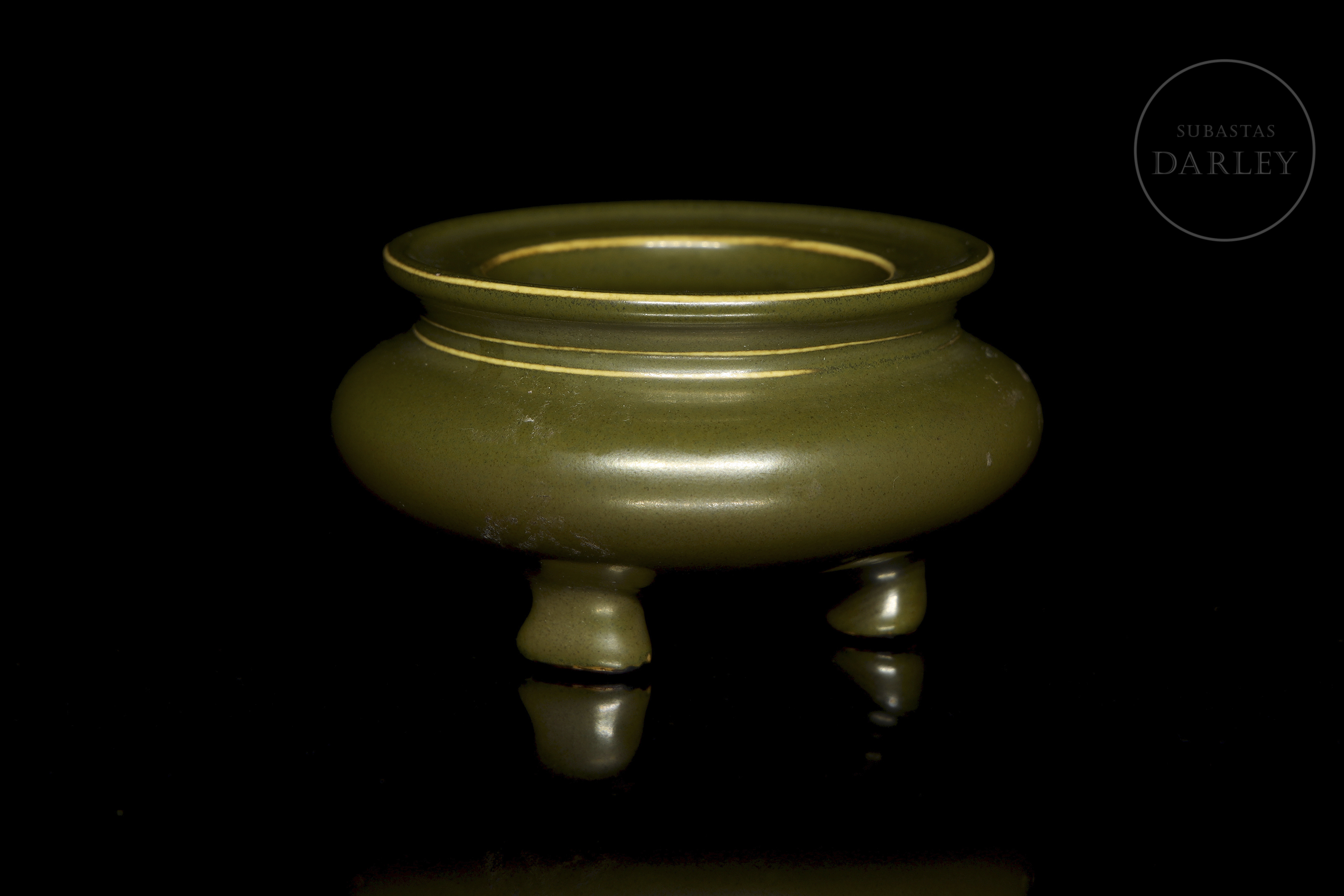 Home > Direct Sale > Asian Porcelain & Ceramics > Olive green porcelain tripod incense burner, with Qianlong seal