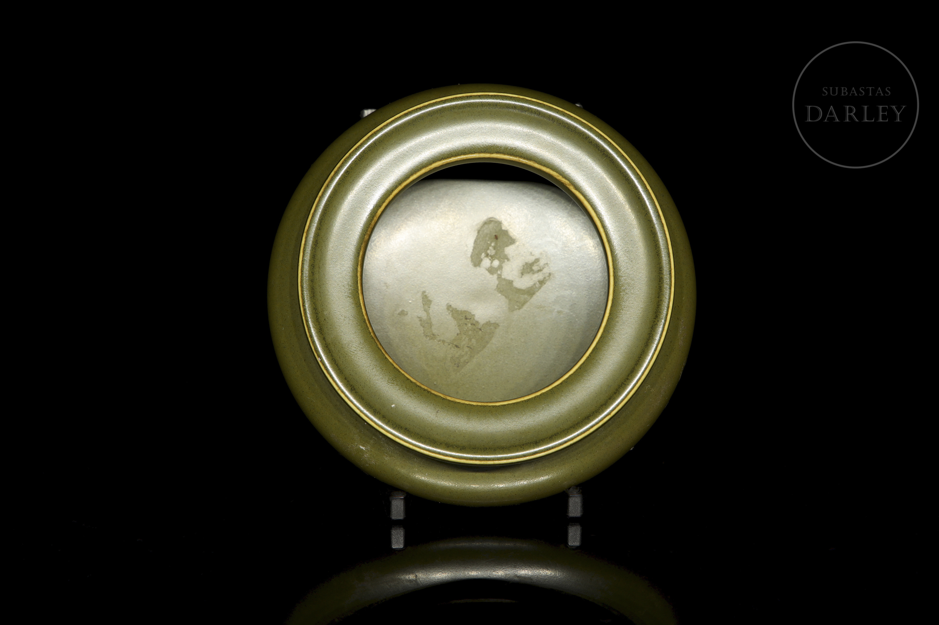 Glazed porcelain in olive green, with a globular body, wide mouth and slightly everted rim, supported by three short legs with a rounded section. The surface is completely smooth, with a uniform and soft glaze. On the base, there is a raised stamp indicating ‘乾隆年制’.