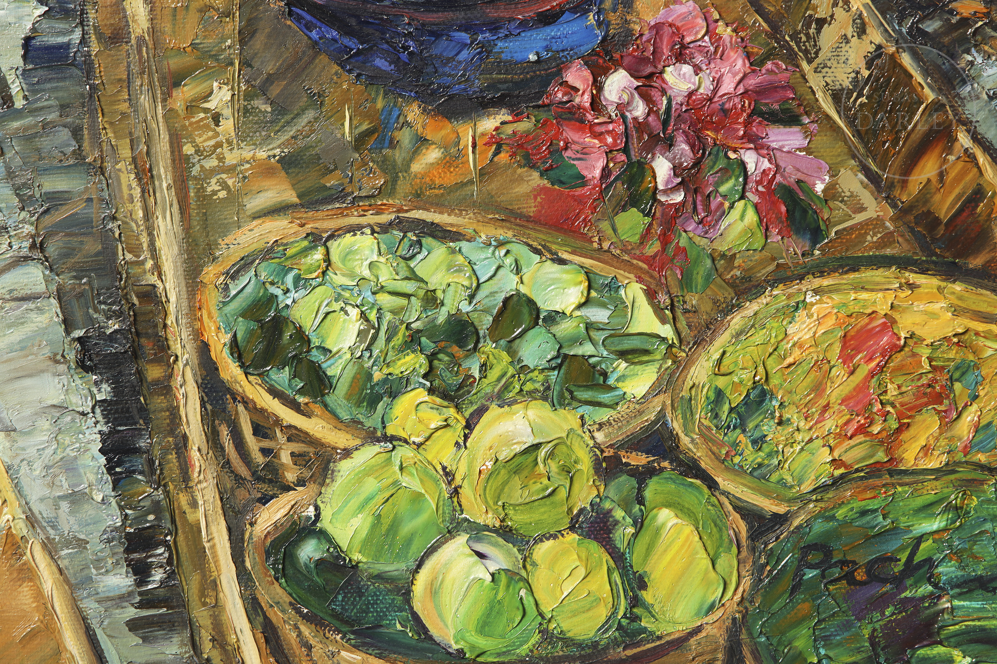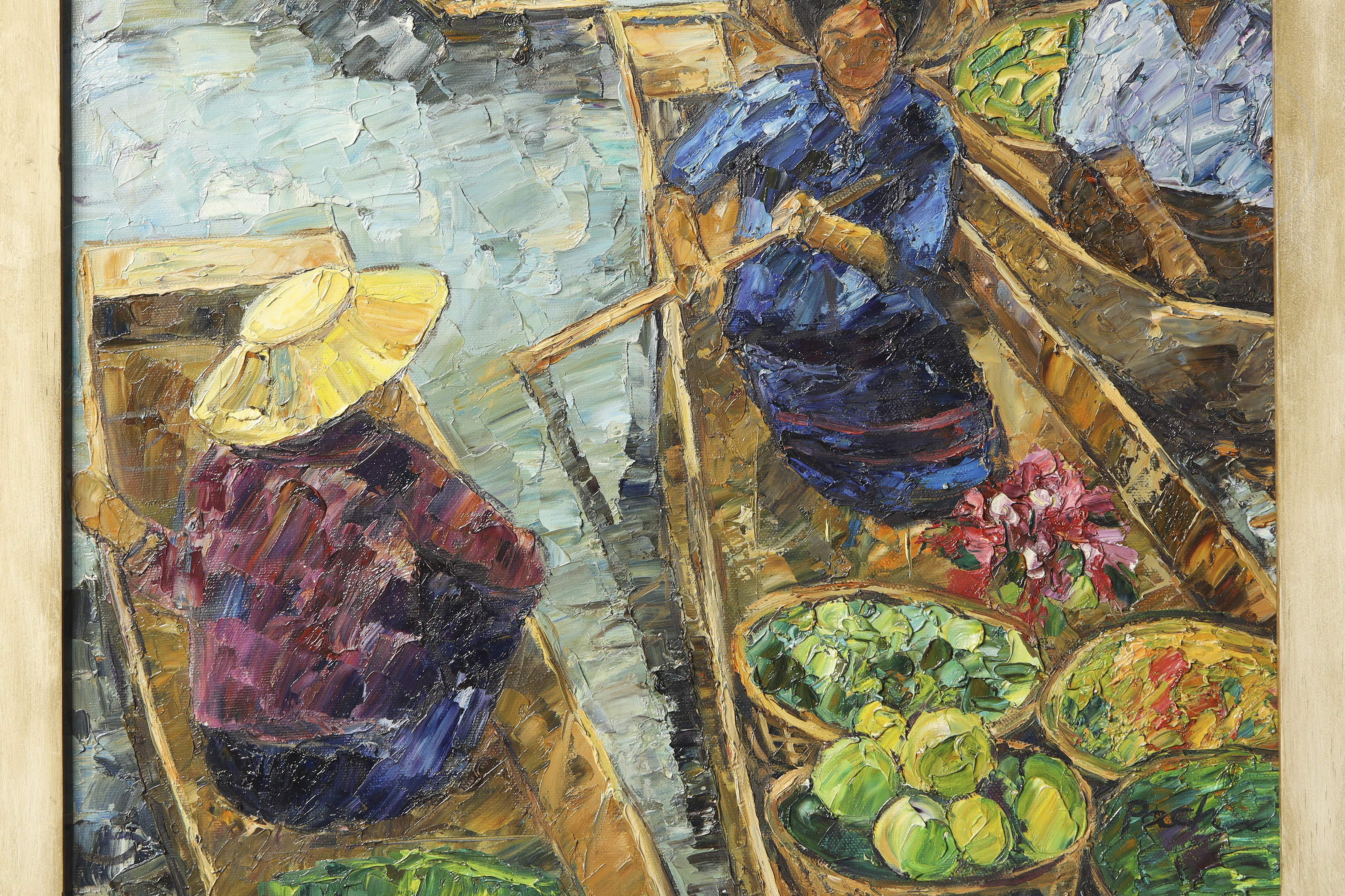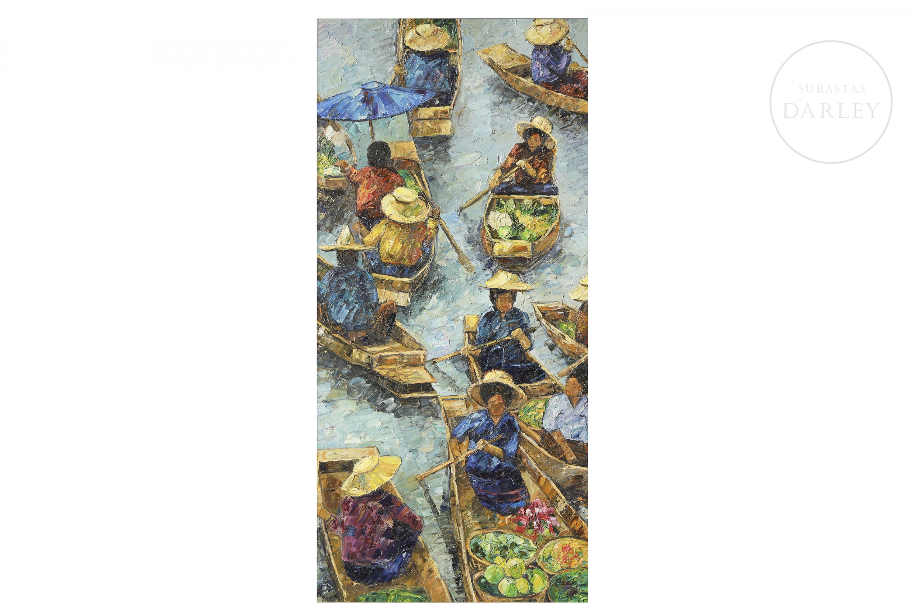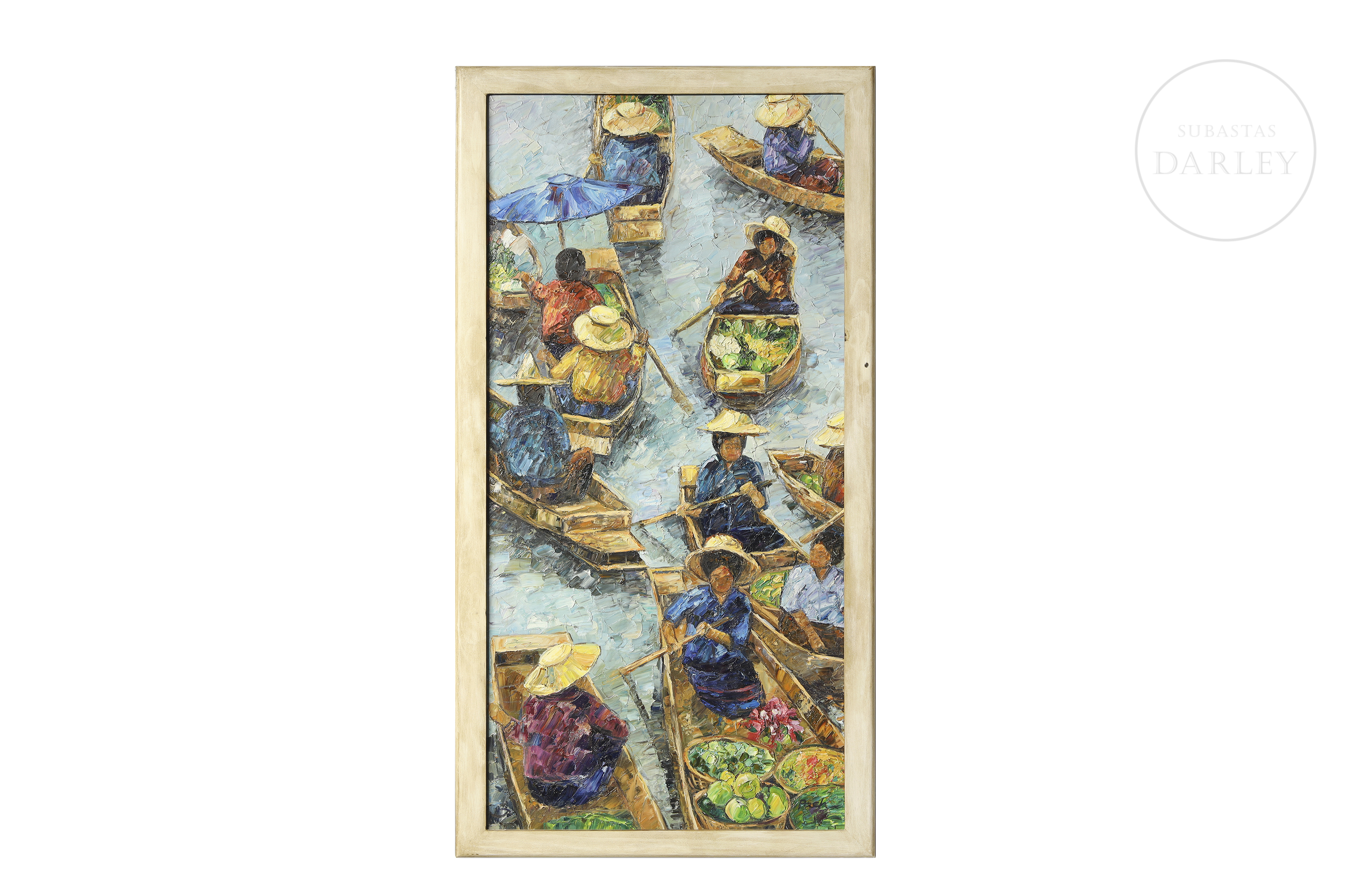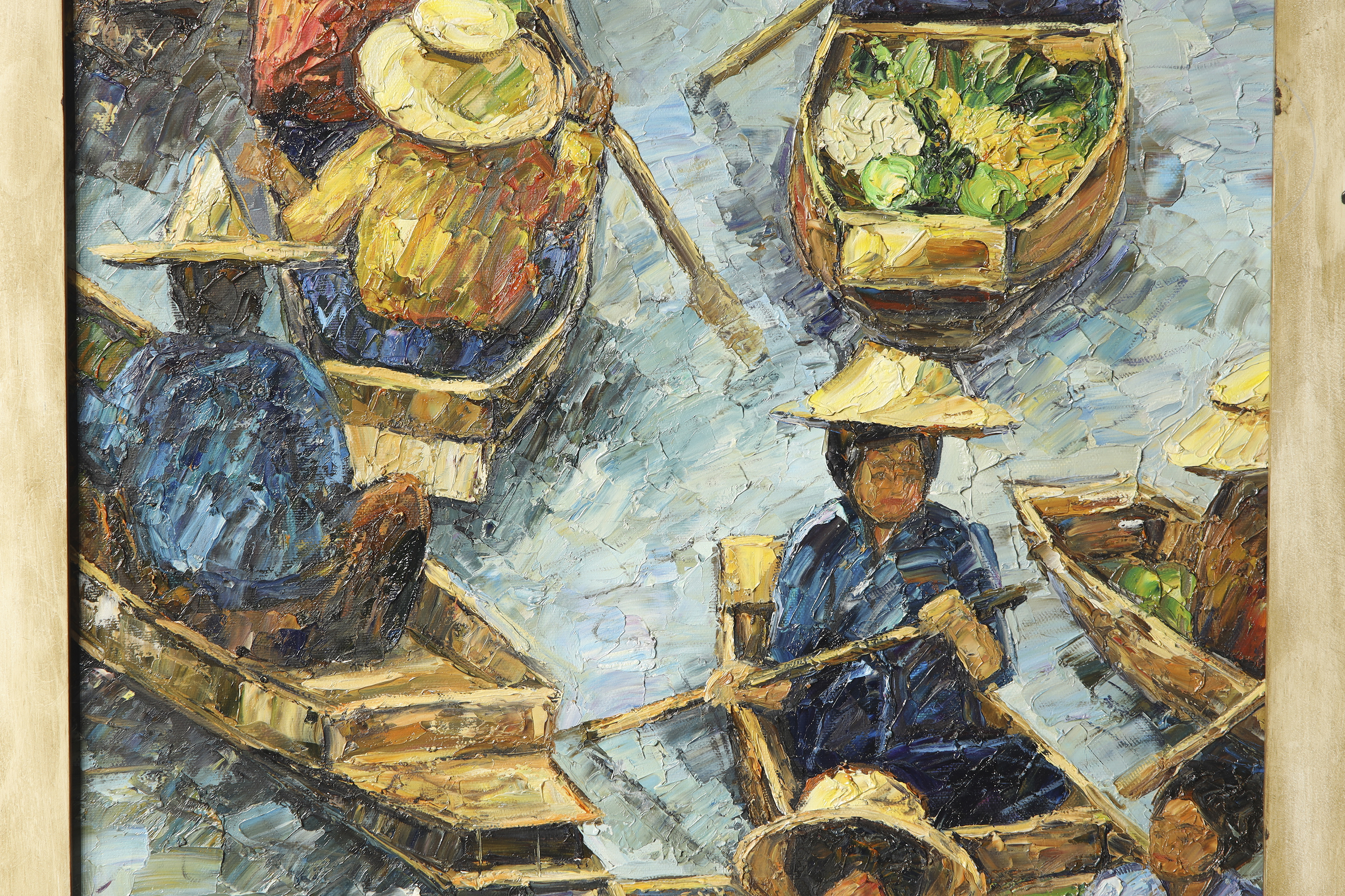 Oil on canvas. Vertical format genre scene depicting an Asian floating market. Signed ‘Pachx’ in the lower left corner.