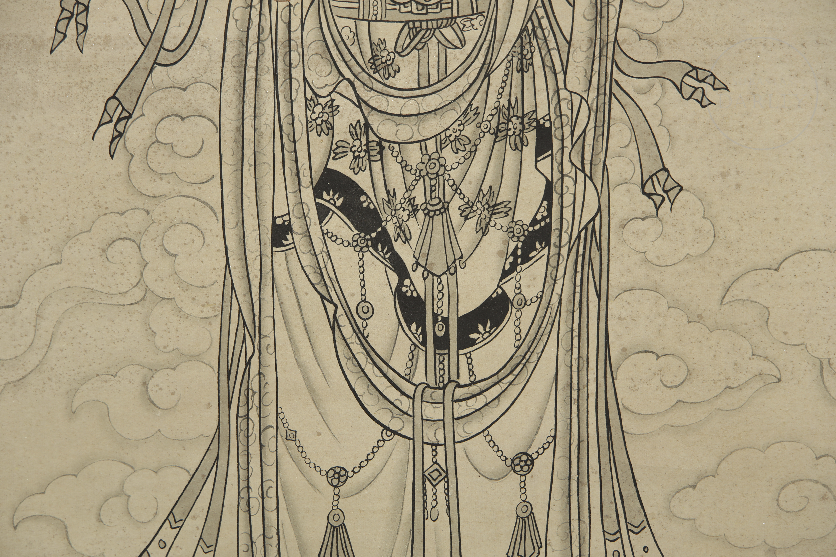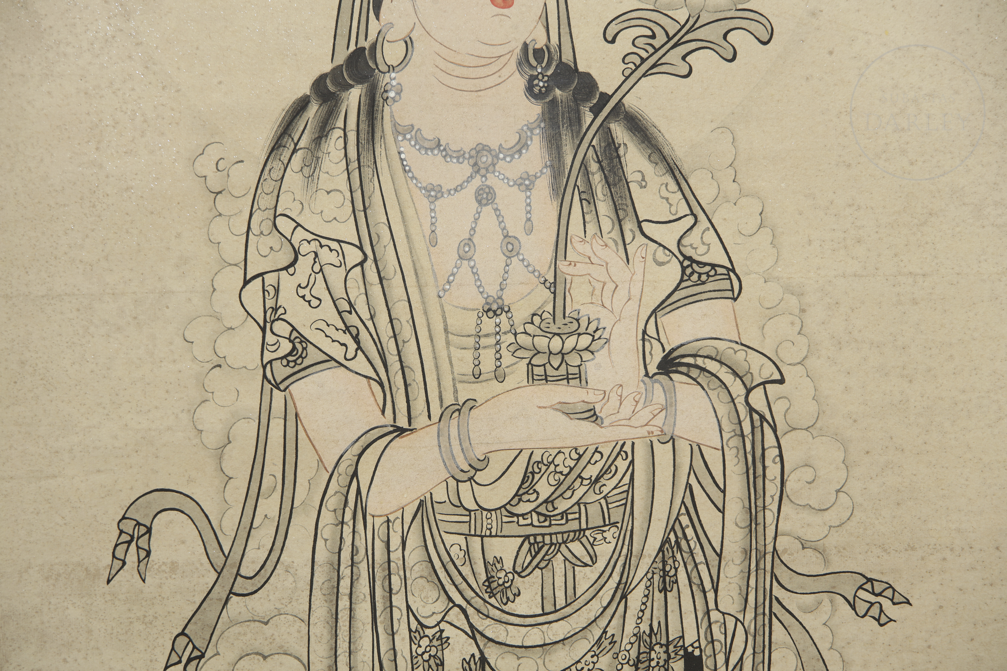 Watercolour, ink and pigments on paper. The deity stands upright on a lotus-shaped base emerging from a sea of sinuous clouds. The figure is shown holding a lotus flower in her hands, adorned with intricate beaded necklaces and flowing robes. There is an inscription and the signature ‘张大千’ in the upper left margin next to two seals.