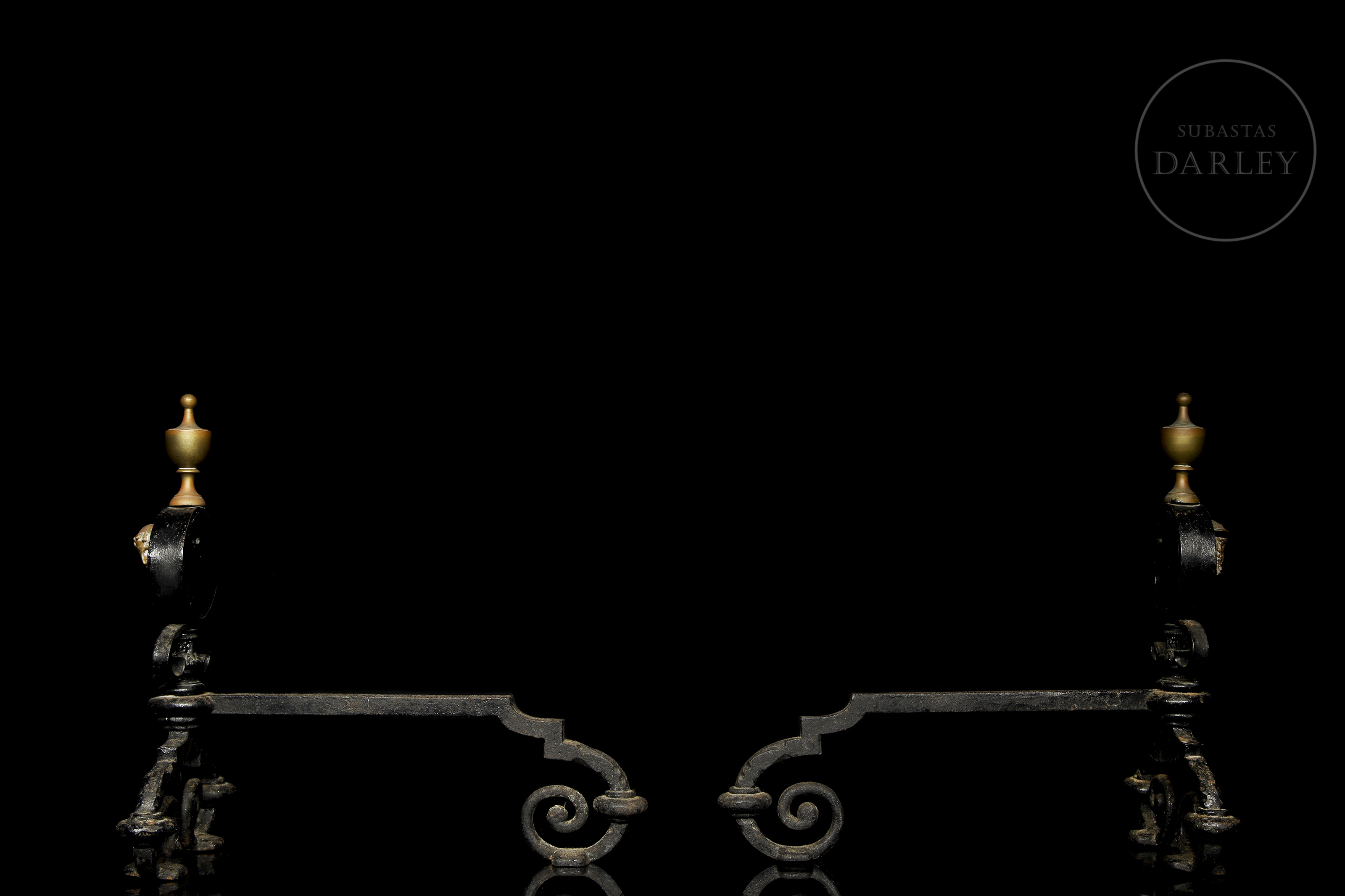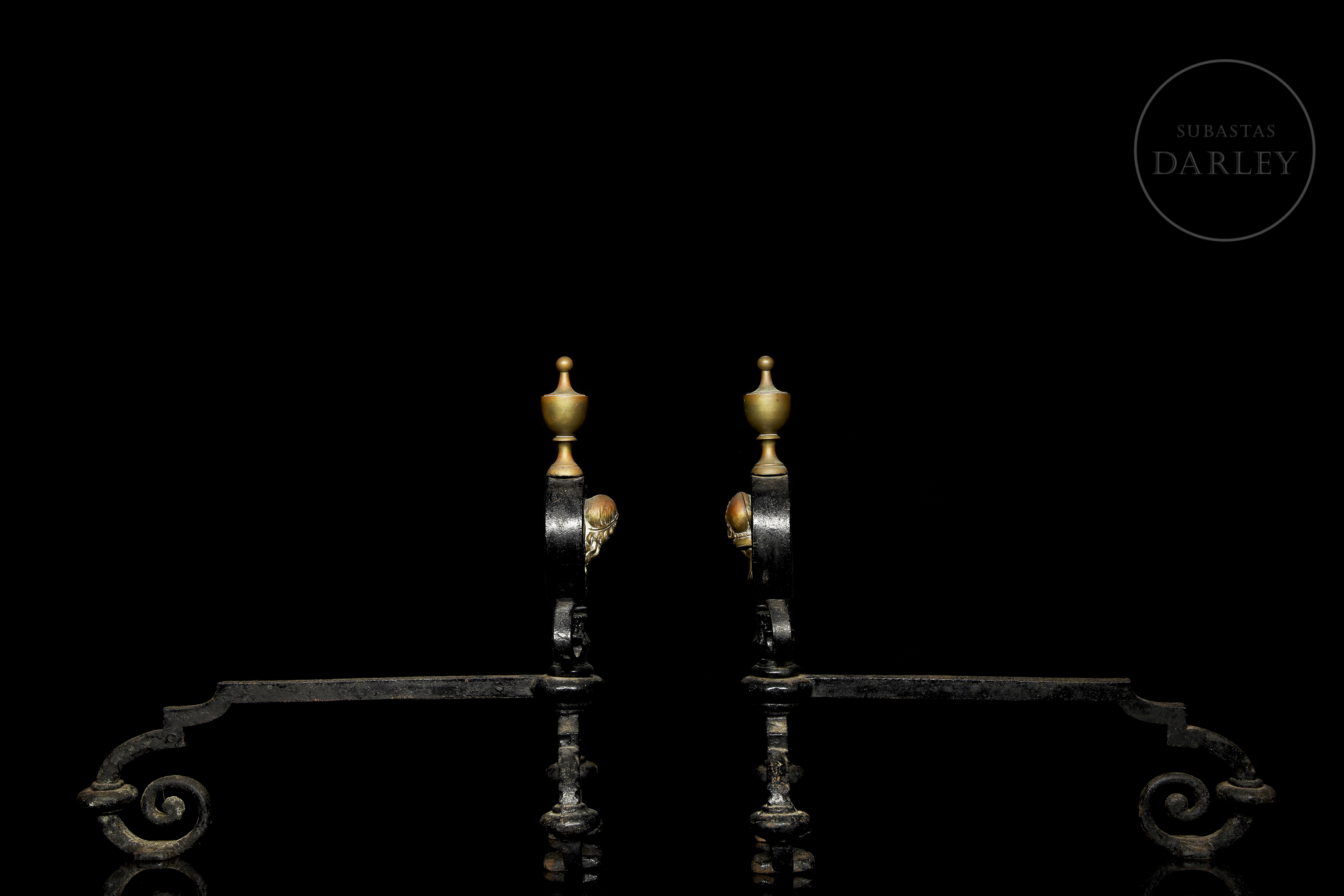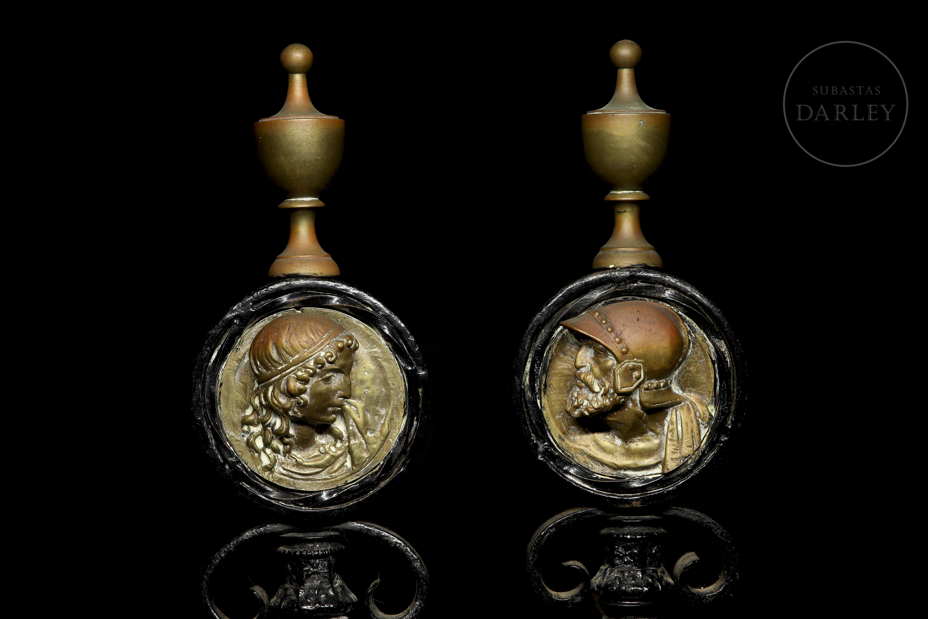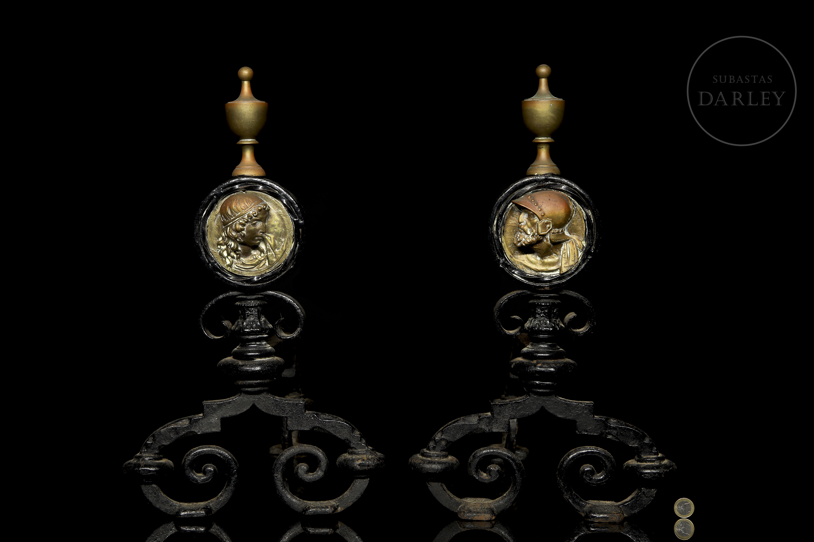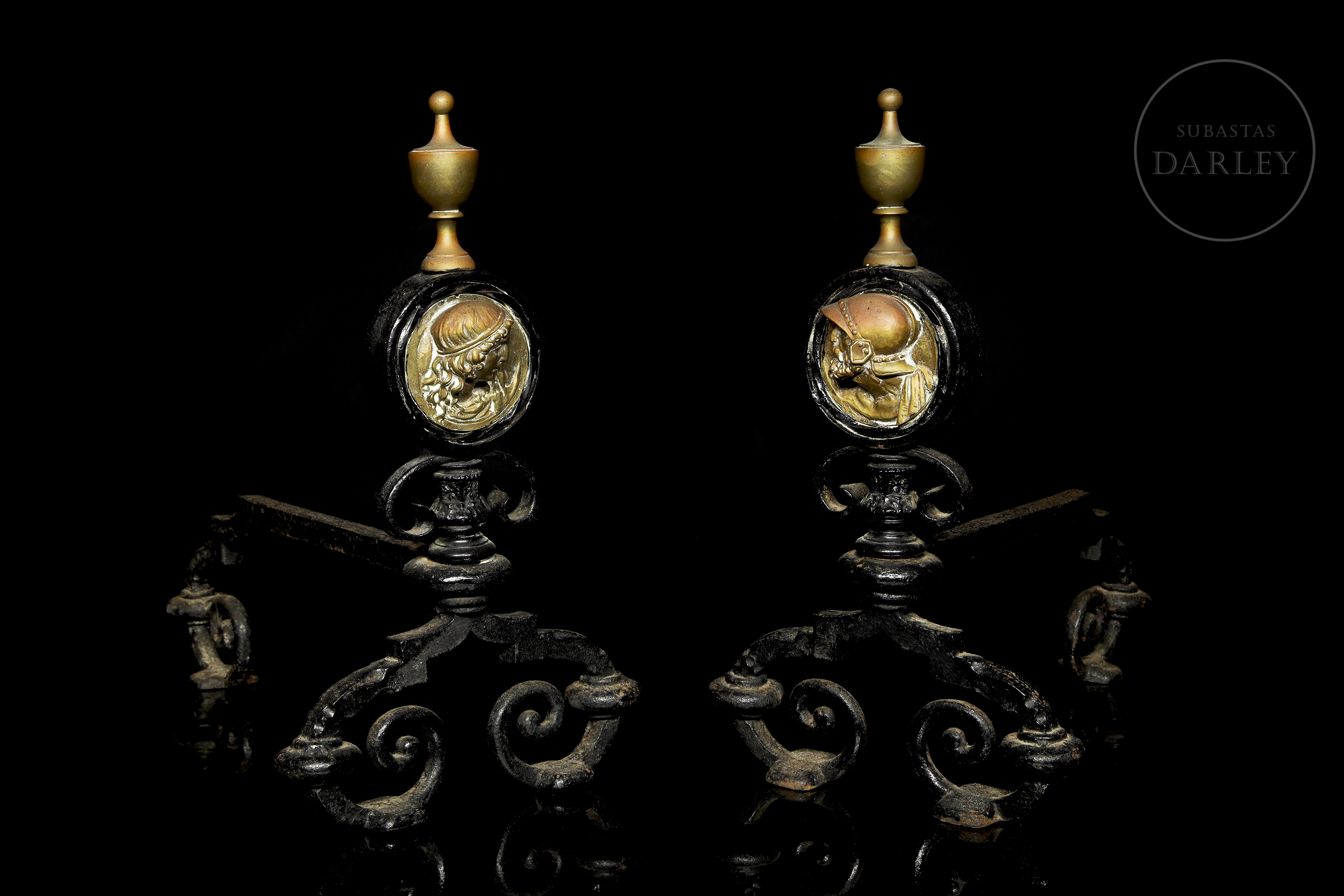 Two chimney-pieces to hold logs of firewood. Adorned with a central medallion with portraits in gilt bronze.