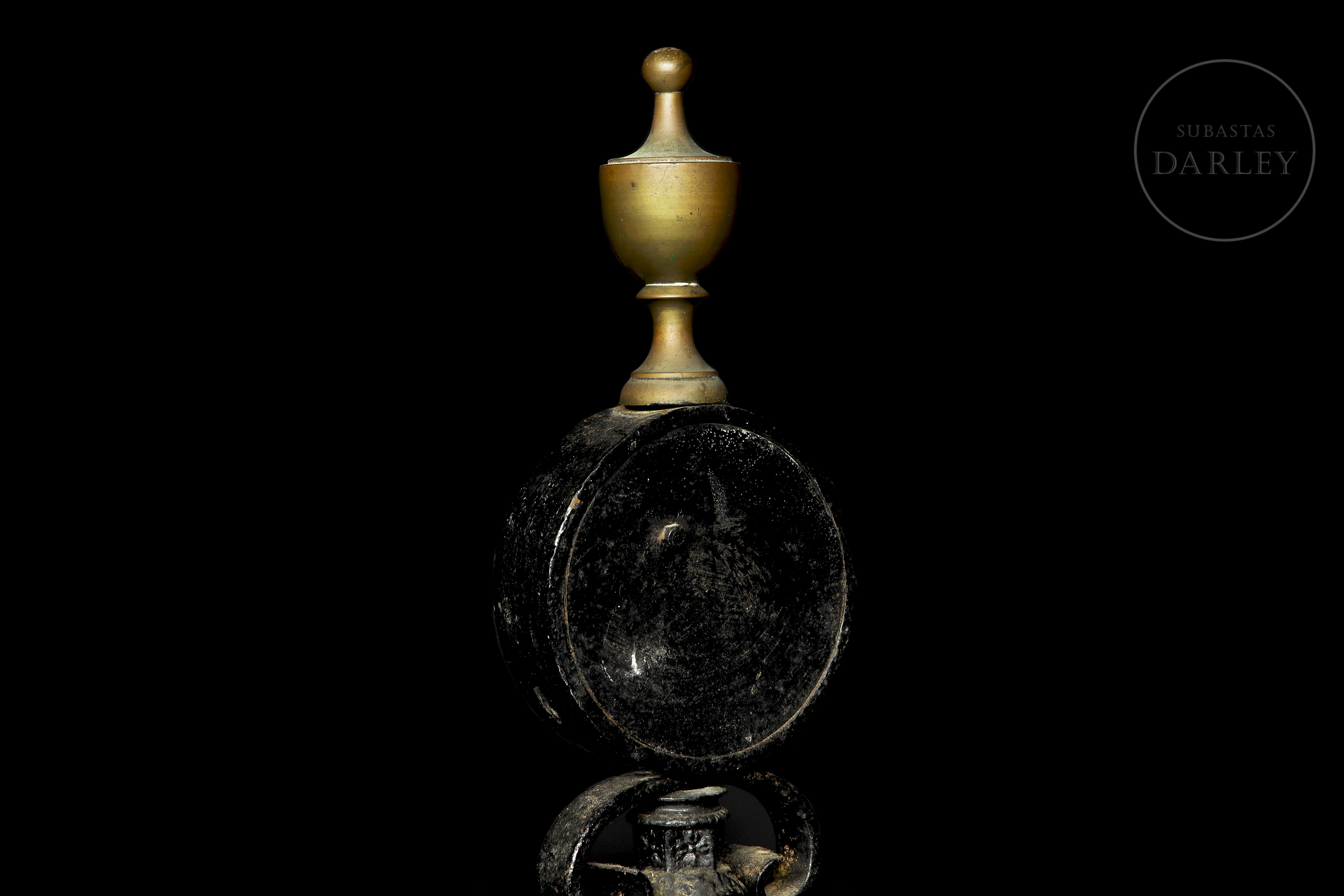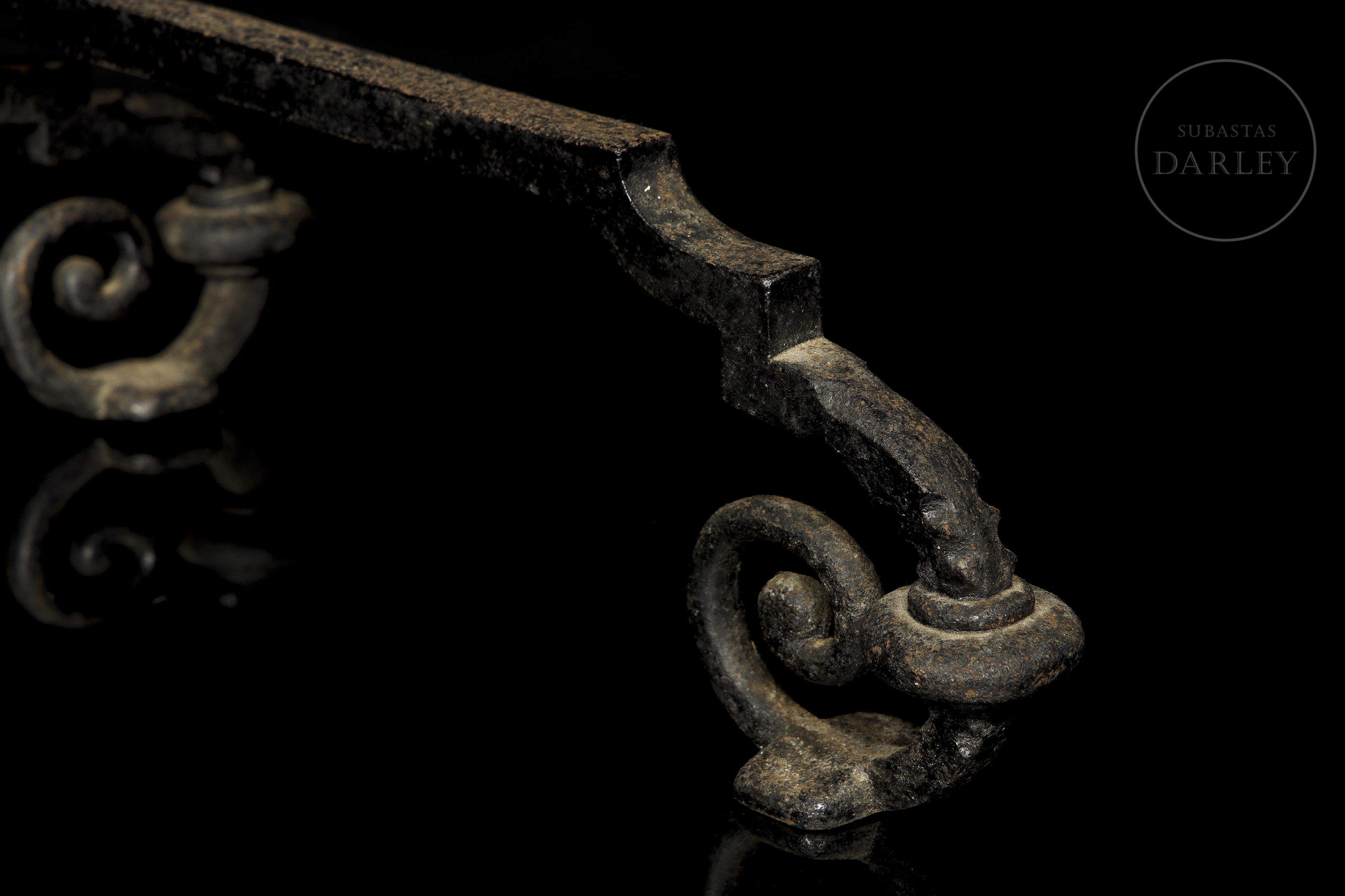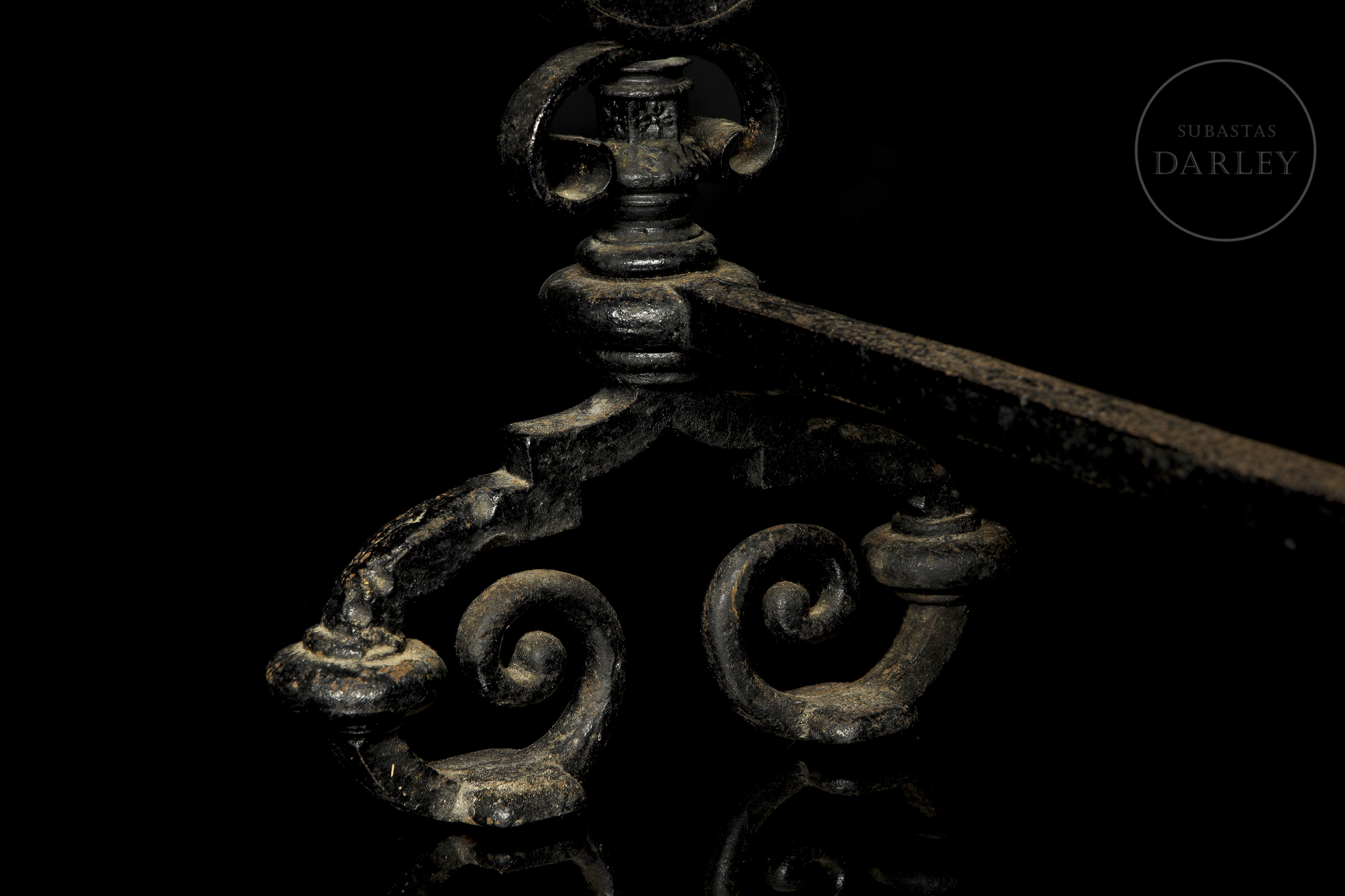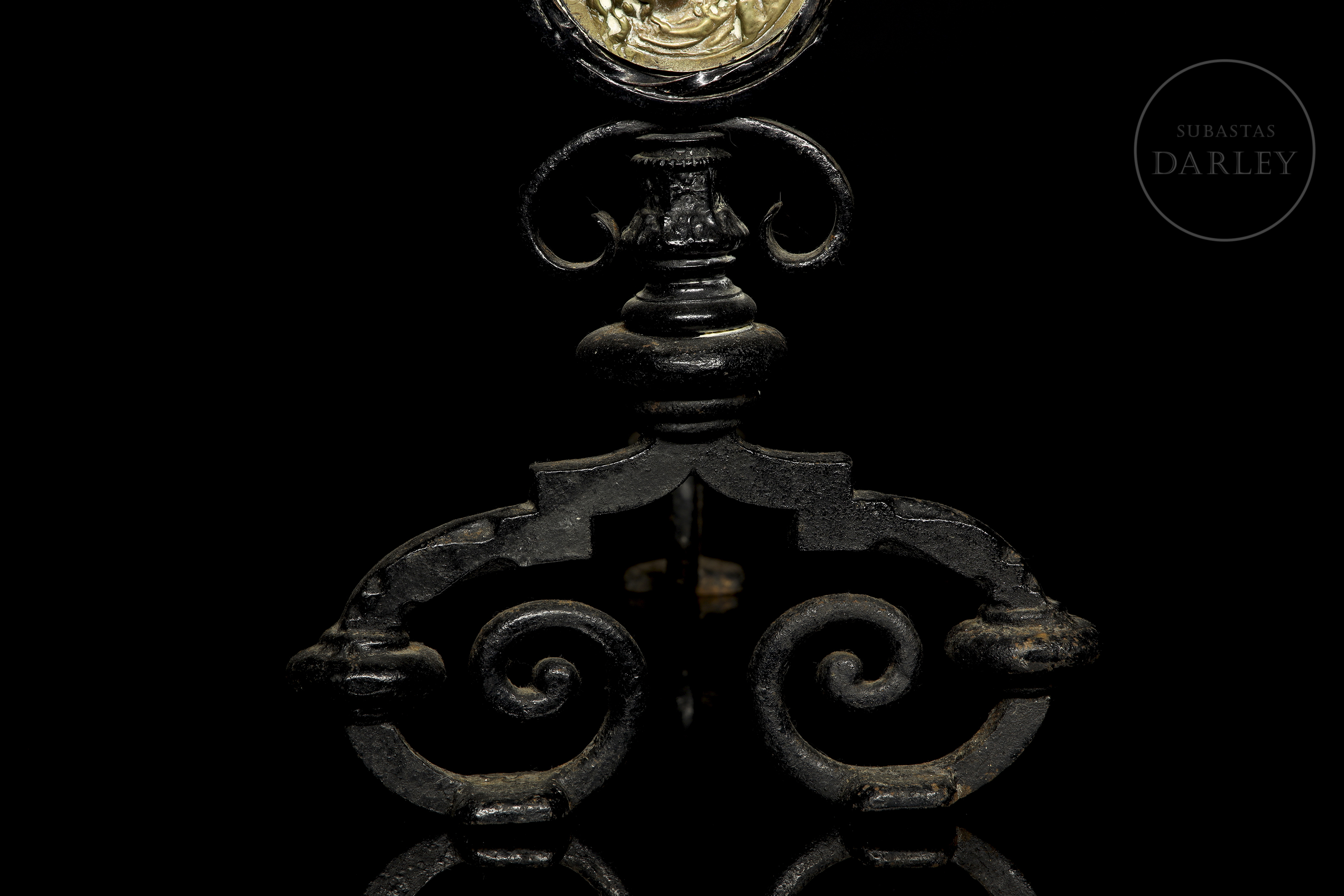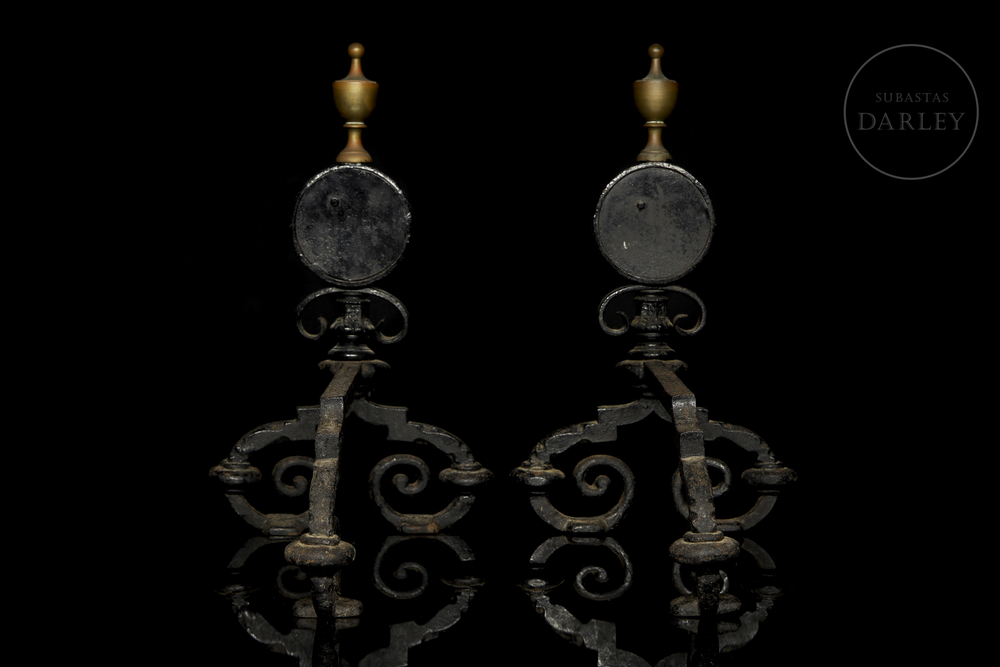 Two chimney-pieces to hold logs of firewood. Adorned with a central medallion with portraits in gilt bronze.