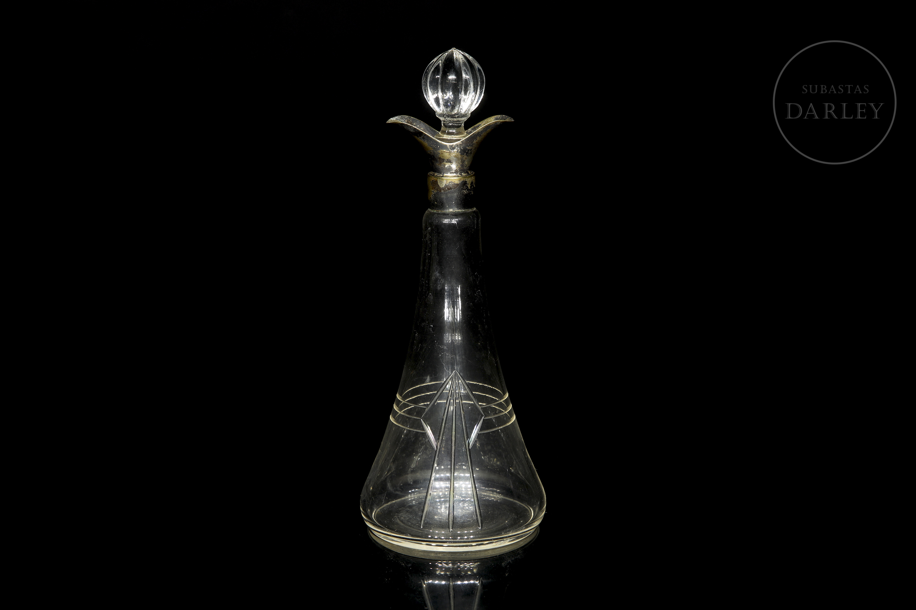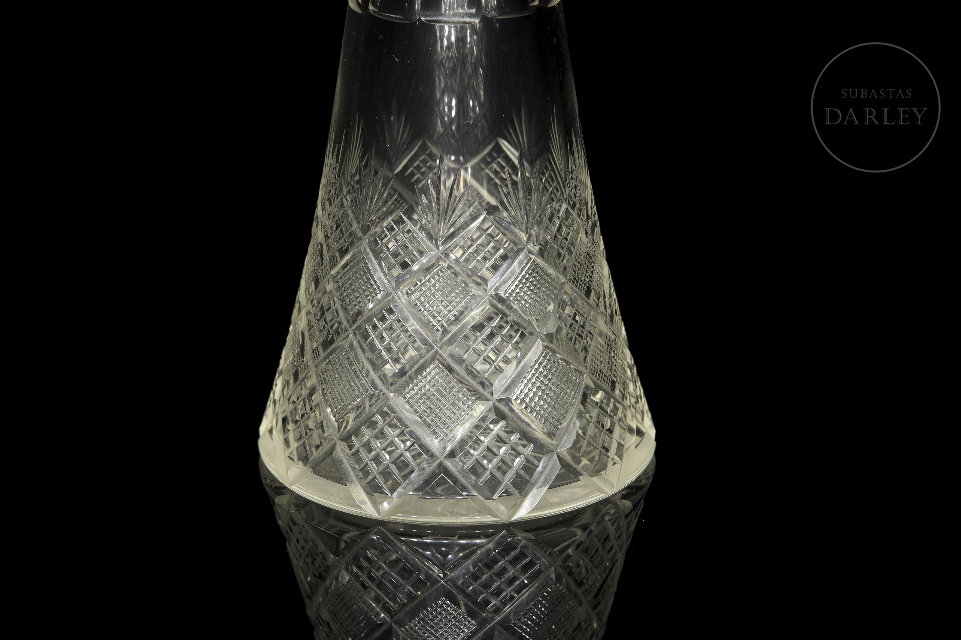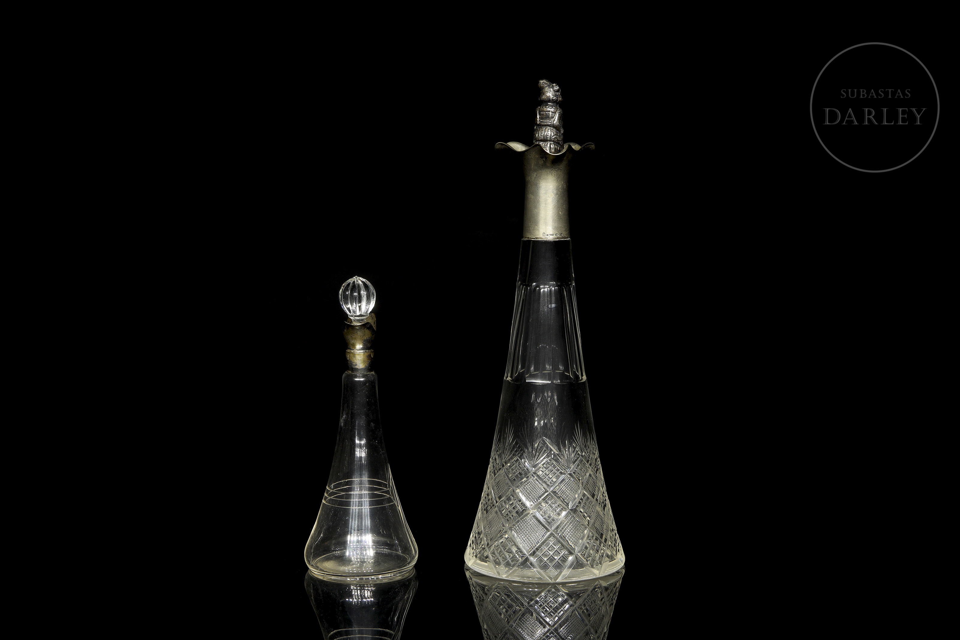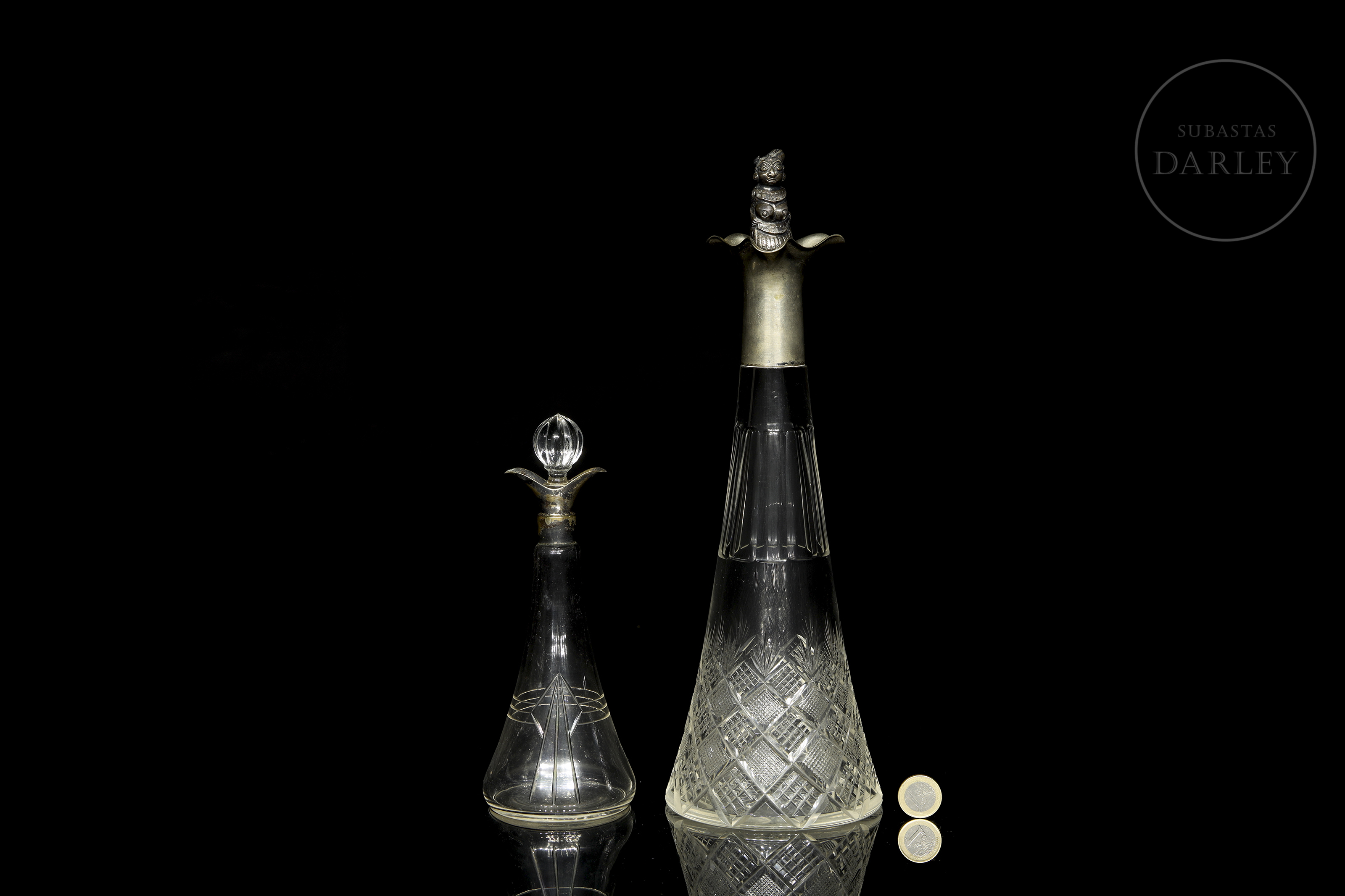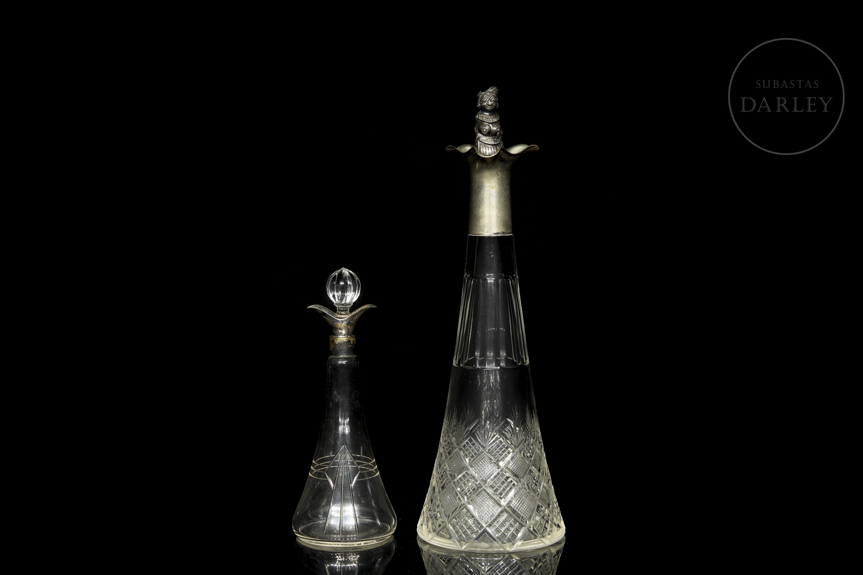 Two glass jugs decorated with engraved geometric patterns. Both pieces have their respective stoppers made of glass (small jug) and cork with a metallic finish (larger jug). The cork stopper is split in two, with one half found in the mouth of the jug.