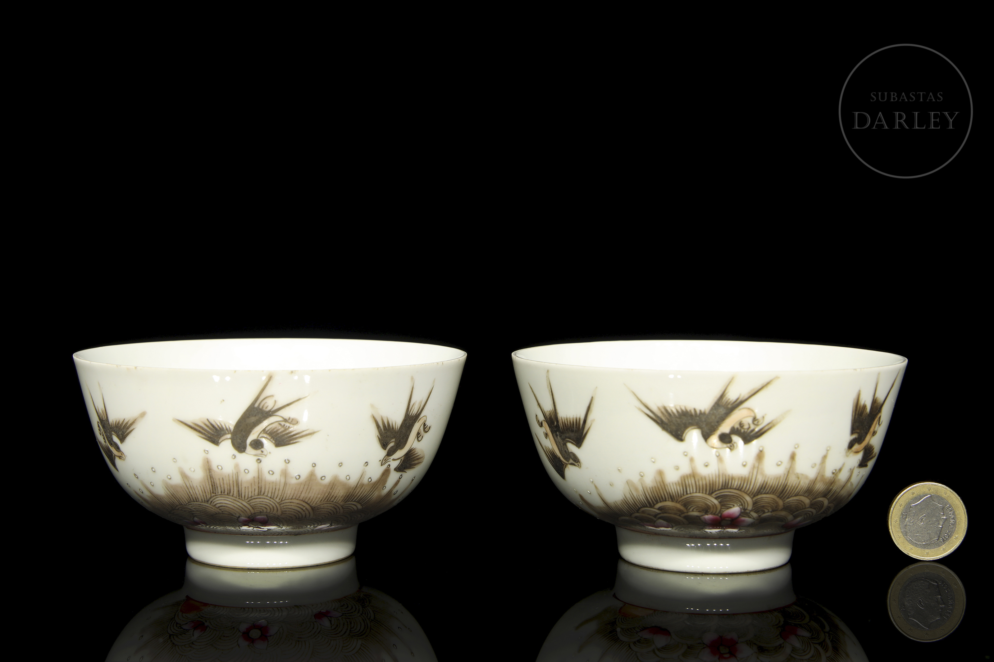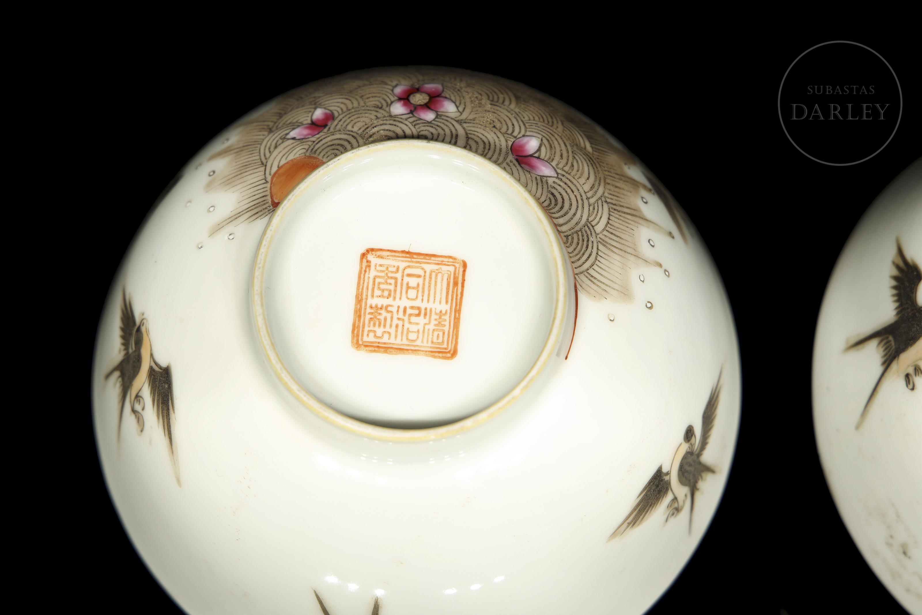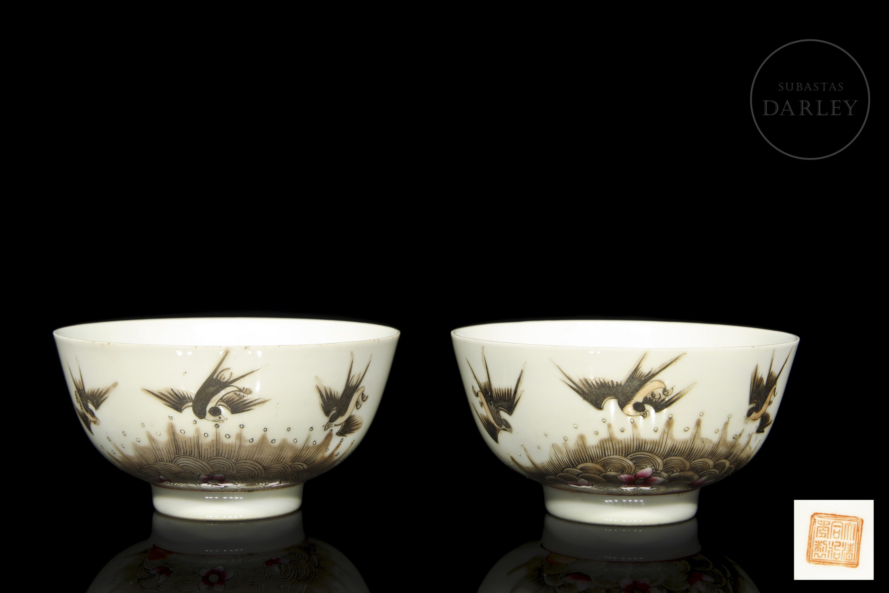 Pair of enamelled porcelain bowls ‘Swallows’, with Tongzhi mark