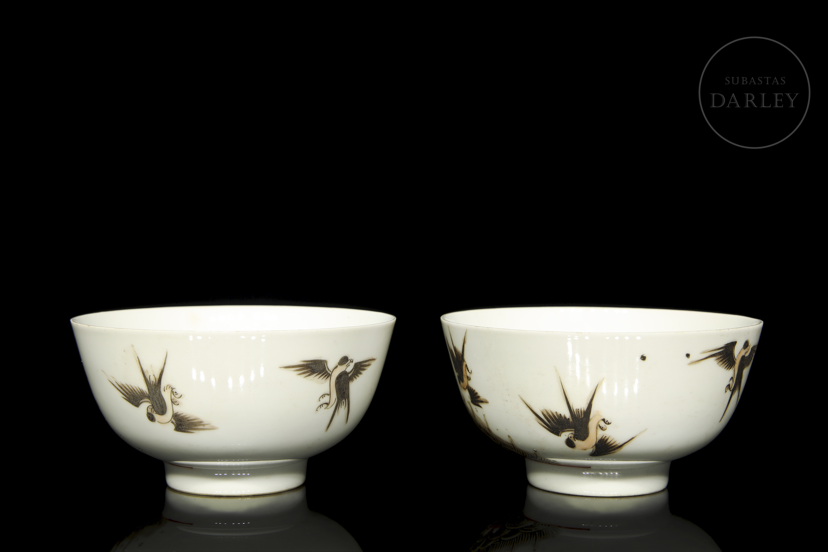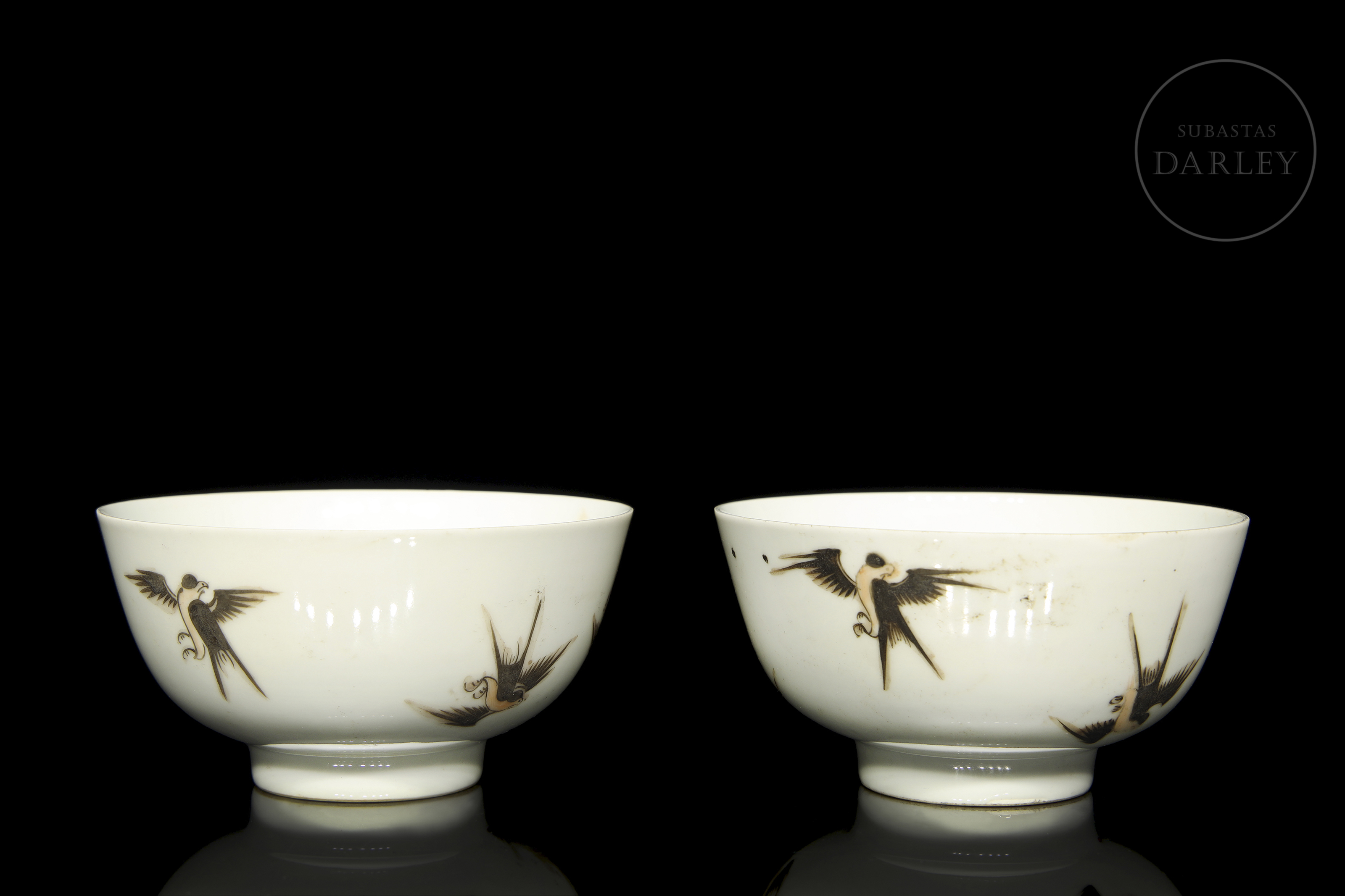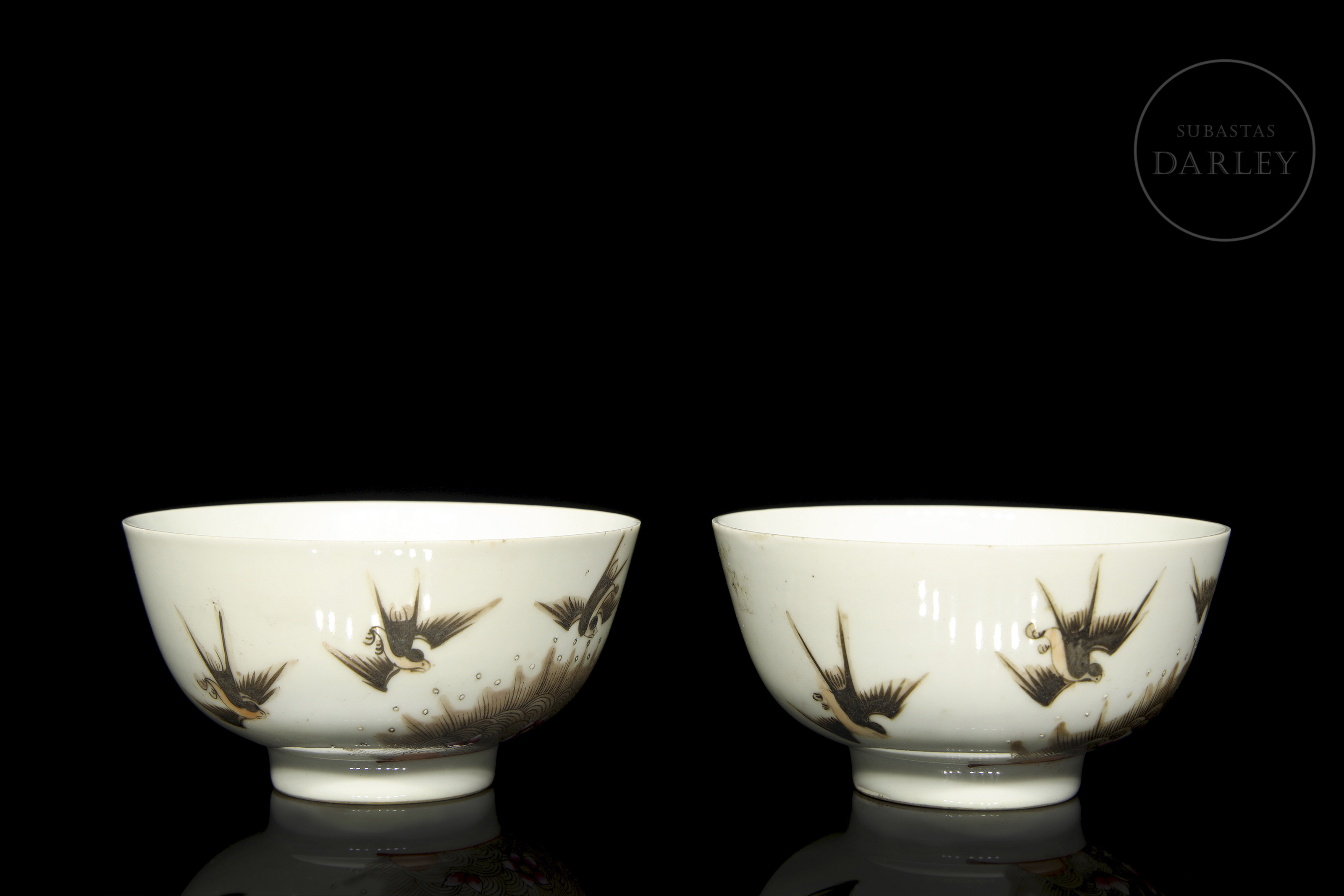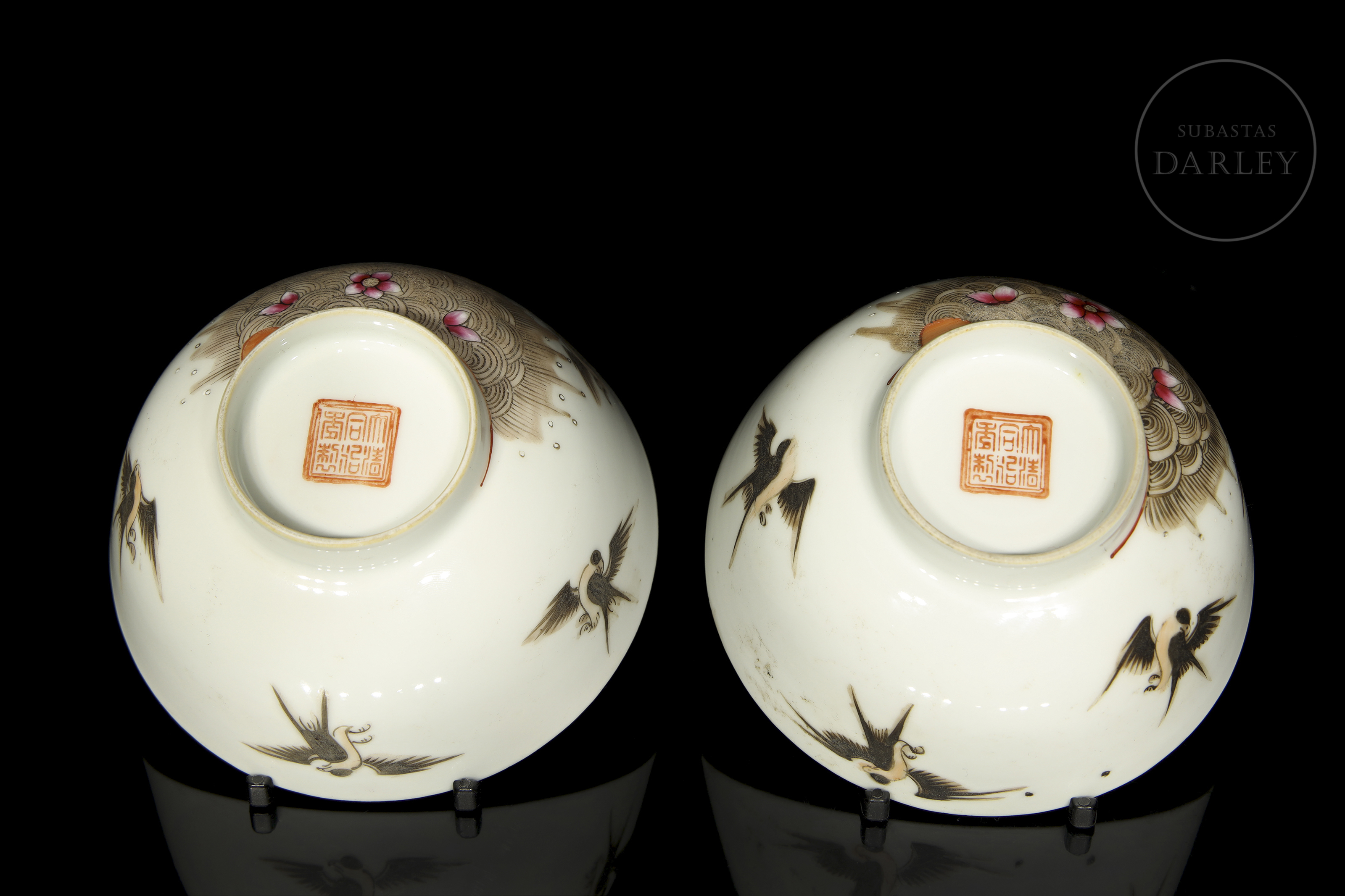 Pair of enamelled porcelain bowls ‘Swallows’, with Tongzhi mark