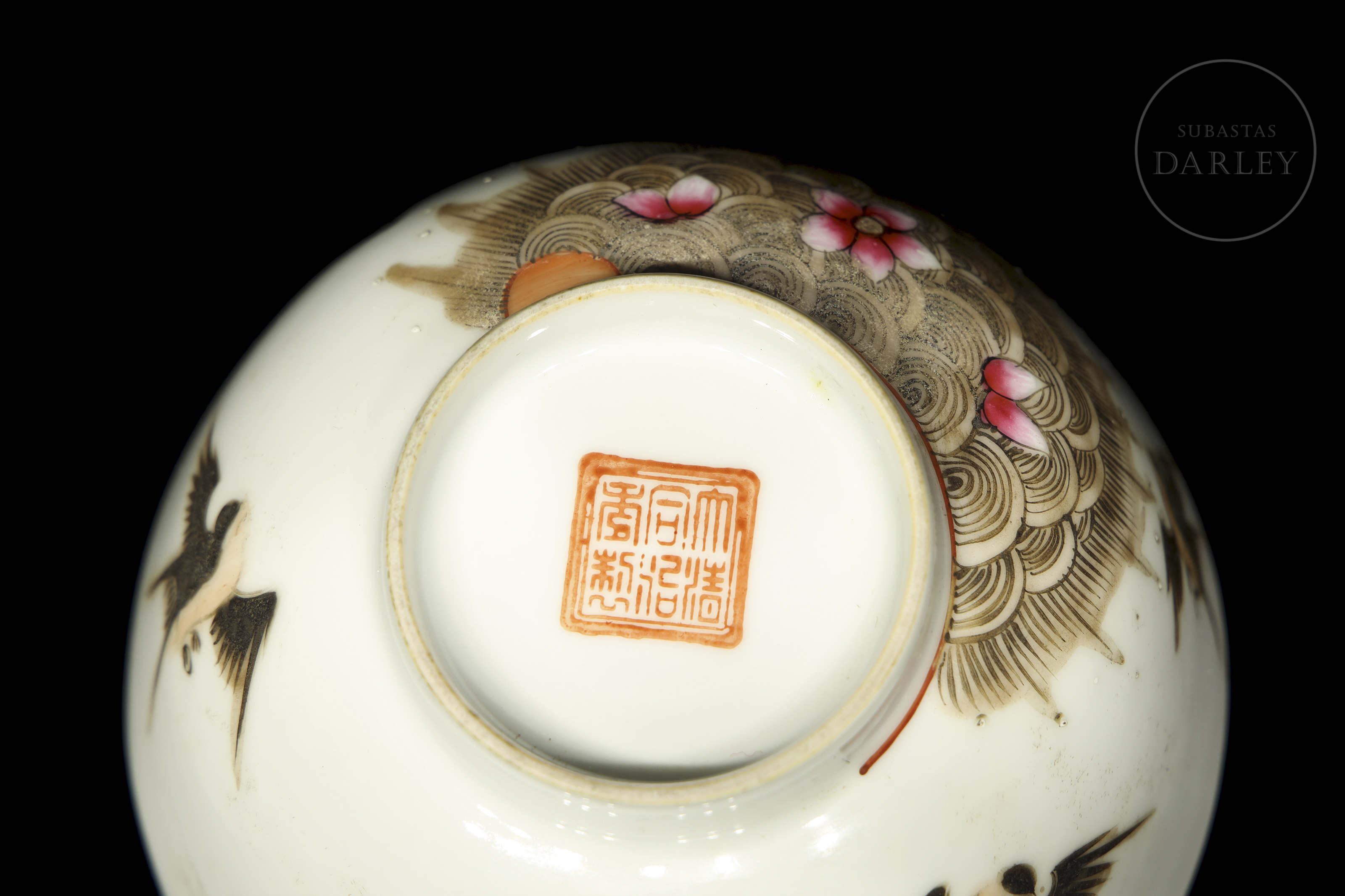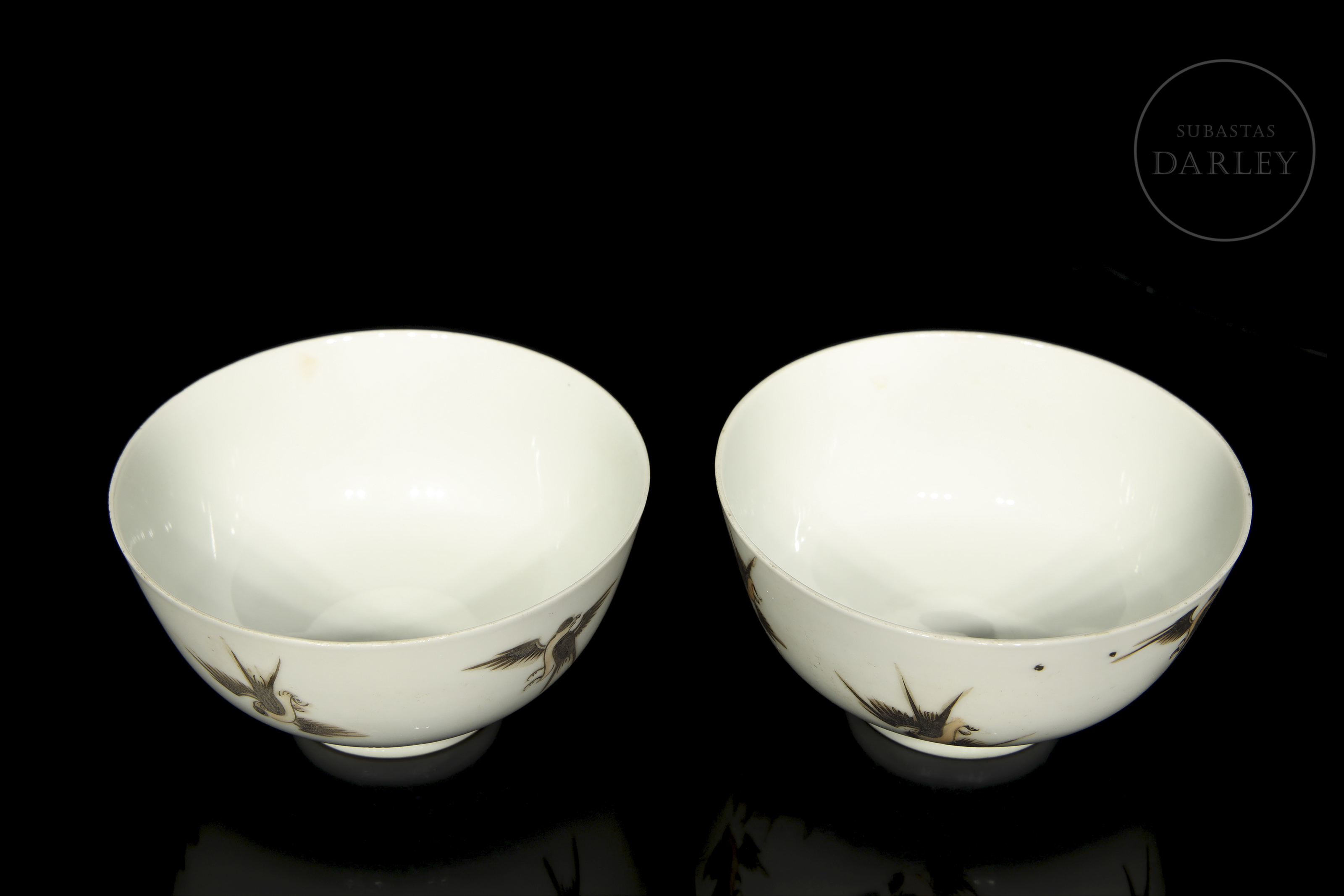 Two small porcelain bowls, circular, with a short foot on which rises a rounded body that expands towards the mouth. Decorated with delicate coloured enamels depicting a continuous scene of swallows in flight over a landscape with lotuses in bloom. It shows on the base a six-character seal ‘大清同治年制’ in underglaze red.