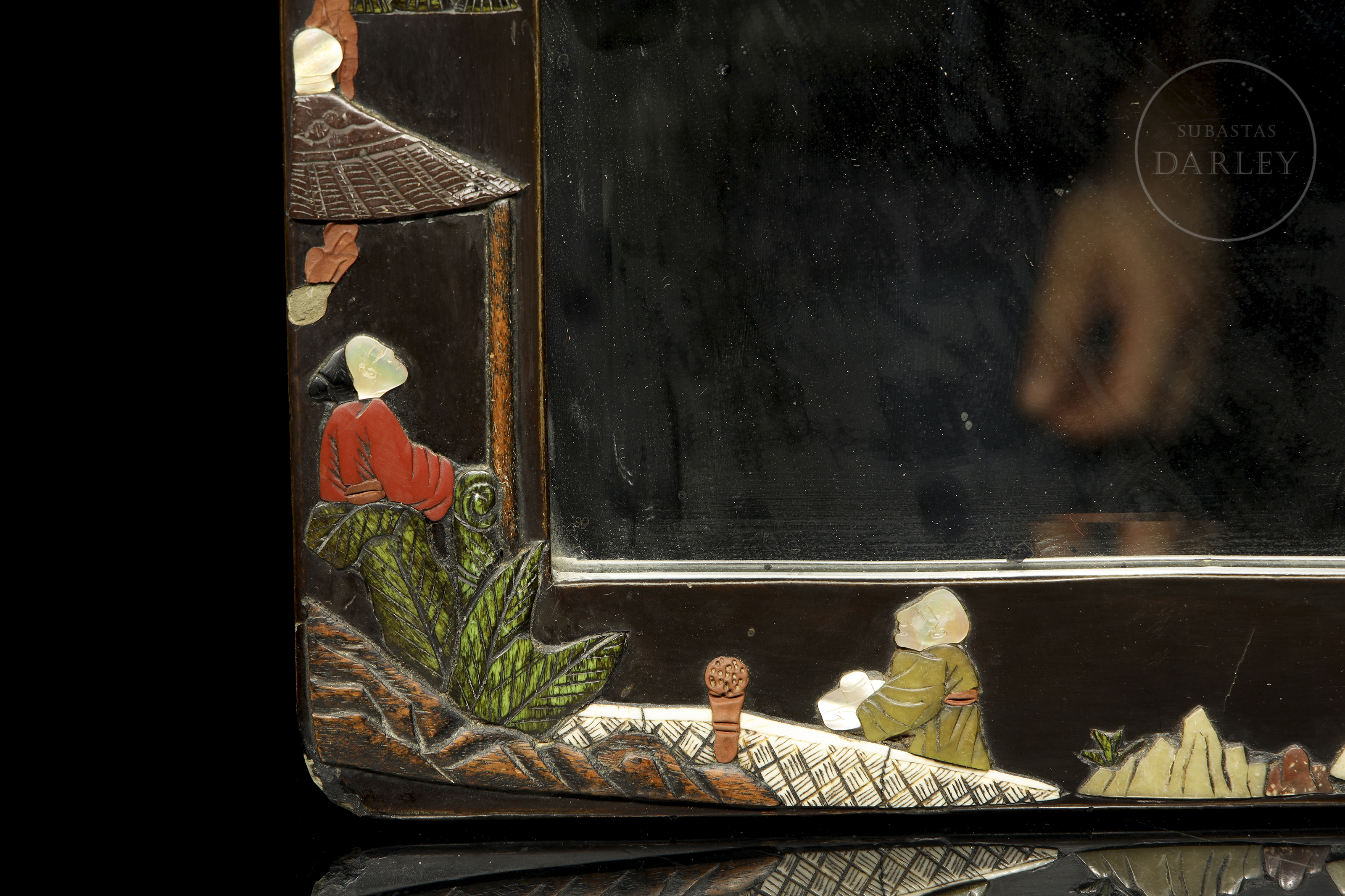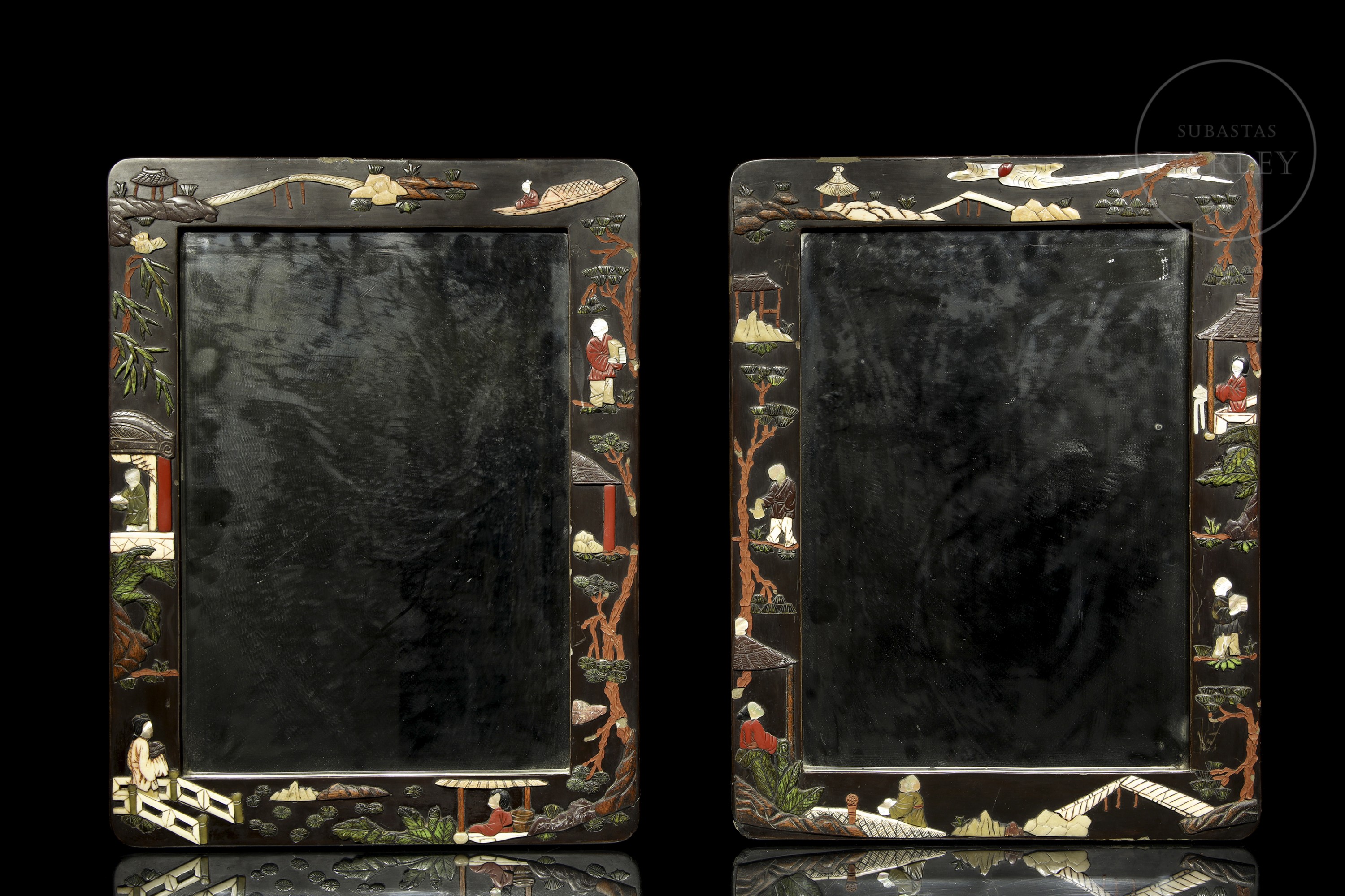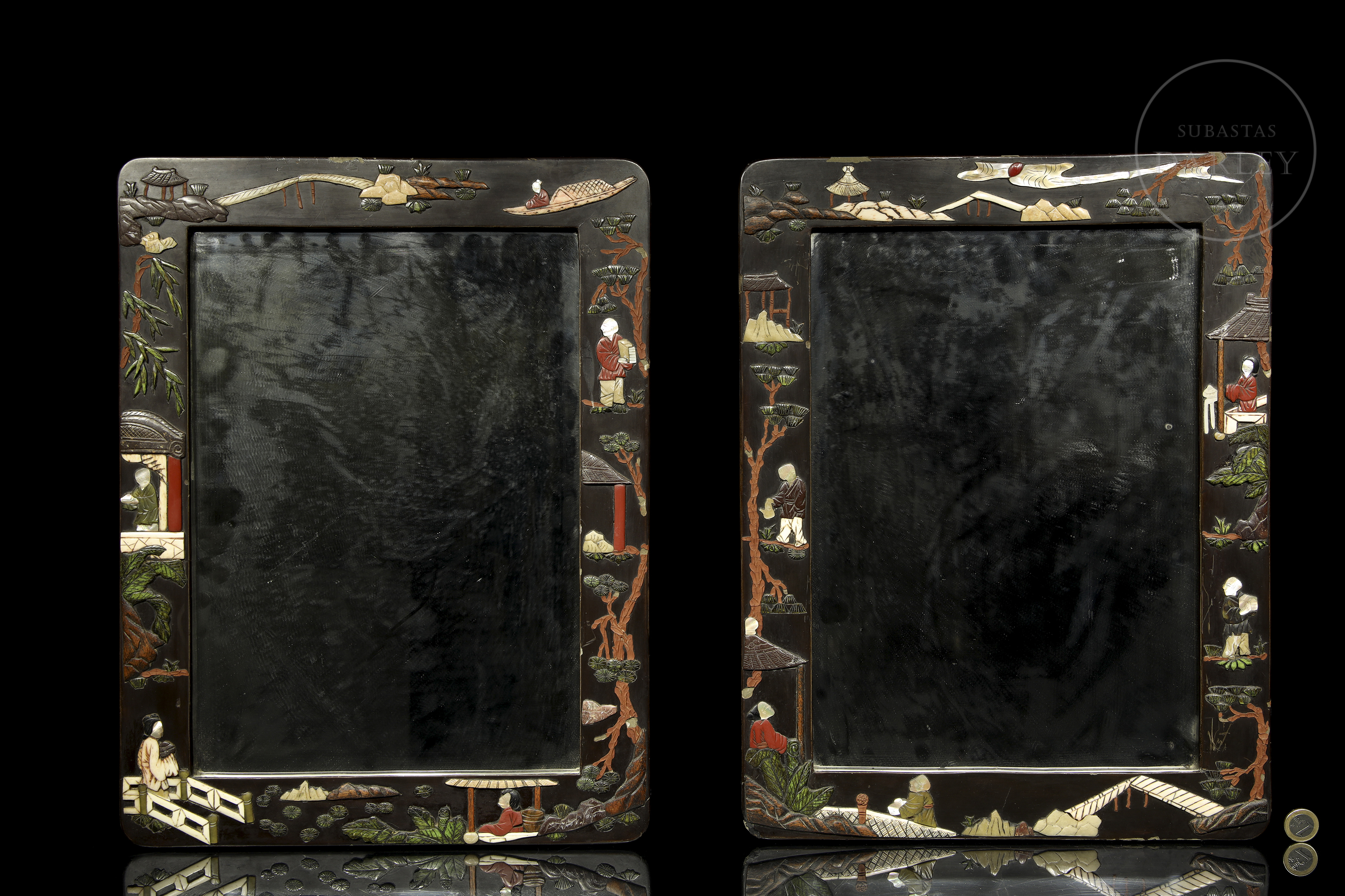 Two mirrors with rectangular carved wooden frames, with decorations on the front inlaid with mother-of-pearl and hard stones, forming a beautiful landscape full of nature, architecture and small characters.