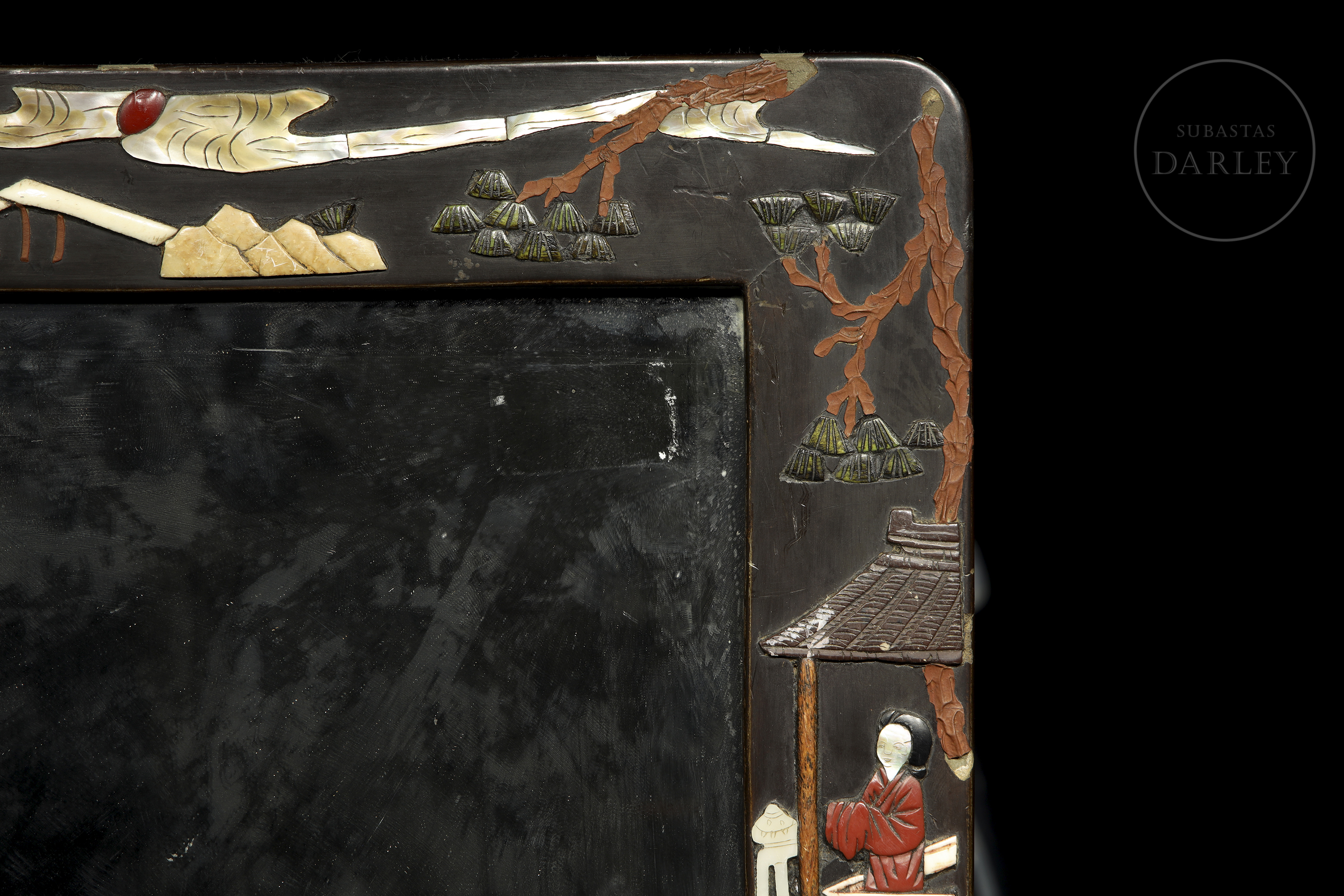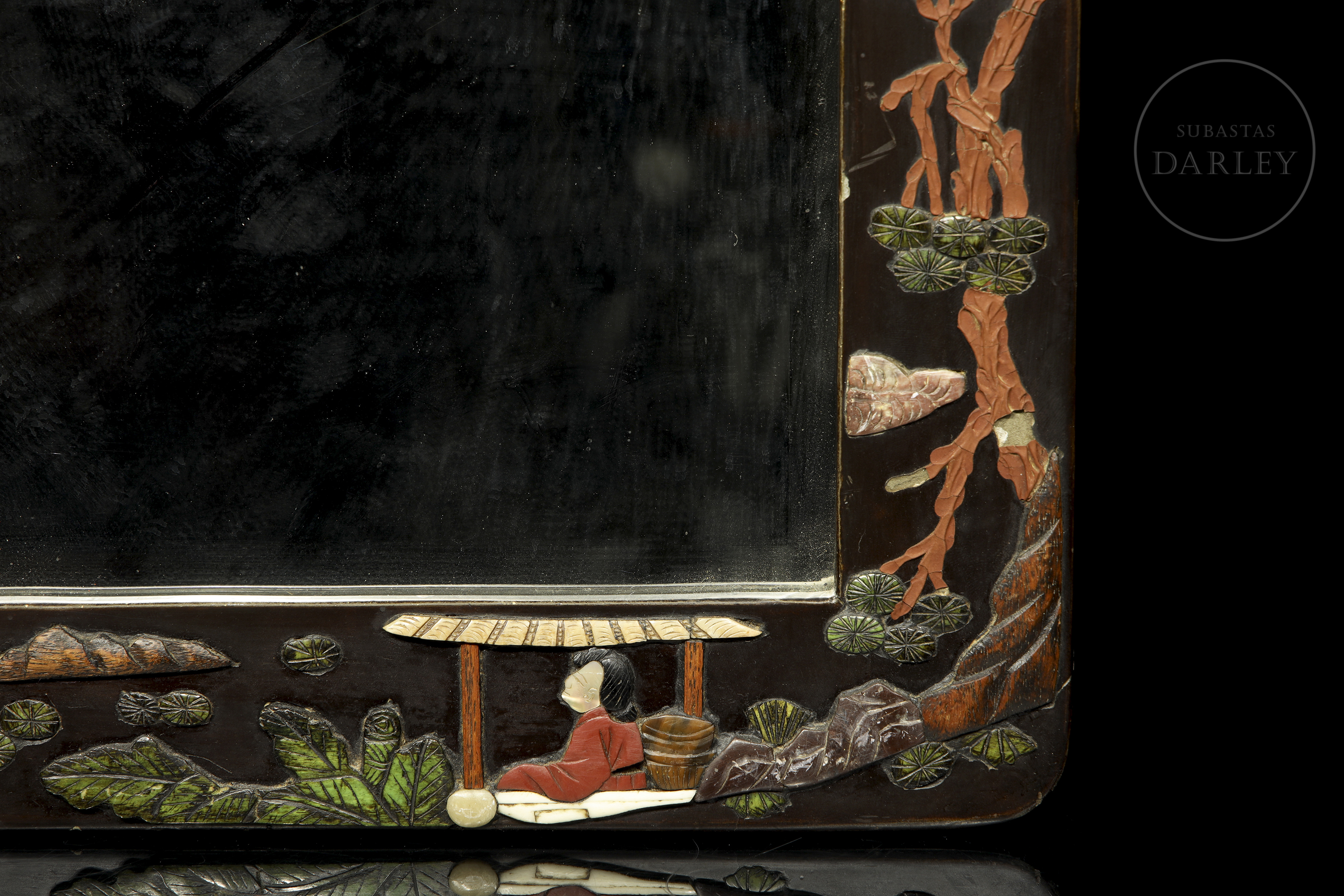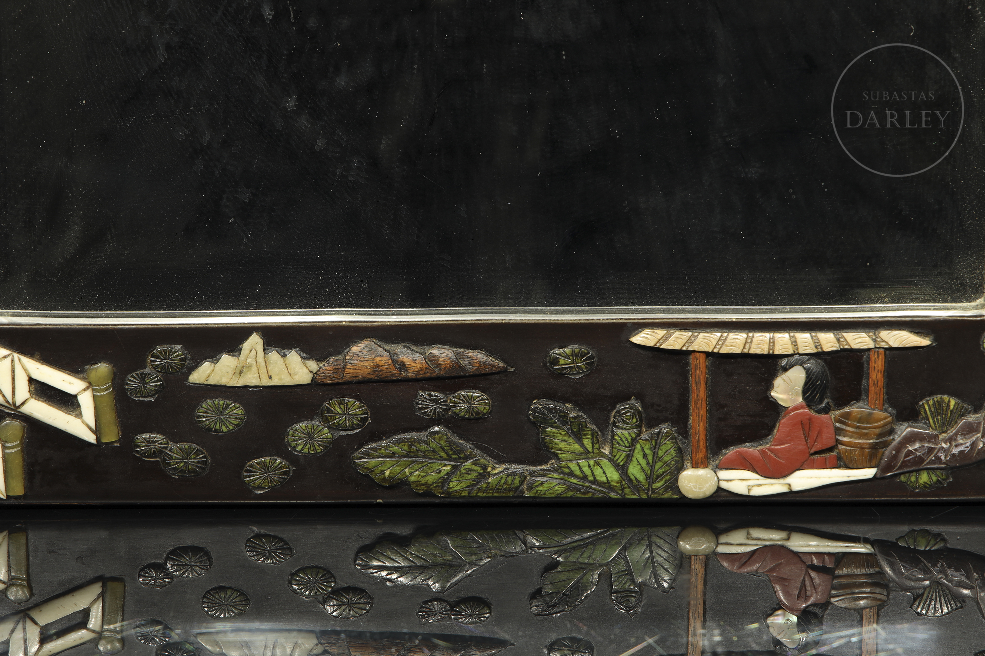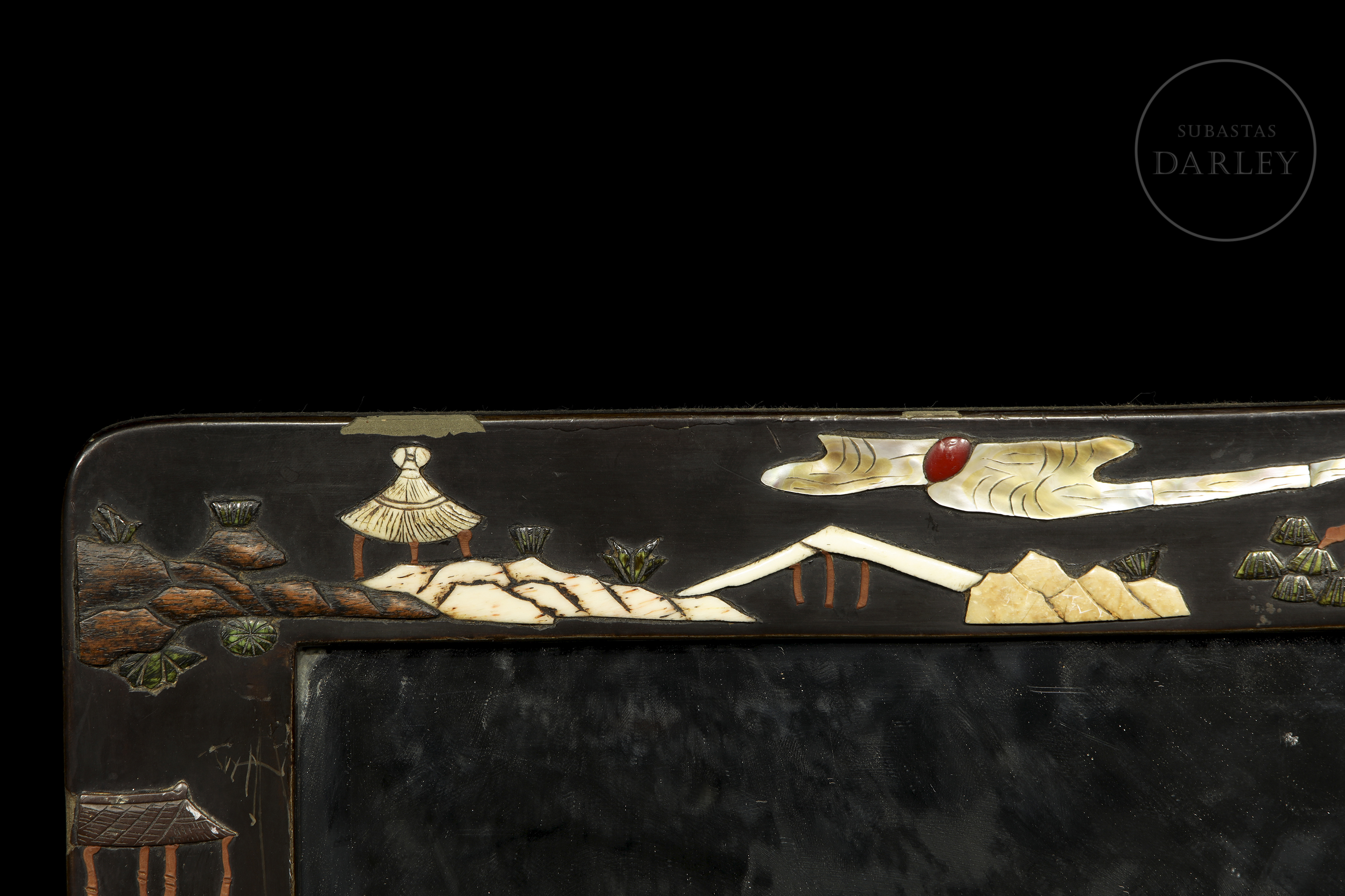 Two mirrors with rectangular carved wooden frames, with decorations on the front inlaid with mother-of-pearl and hard stones, forming a beautiful landscape full of nature, architecture and small characters.