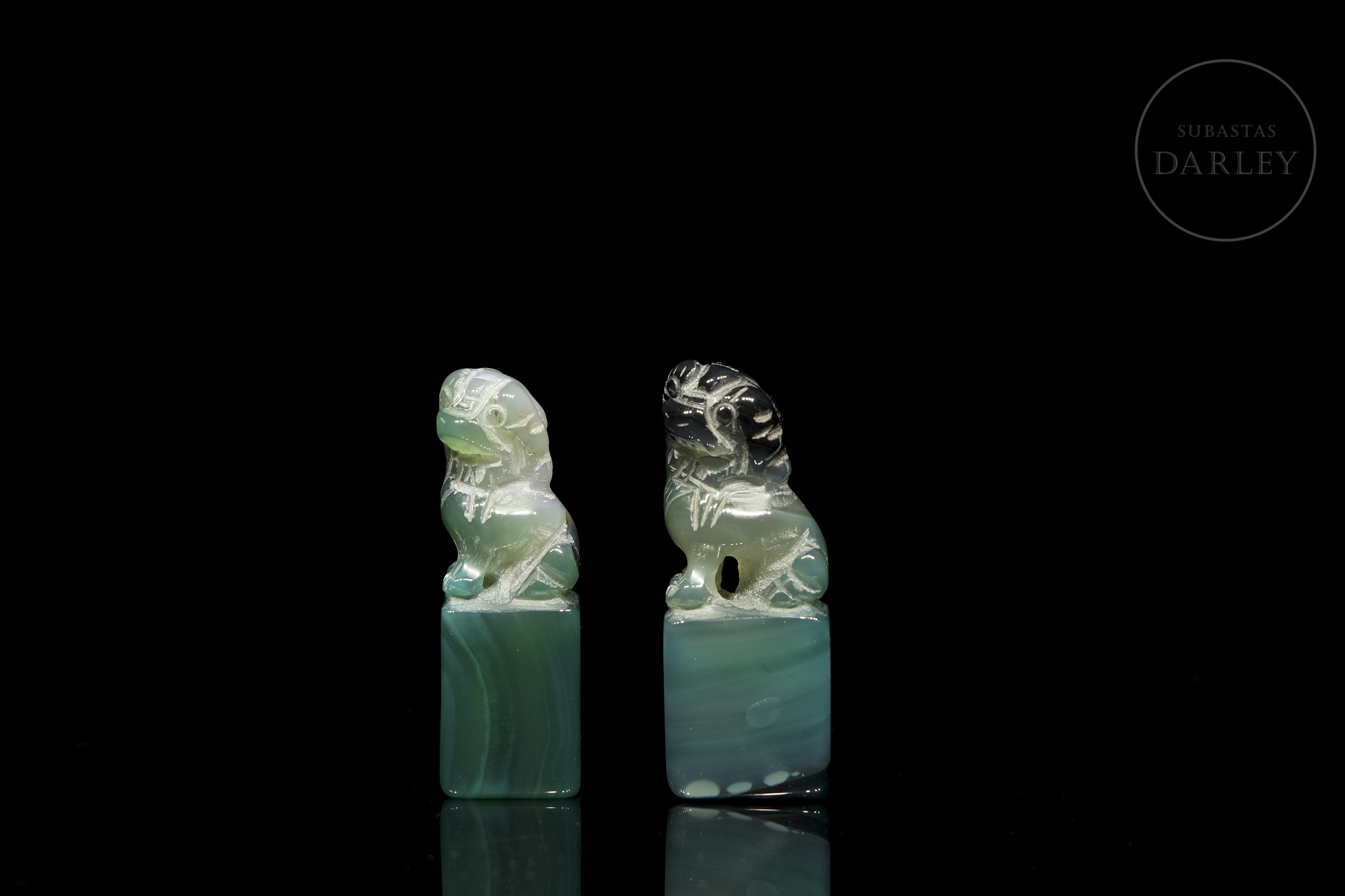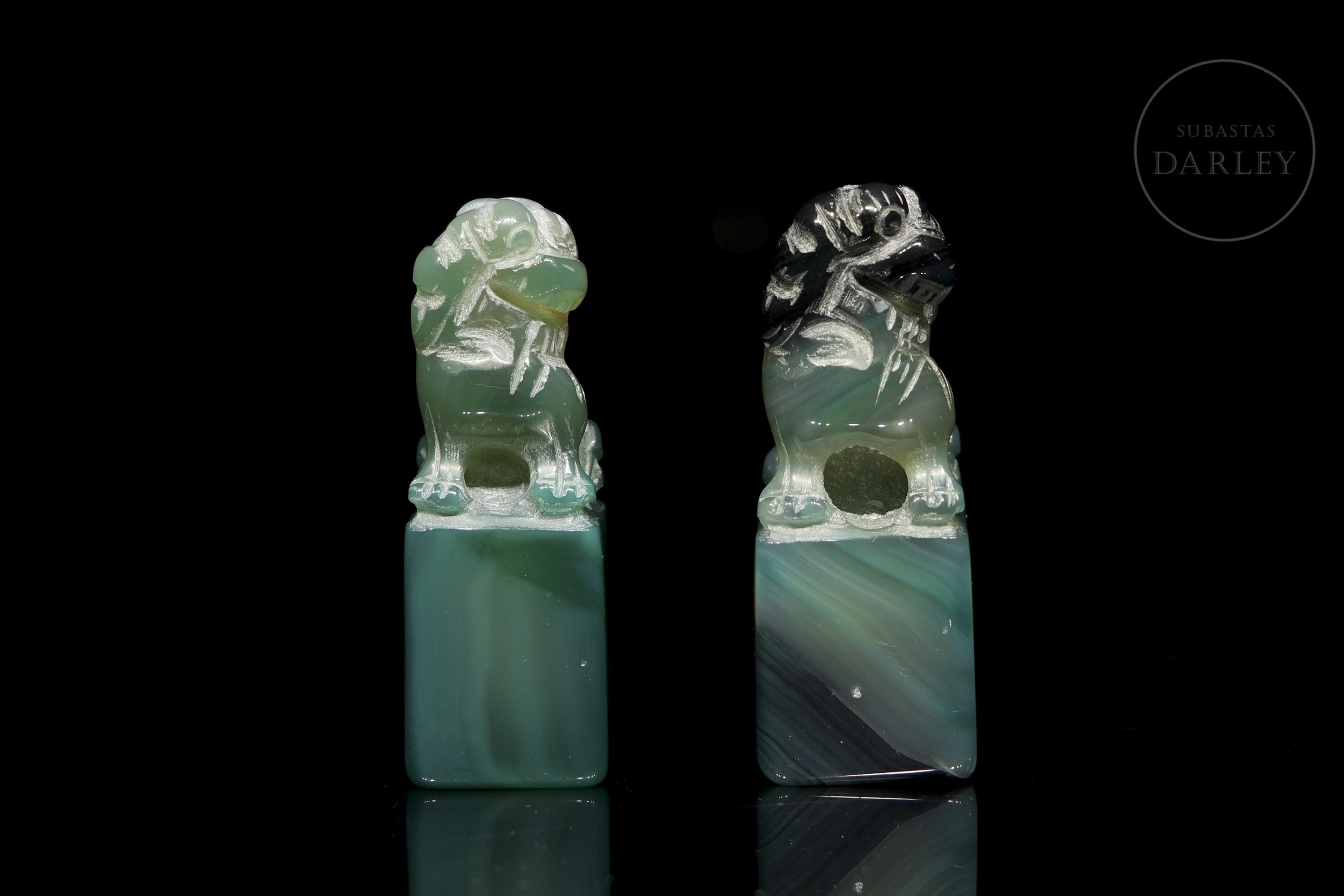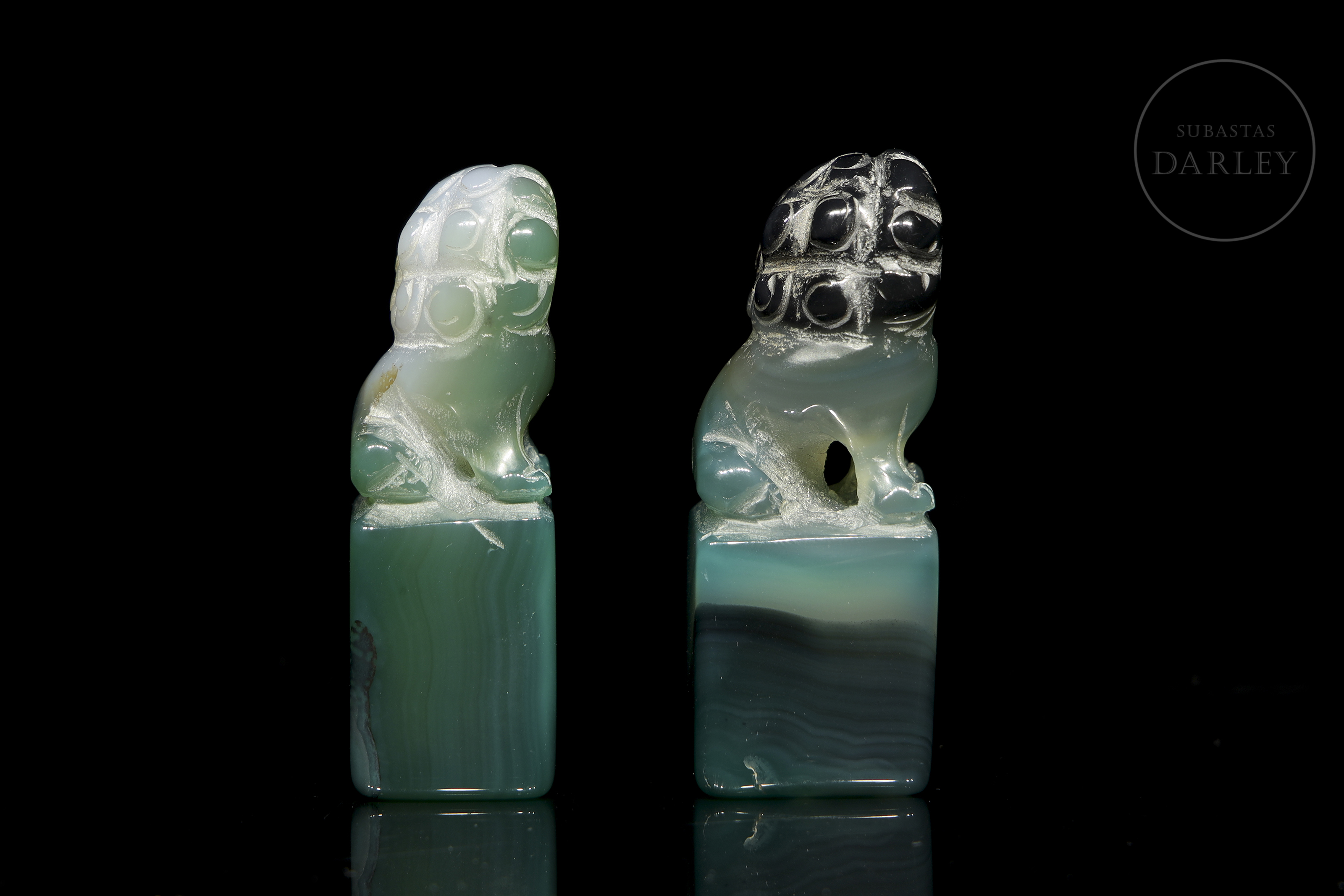 Pair of small agate seals, with an elongated rectangular base, on which a lion foo is arranged in each of them. The beast is shown seated on its hind legs, with its head cocked to one side and large eyes. The carving is coarse, with no polished details or stamp inscribed on the base, which may be due to the fact that it is an unfinished piece.