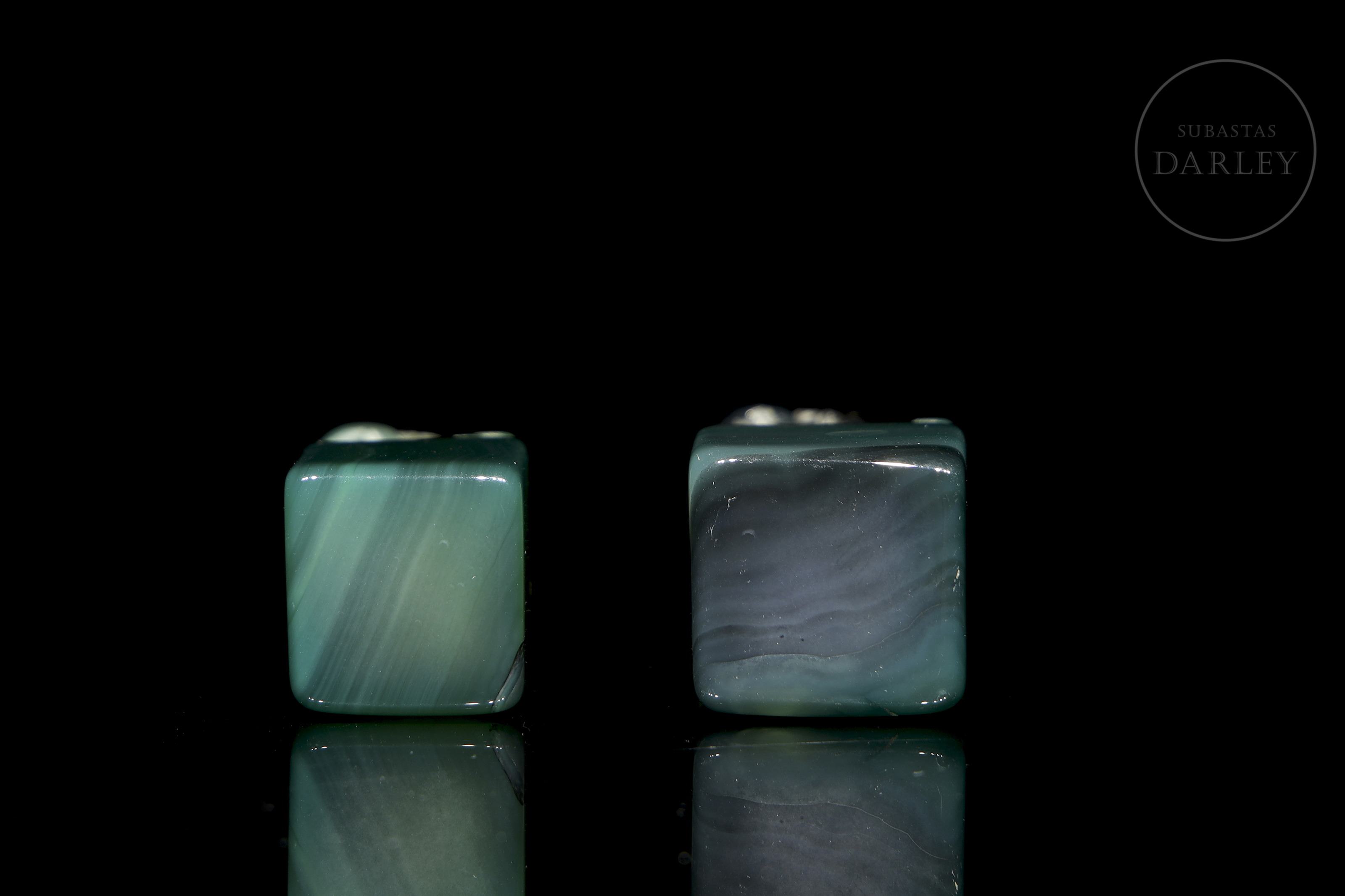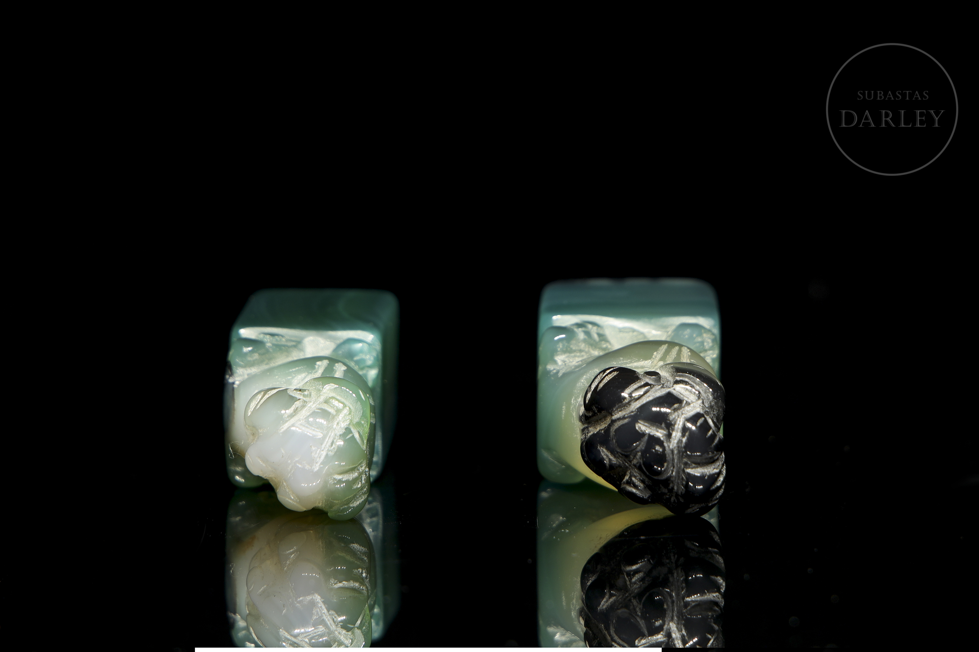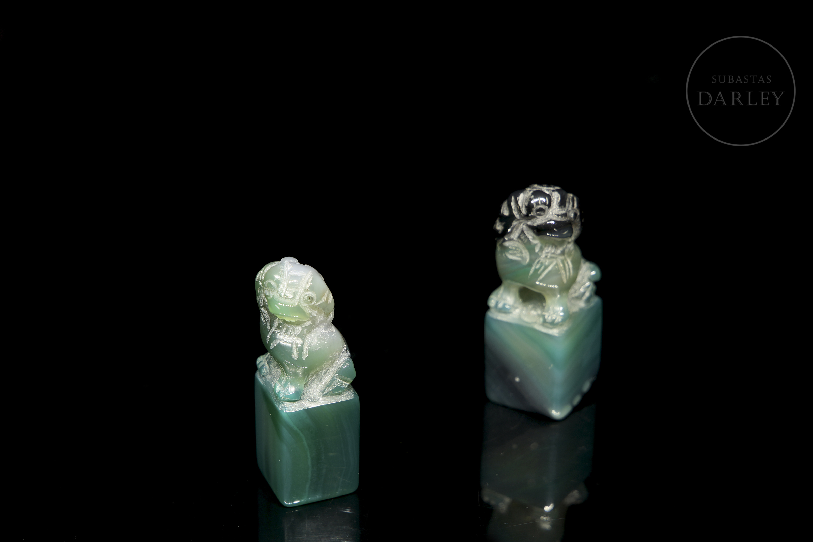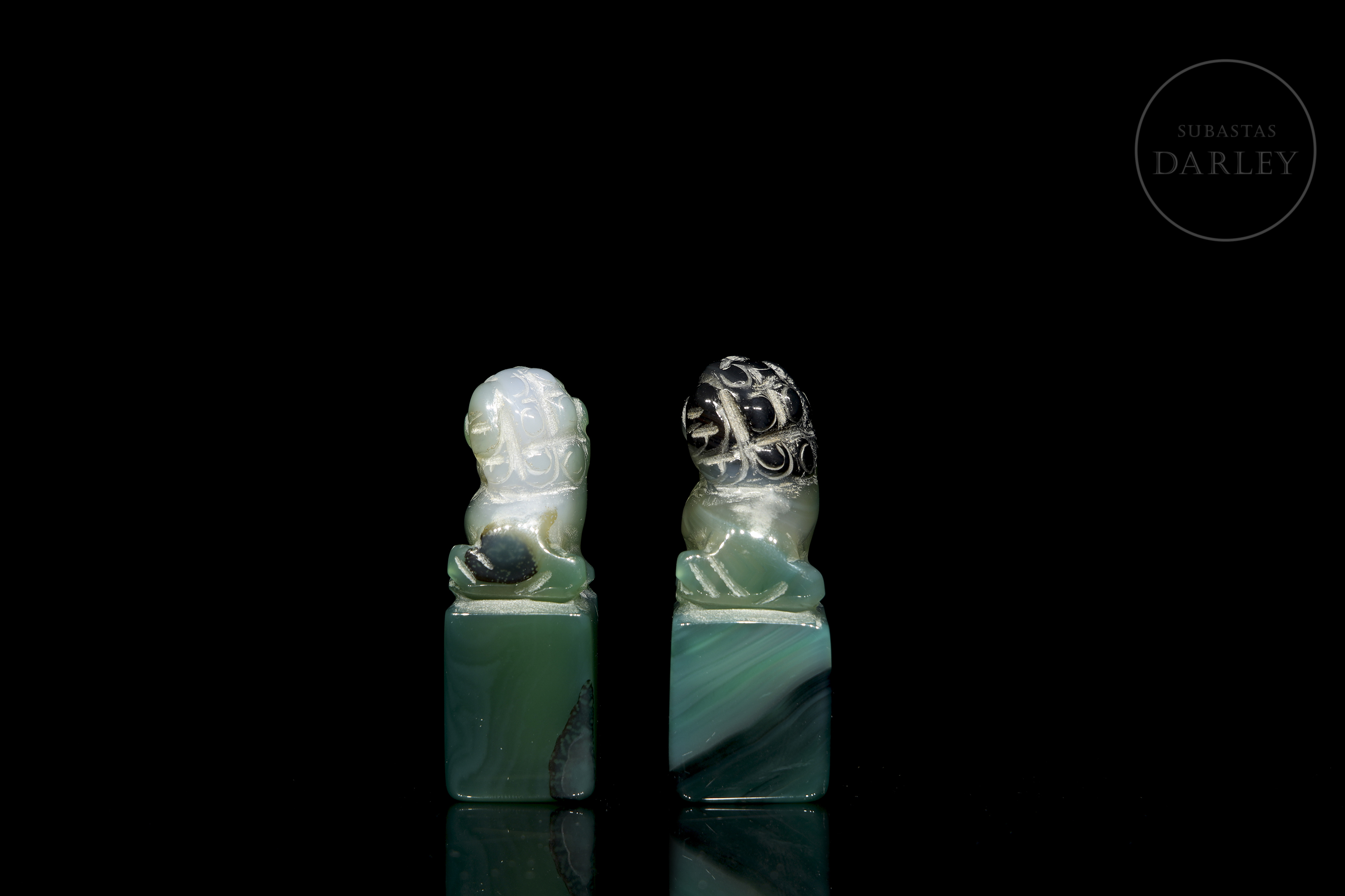 Pair of small agate seals, with an elongated rectangular base, on which a lion foo is arranged in each of them. The beast is shown seated on its hind legs, with its head cocked to one side and large eyes. The carving is coarse, with no polished details or stamp inscribed on the base, which may be due to the fact that it is an unfinished piece.