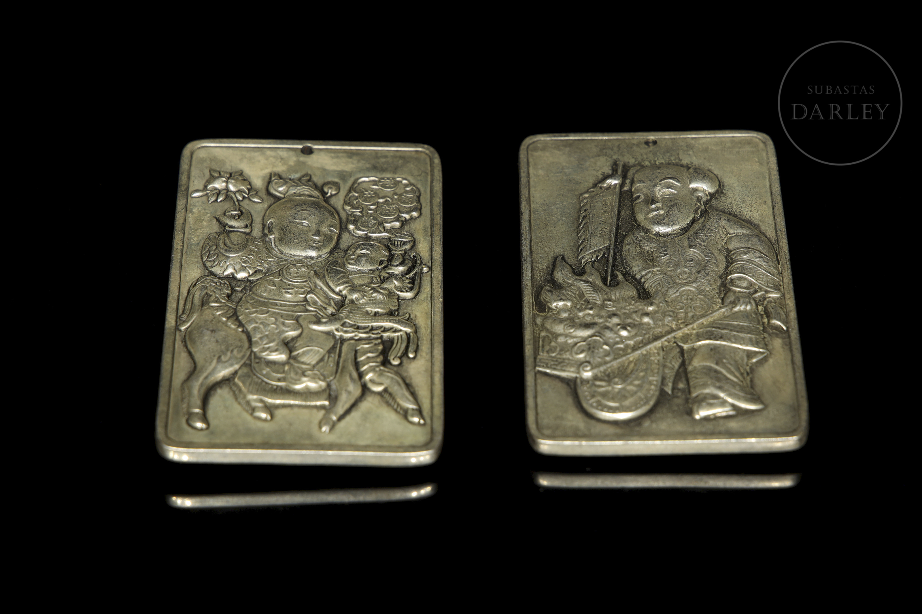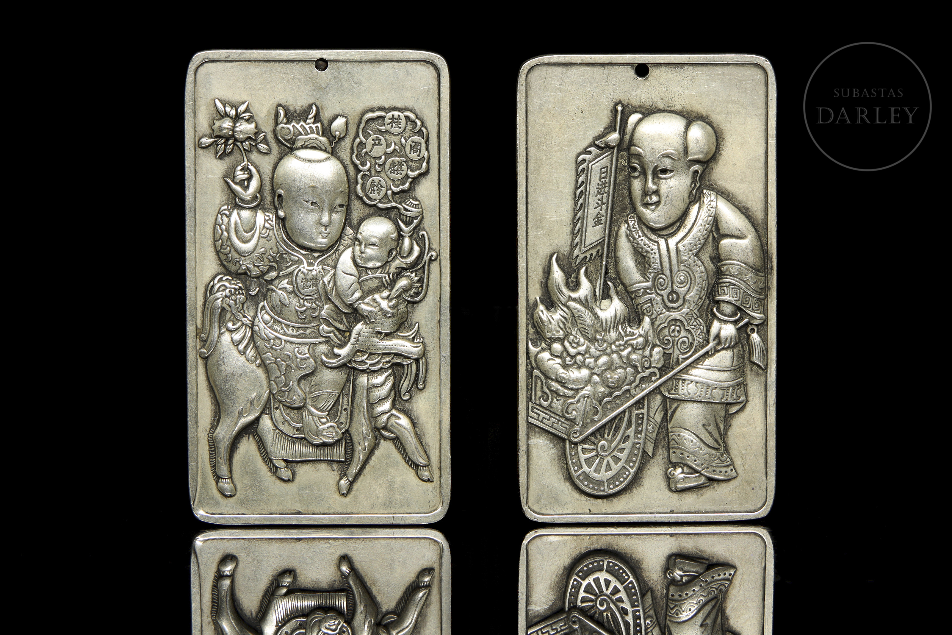 Pair of silver metal plaques, ‘Characters’, 20th century