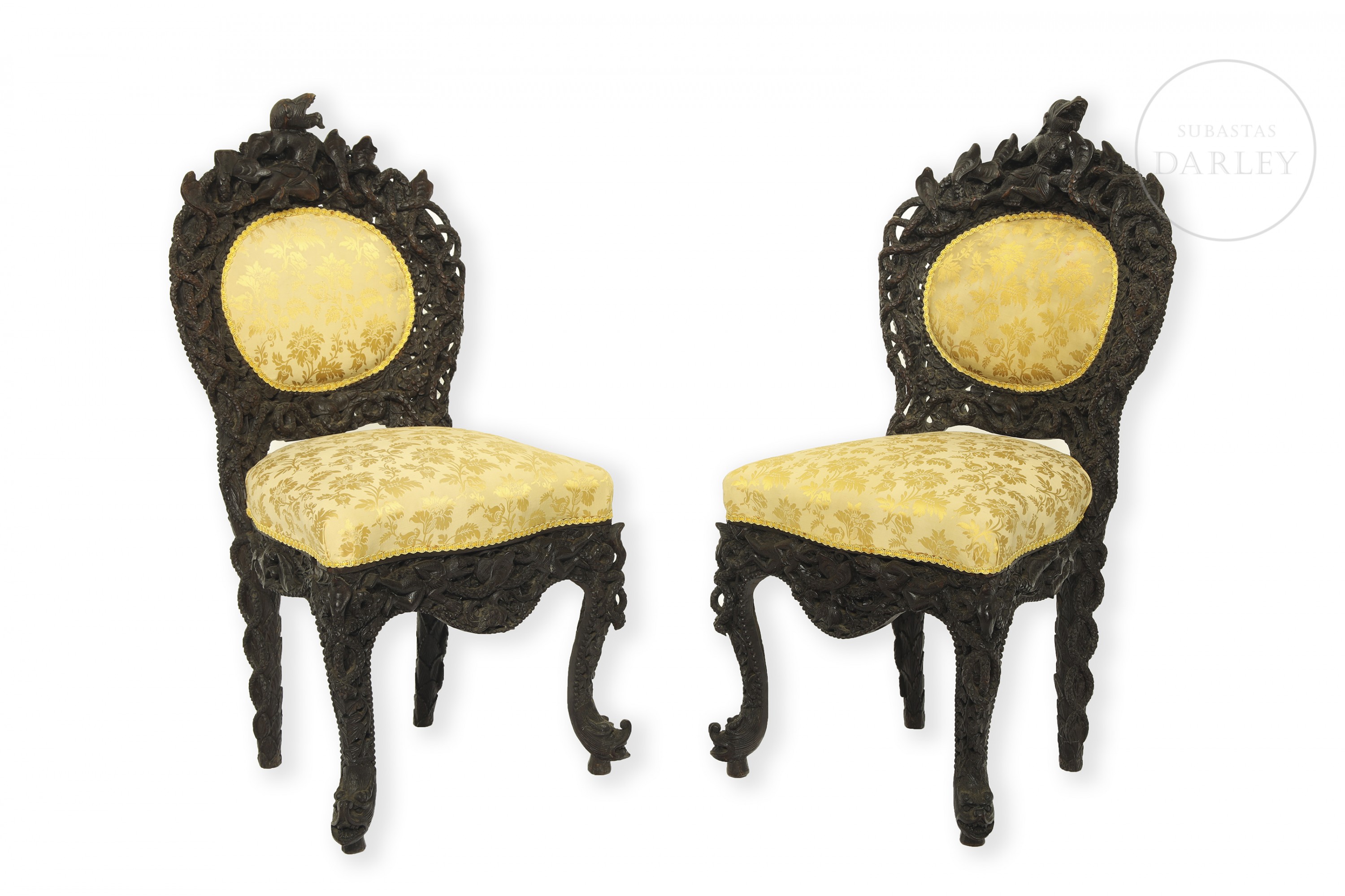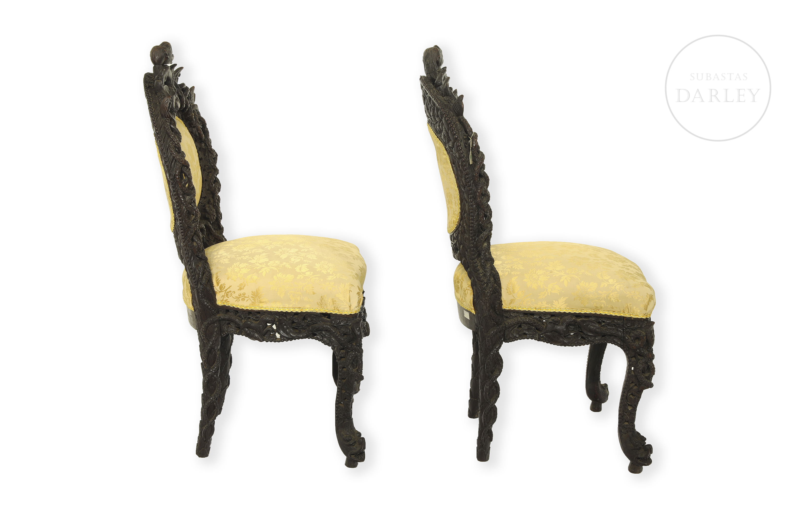 Pair of Thai carved wooden chairs, carved wood, 19th century