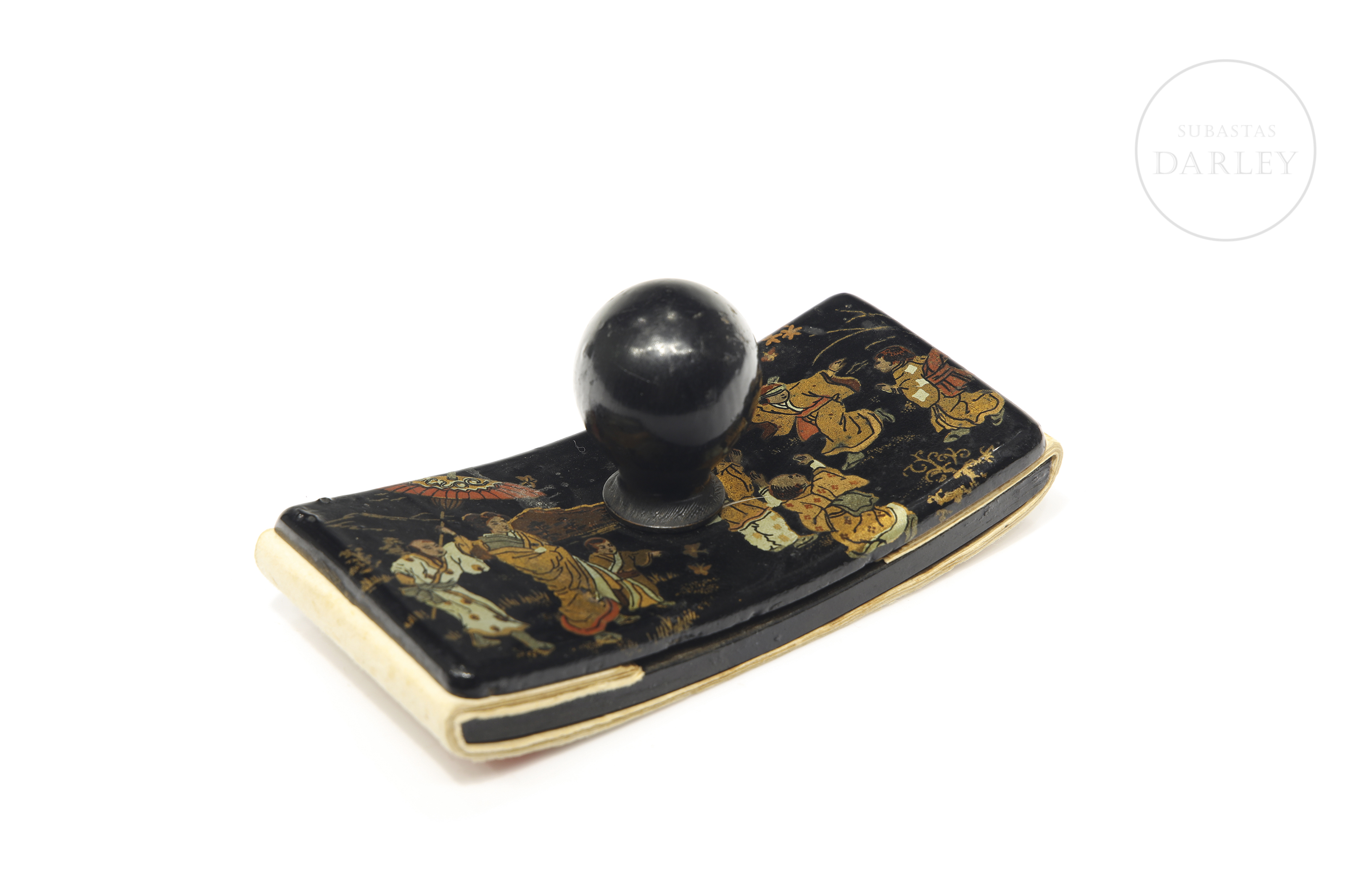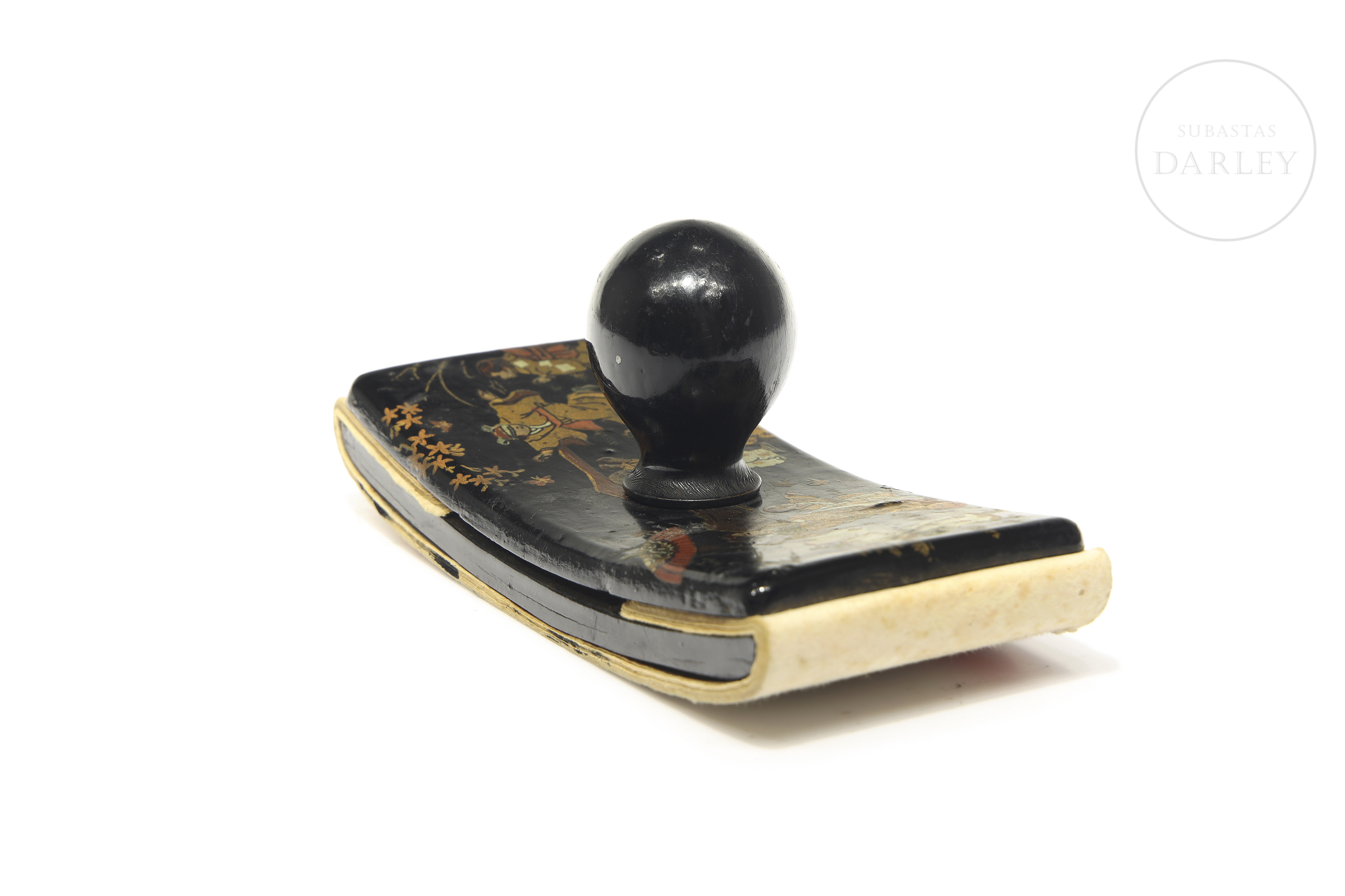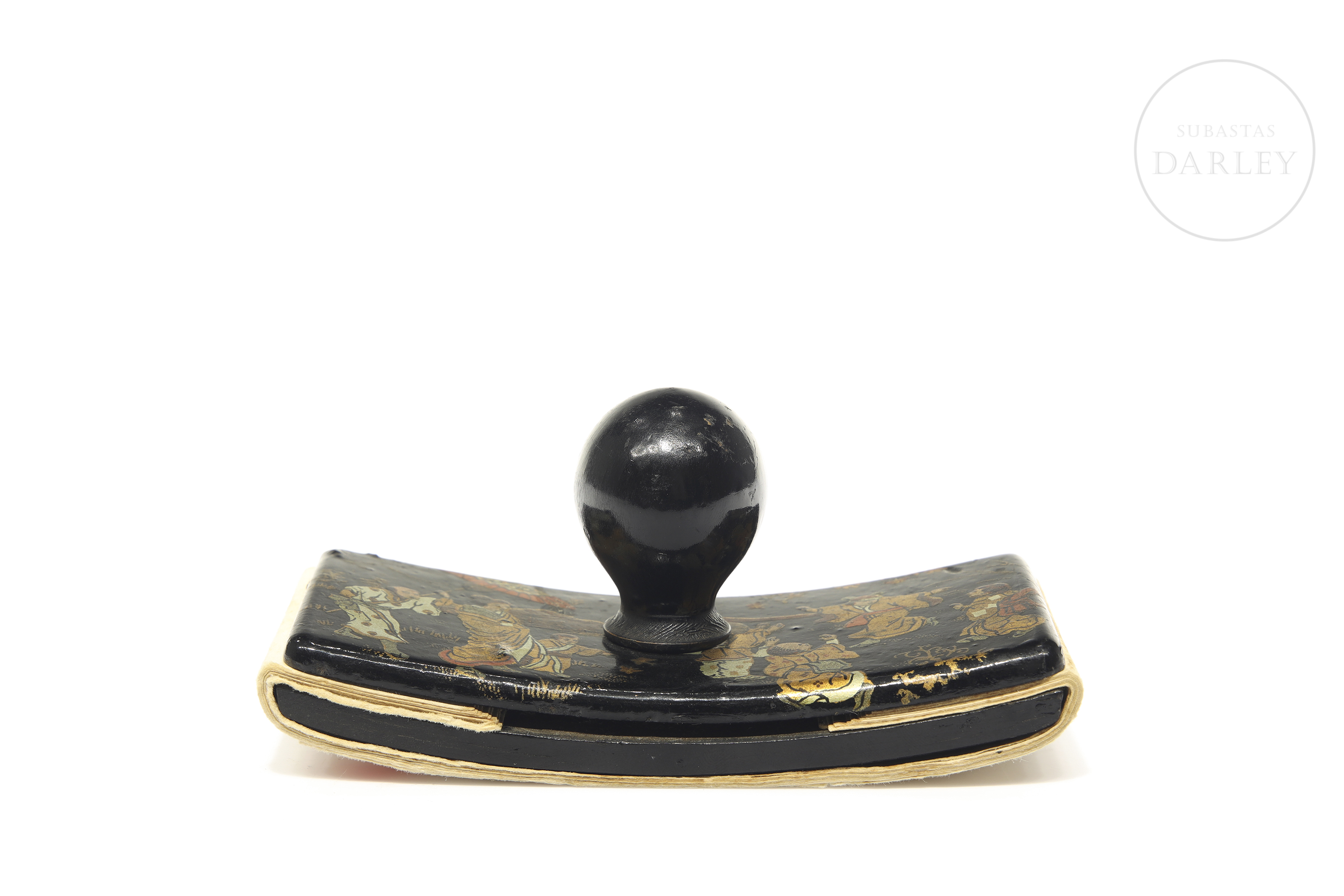 Papier-mâché blotter with a wooden knob. The upper surface depicts a scene in gilt tones with a Chinese genre theme.