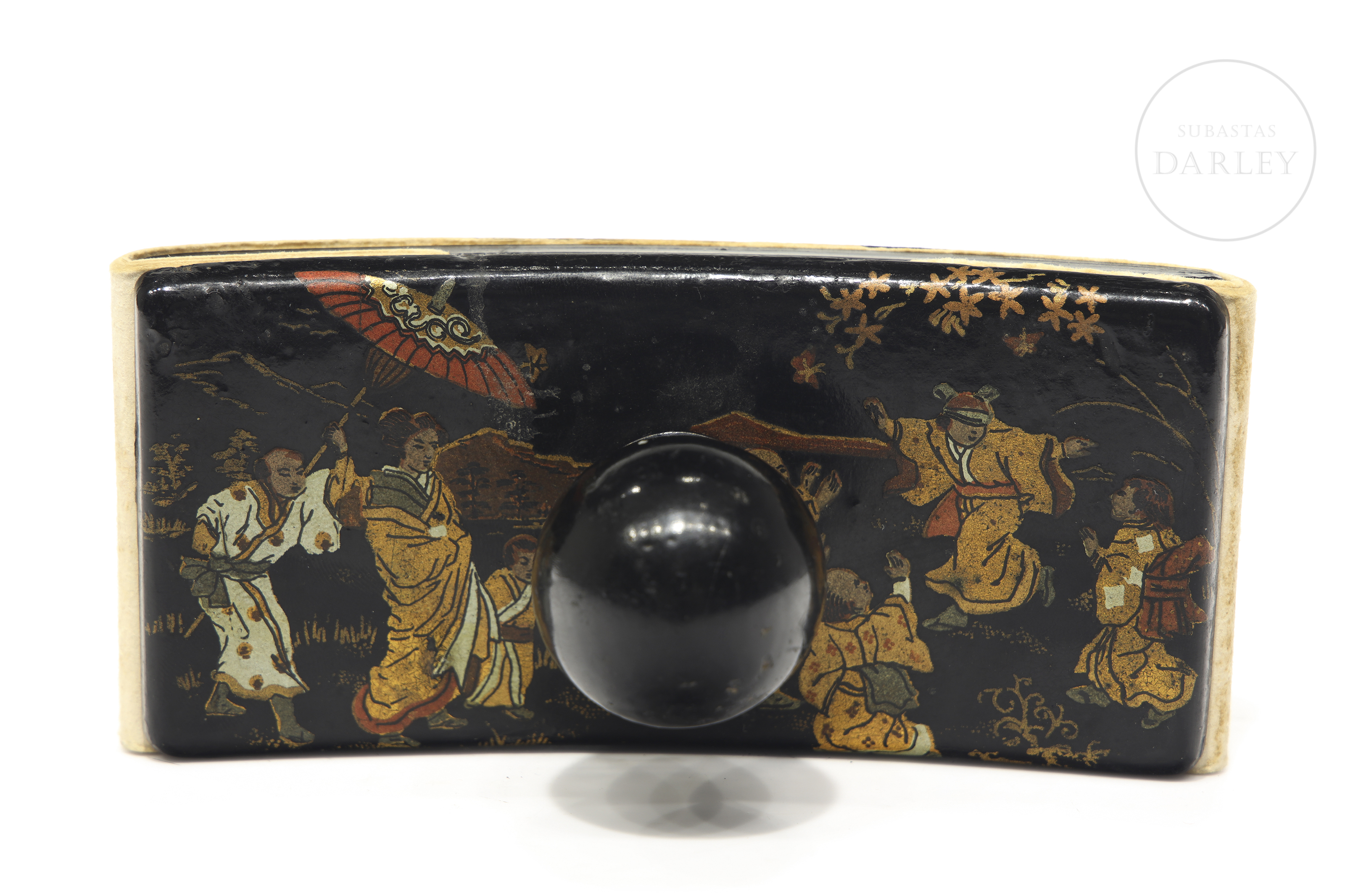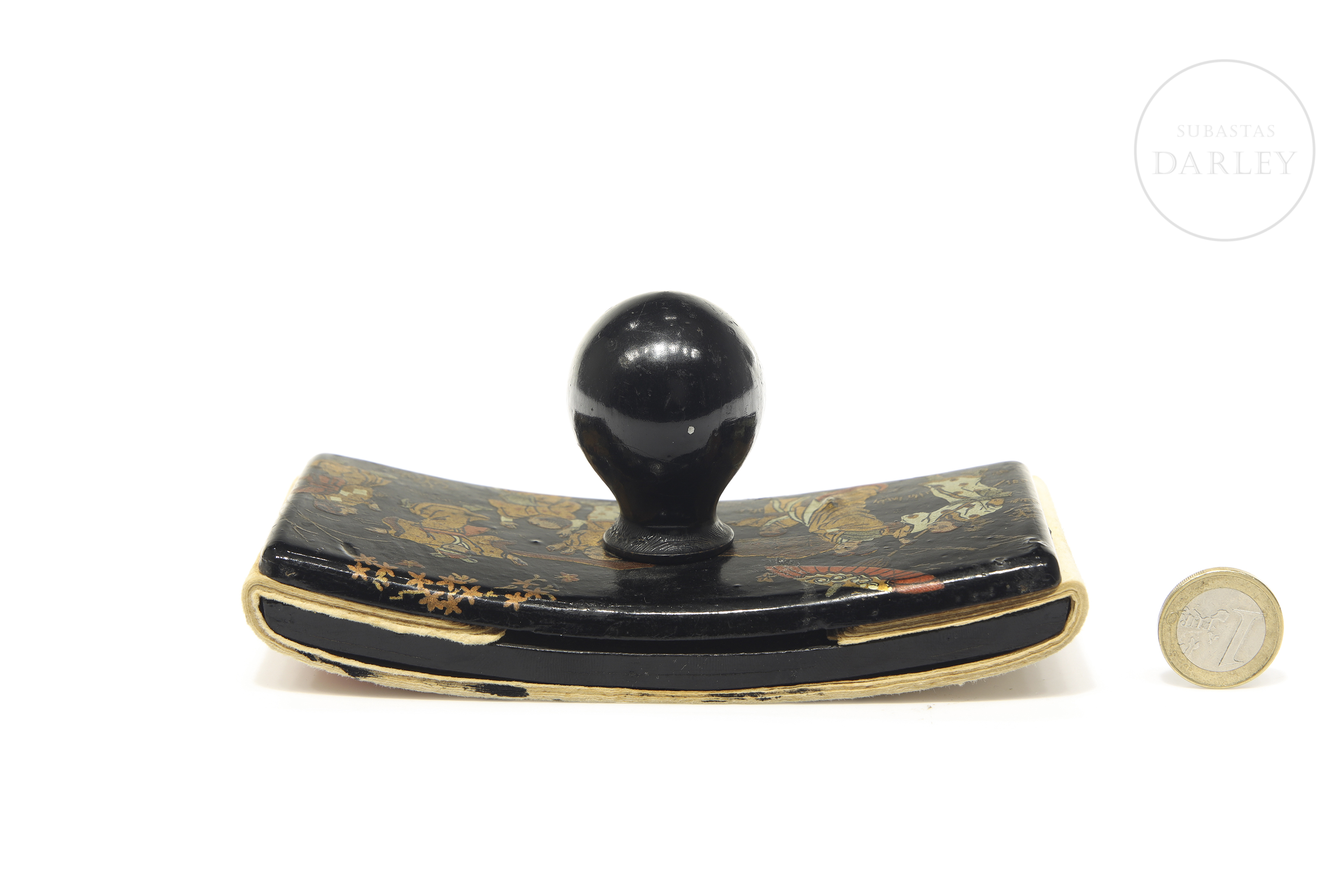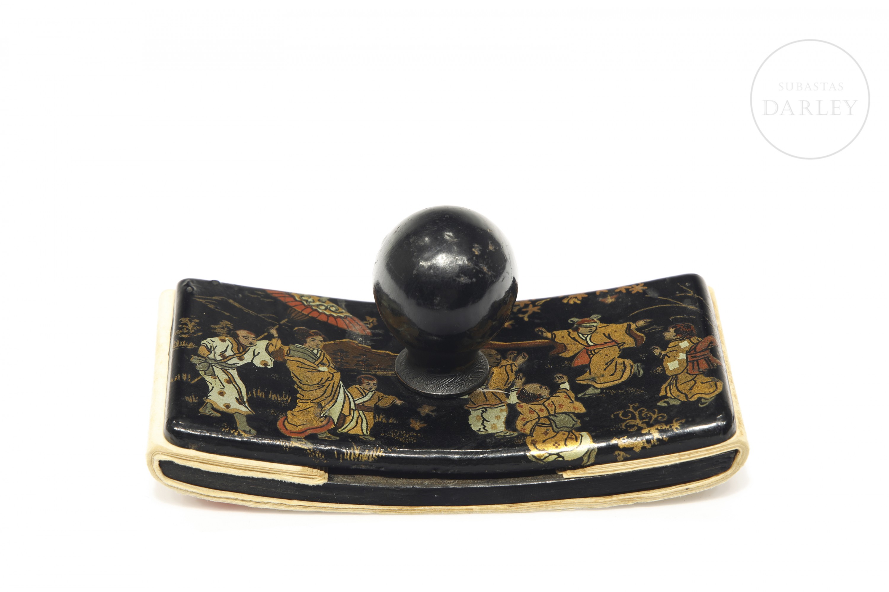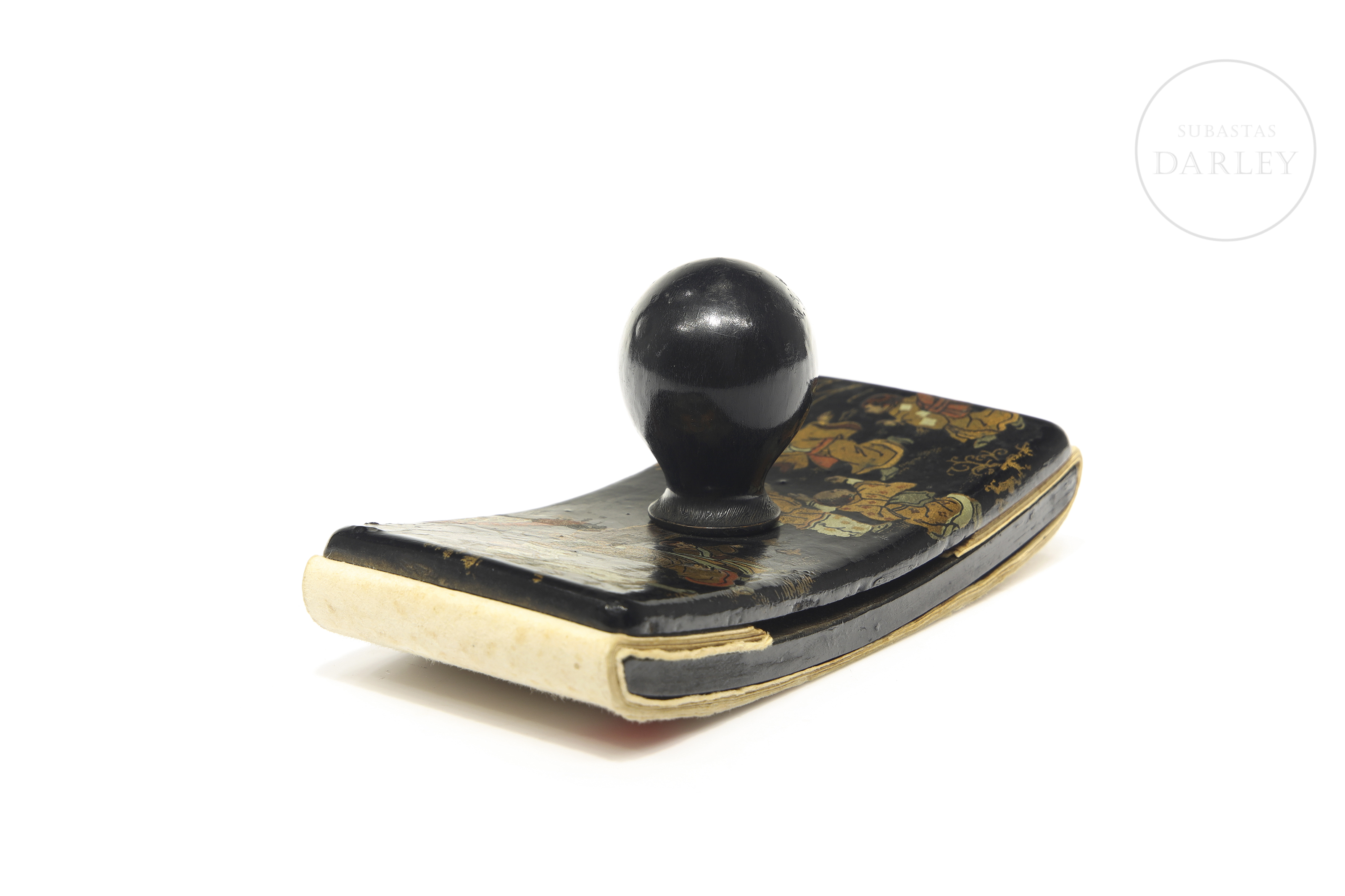 Papier-mâché blotter with a wooden knob. The upper surface depicts a scene in gilt tones with a Chinese genre theme.