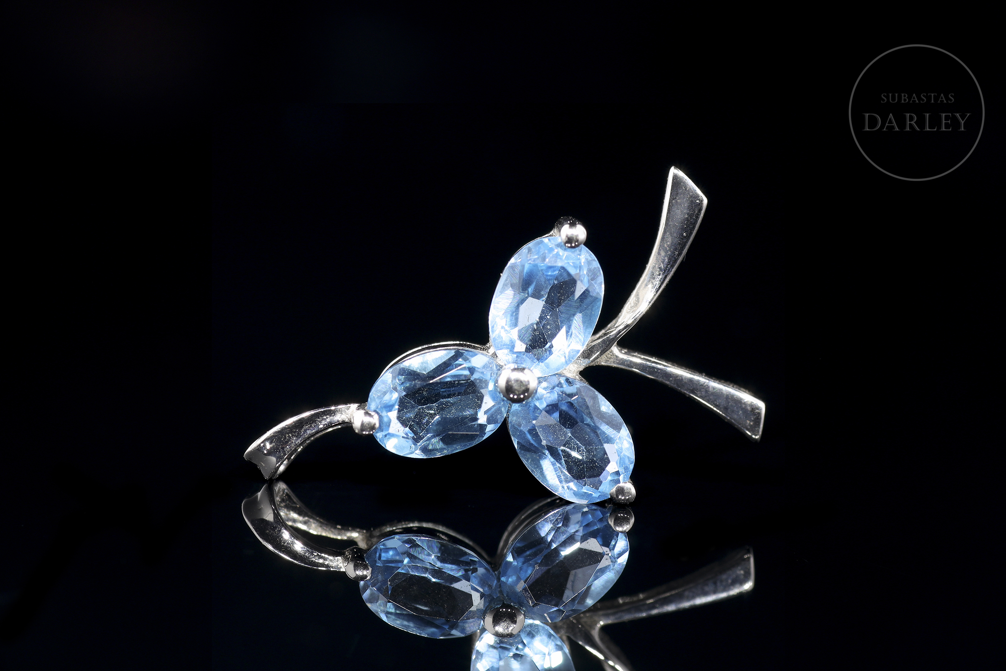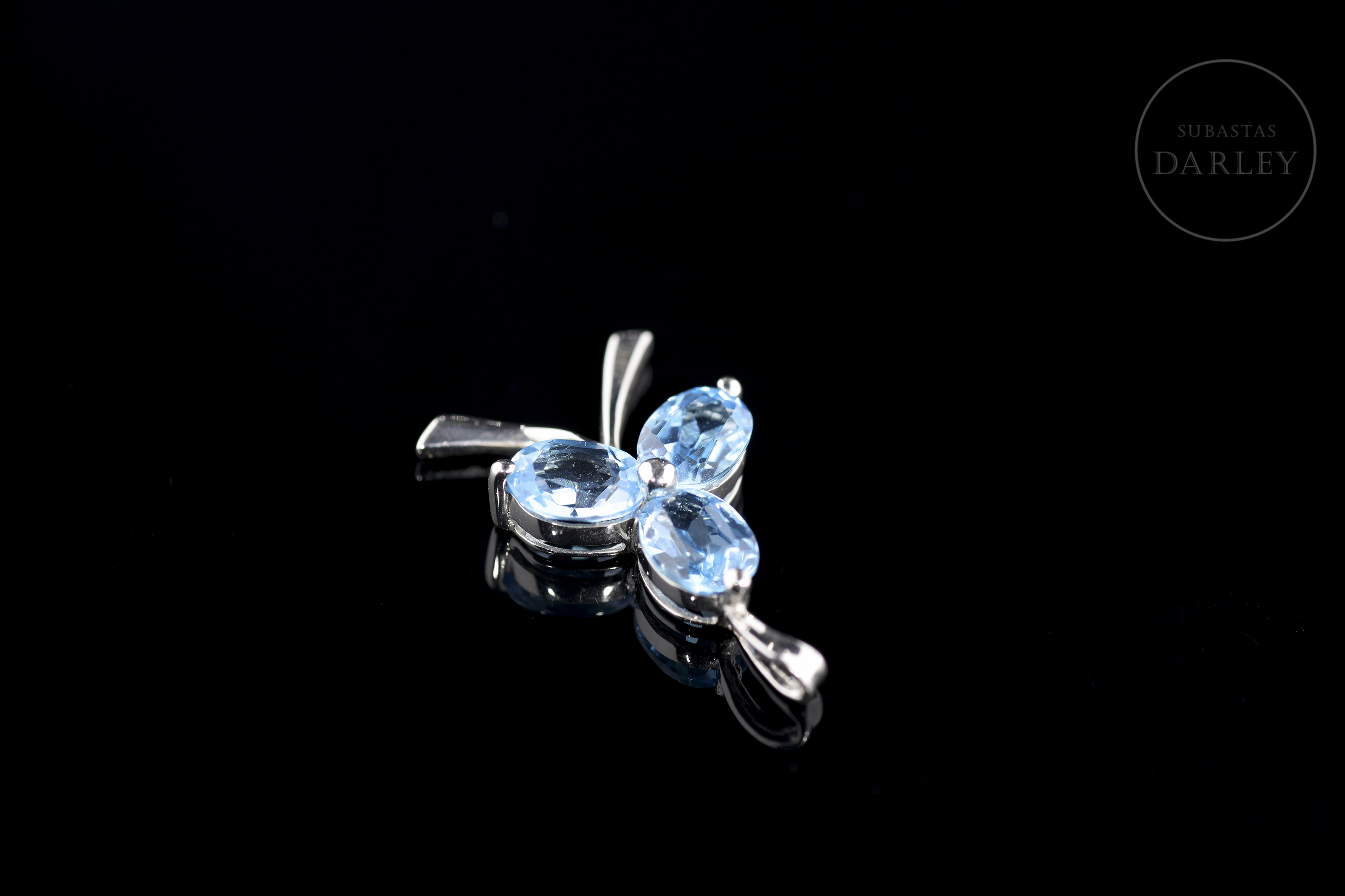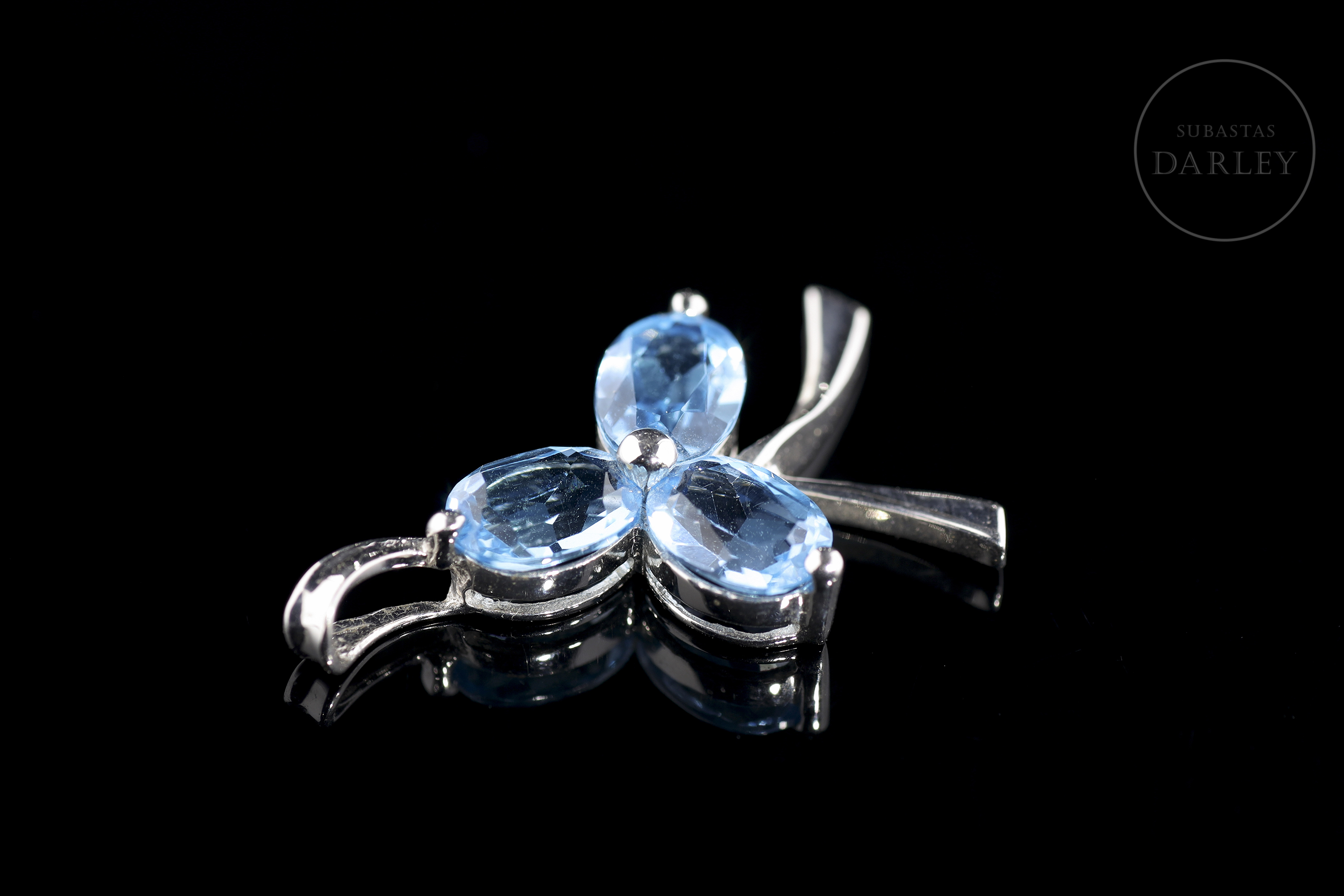 Pendant in 18k white gold with clover design formed by three oval cut topaz, 2.10 cts (approx.) in total. Translucent blue stones set in claws. Gallon-shaped wedge handle.