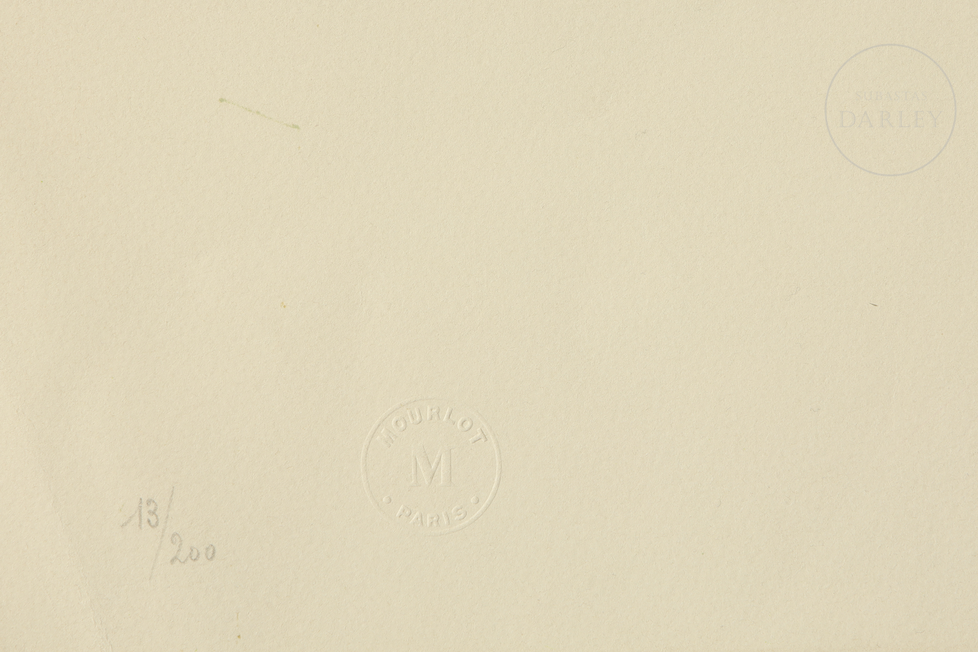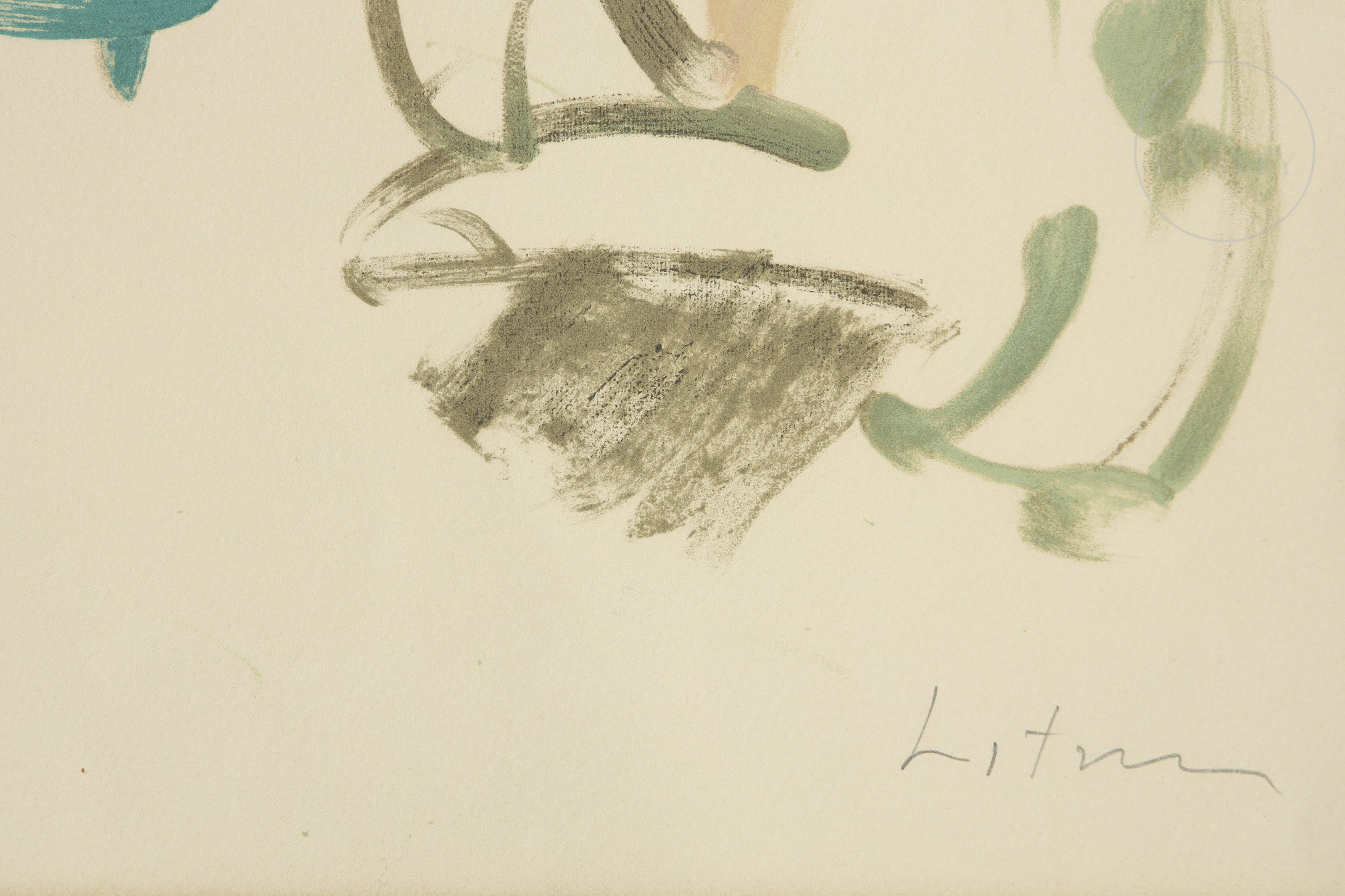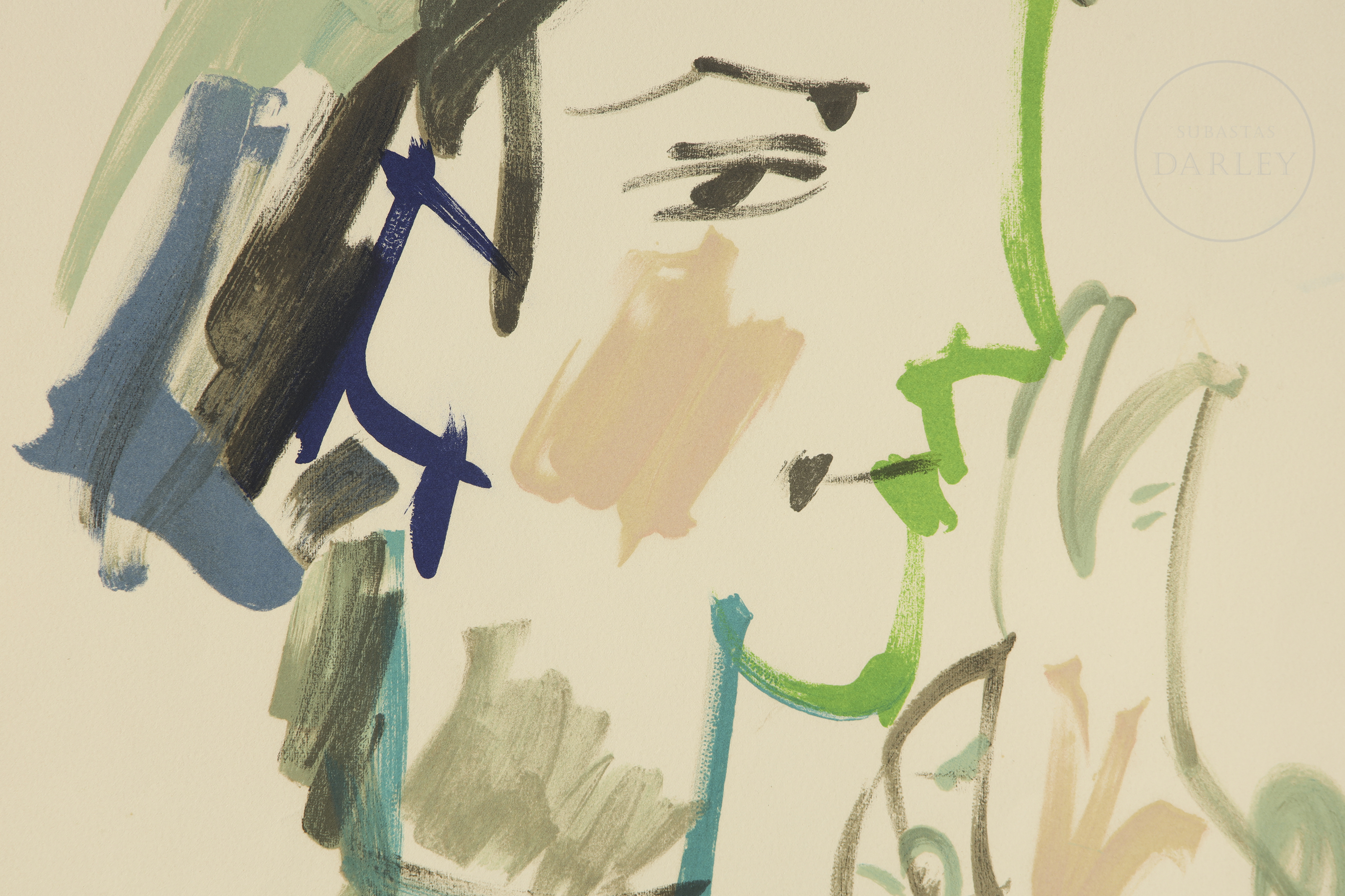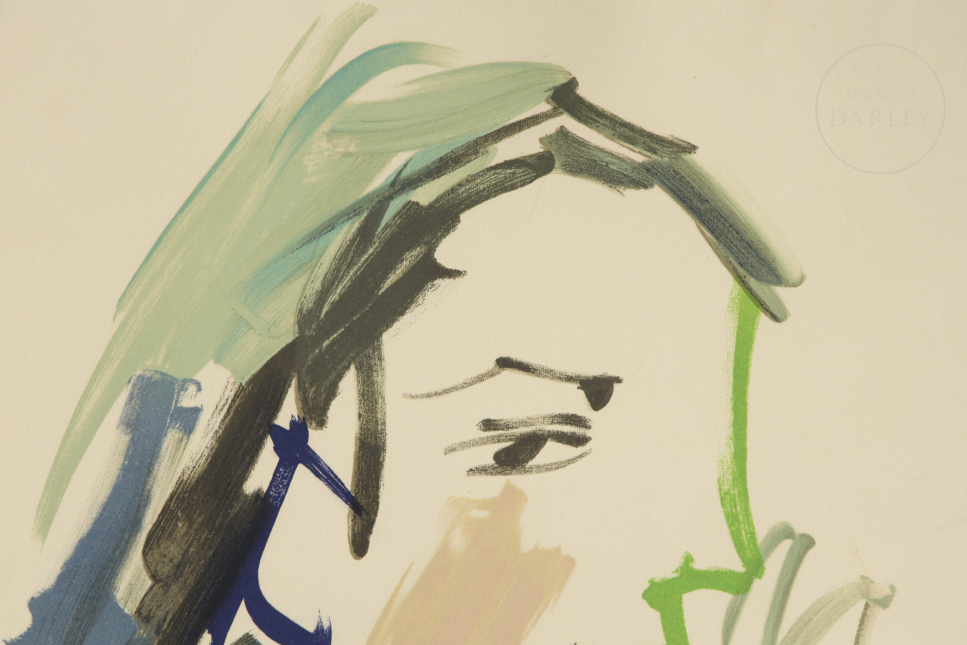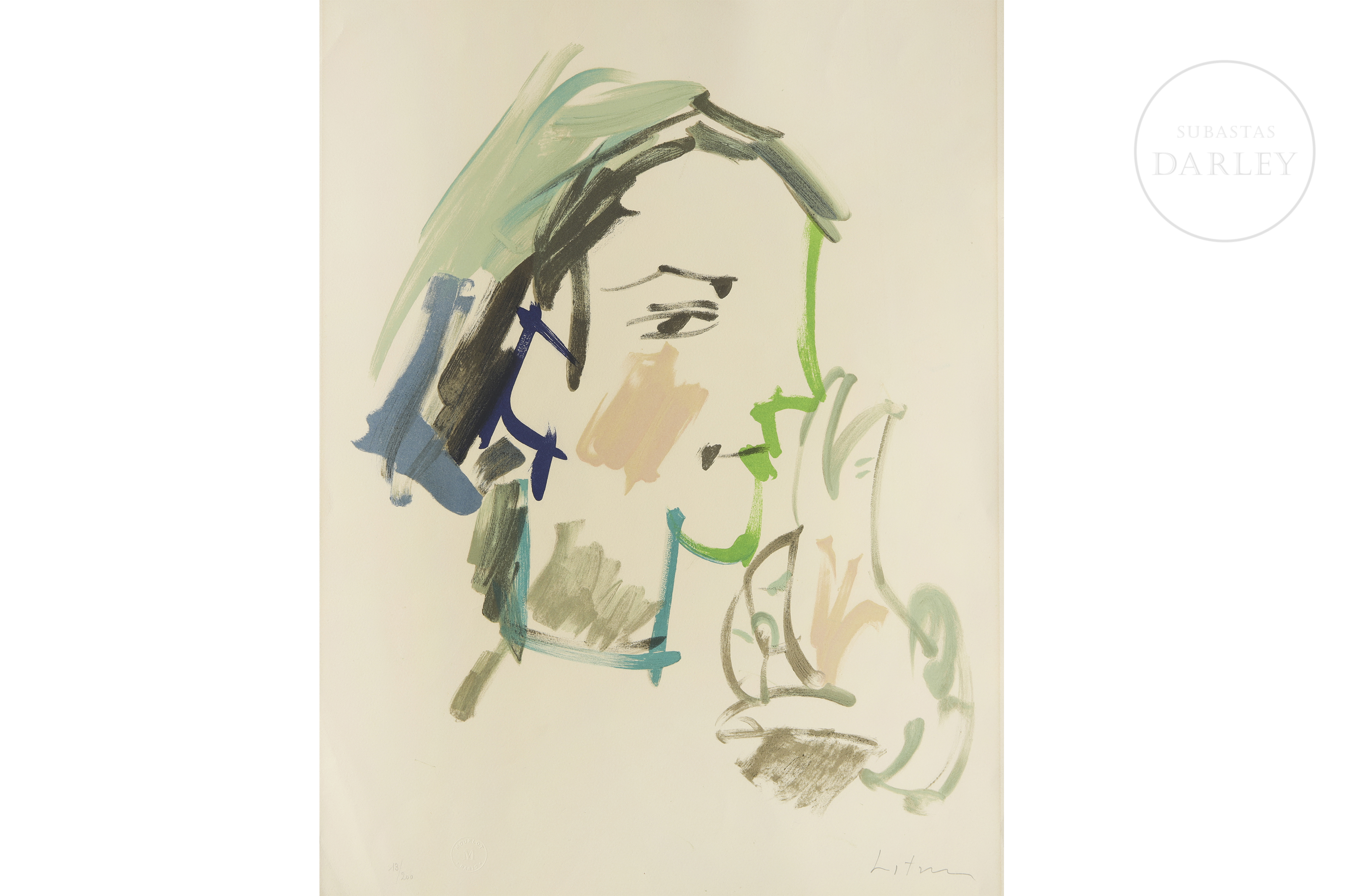 Lithograph on paper. Modern composition depicting a woman's face in profile, rendered using expressionist strokes and flat areas of colour. Signed ‘Litvinovsky’ in the lower right corner. Numbered 13/200 in the lower left corner next to the dry stamp ‘MOURLOT PARIS’.