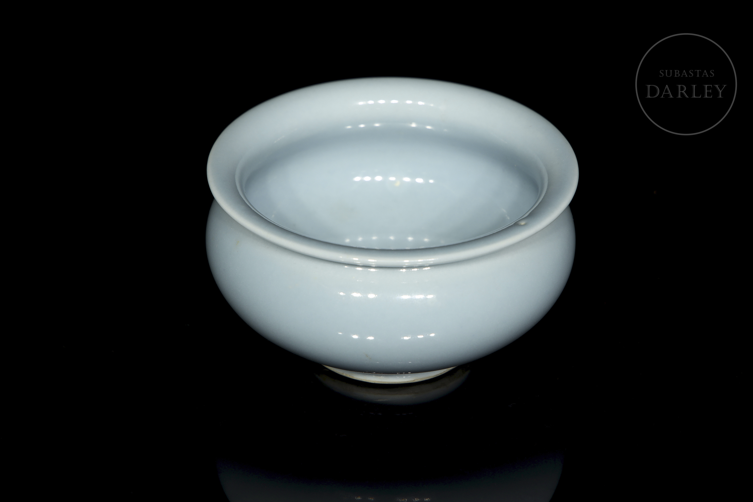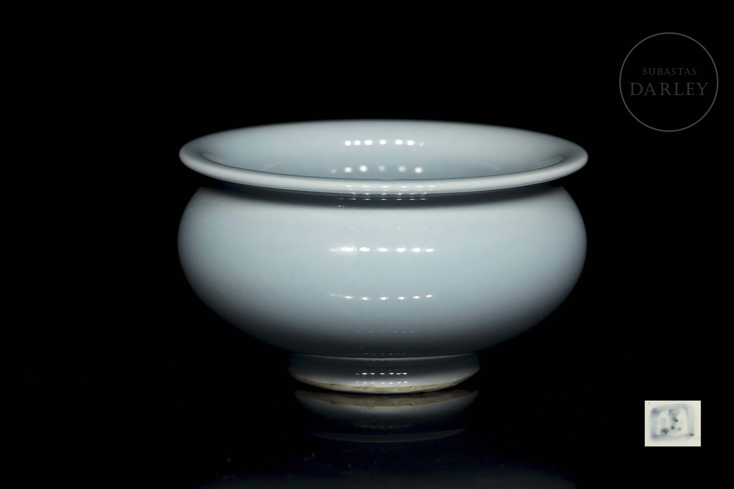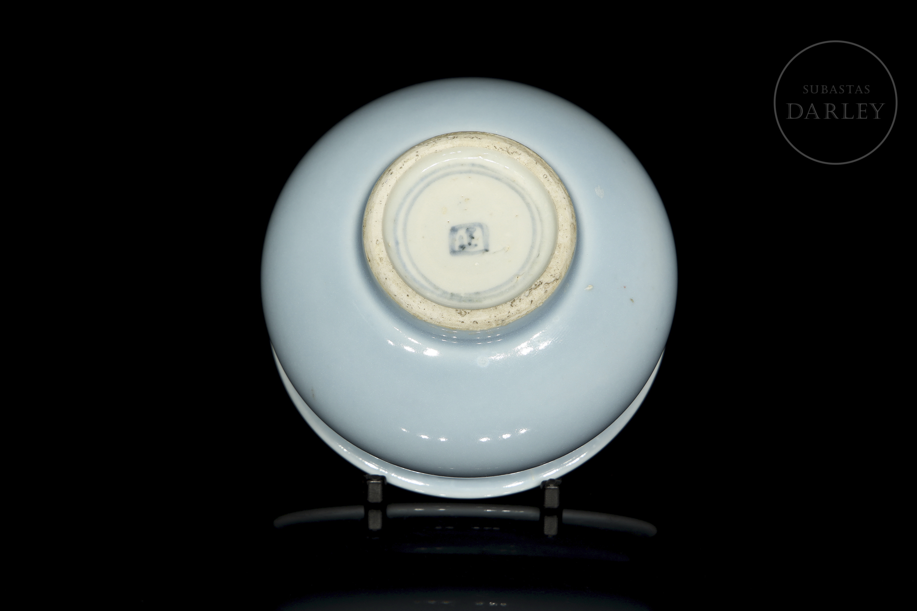 Small porcelain bowl with a globular body and wide mouth with a slightly everted lip, covered with a uniform pale blue glaze. On the base, there is a mark made in blue underglaze.