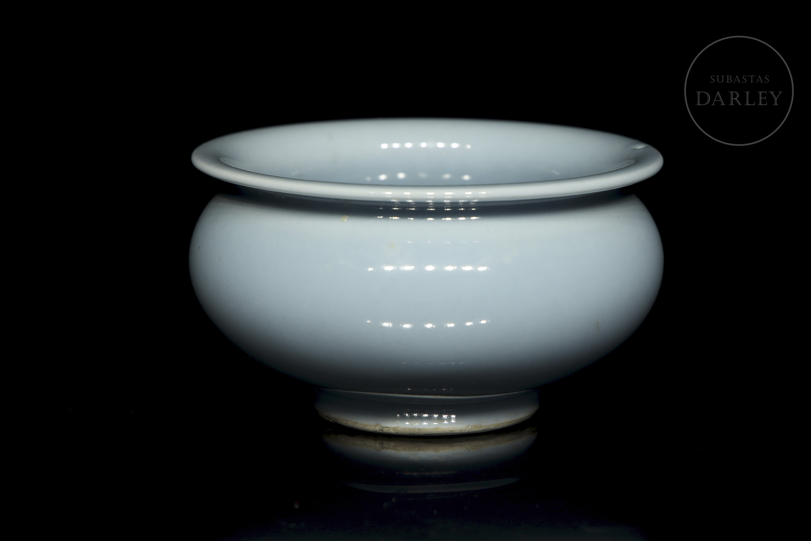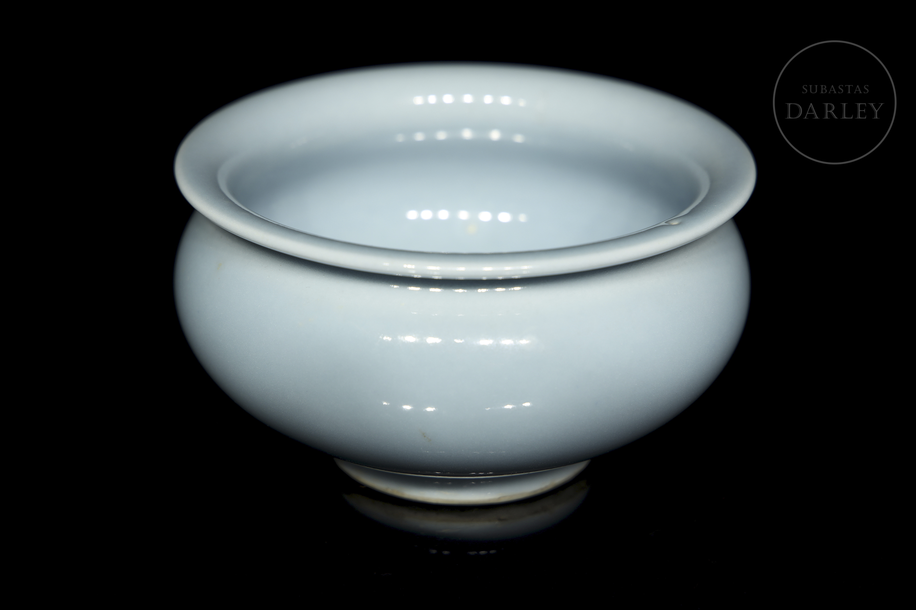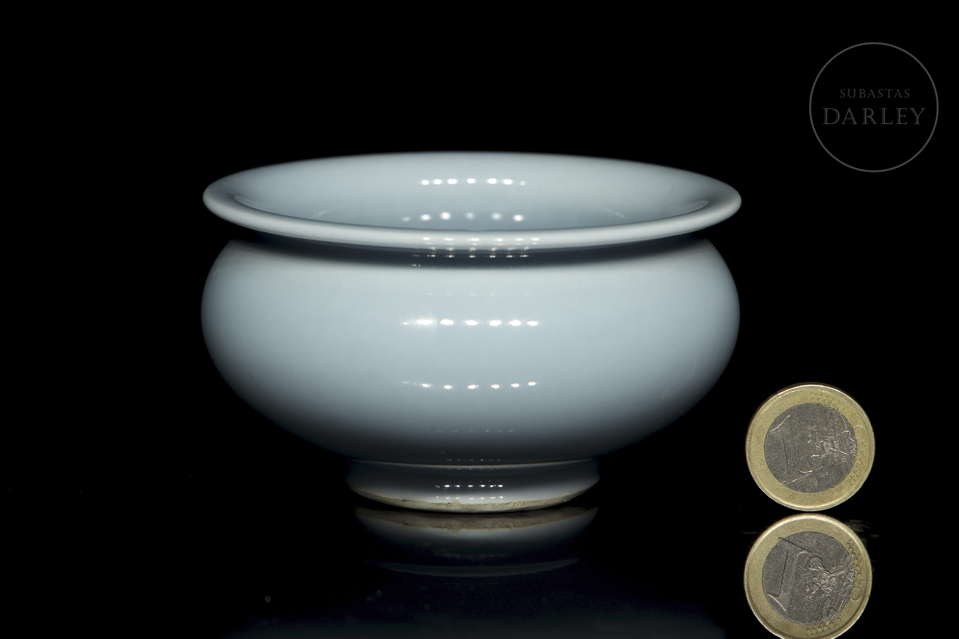 Small porcelain bowl with a globular body and wide mouth with a slightly everted lip, covered with a uniform pale blue glaze. On the base, there is a mark made in blue underglaze.