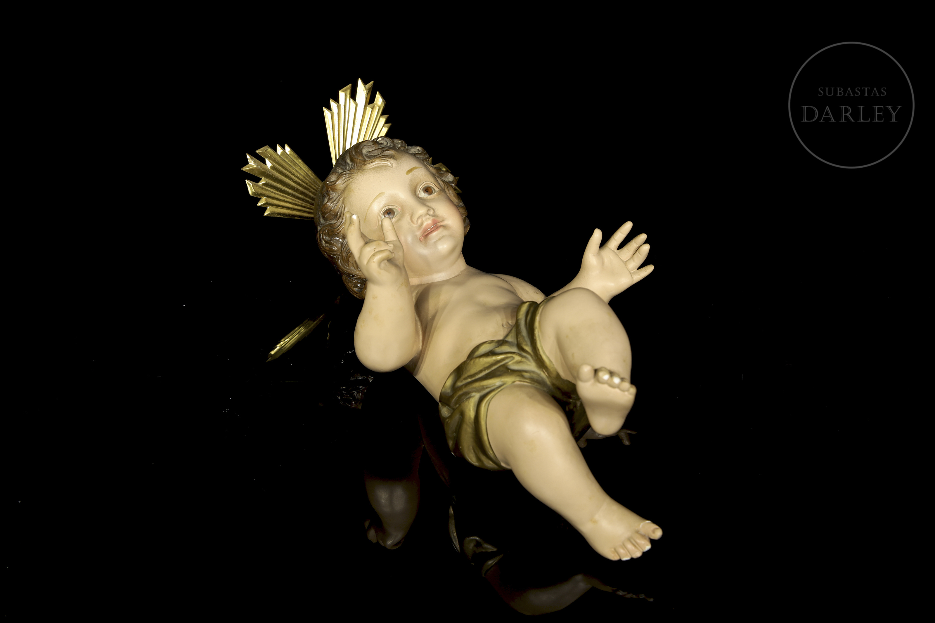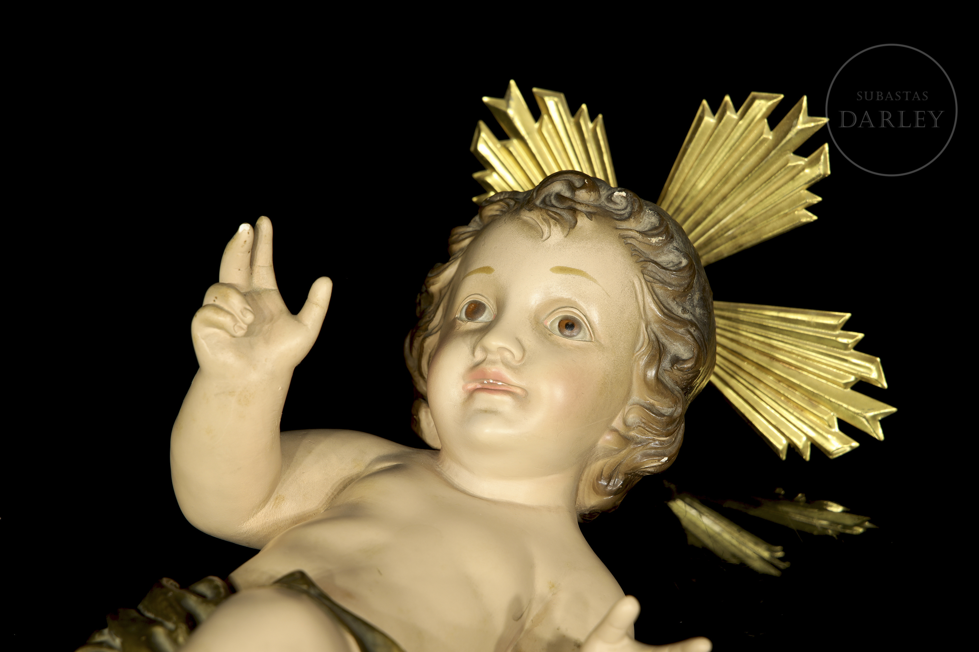 Made of porcelain, it depicts the Baby Jesus in a blessing pose. The piece stands out for its glassy finish, the use of glass eyes for greater realism, and the inclusion of golden metal crowns.