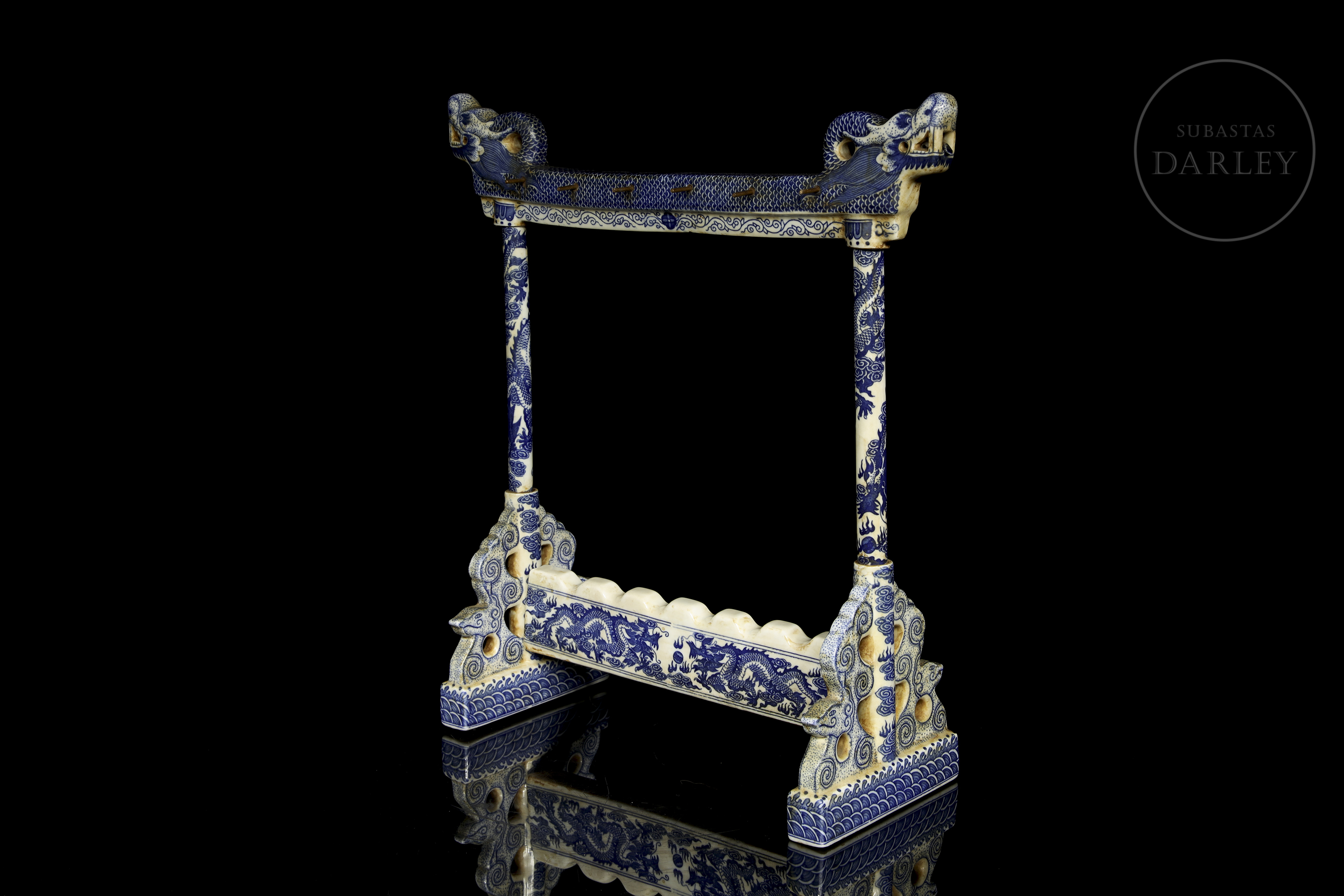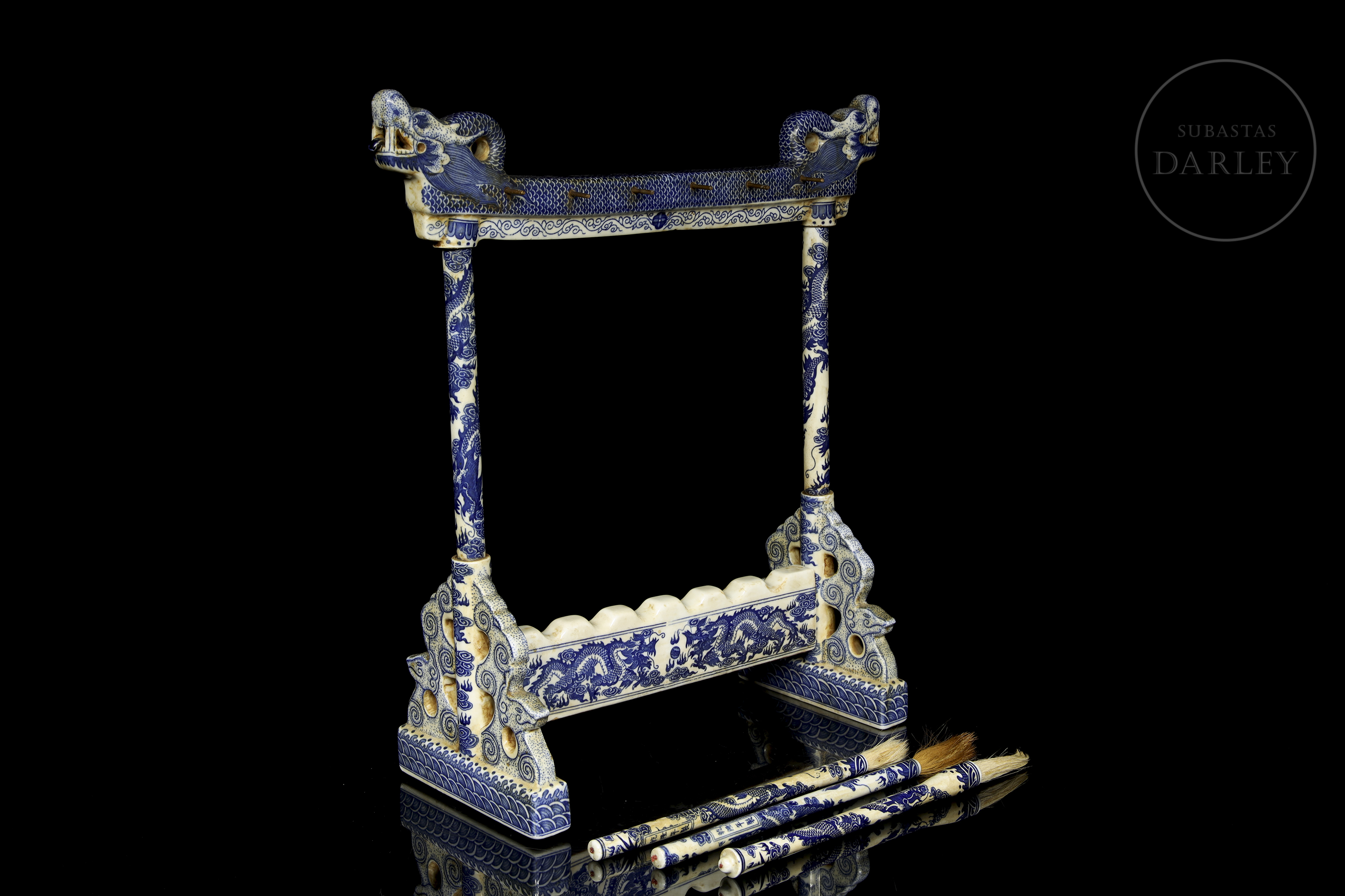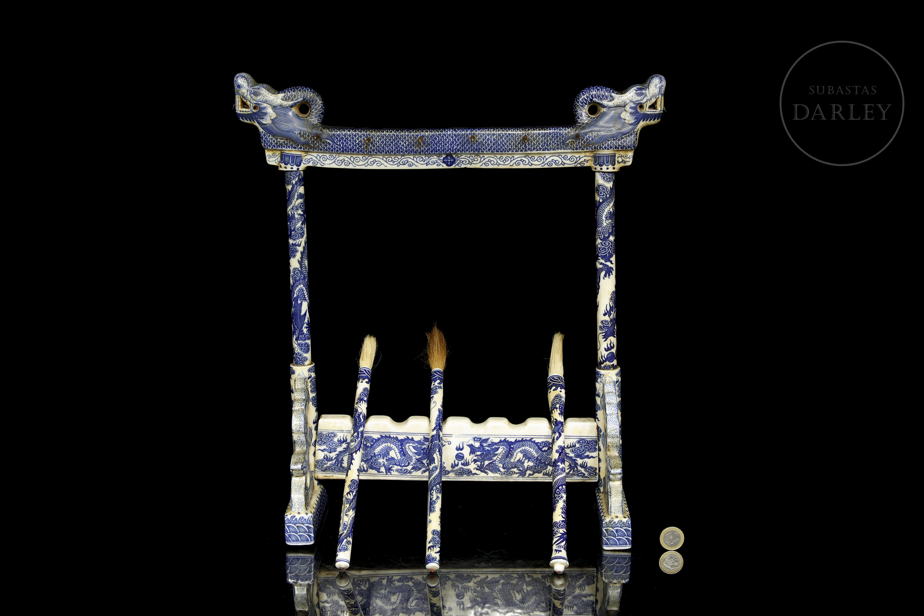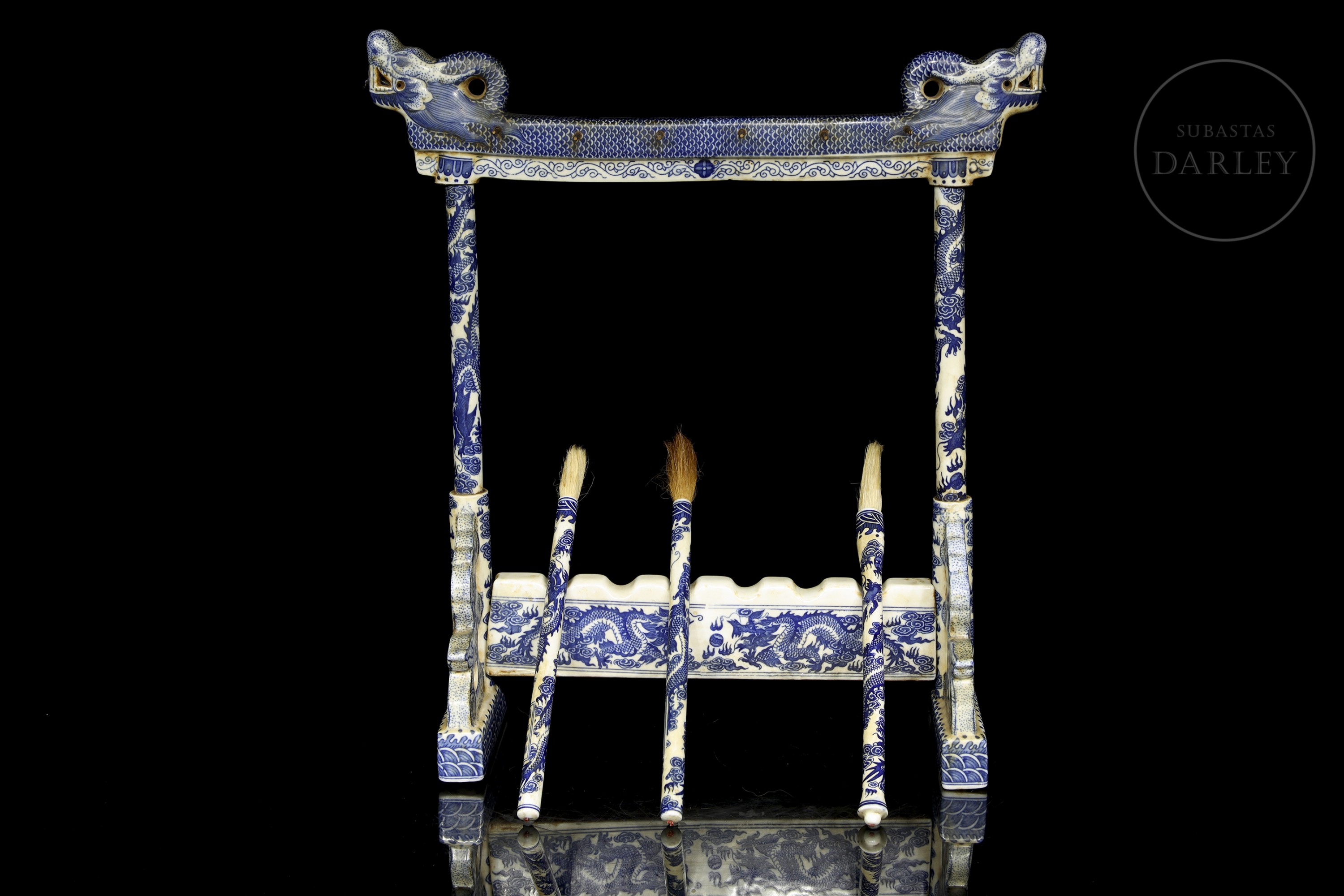 Porcelain stand decorated in underglaze blue and white with large dragons chasing flaming pearls. It stands on two rectangular feet and has an elongated structure consisting of two thin columns and two cross-beams with indentations to support the brushes. It is accompanied by three ceramic brushes with the same type of decoration on the handle.