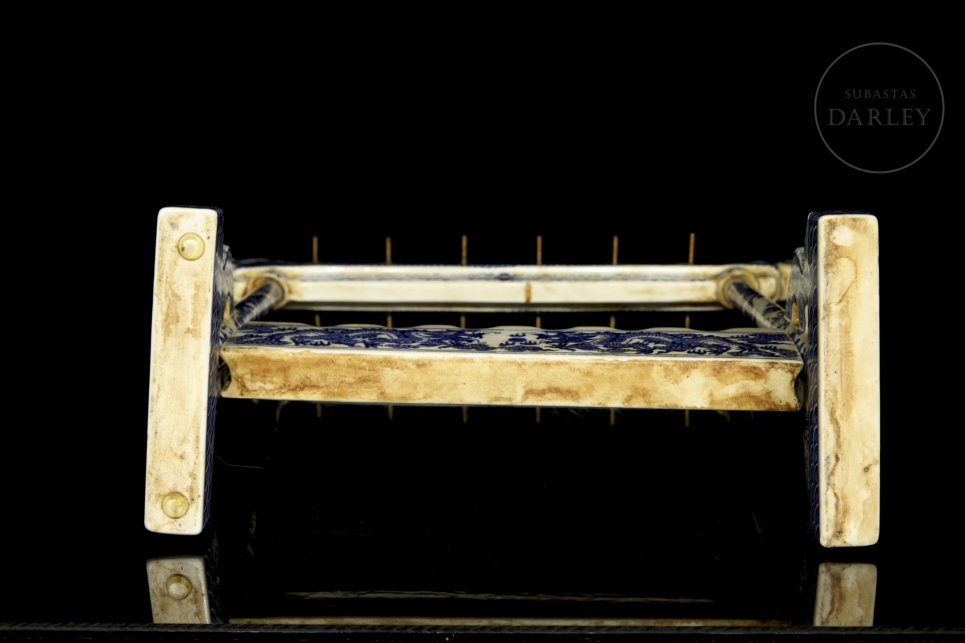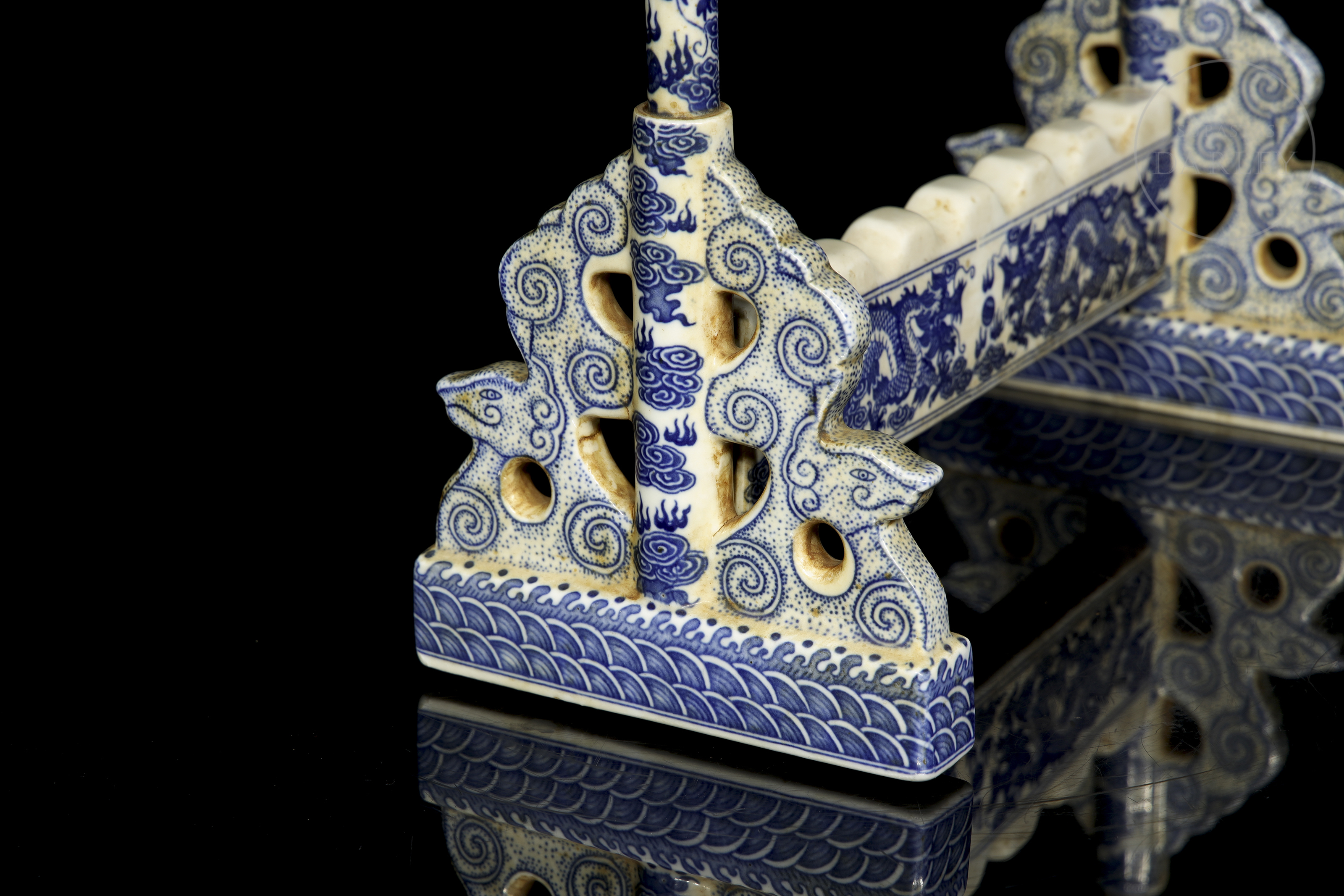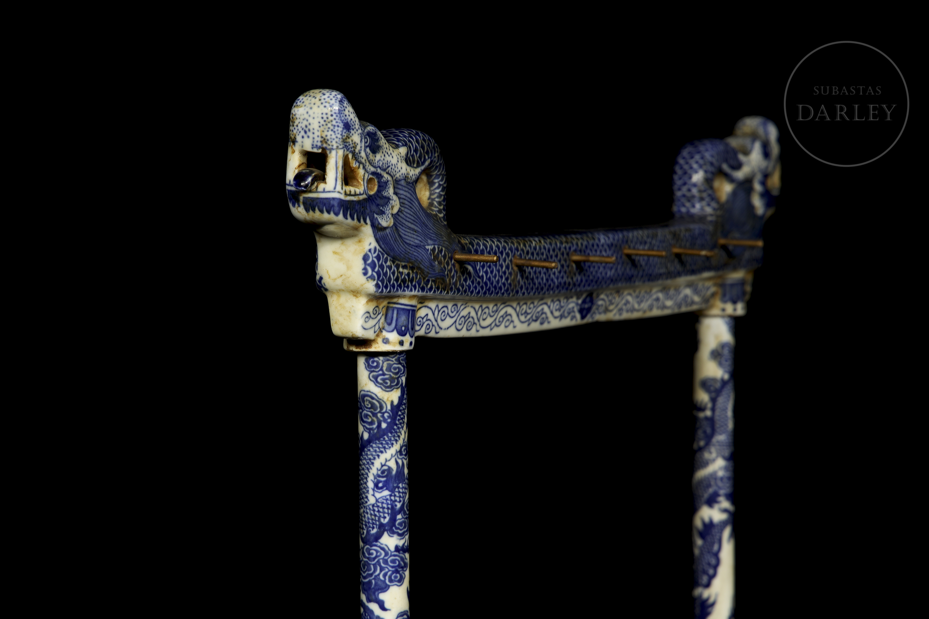 Porcelain stand decorated in underglaze blue and white with large dragons chasing flaming pearls. It stands on two rectangular feet and has an elongated structure consisting of two thin columns and two cross-beams with indentations to support the brushes. It is accompanied by three ceramic brushes with the same type of decoration on the handle.