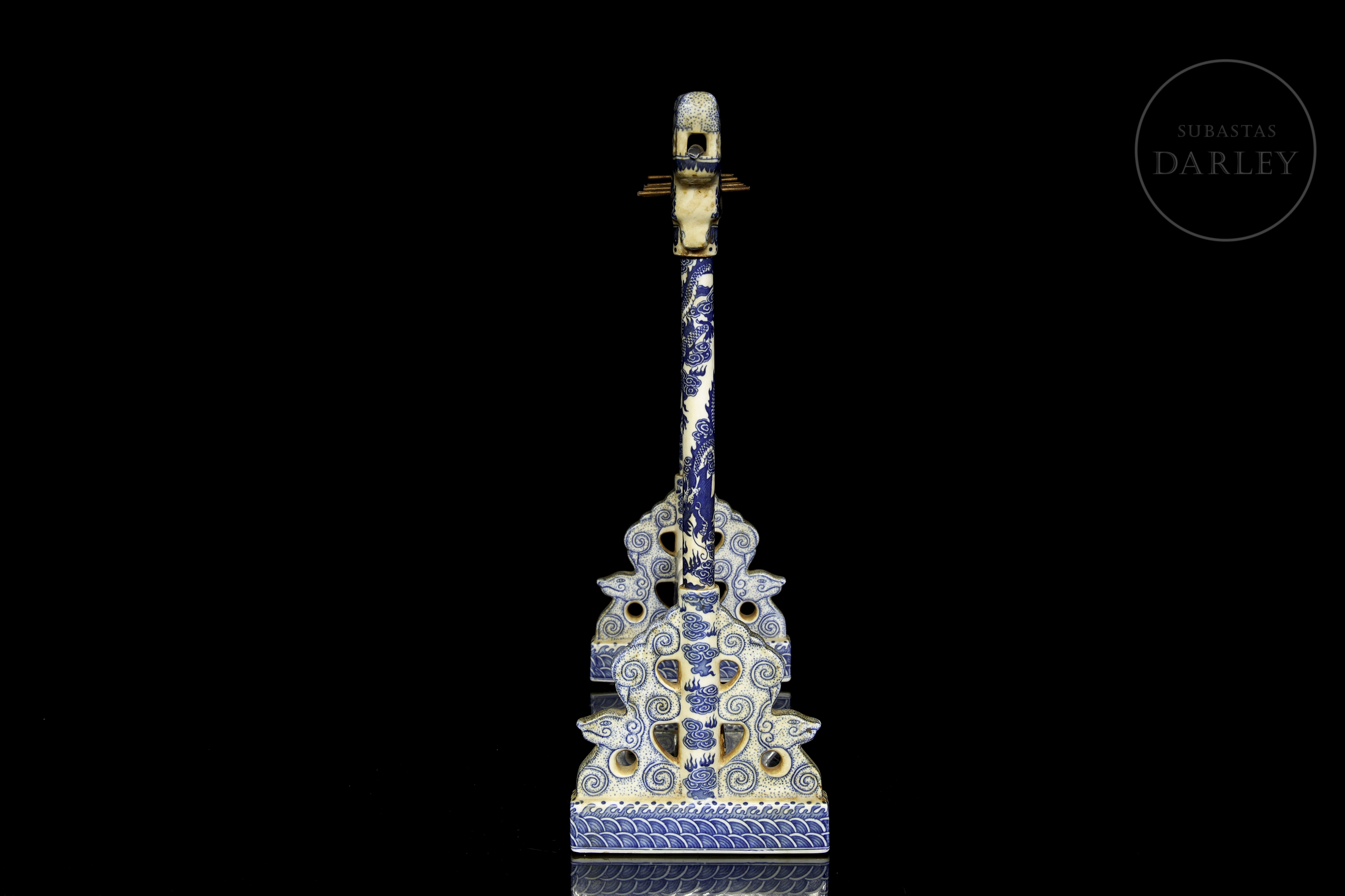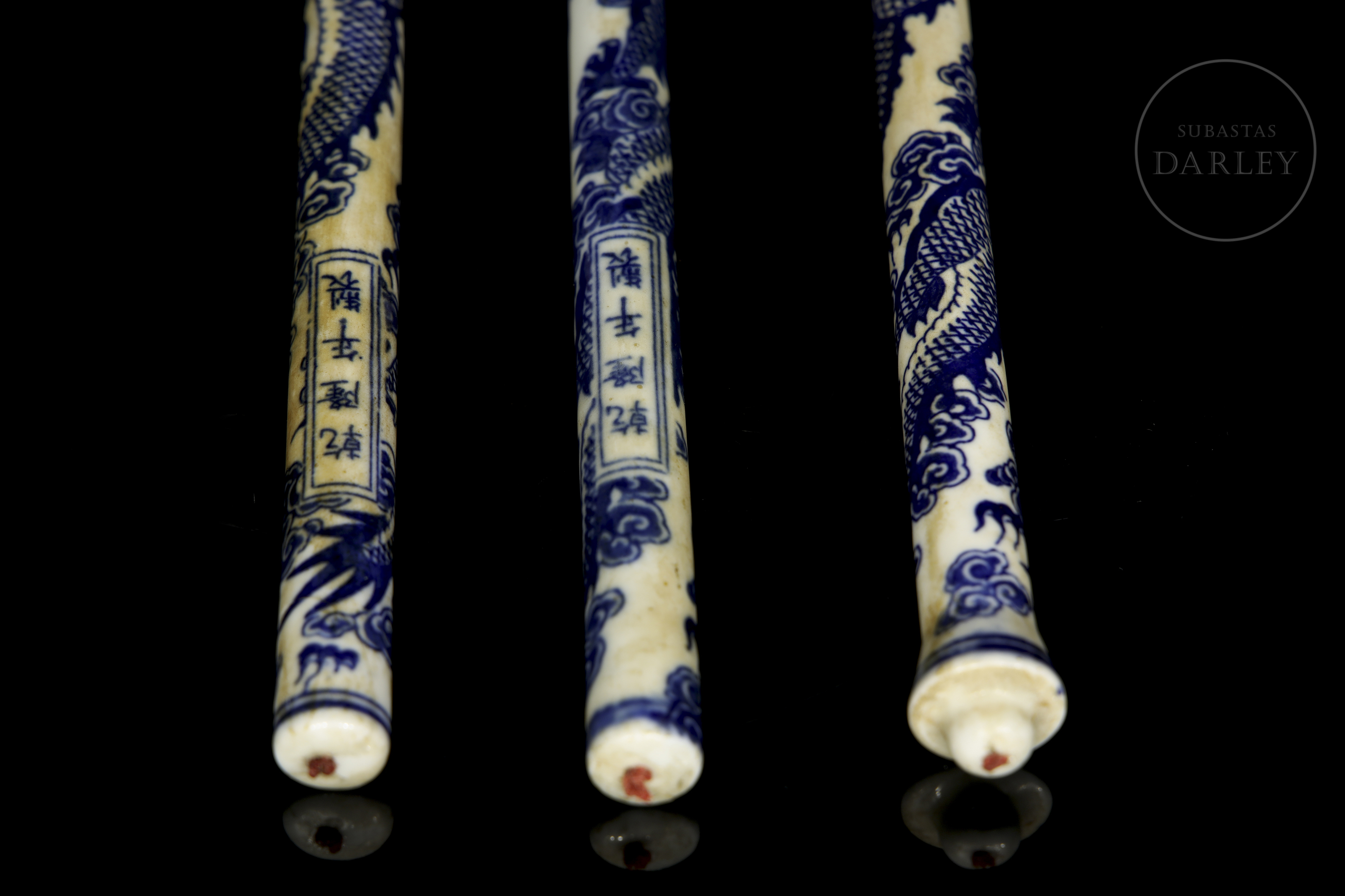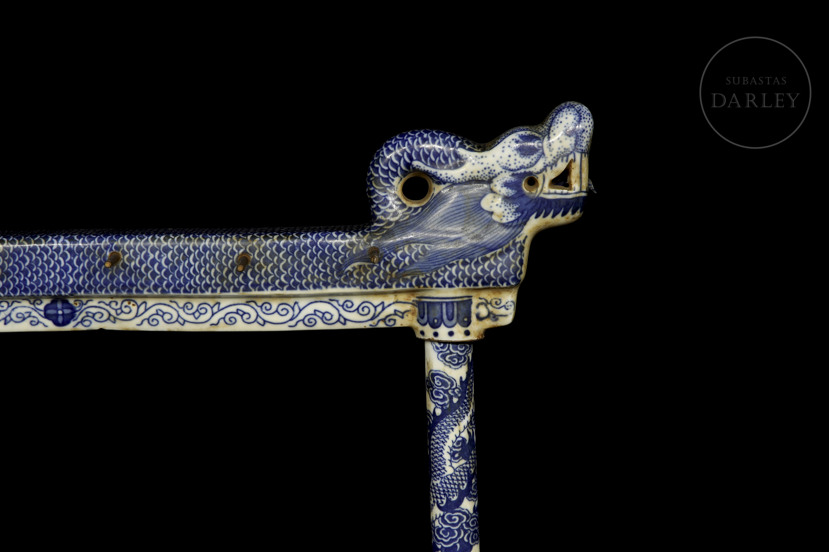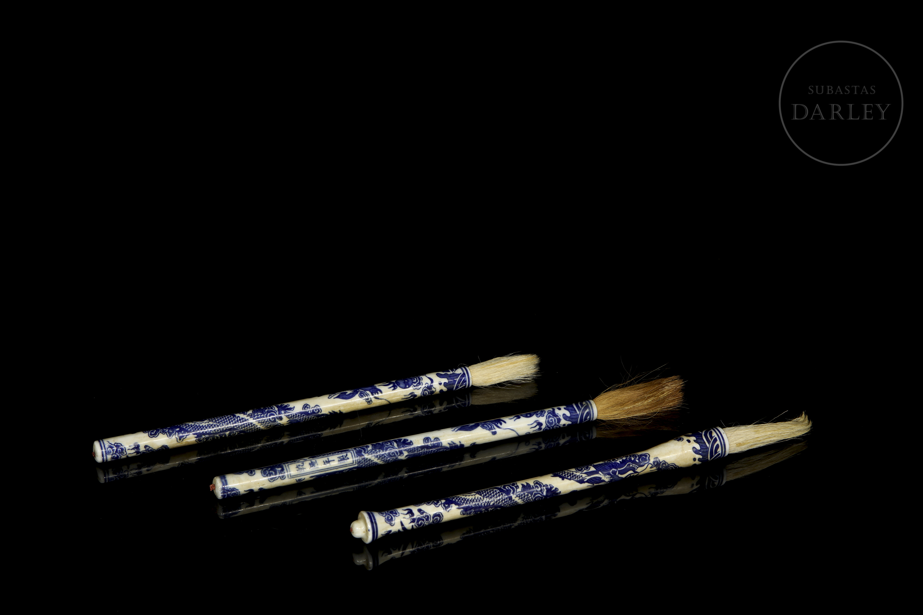Porcelain stand decorated in underglaze blue and white with large dragons chasing flaming pearls. It stands on two rectangular feet and has an elongated structure consisting of two thin columns and two cross-beams with indentations to support the brushes. It is accompanied by three ceramic brushes with the same type of decoration on the handle.