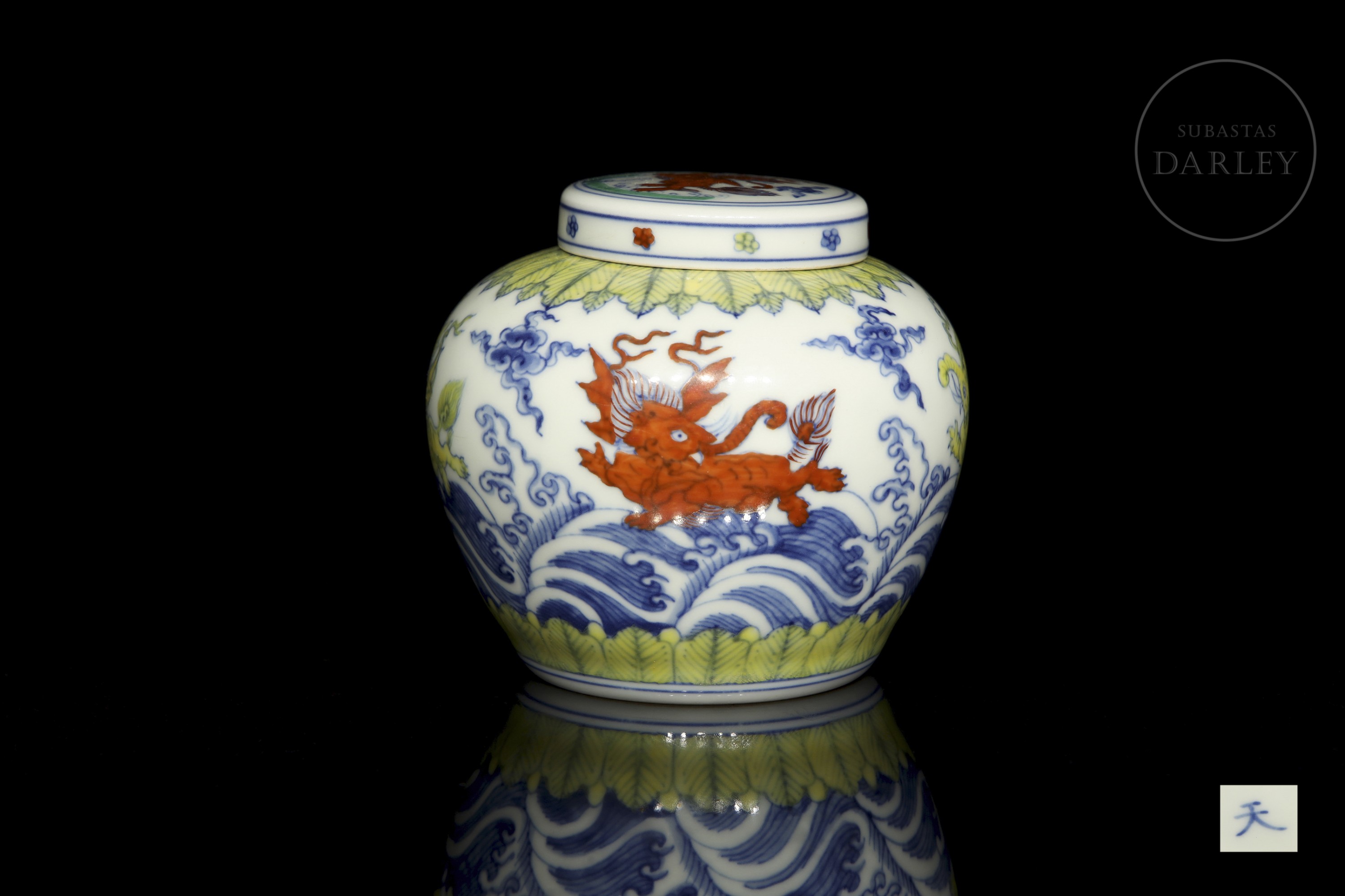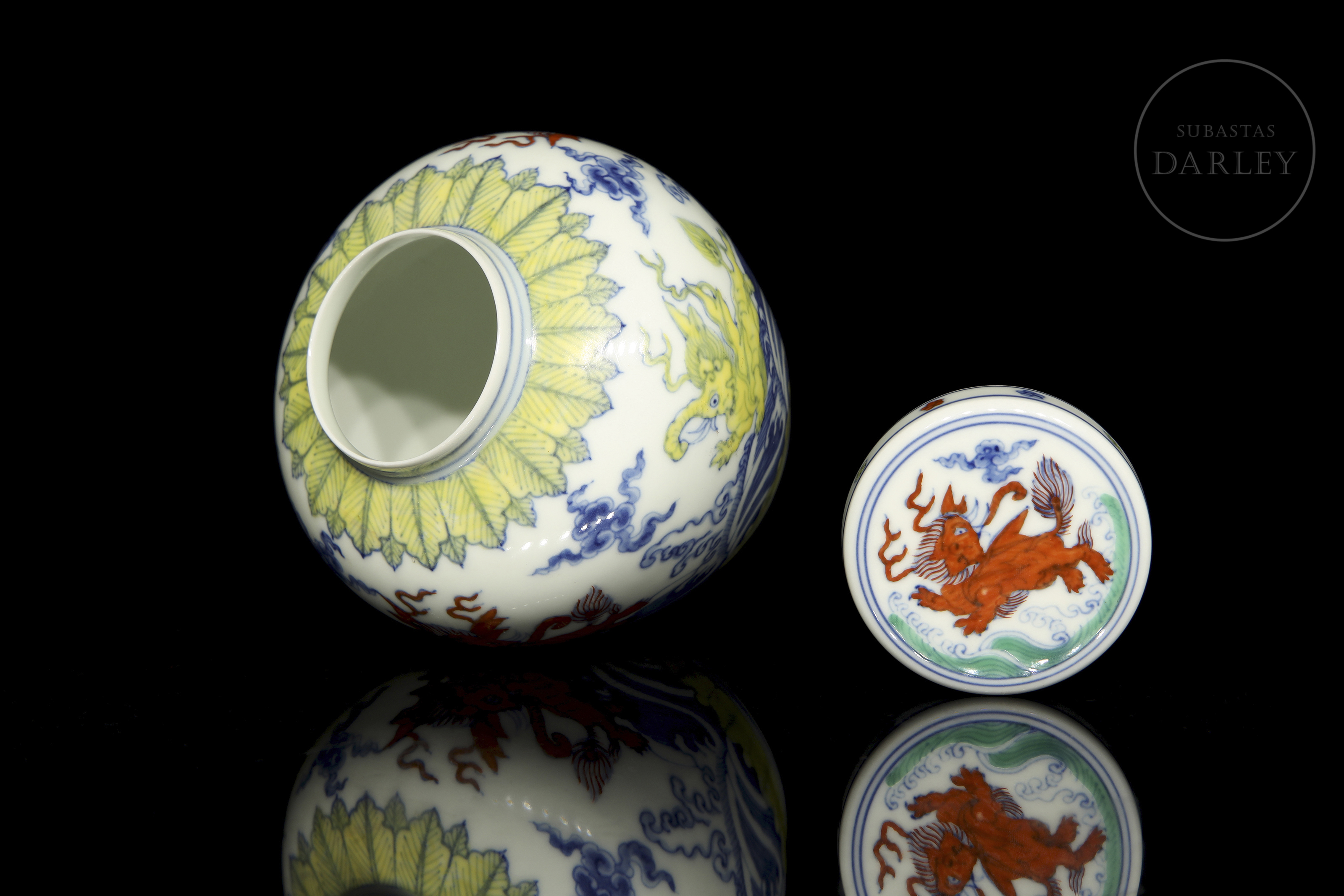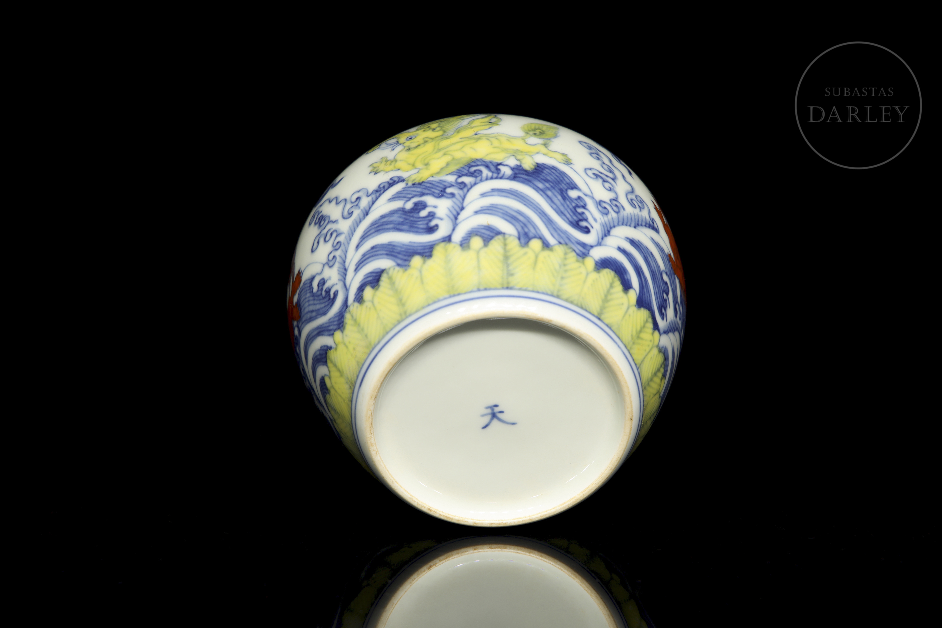 Globular porcelain jar with lid, decorated in polychrome ‘wucai’ enamels. The body features a continuous design with mythological creatures riding waves in cobalt blue, with decorative clouds in blue. Stylised leaf borders at the base and neck complete the composition. The base bears a blue underglaze character ‘天’.