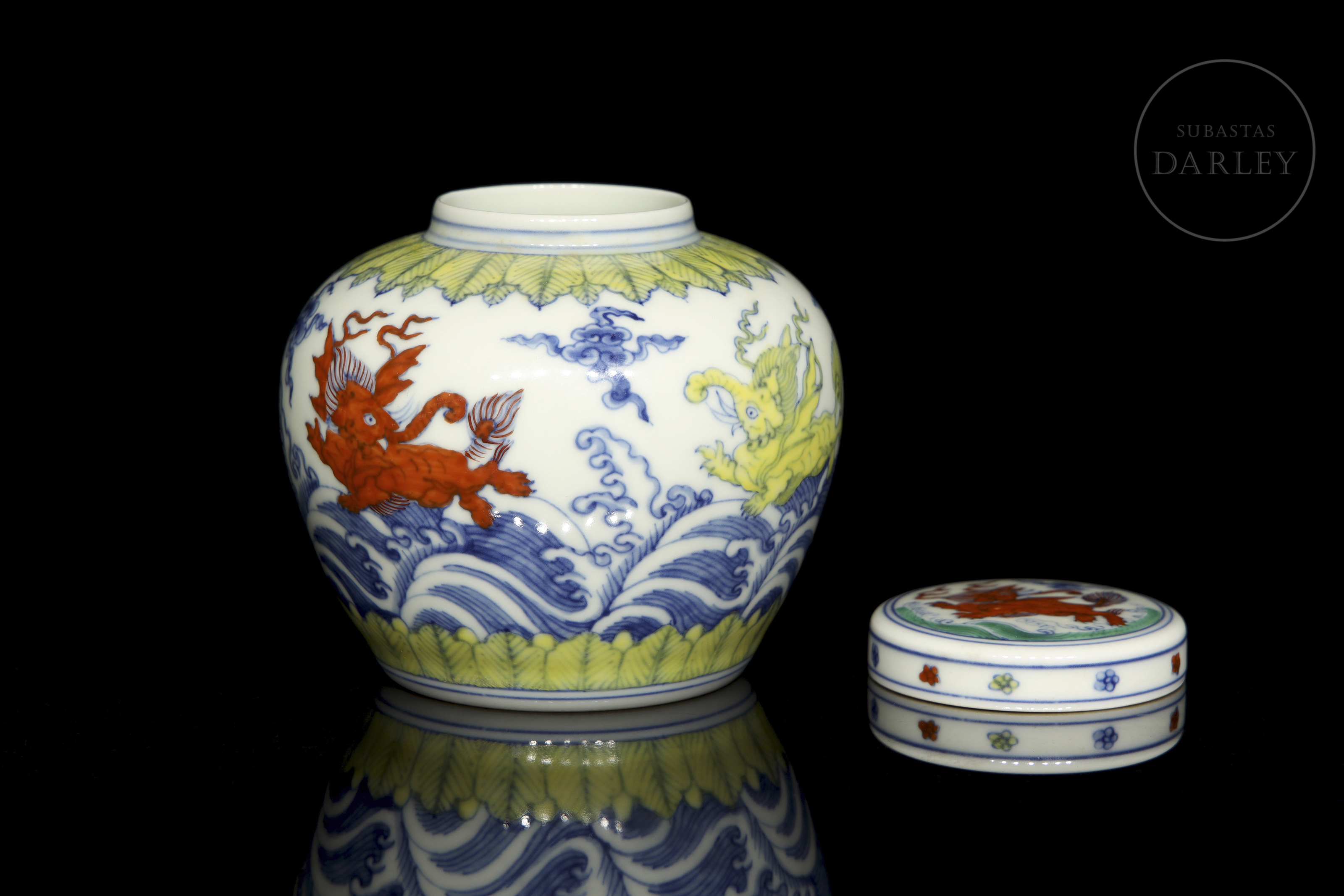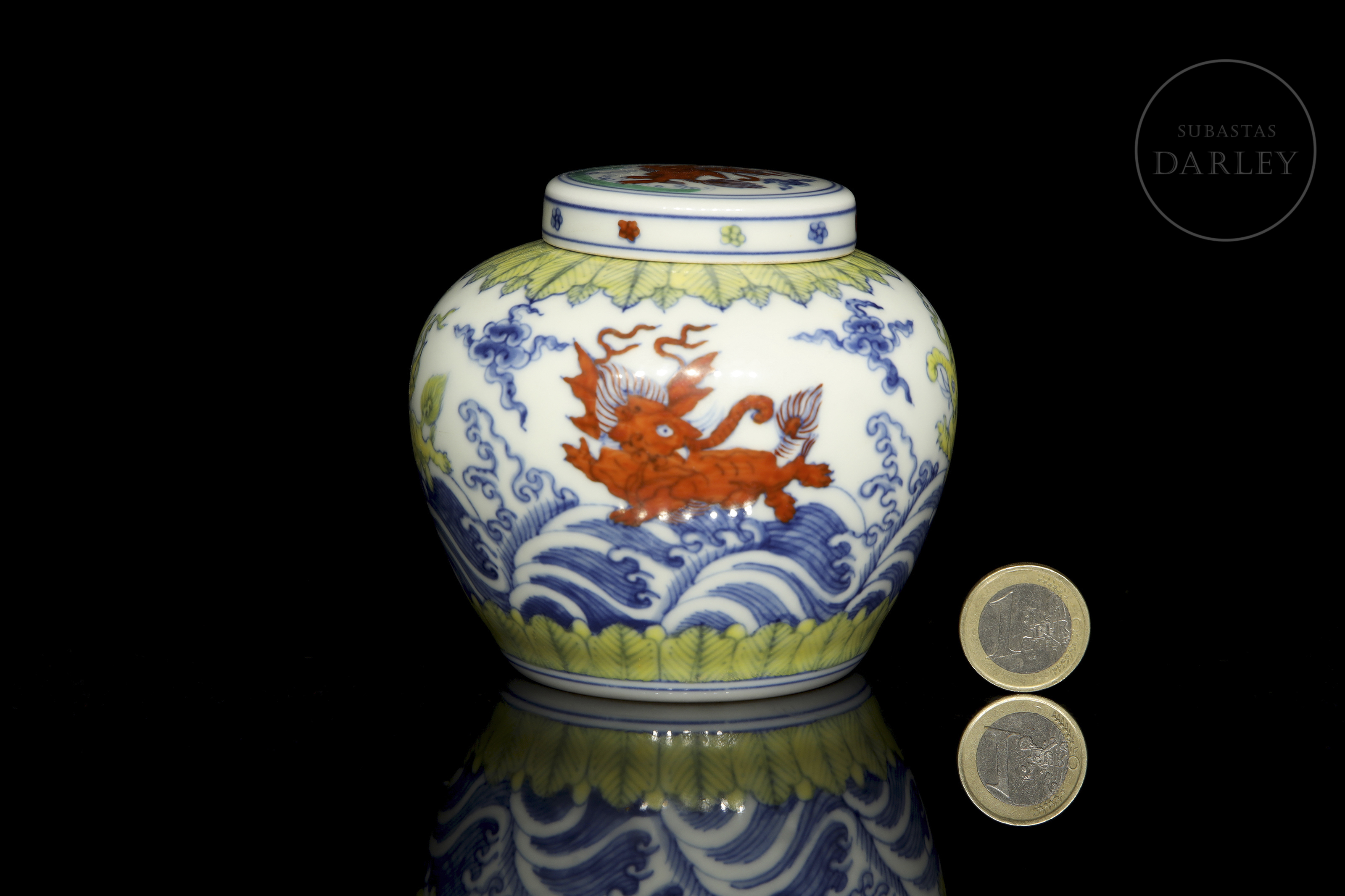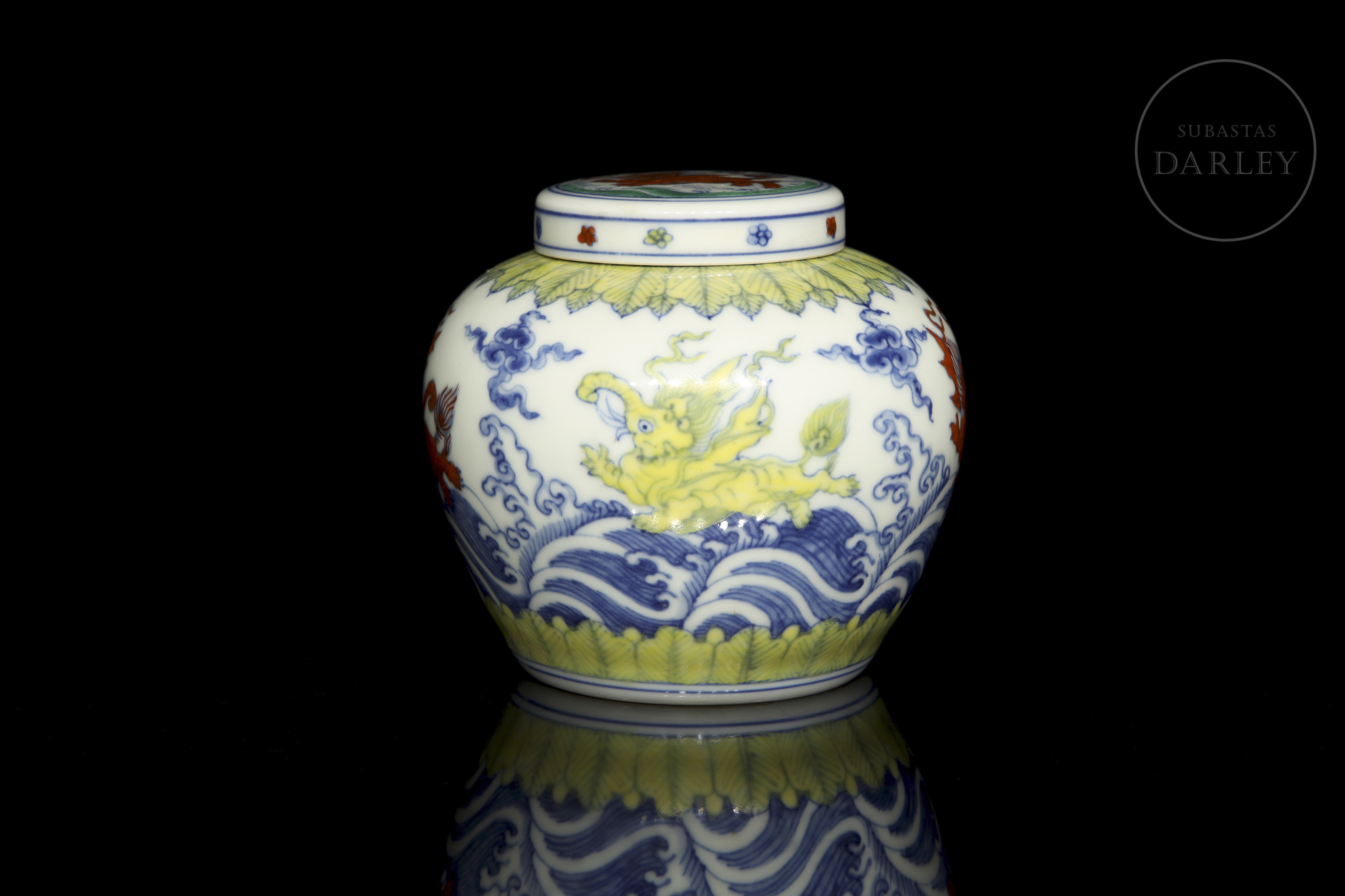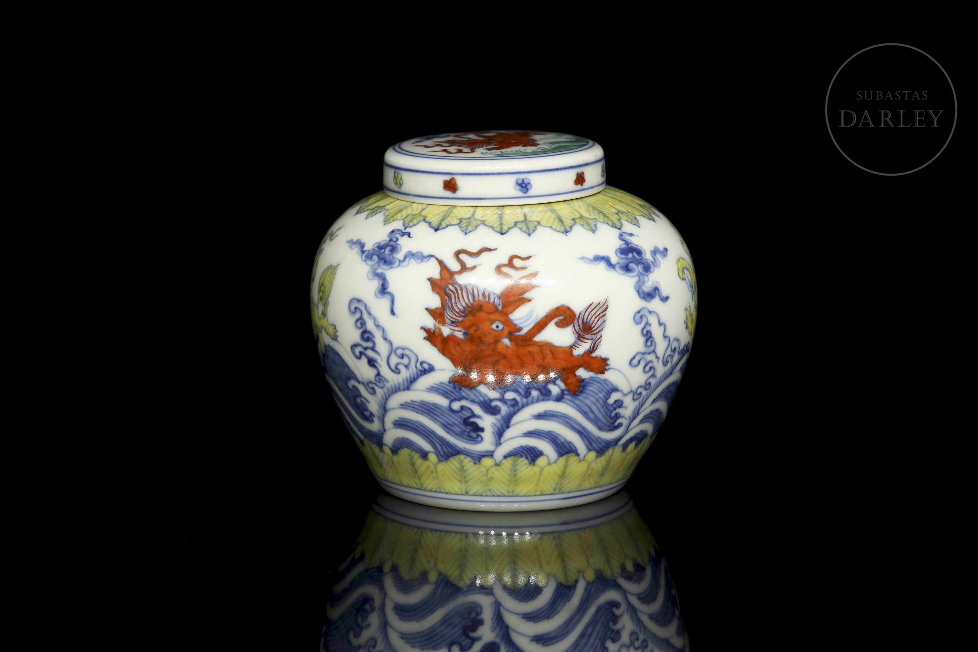 Globular porcelain jar with lid, decorated in polychrome ‘wucai’ enamels. The body features a continuous design with mythological creatures riding waves in cobalt blue, with decorative clouds in blue. Stylised leaf borders at the base and neck complete the composition. The base bears a blue underglaze character ‘天’.