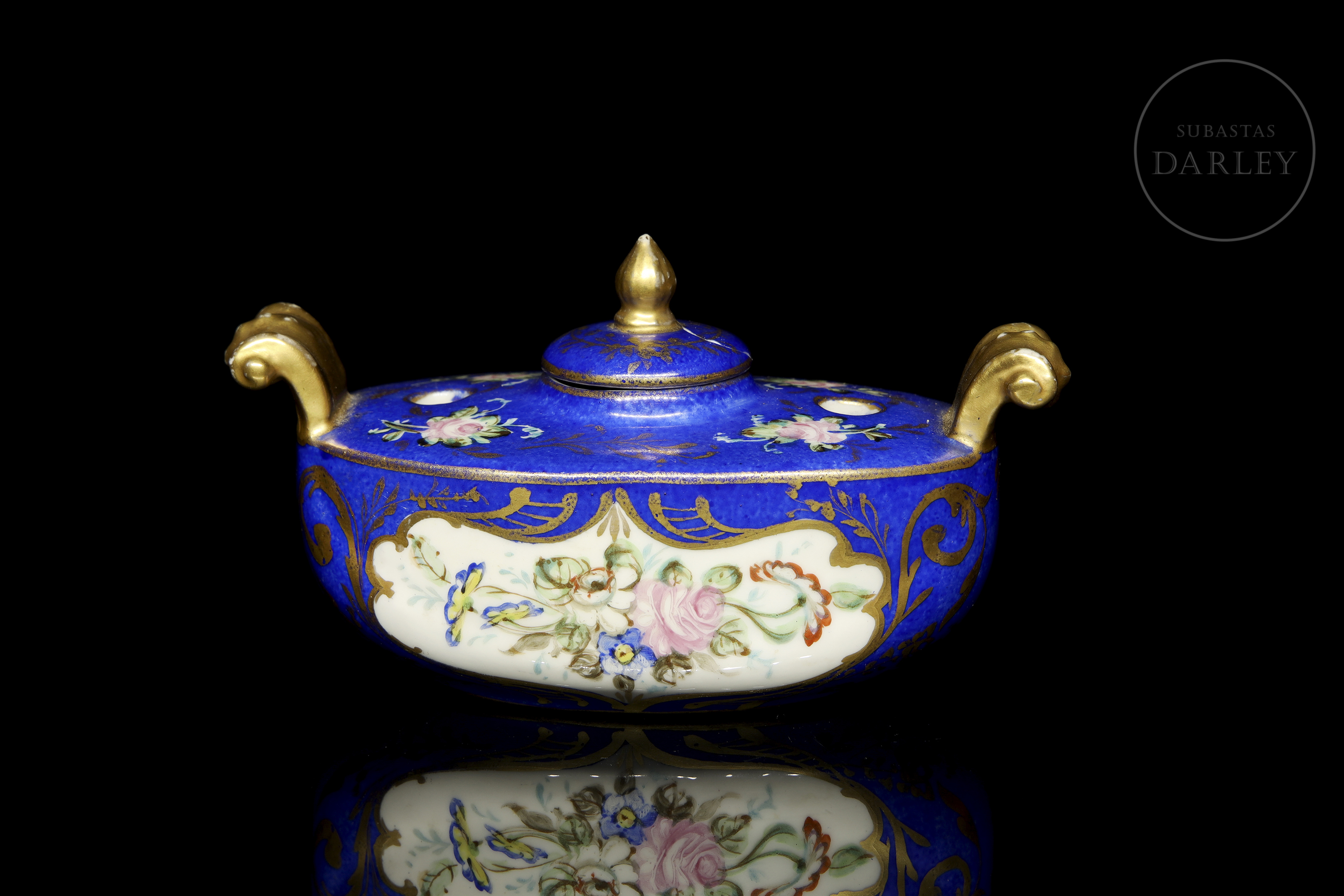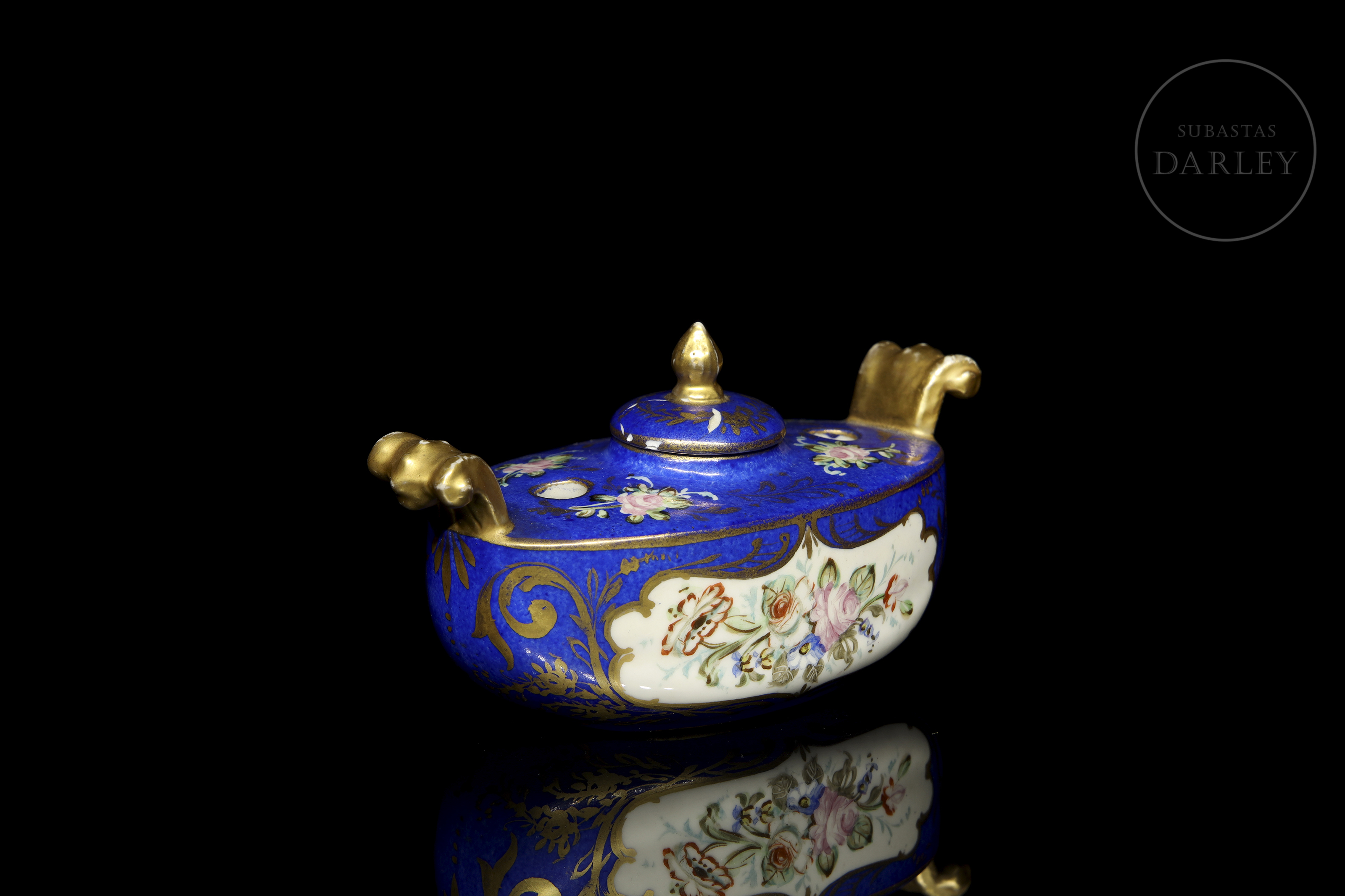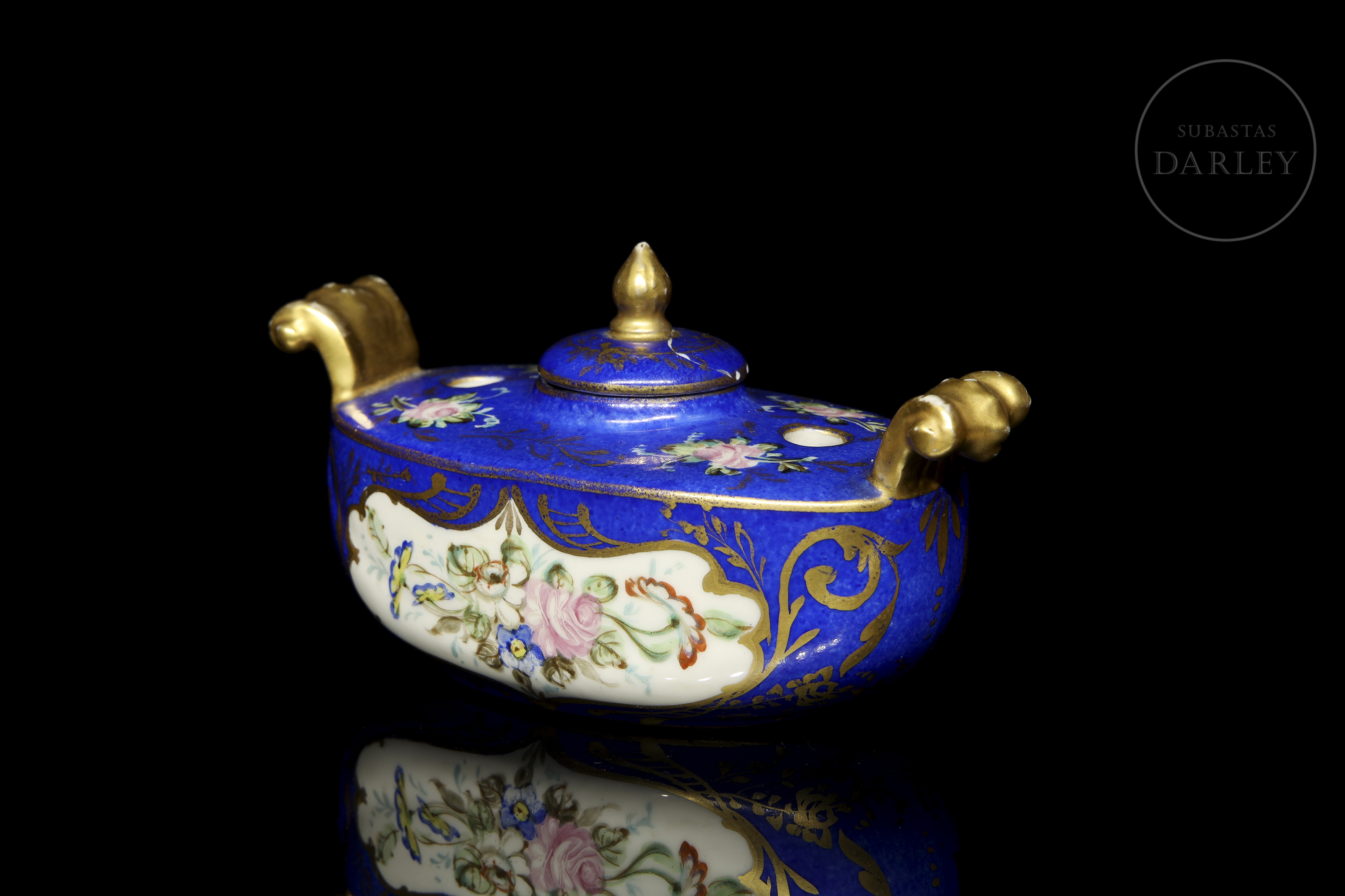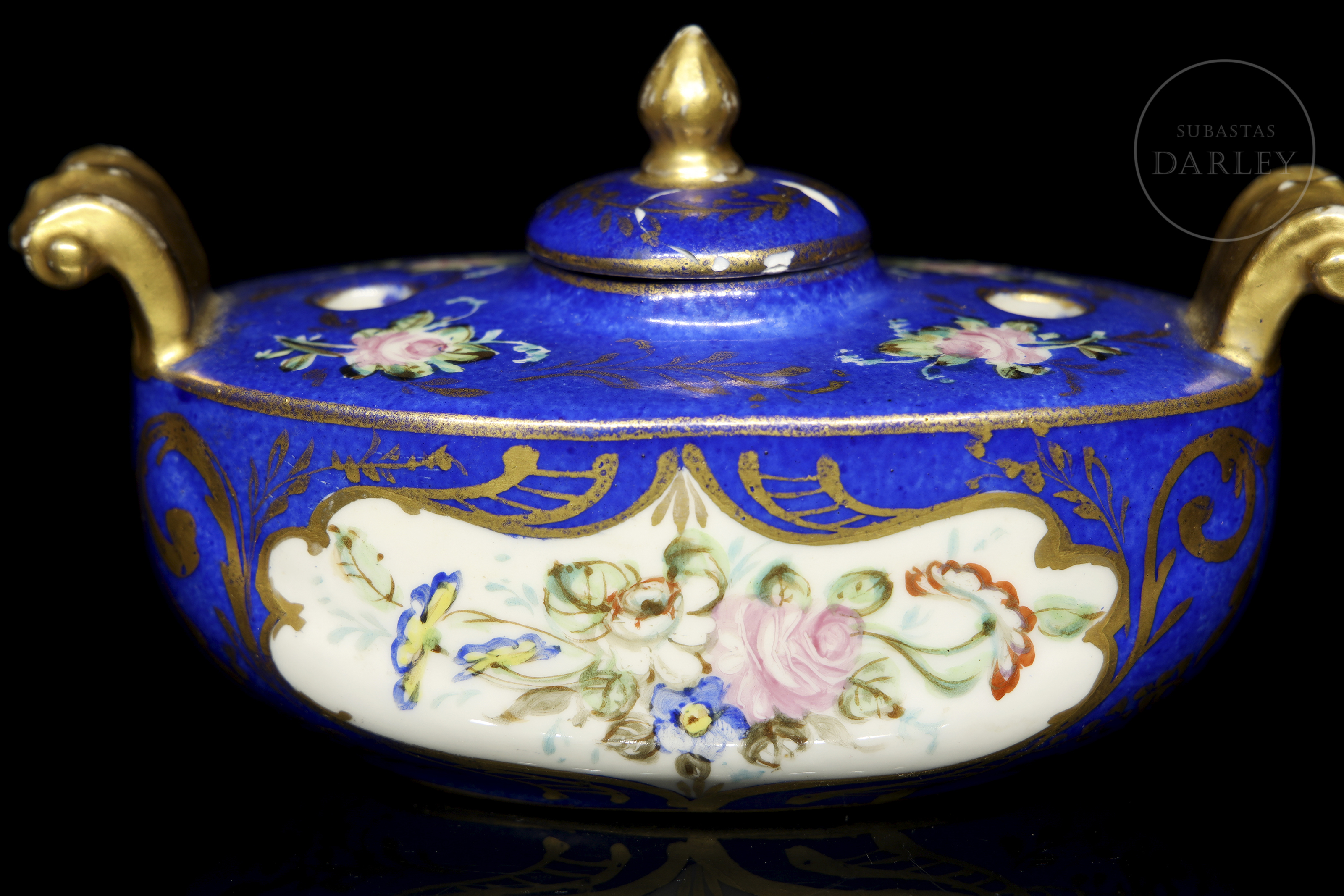 Antique enamelled porcelain inkwell. Decorated in cobalt blue and gold, with two lateral reserves in which two flower designs have been depicted on a white background. With factory stamp on the base. It shows restorations and damage due to age.