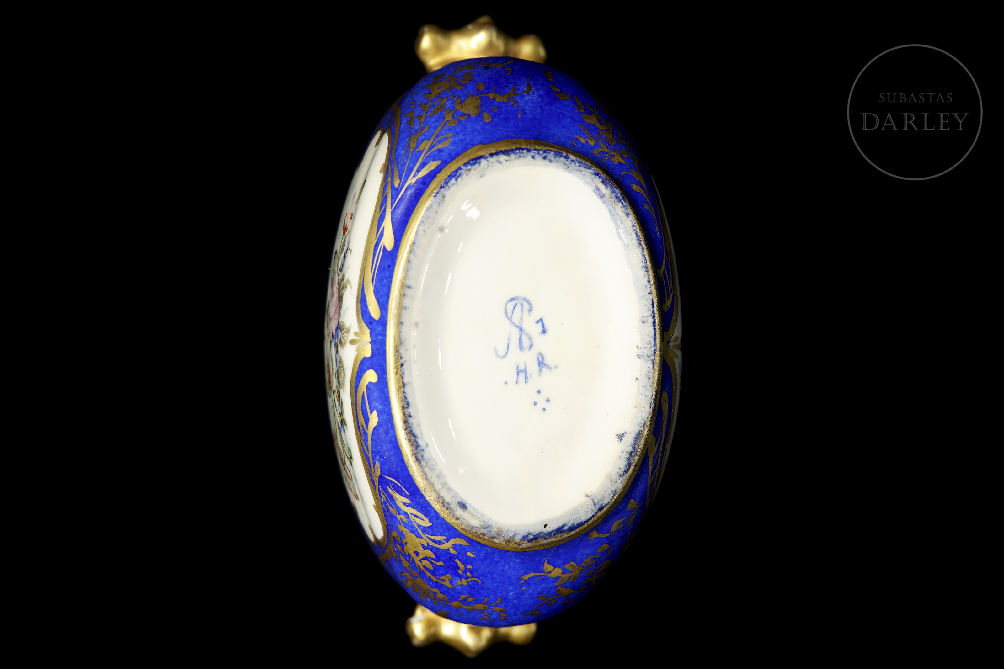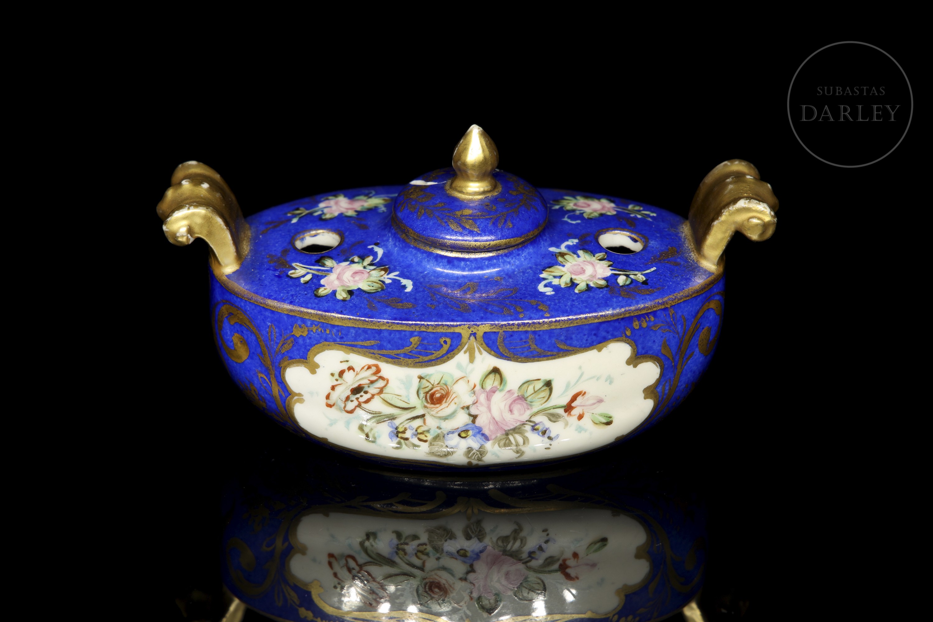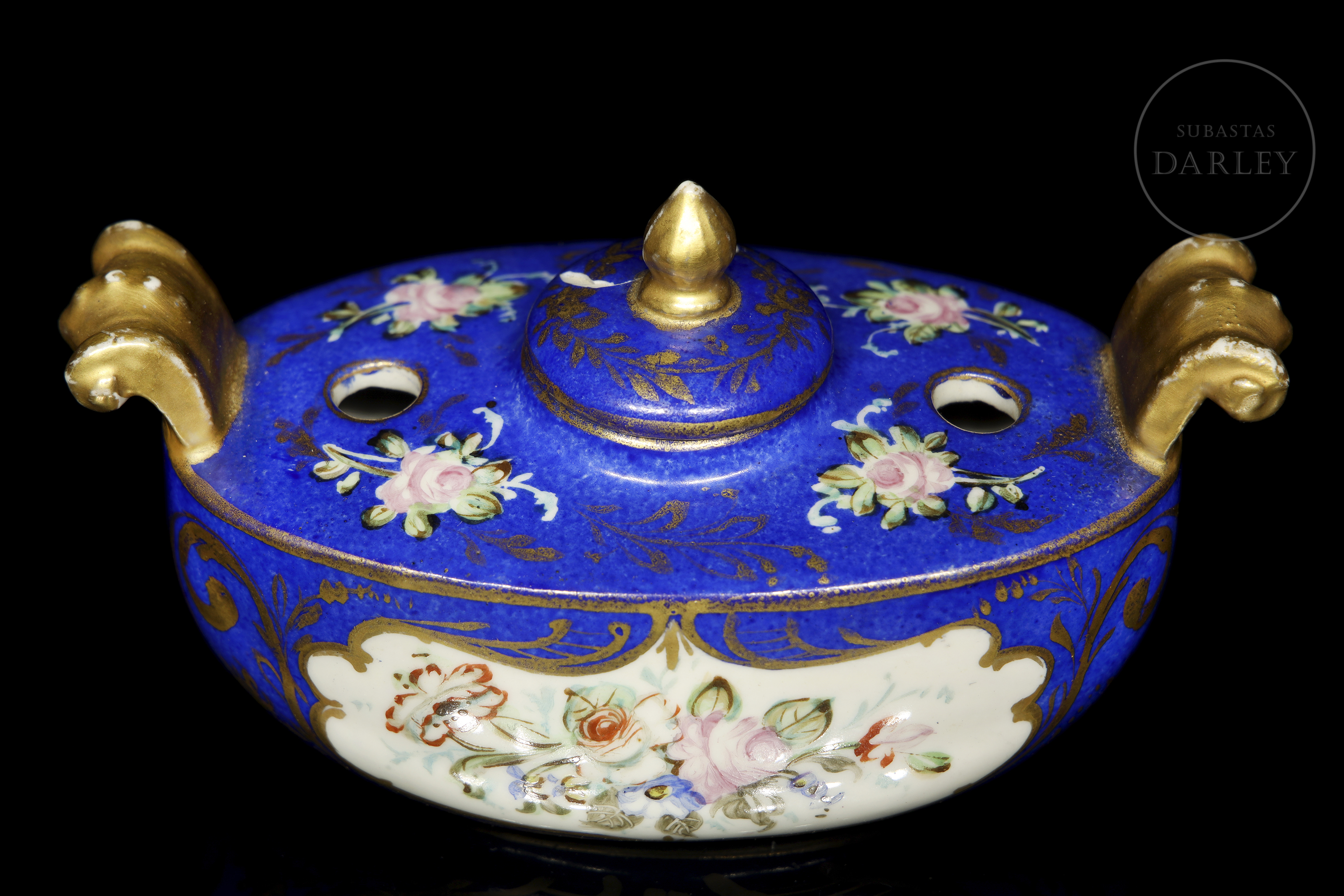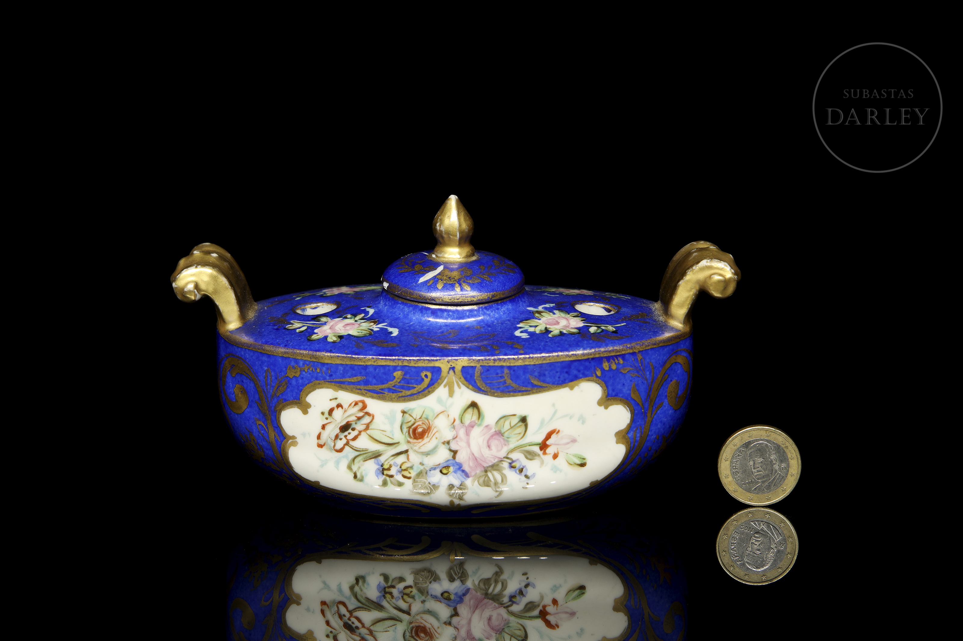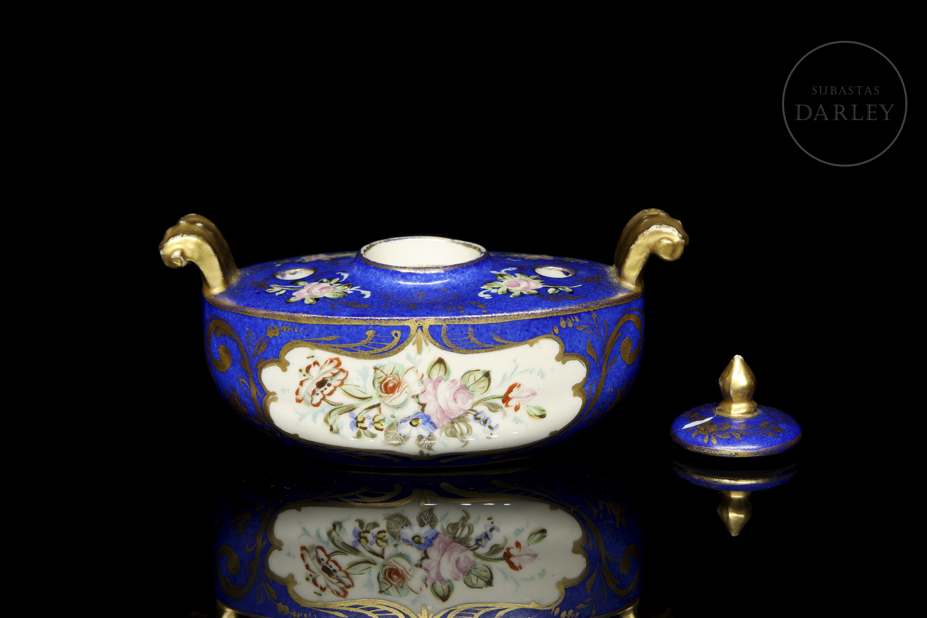 Antique enamelled porcelain inkwell. Decorated in cobalt blue and gold, with two lateral reserves in which two flower designs have been depicted on a white background. With factory stamp on the base. It shows restorations and damage due to age.