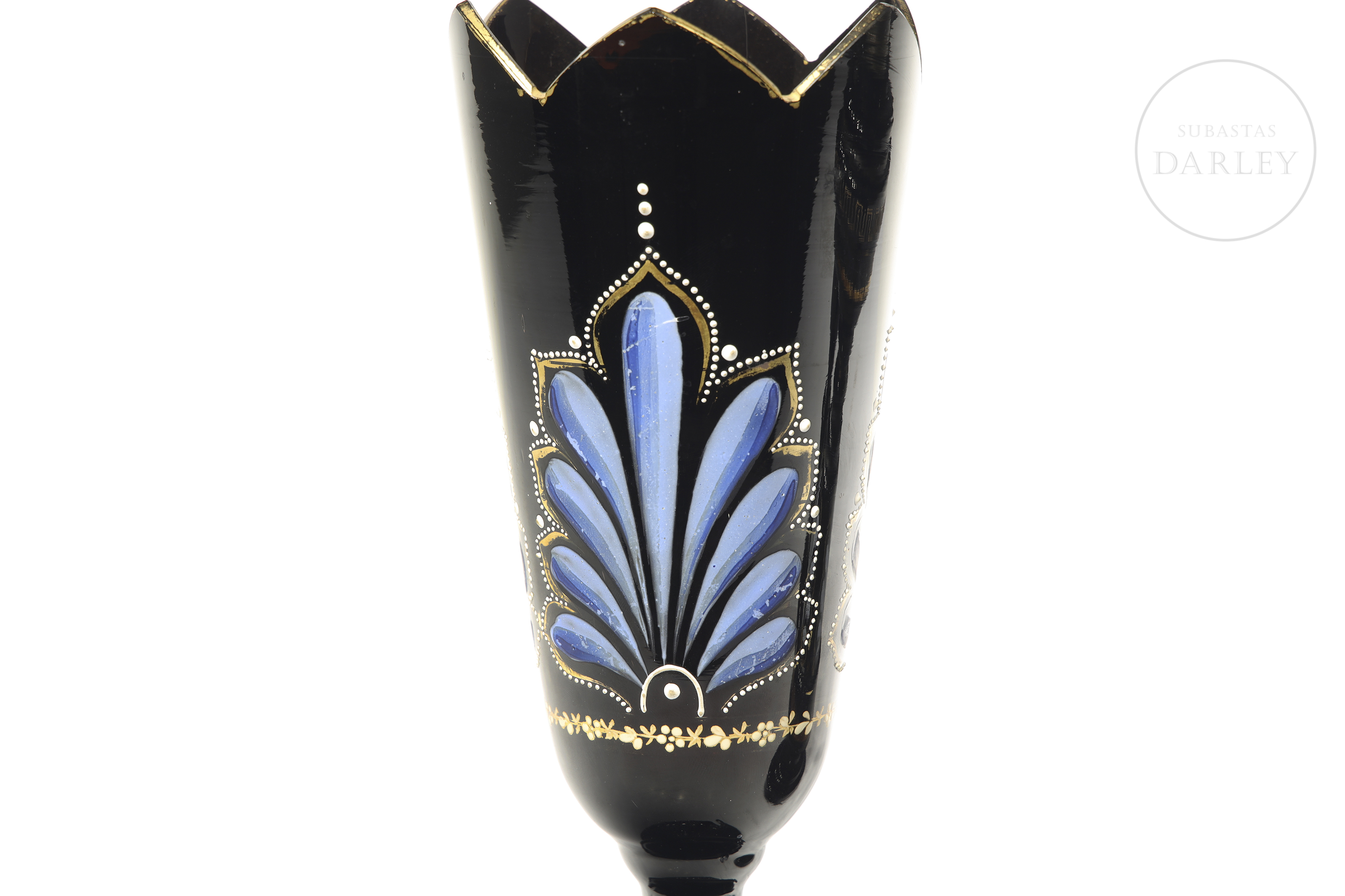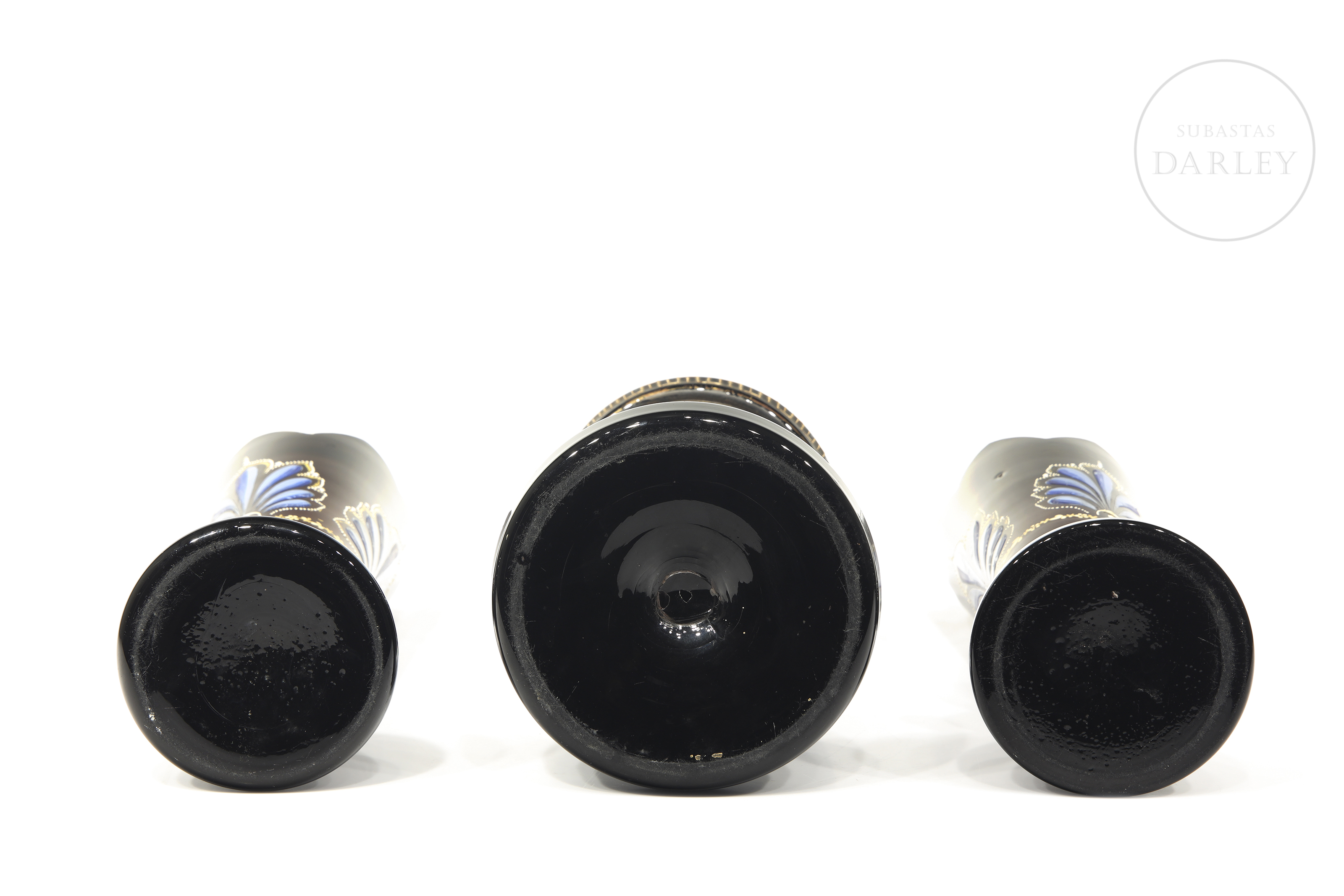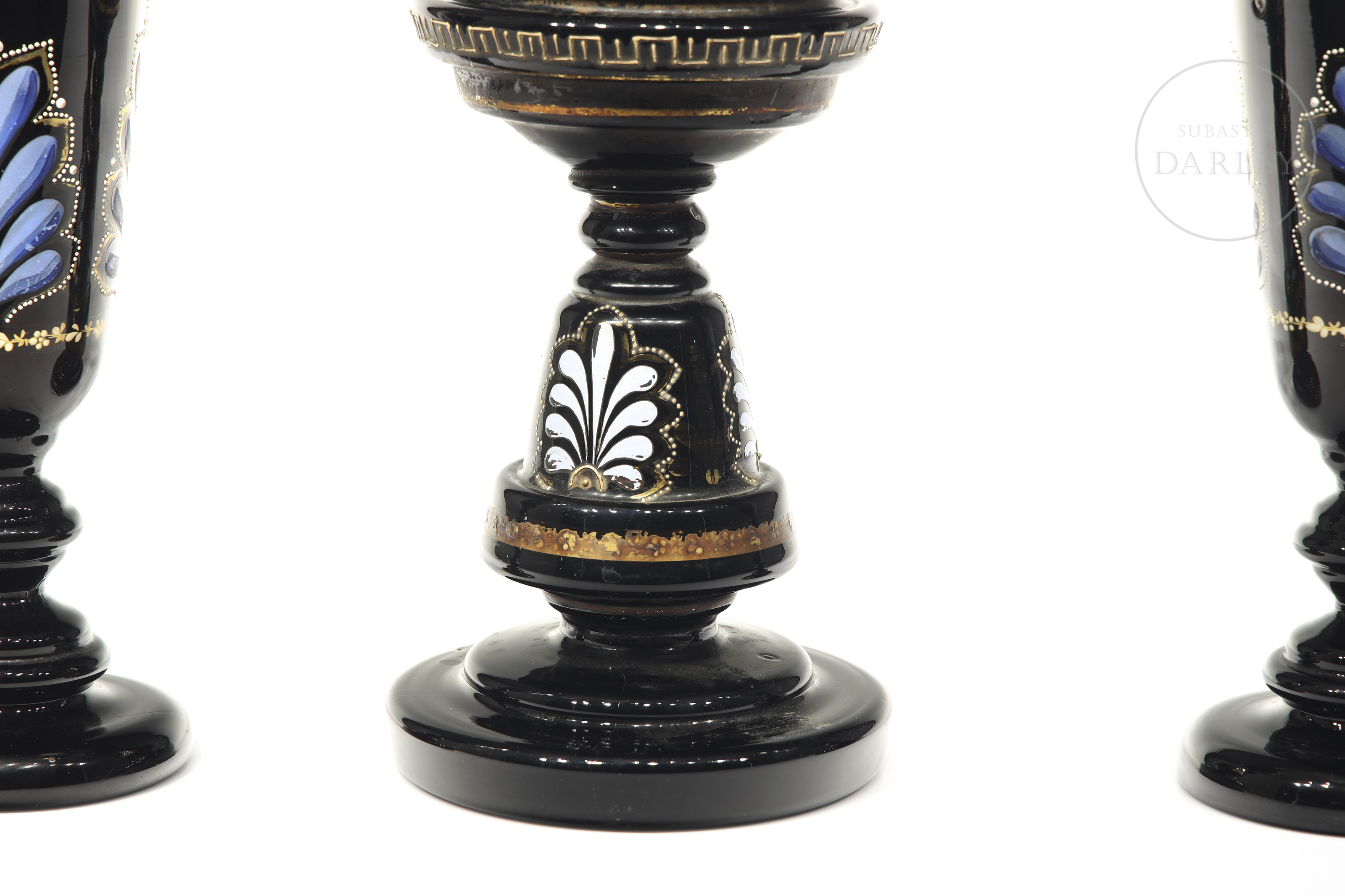Three opaline objects with enamelled details of floral motifs and geometric borders.