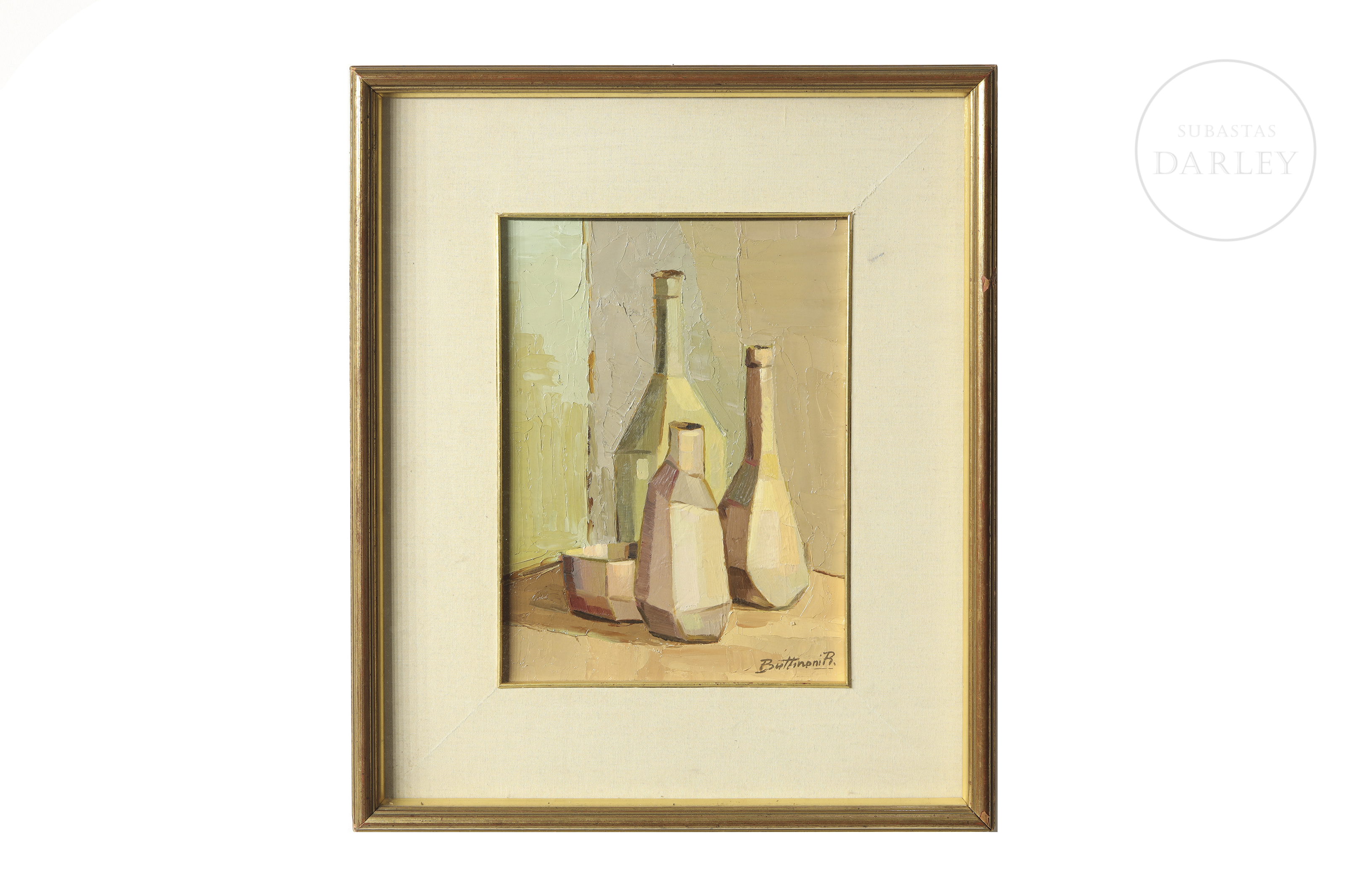 Oil on panel. Cubist-inspired still life in ochre tones. Signed ‘Buttinoni R.’ in the lower right corner. Signed, dated, and titled on the reverse.