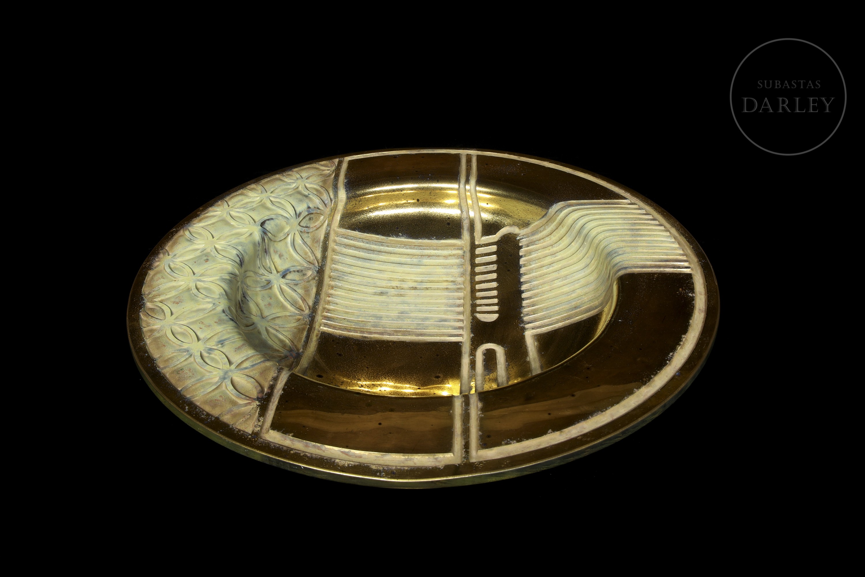 Large Art Deco ornamental plate, signed and dated on the bottom as ‘Salvatore Polozzi / 1995’. Made of glass, it incorporates 22-carat gold, according to the artist's website. The surface is articulated by a geometric relief composition, organised into defined compartments that combine transparencies, light effects and different textures, creating an attractive visual contrast.