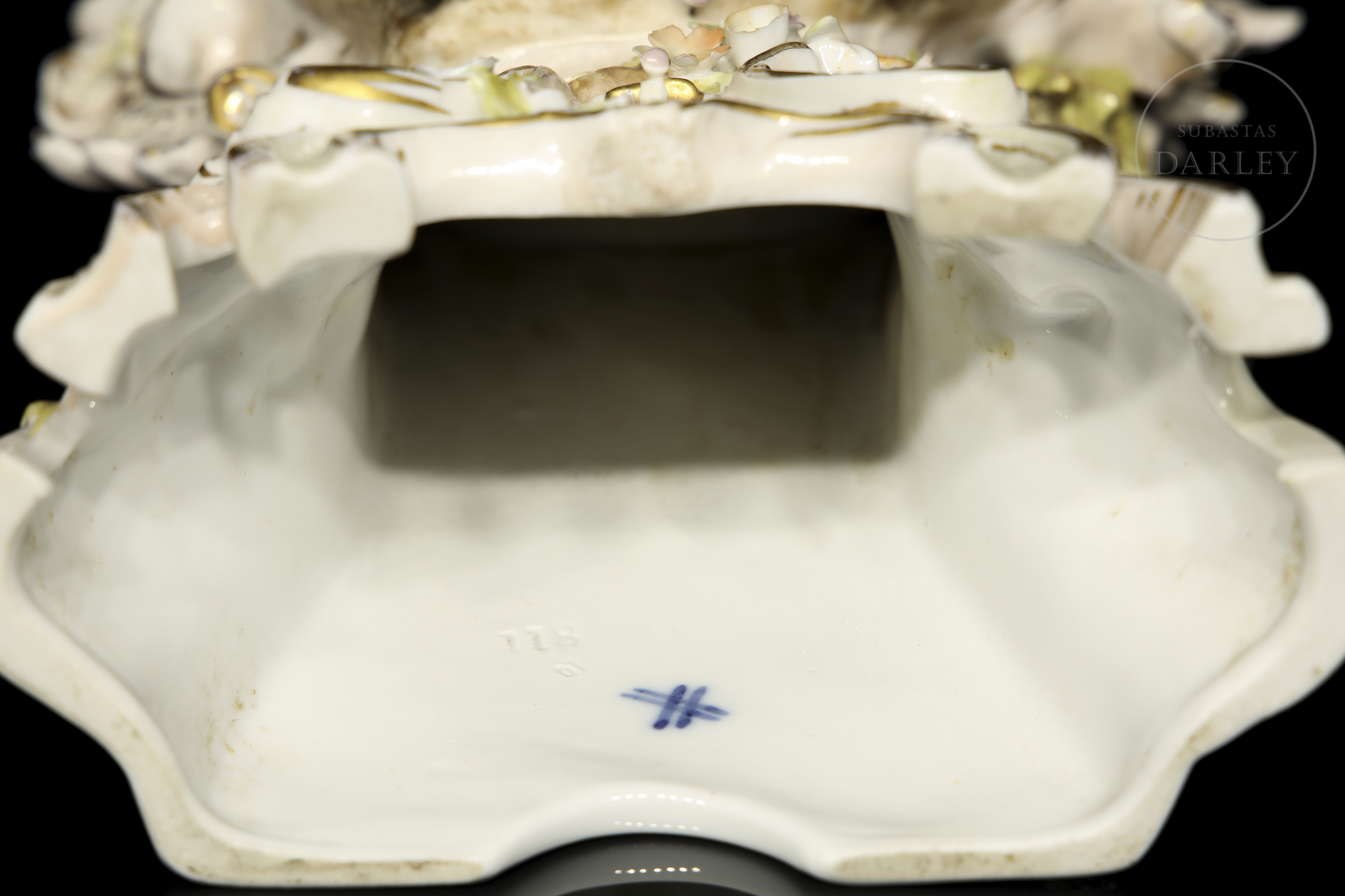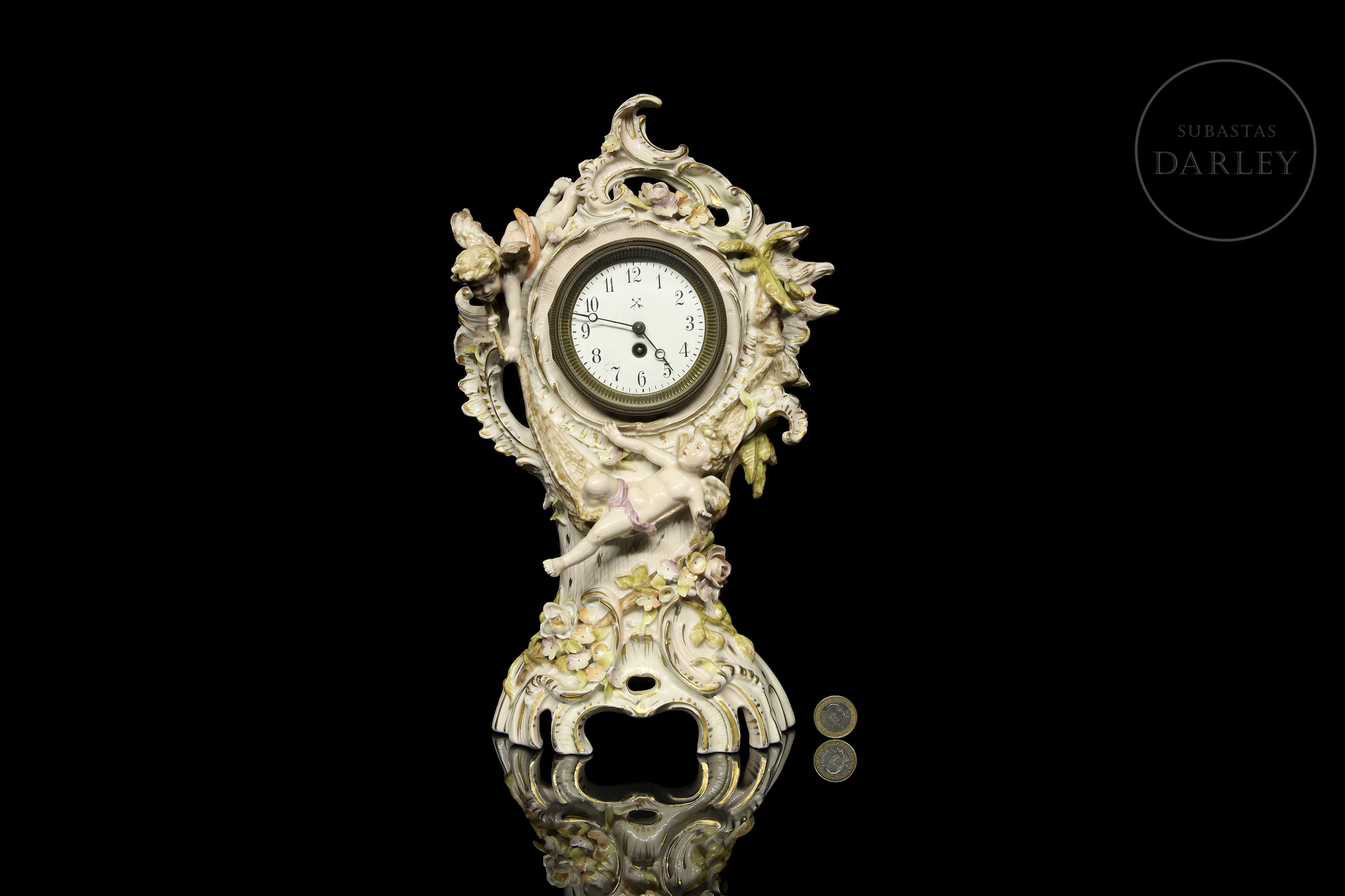 Table clock in a rococo porcelain case. Serial number ‘118’ inscribed on the base. Manufacture's mark used between the years 1865-1911. With small imperfections.