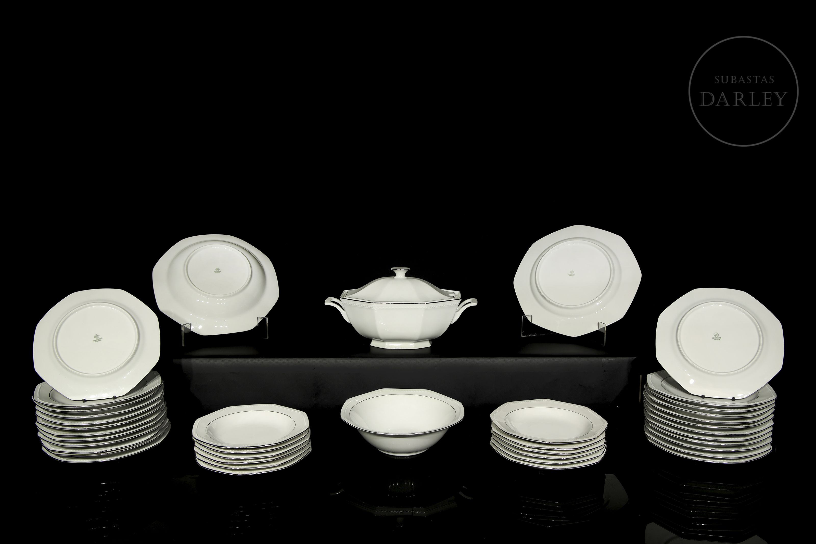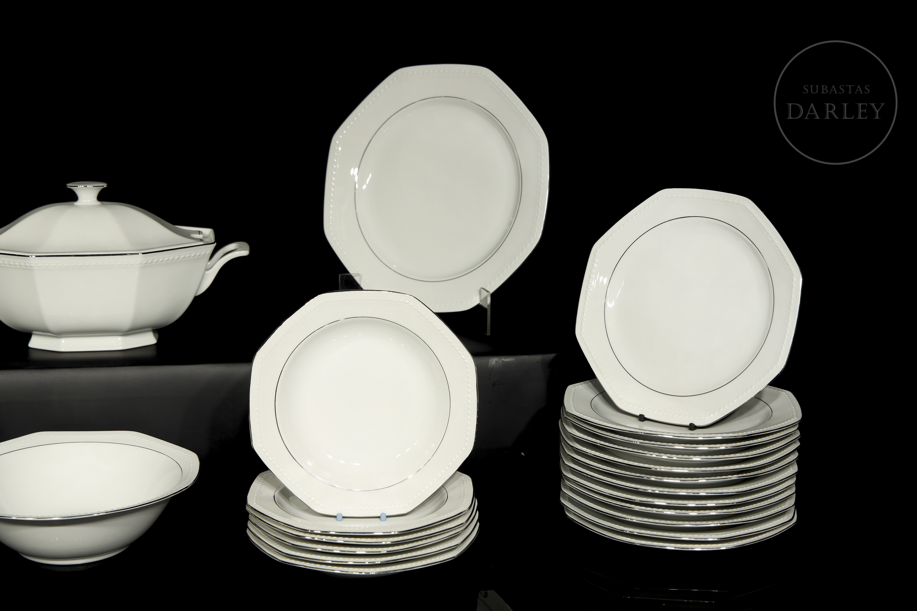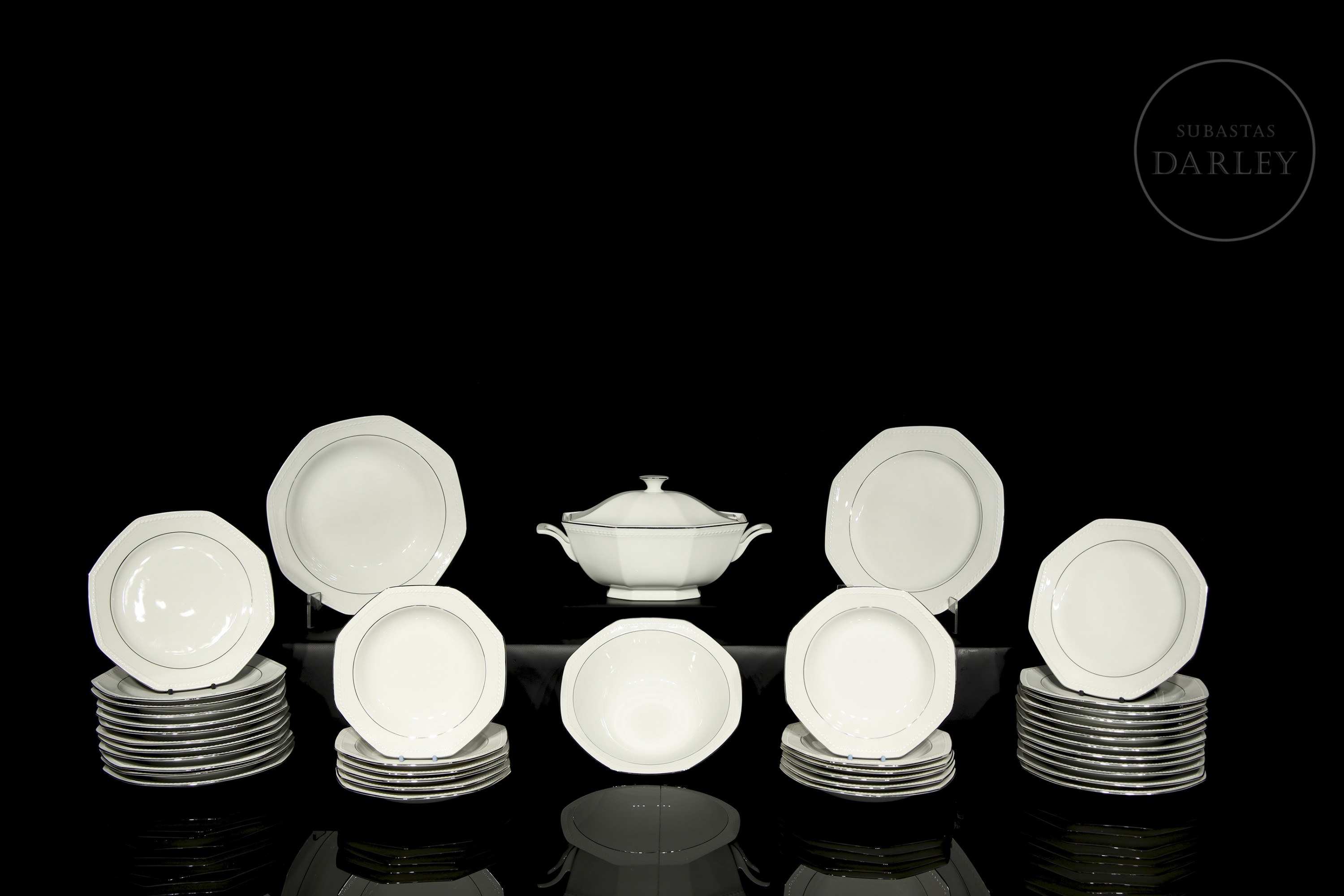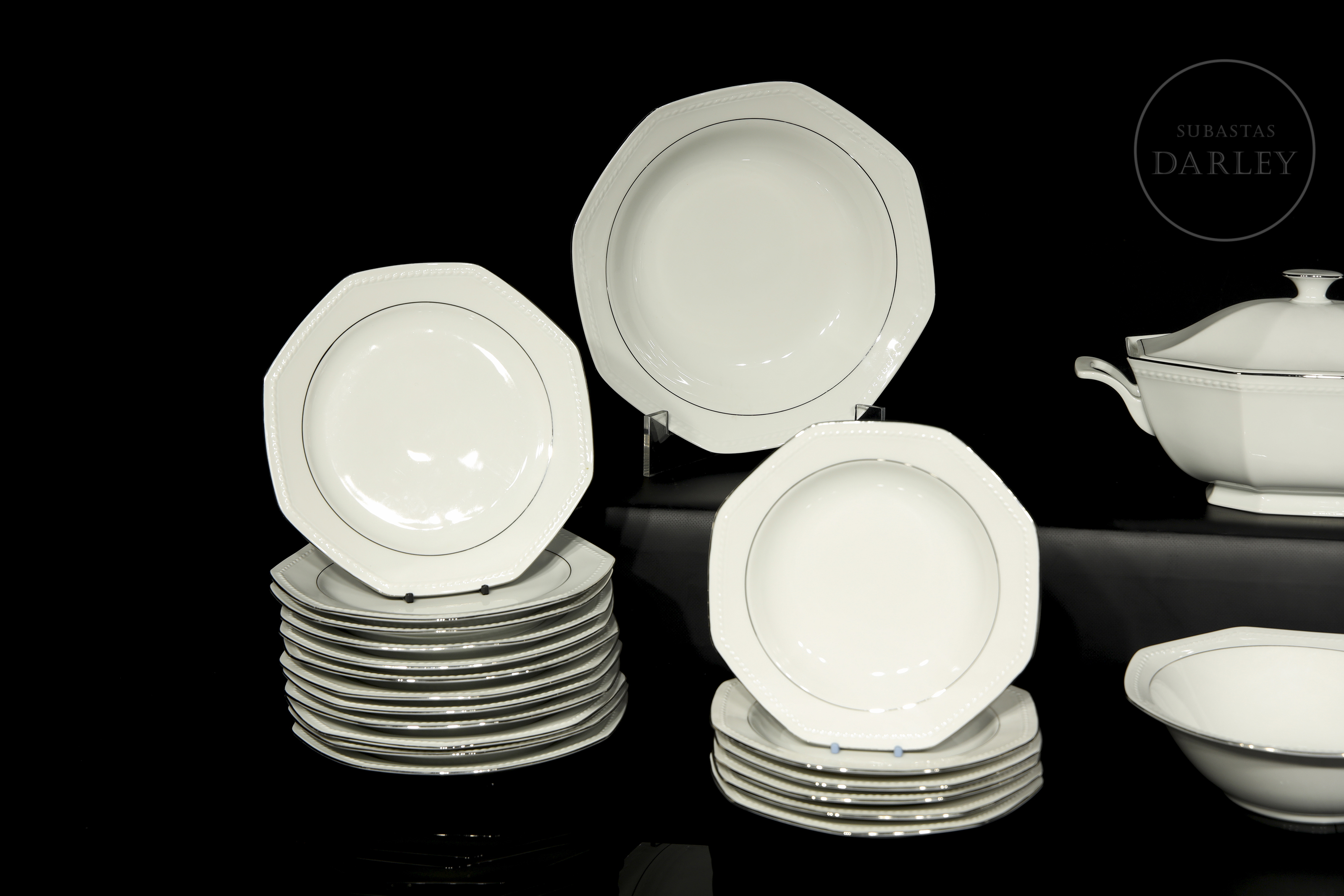 Octagonal tableware set made of white porcelain with an elegant silver border. The set stands out for its neoclassical simplicity and geometric shapes. Manufacturer's mark on the back. Comprising: dinner plates (24), soup plates (12), soup tureen (1), trays (2) and salad bowl (1).