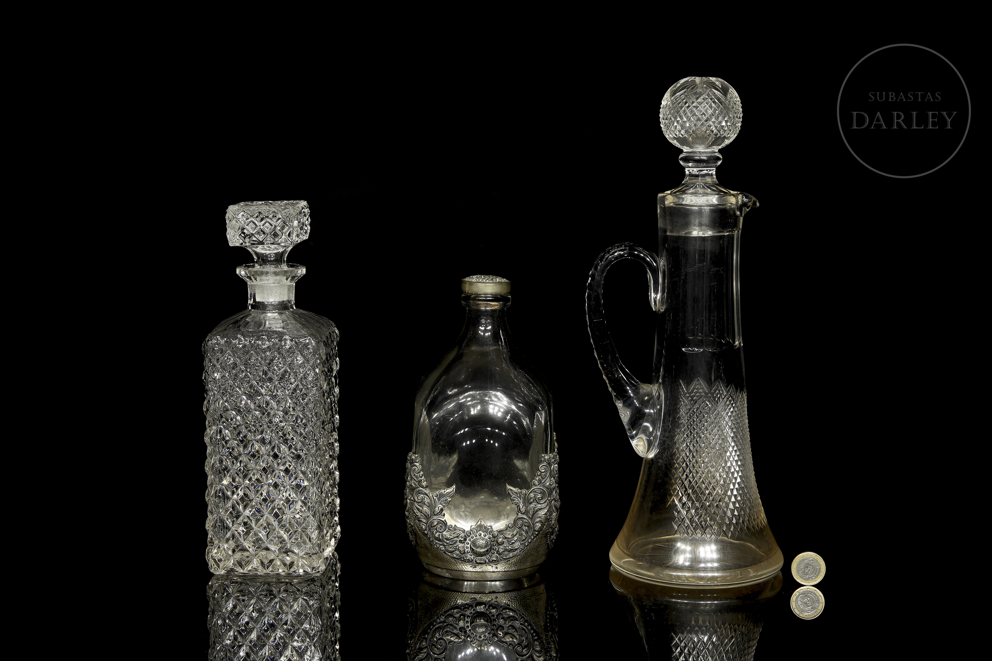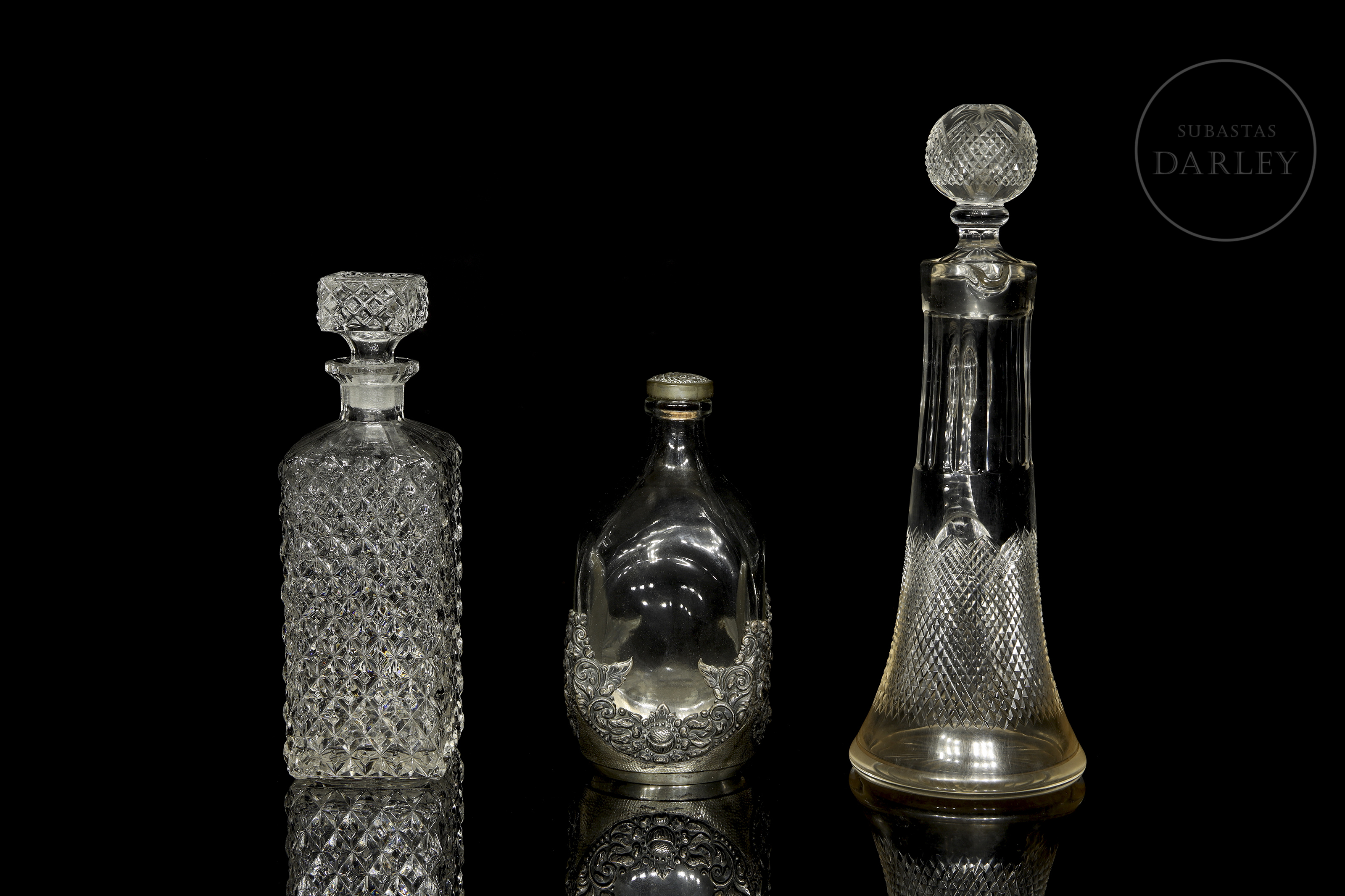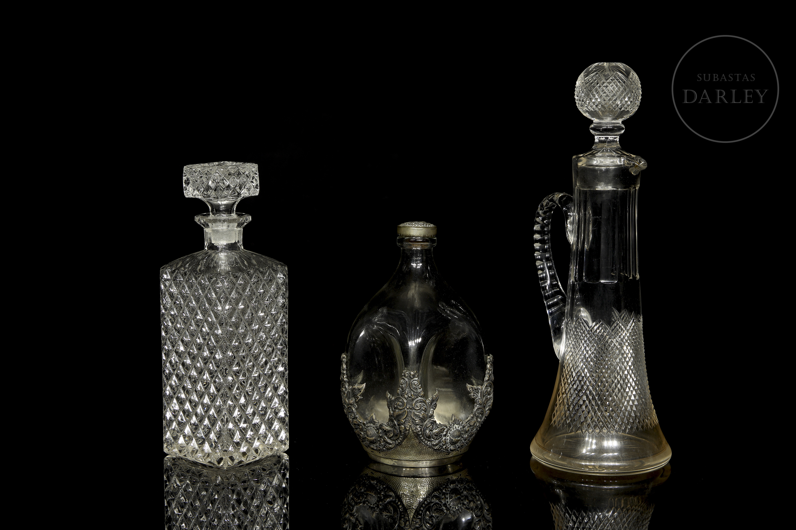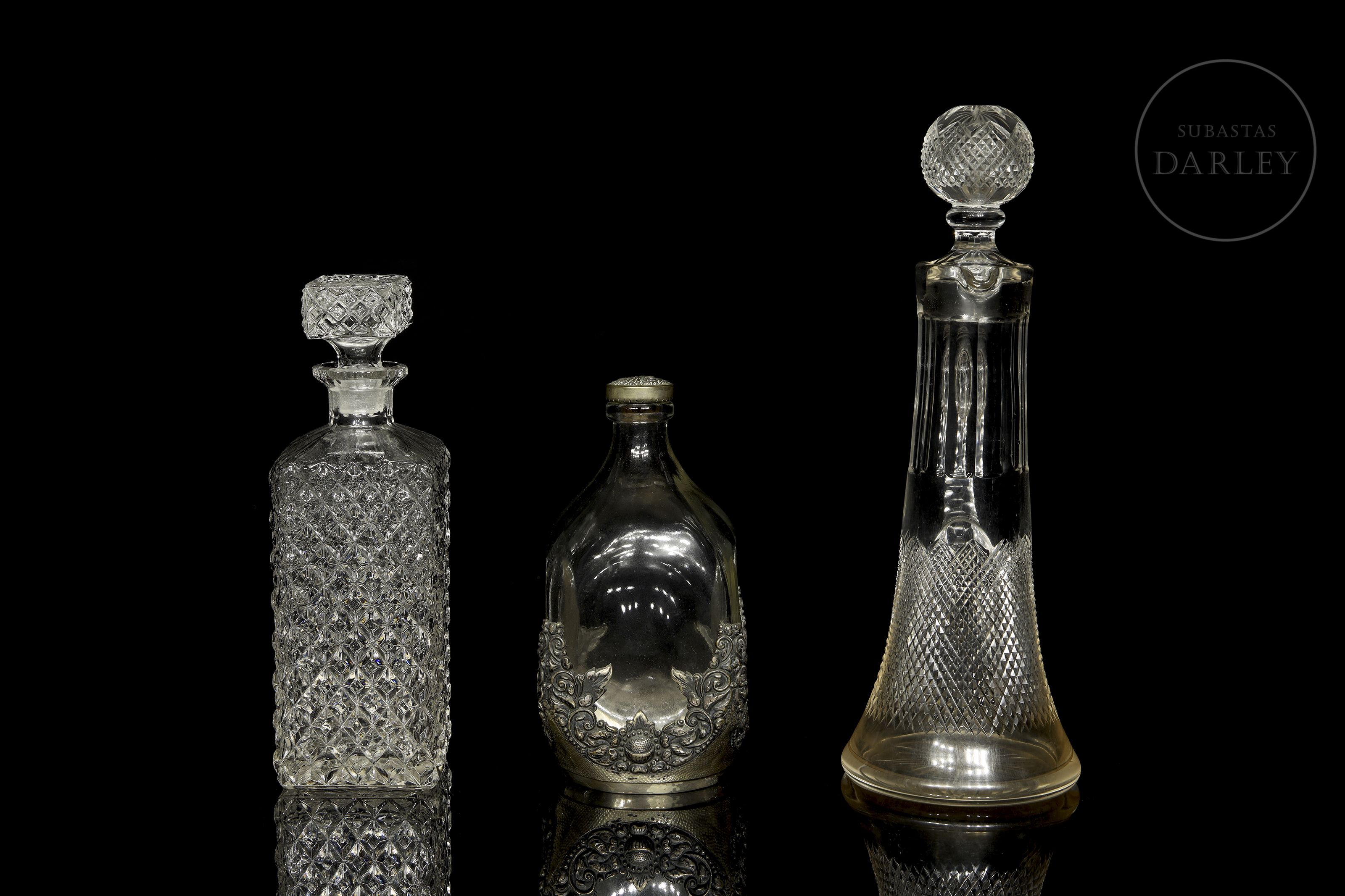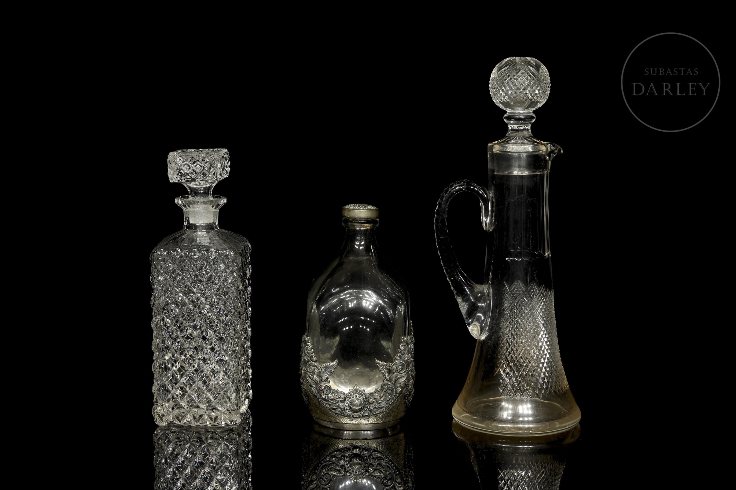 Set of three glass bottles in different designs. Includes: A tall decanter with handle and spherical lid; a square bottle with diamond pattern carving; and a flattened bottle with the base covered by a silver metal band.