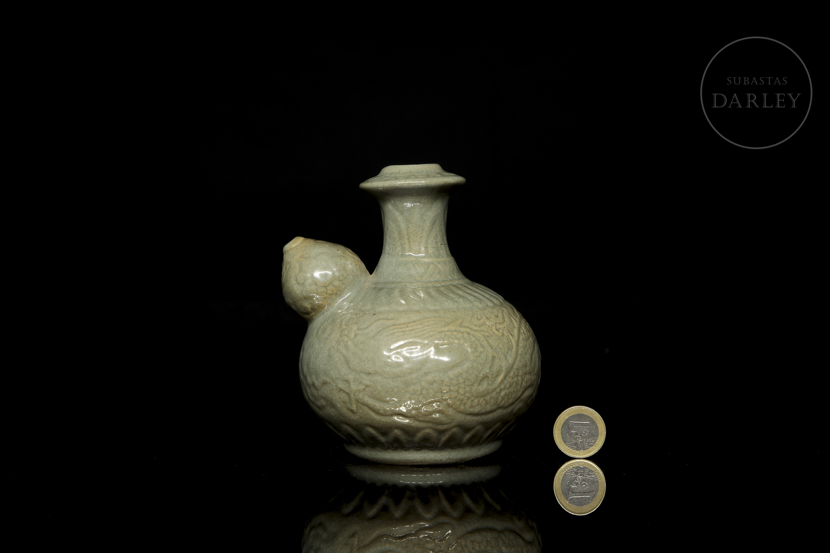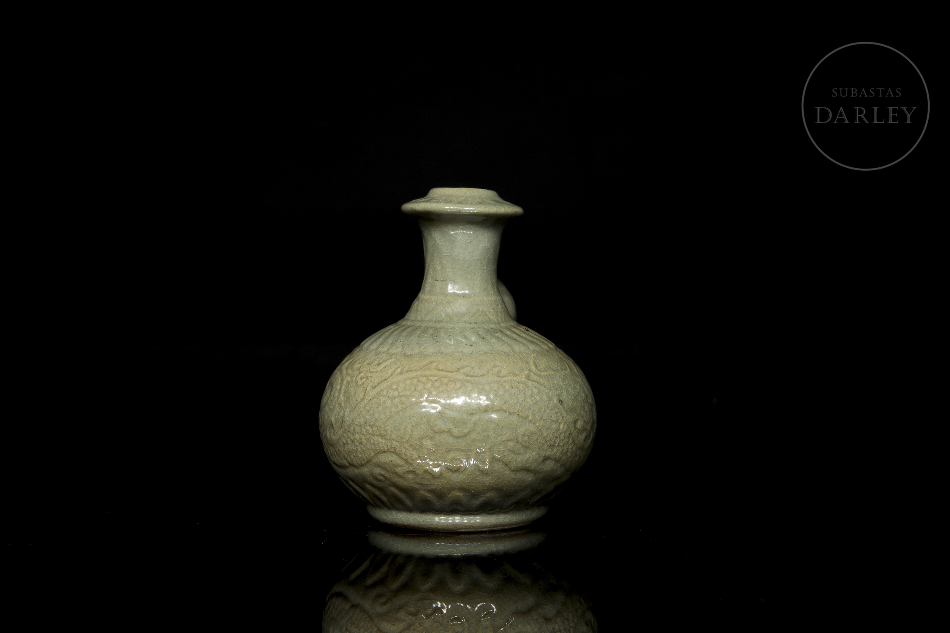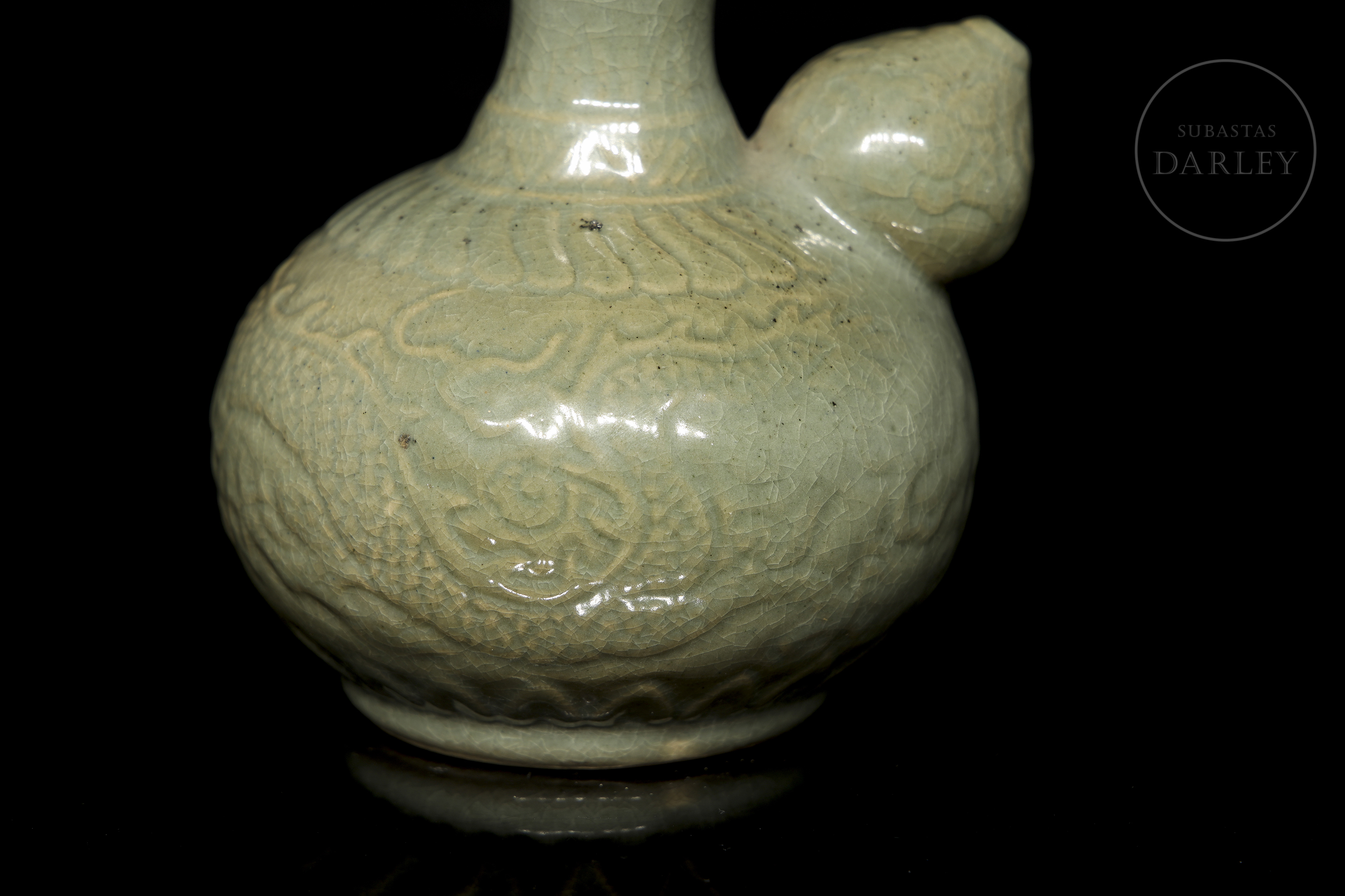 Ceramic modelled in the form of a small jug with a rounded body and stylized neck, next to which is a small bulb-shaped mouth. Decorated with a relief scene of plant motifs and a ferocious dragon riding a sea of waves, all covered with an olive-green celadon glaze.
