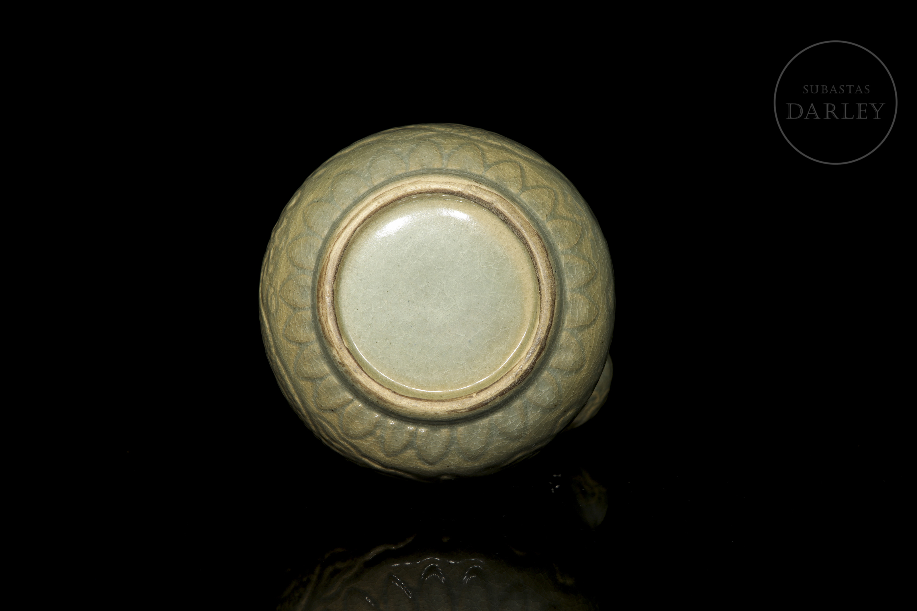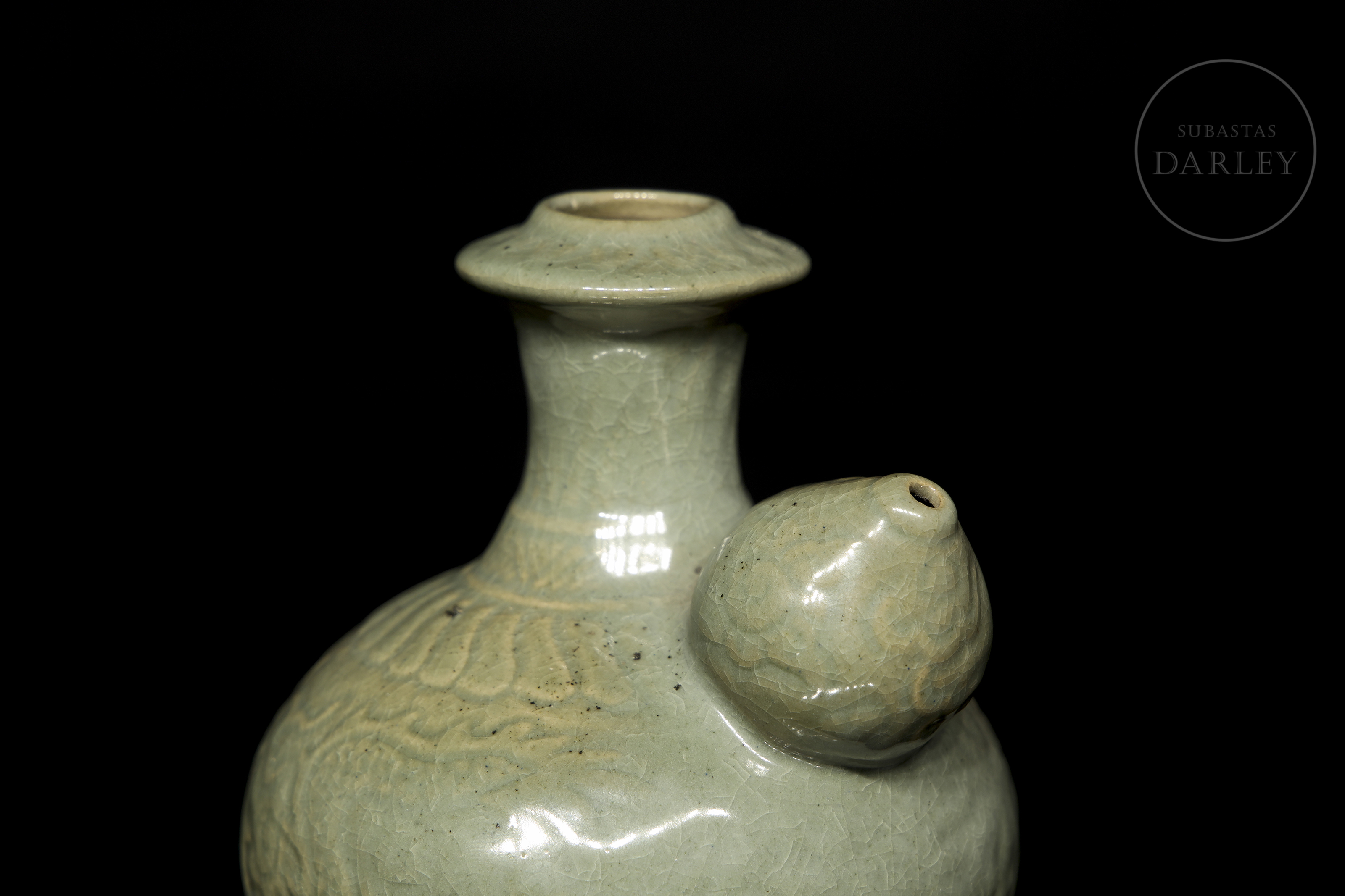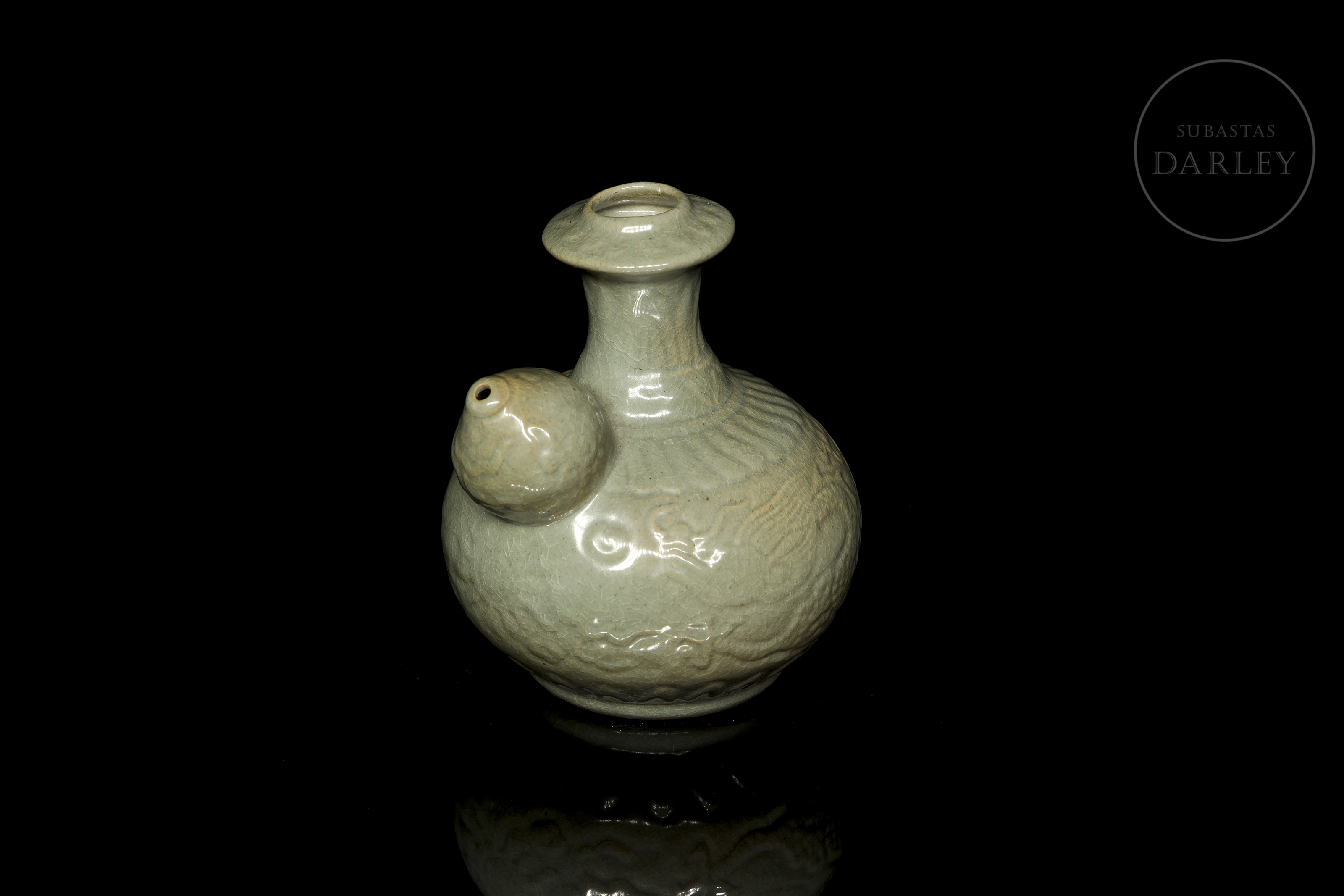 Ceramic modelled in the form of a small jug with a rounded body and stylized neck, next to which is a small bulb-shaped mouth. Decorated with a relief scene of plant motifs and a ferocious dragon riding a sea of waves, all covered with an olive-green celadon glaze.