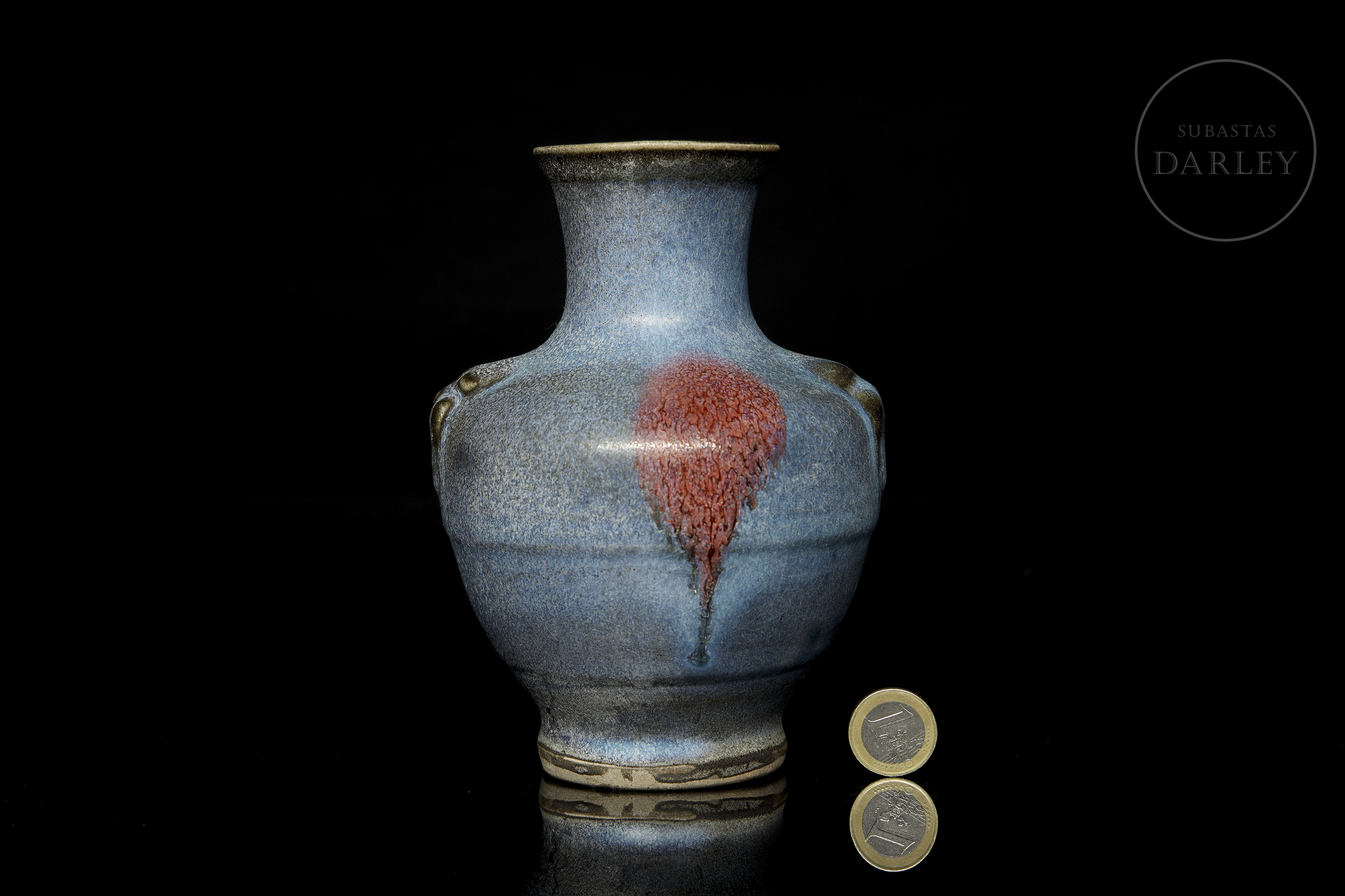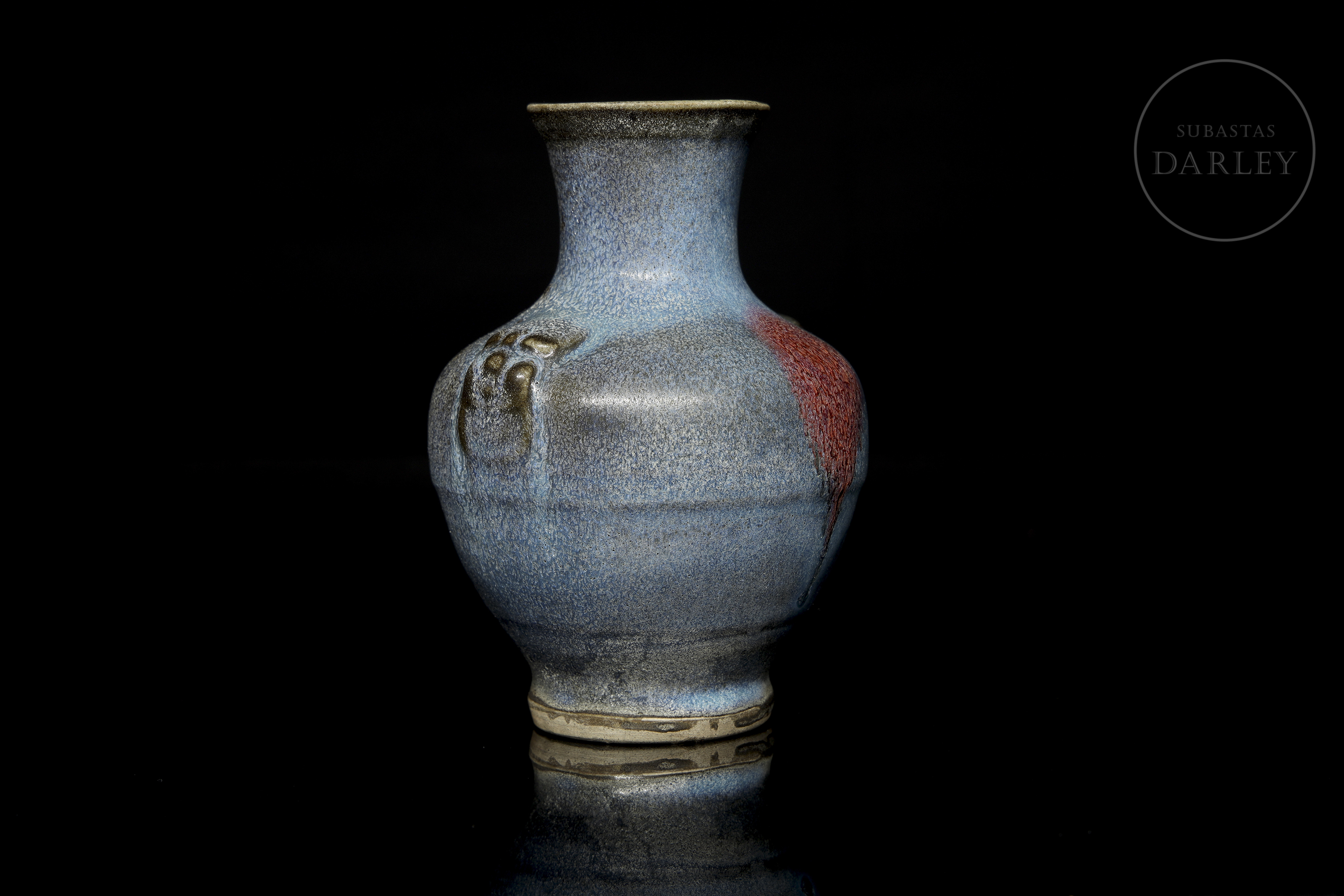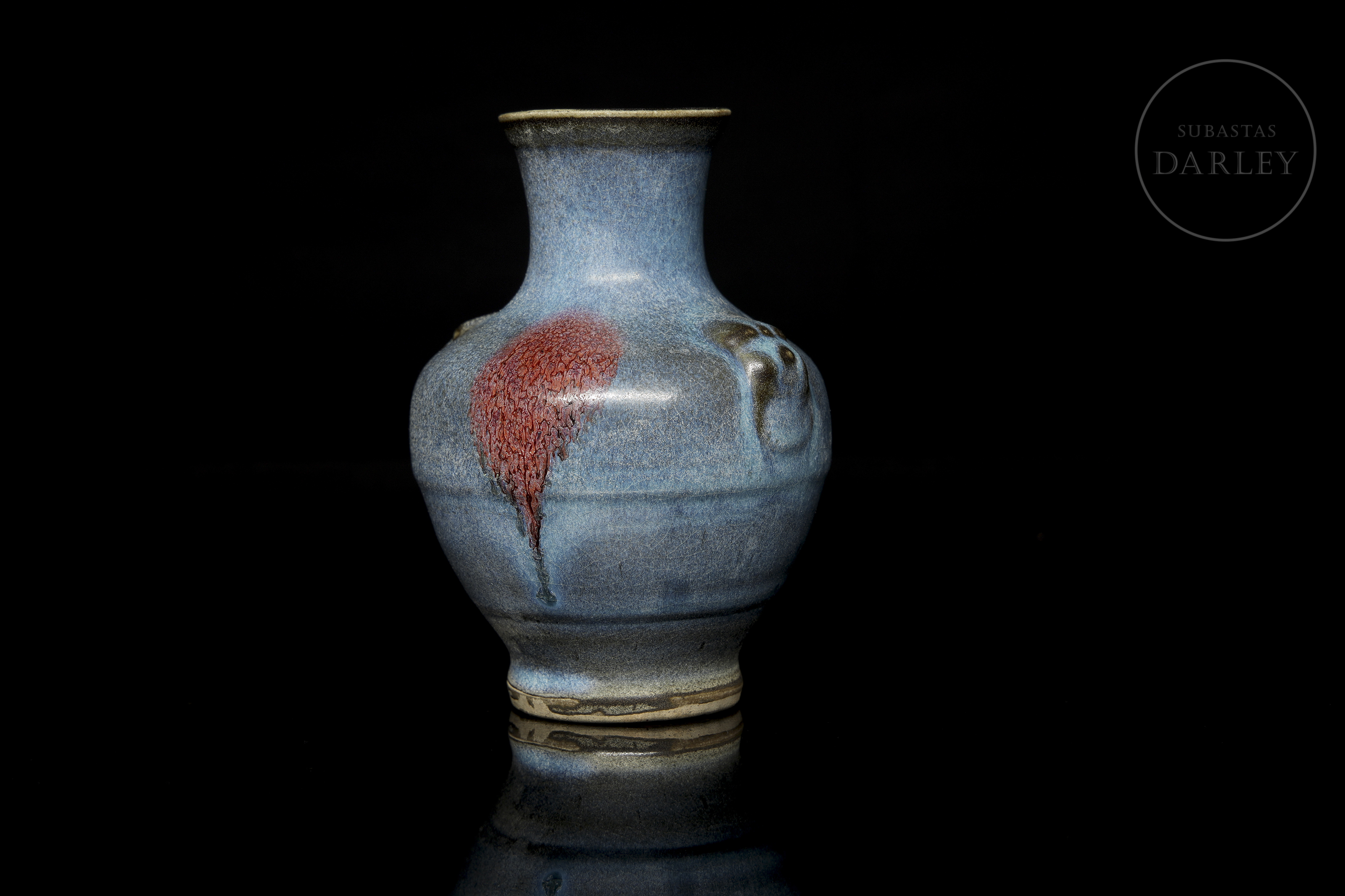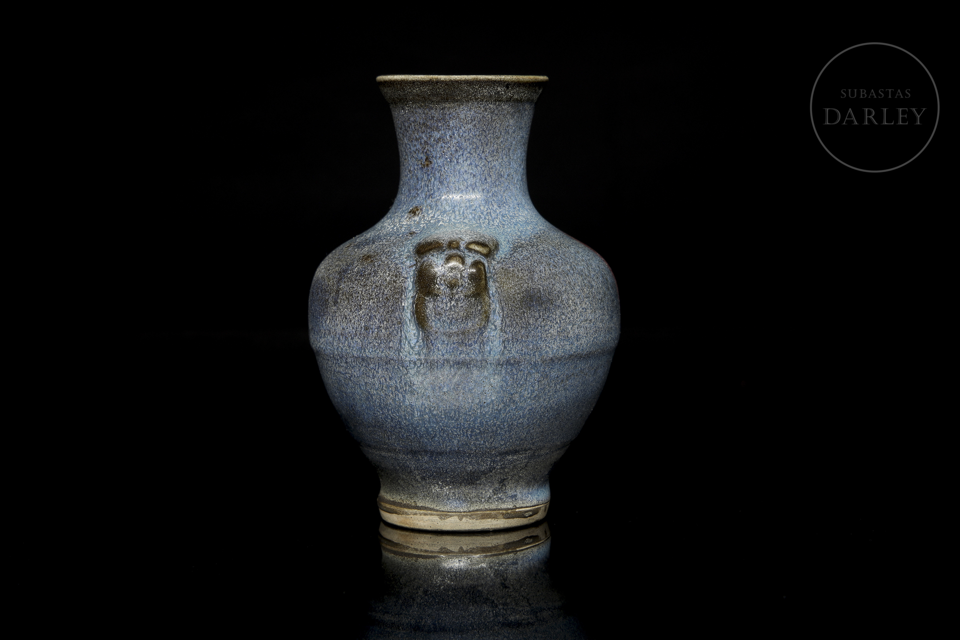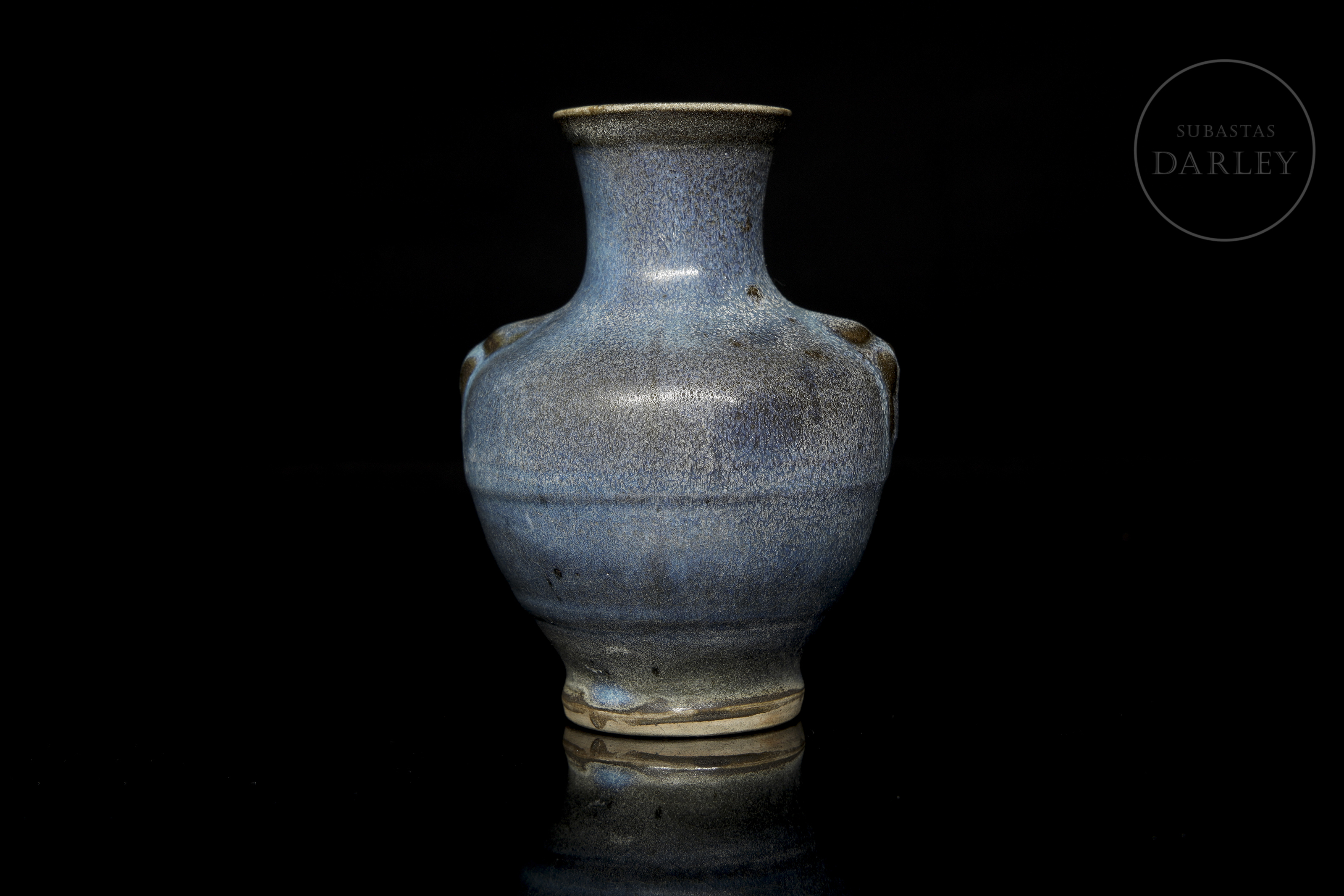 A vase with a cylindrical foot and a convex body, flanked by two small handles in relief, in the shape of a beast, arranged at shoulder height, which narrows to form an elongated flaring neck. Covered with a thick greyish-blue glaze with purple splashes.