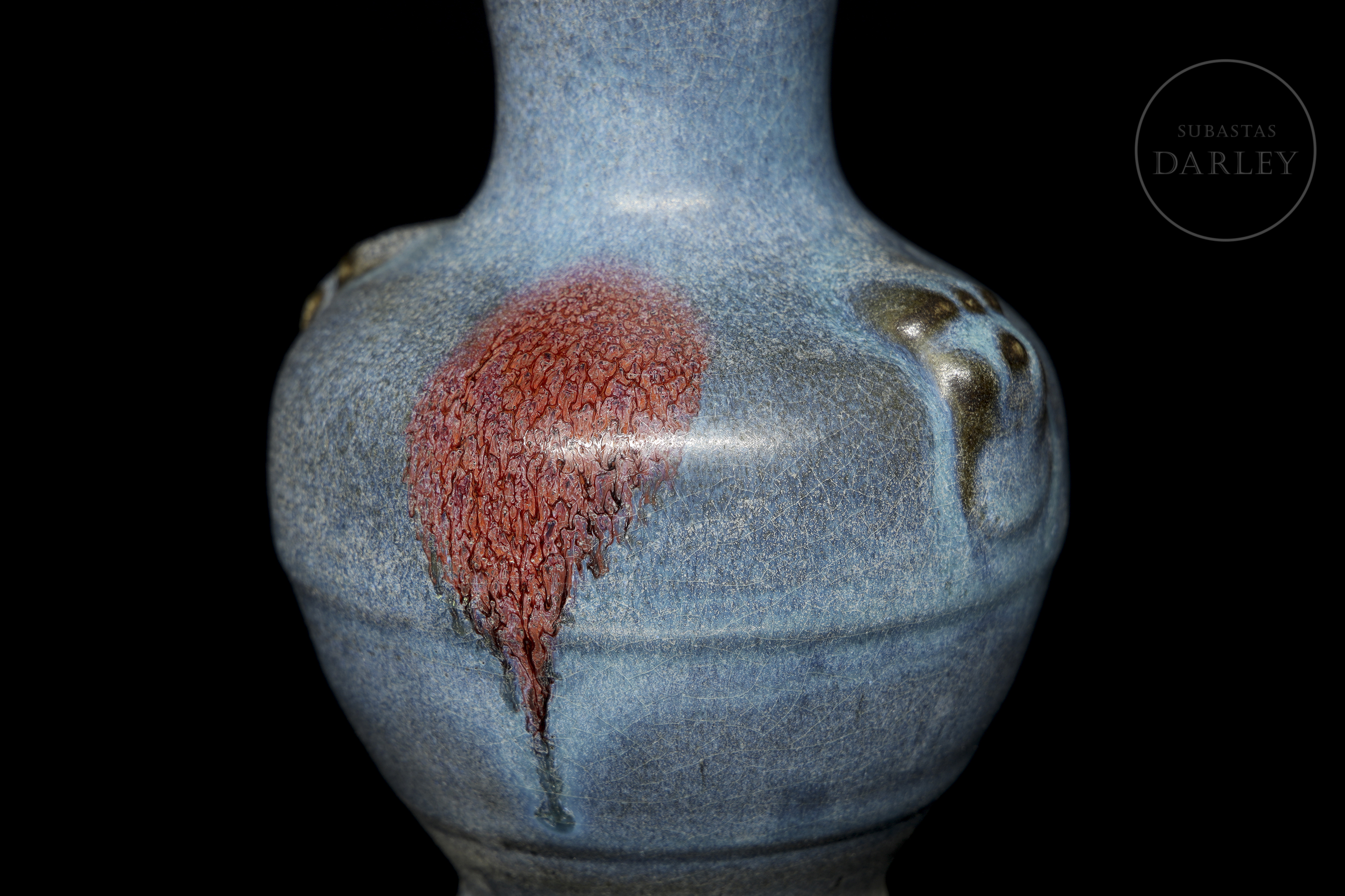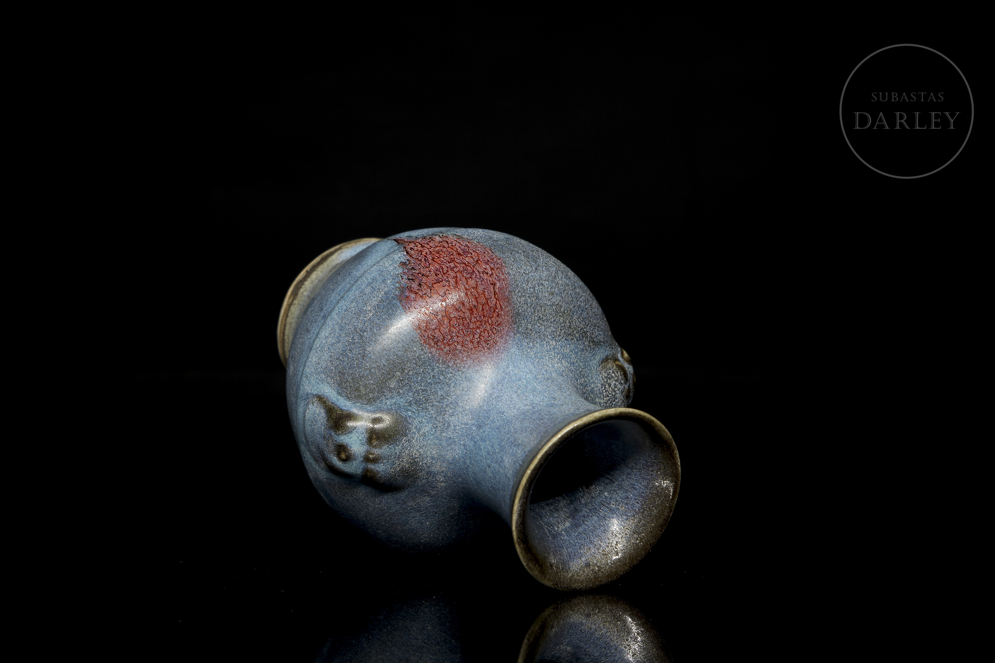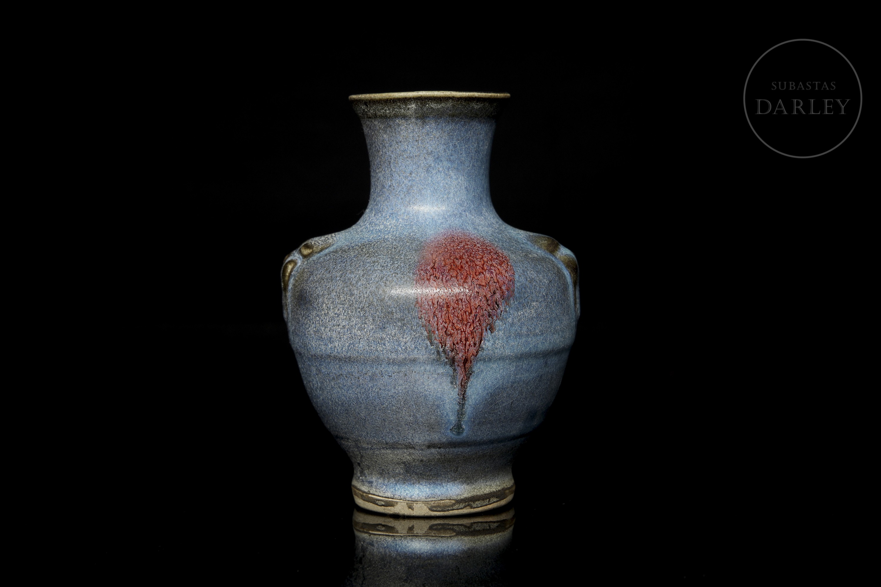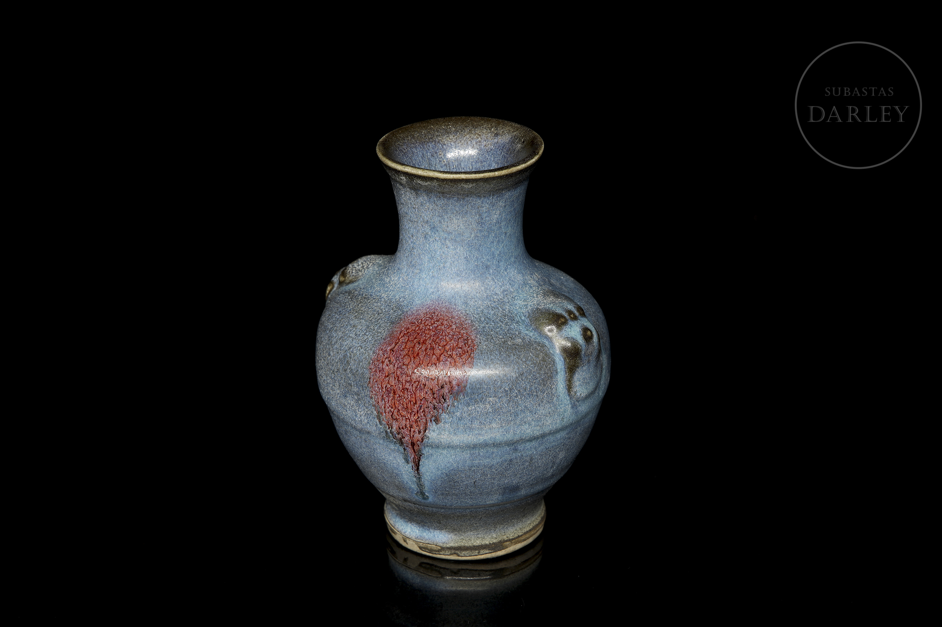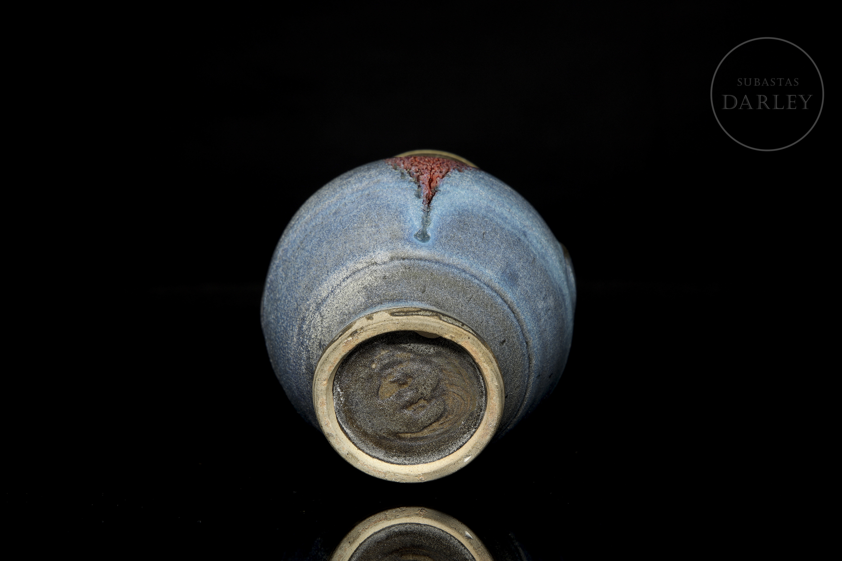 A vase with a cylindrical foot and a convex body, flanked by two small handles in relief, in the shape of a beast, arranged at shoulder height, which narrows to form an elongated flaring neck. Covered with a thick greyish-blue glaze with purple splashes.