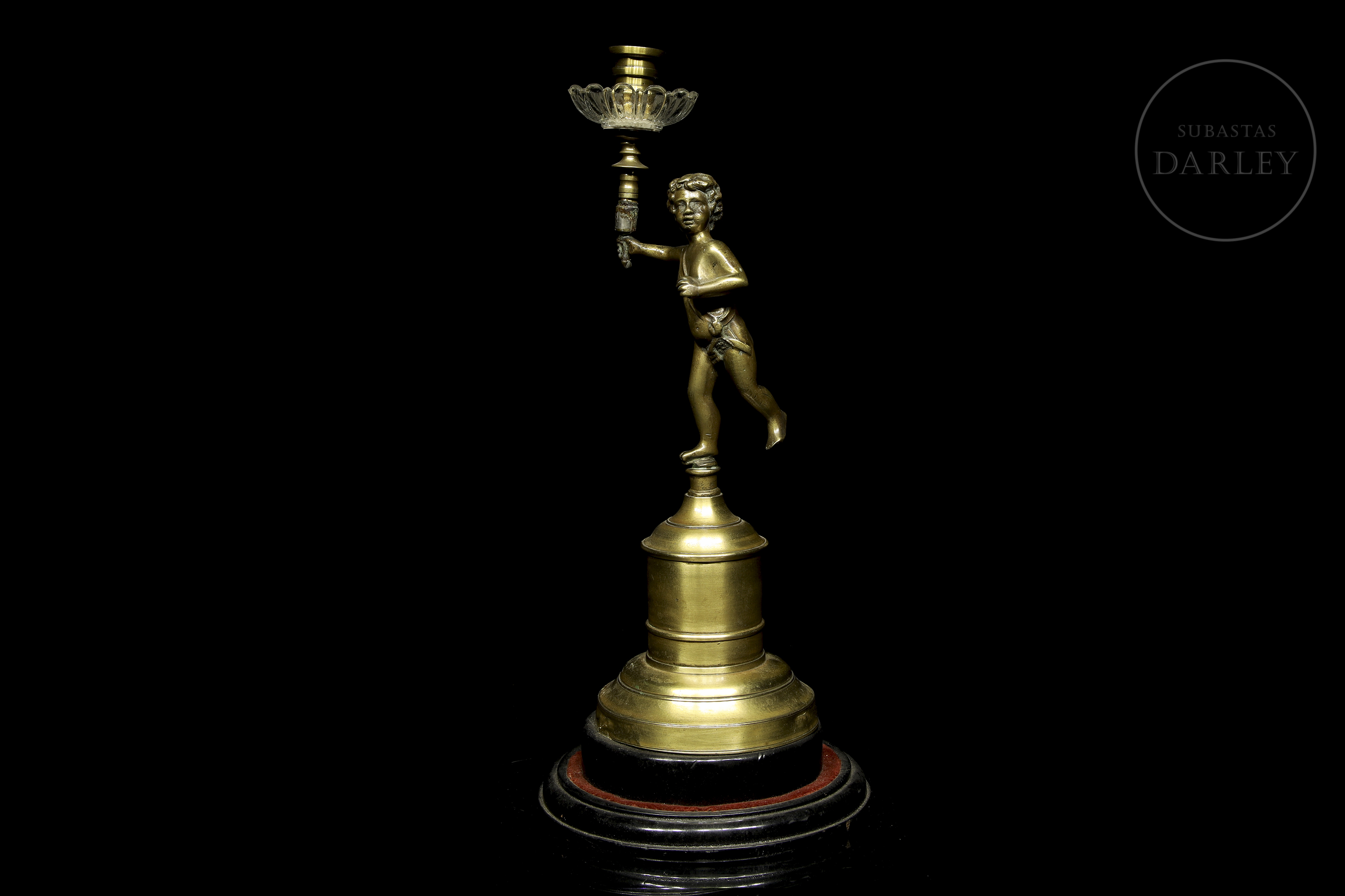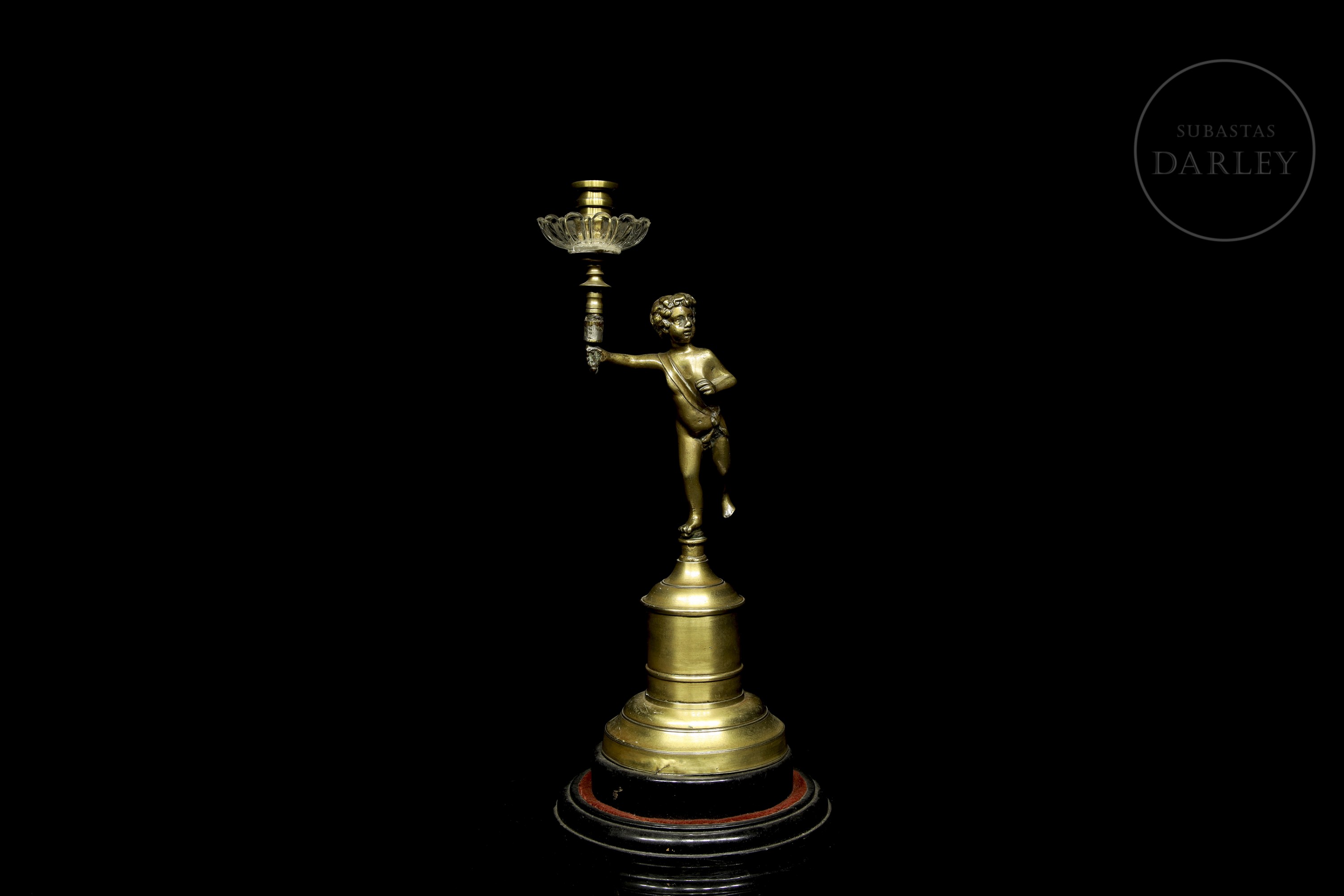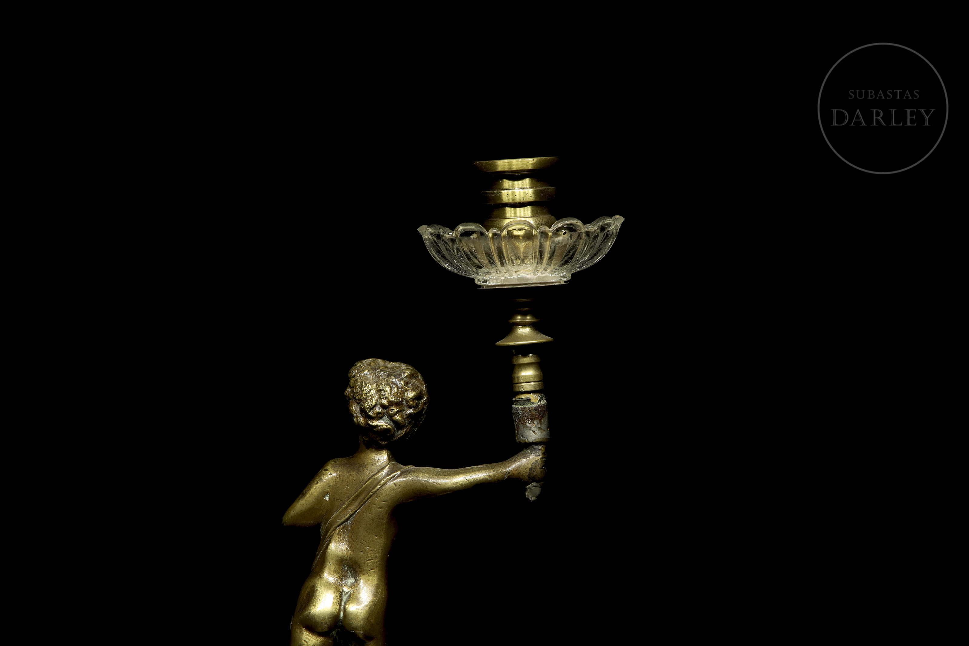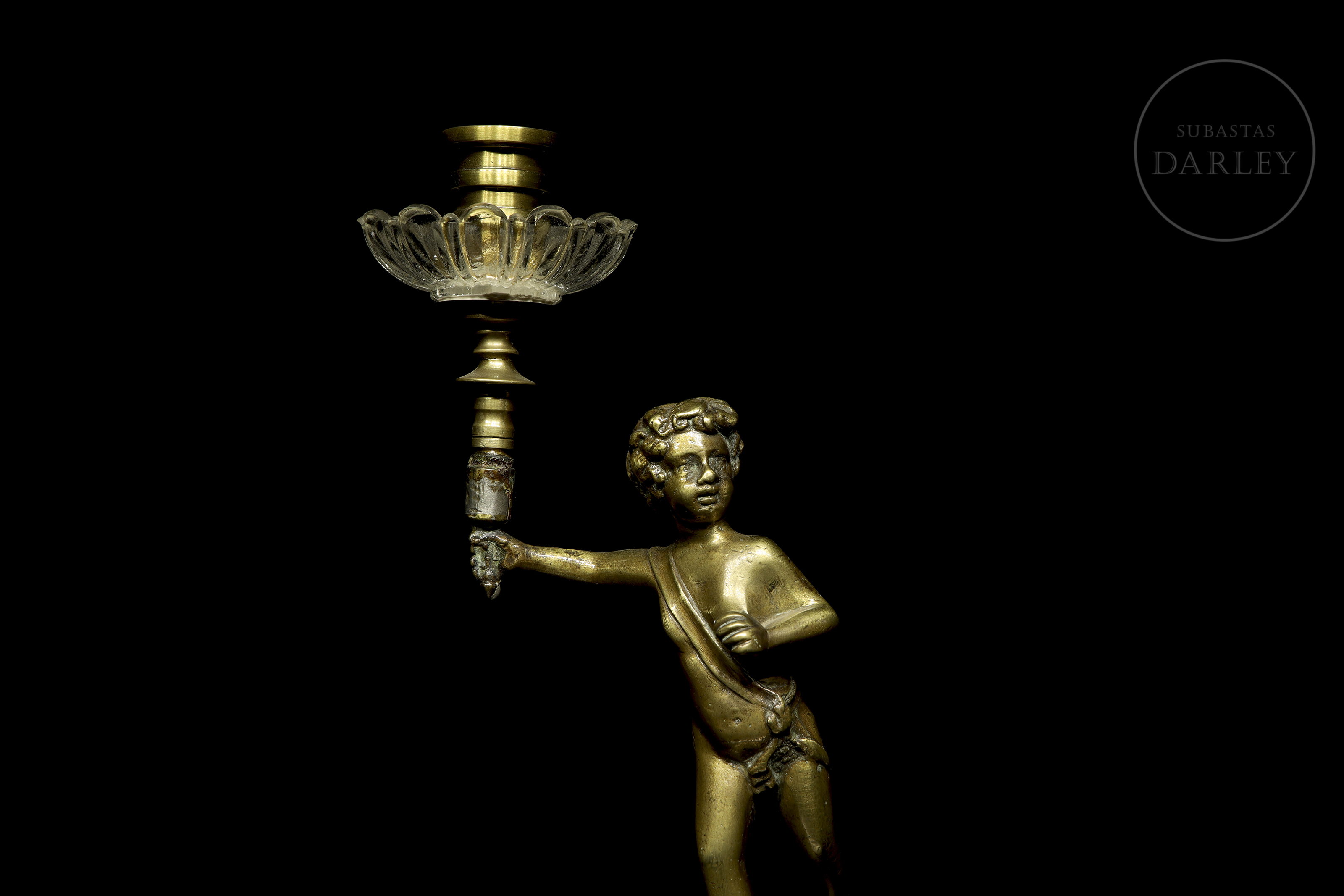 Small one-armed lamp in gold-effect patinated metal, decorated with the figure of a little boy.