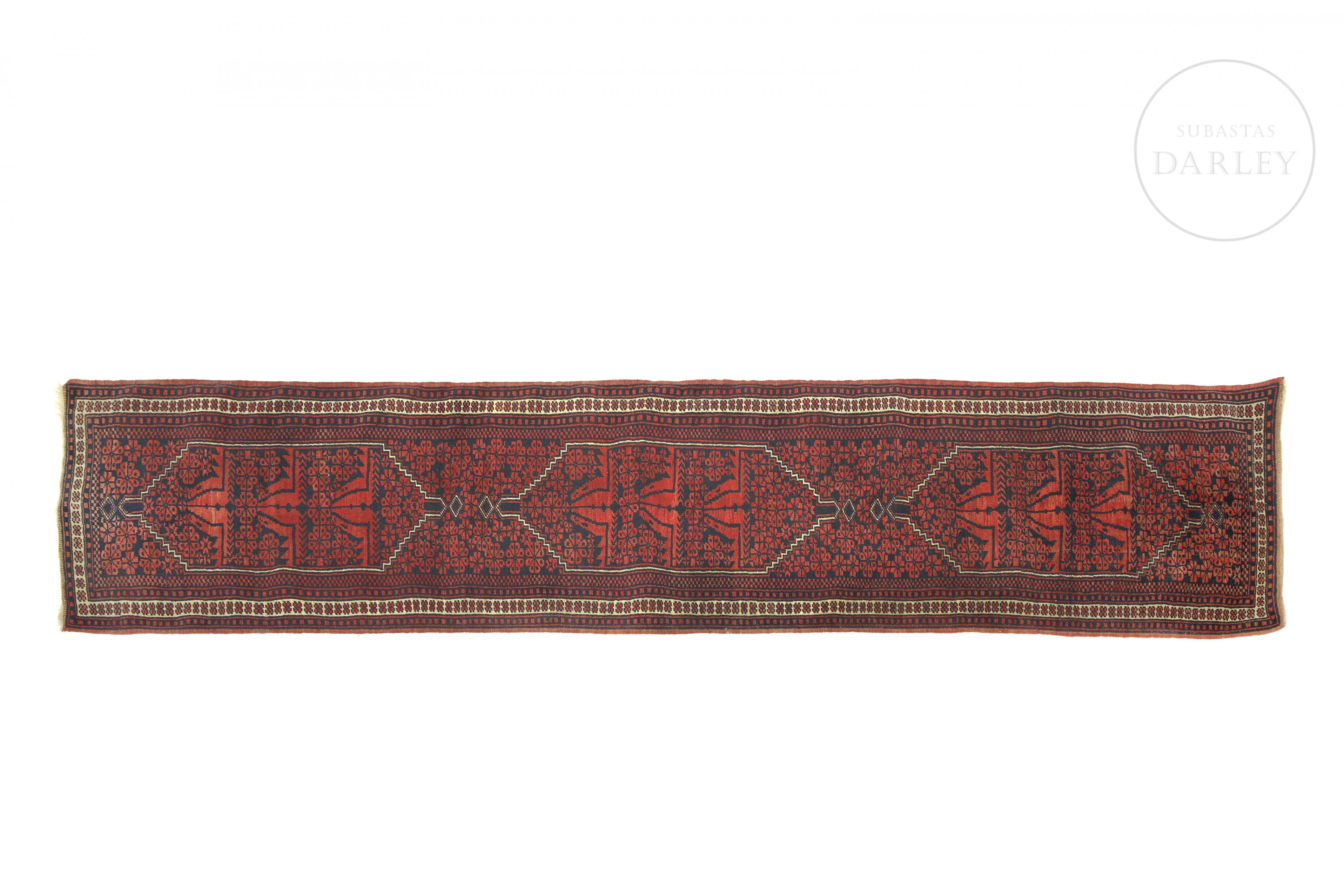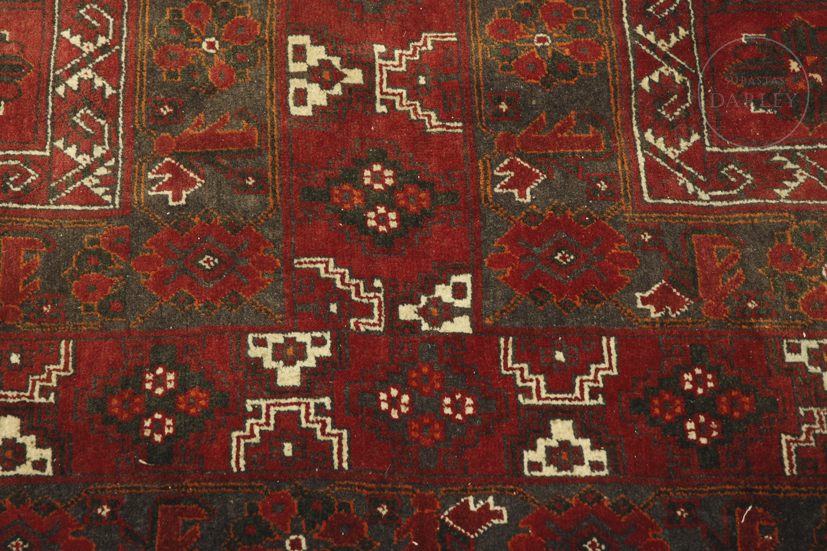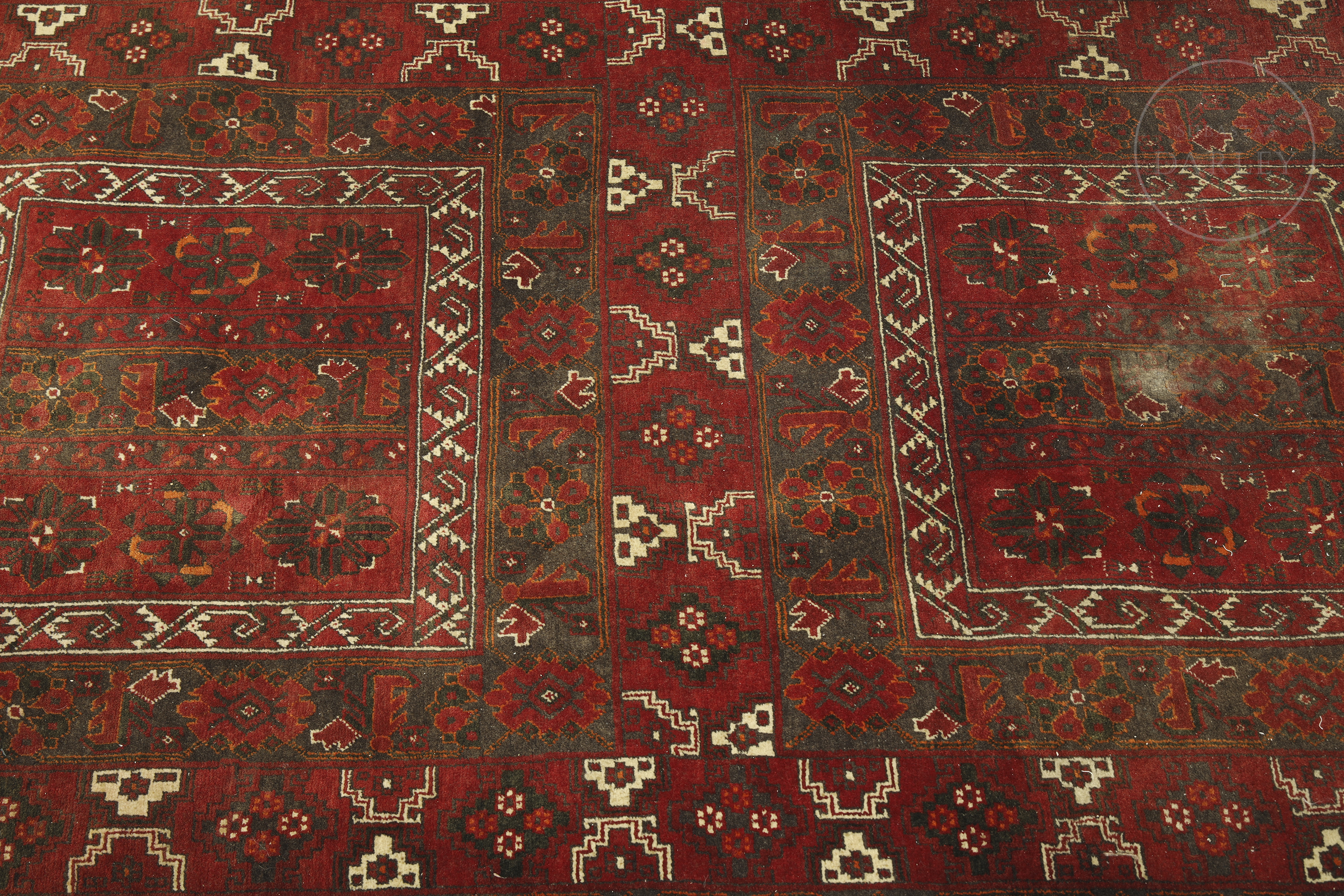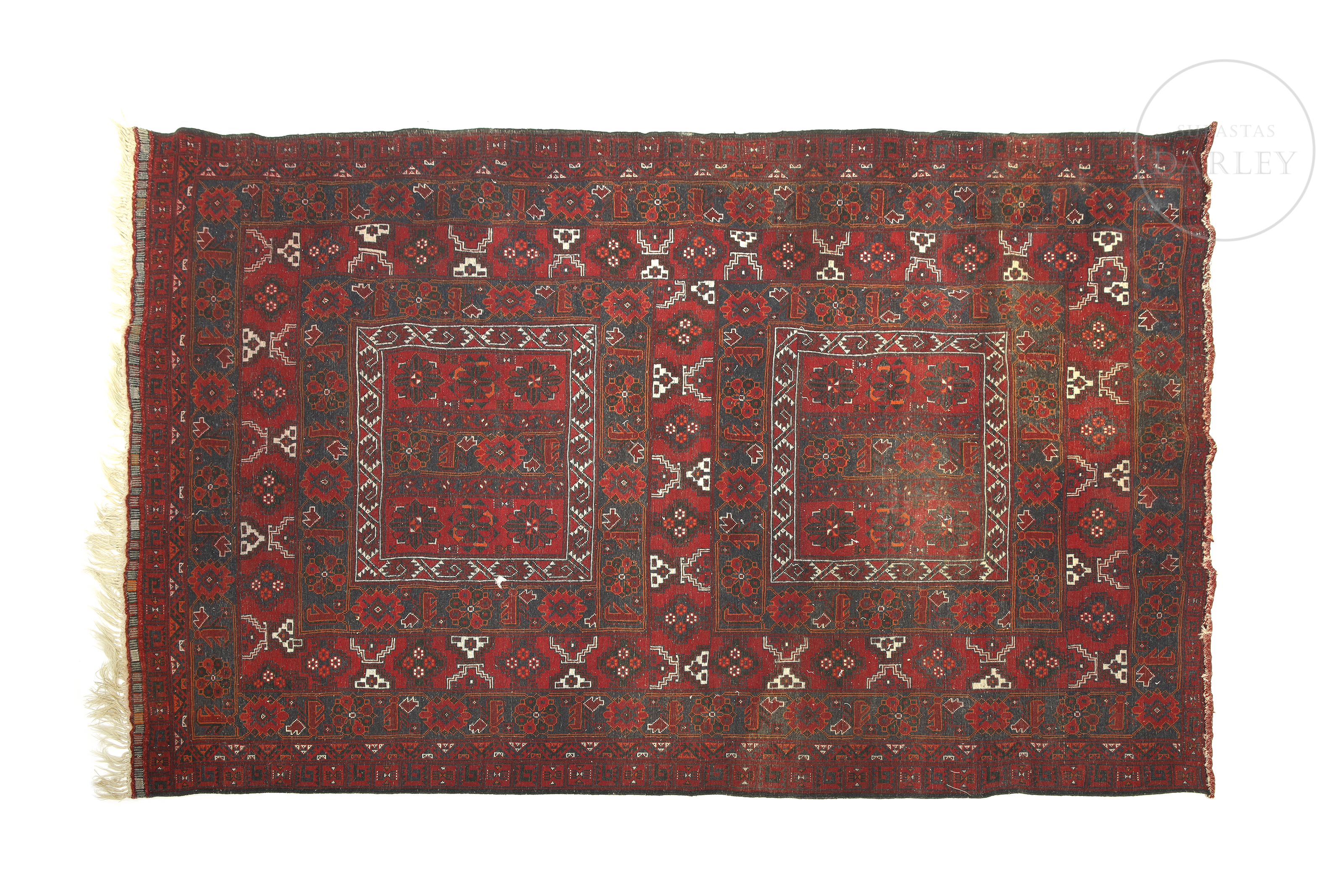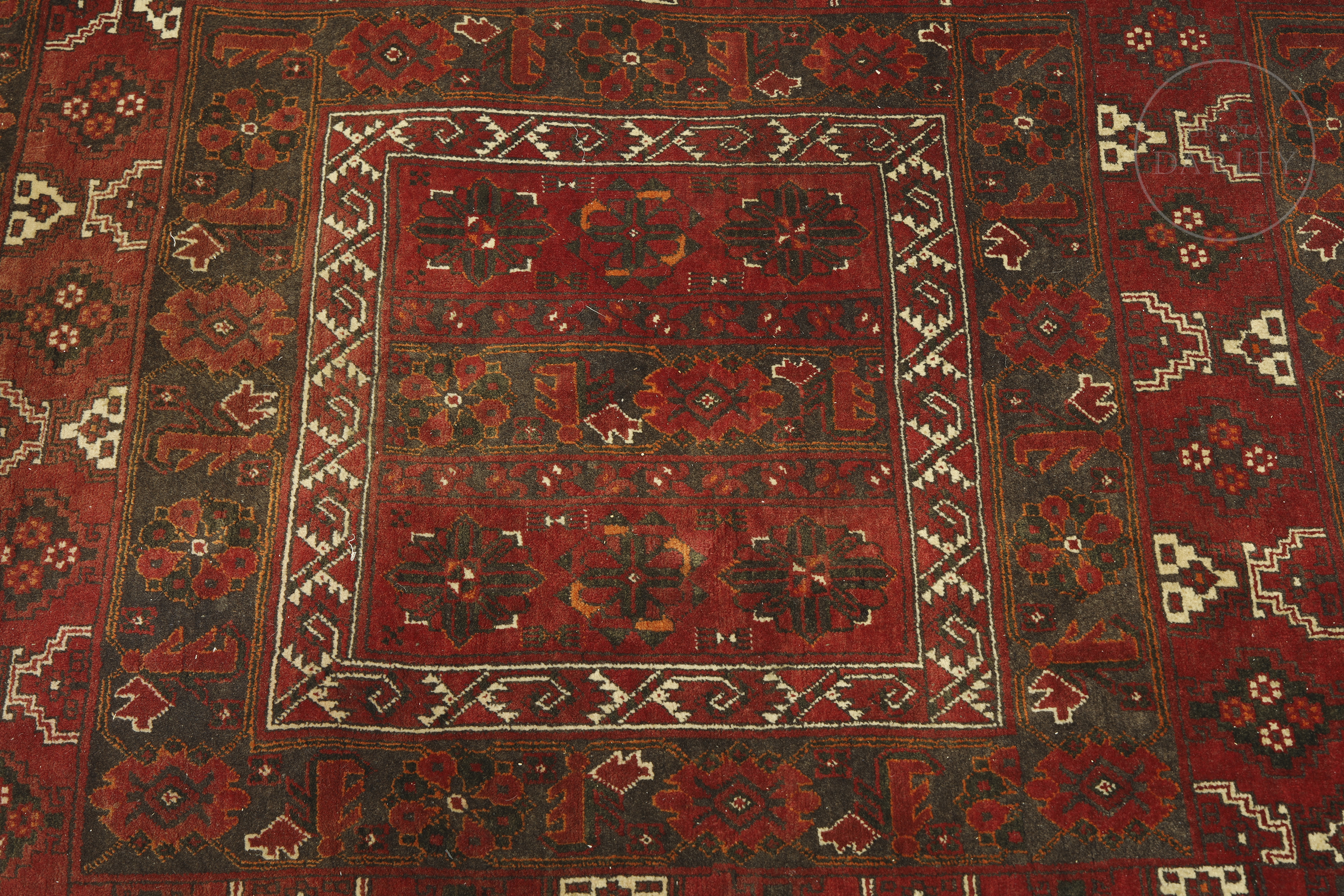 Woollen carpet, decorated with Persian-style motifs in reddish, ochre and blue. With wear.