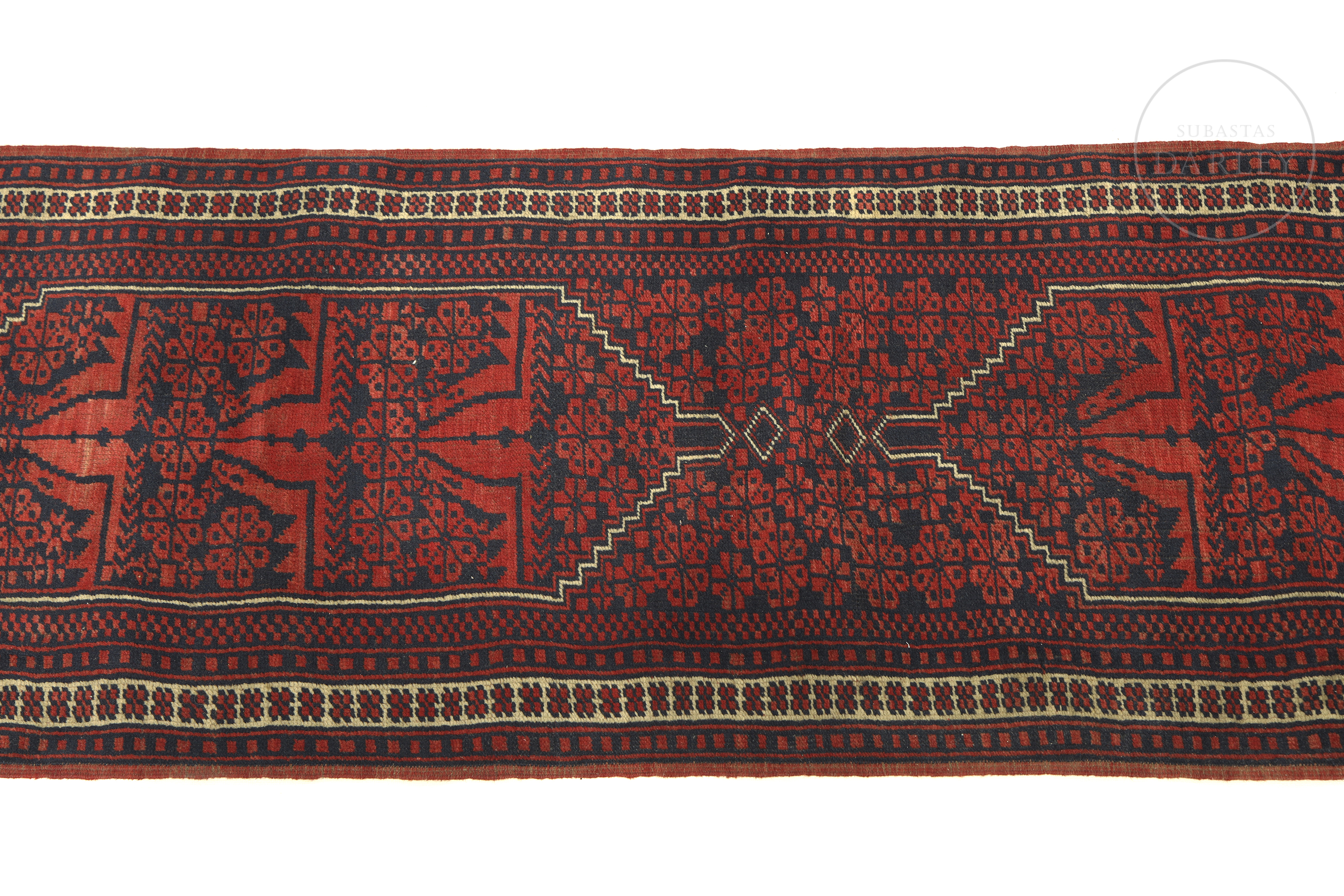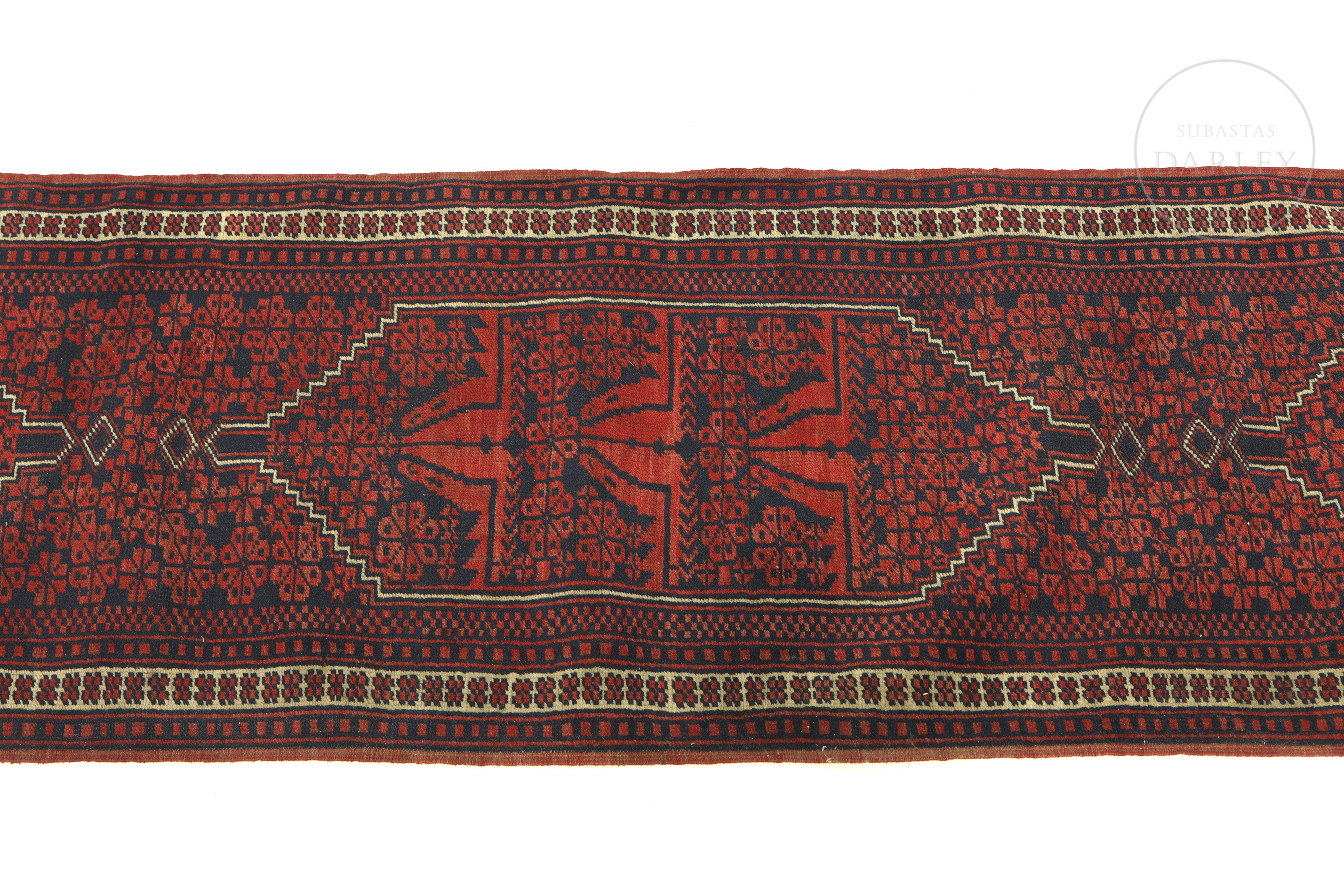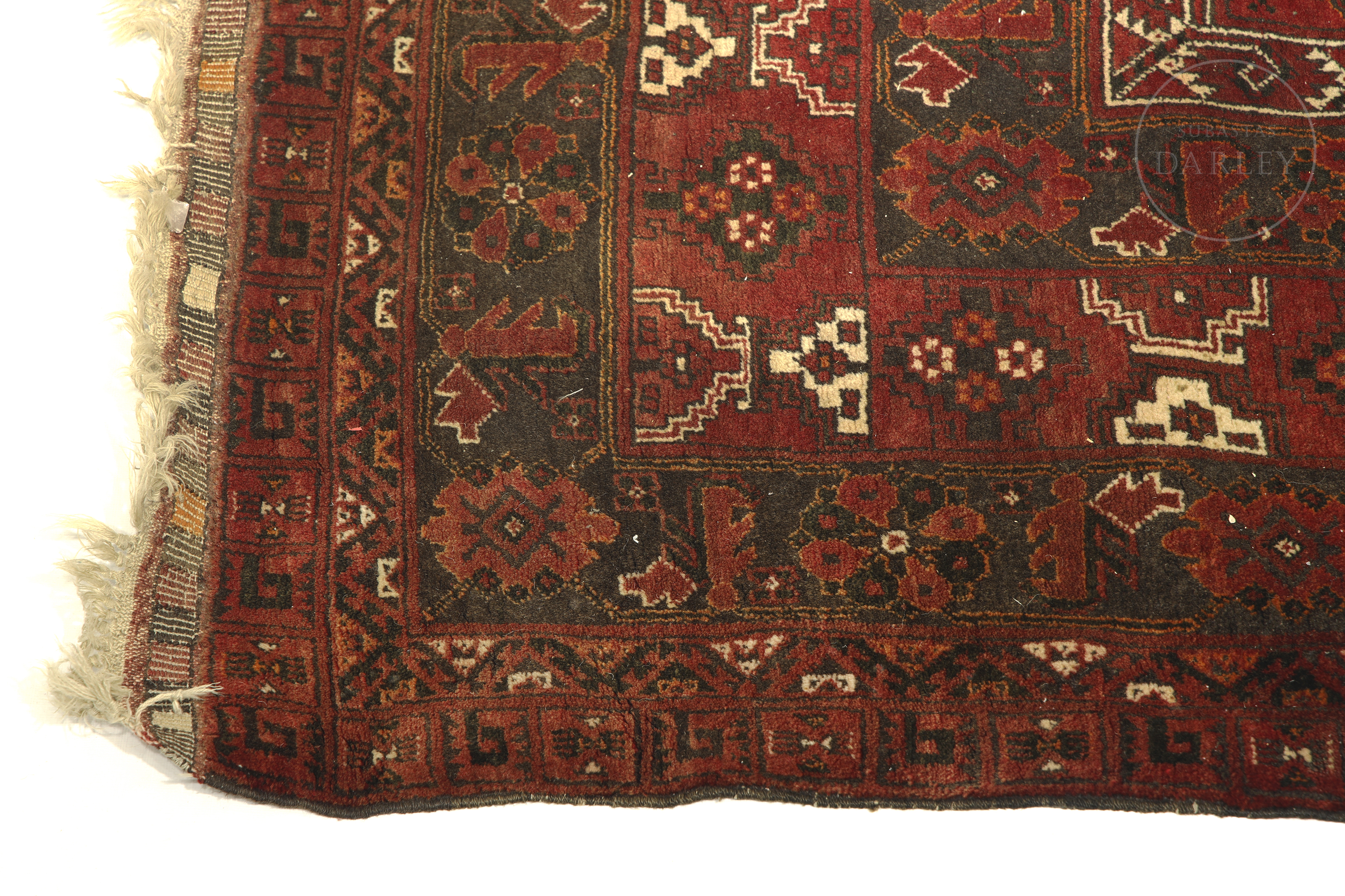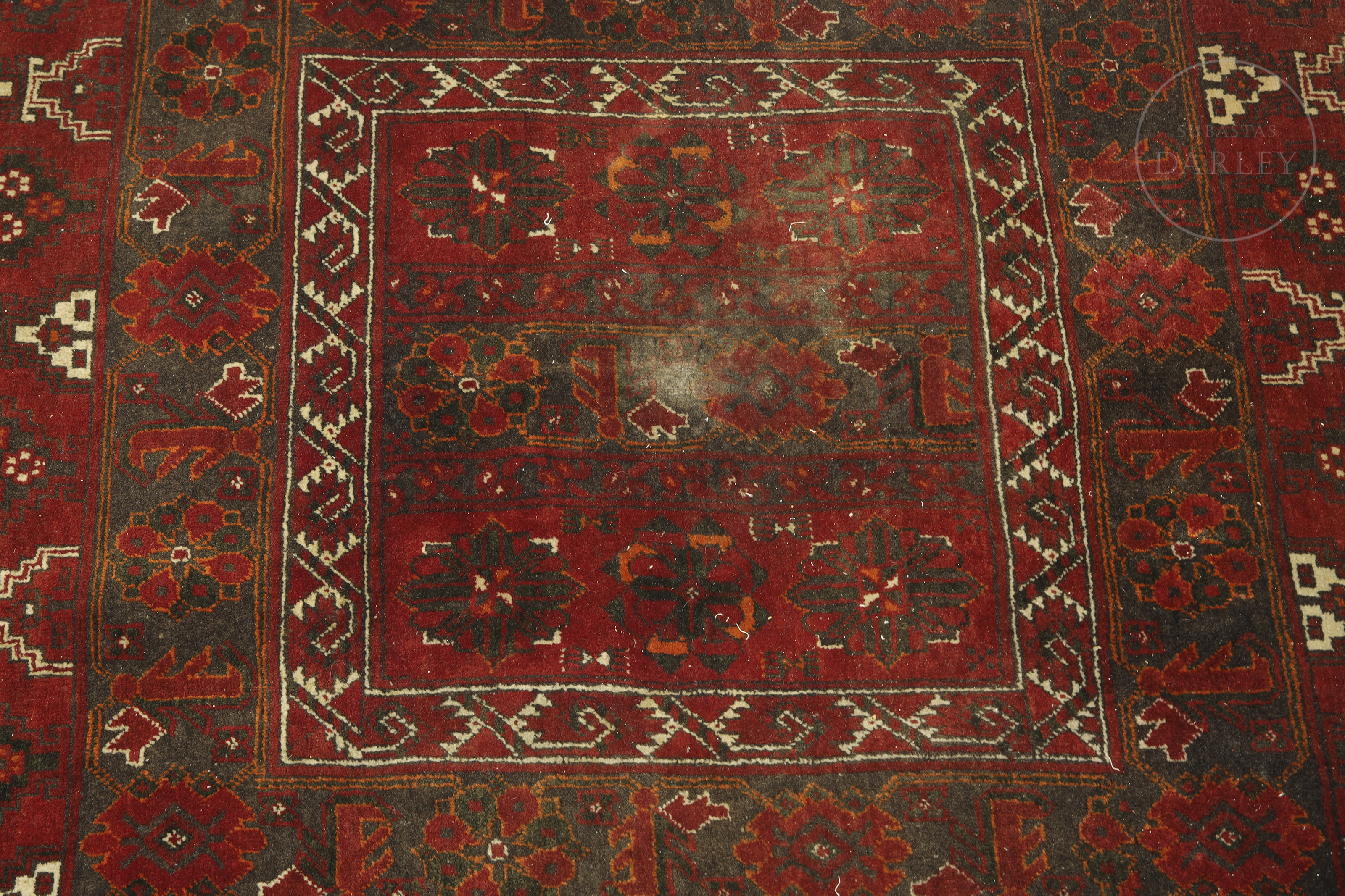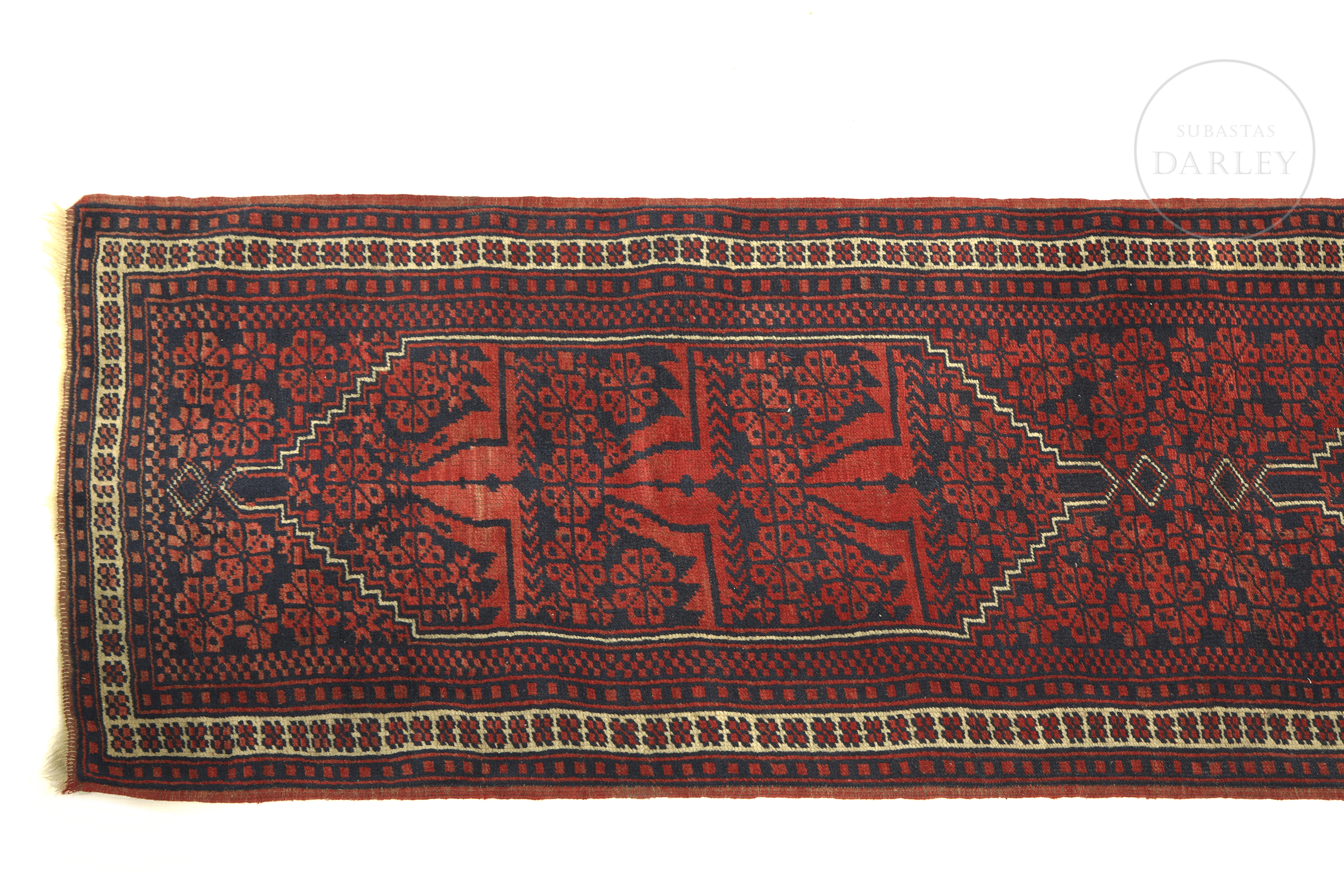 Woollen carpet, decorated with Persian-style motifs in reddish, ochre and blue. With wear.