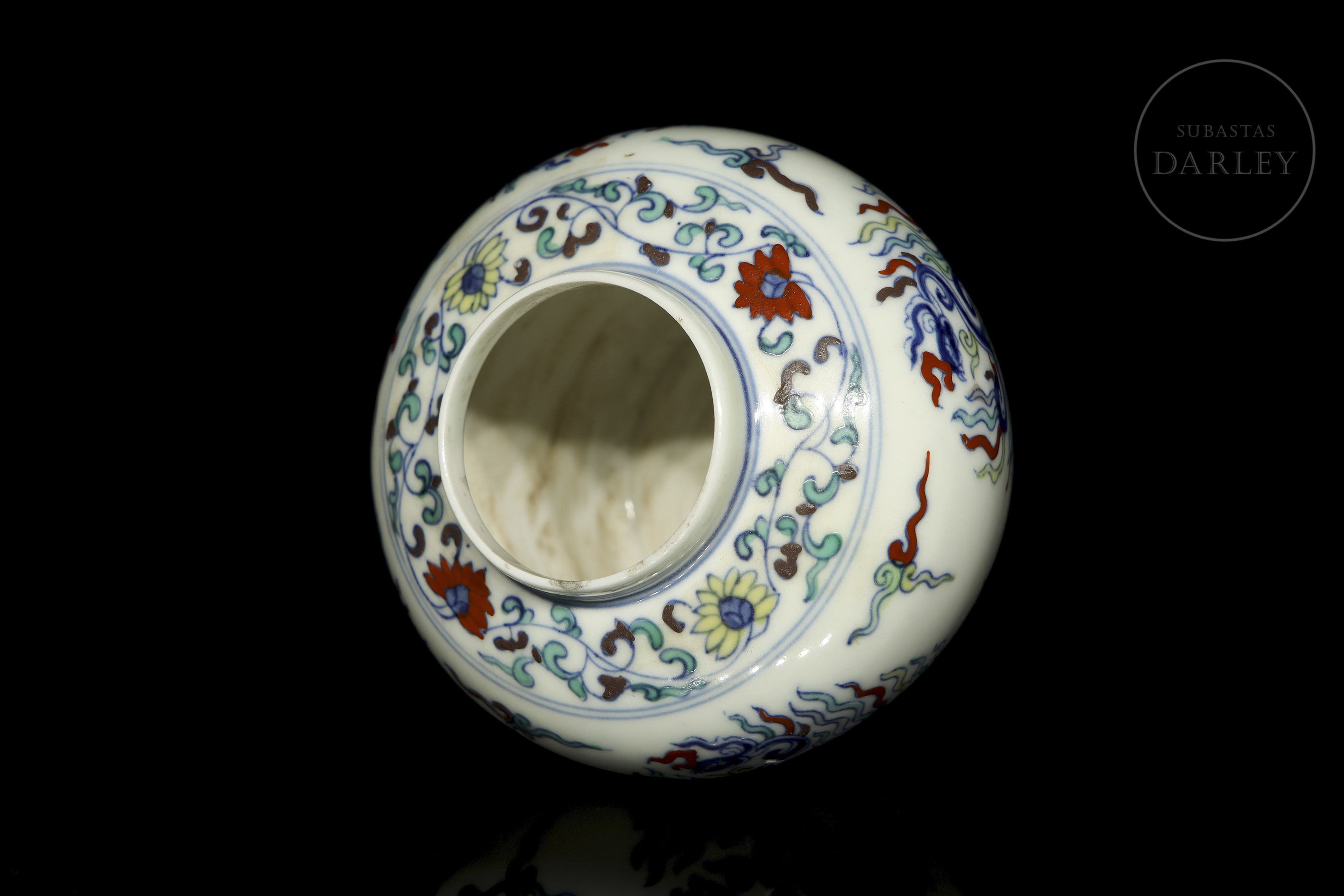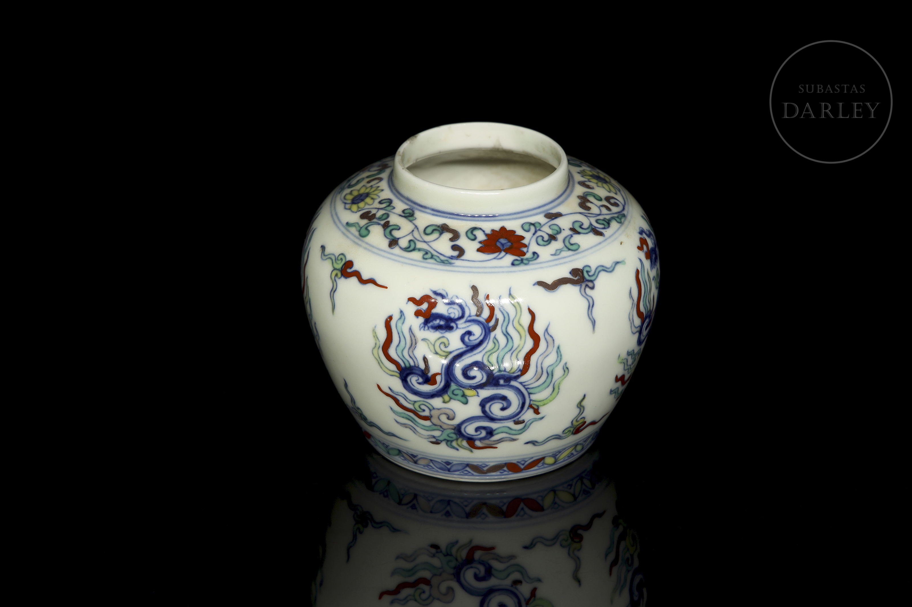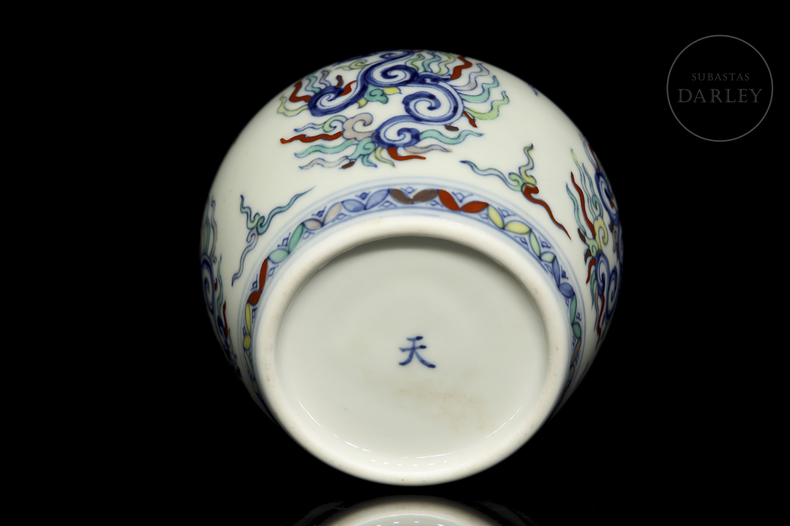 Porcelain modelled and decorated in wucai enamels. The body features a continuous decoration of stylised phoenixes in flight among multicoloured clouds. Below the neck, a decorative band with stylised flowers and sinuous stems runs around the perimeter. At the base is the character ‘天’ in blue underglaze.