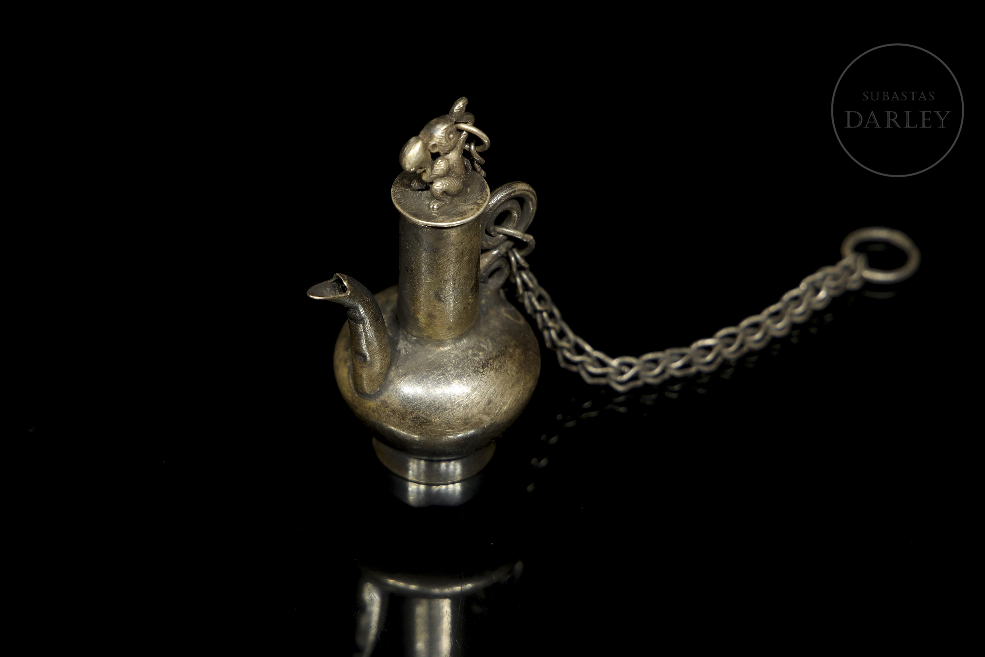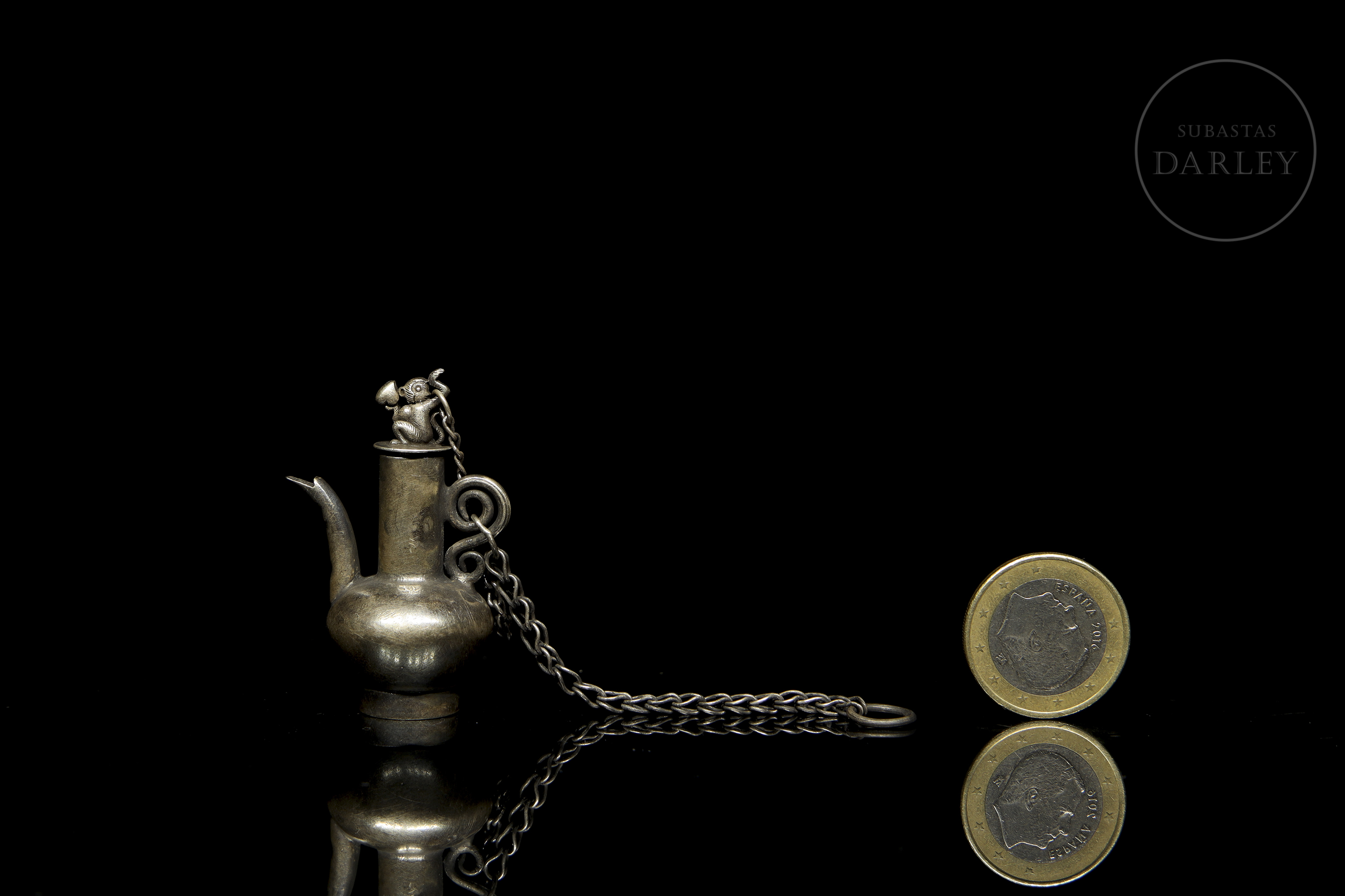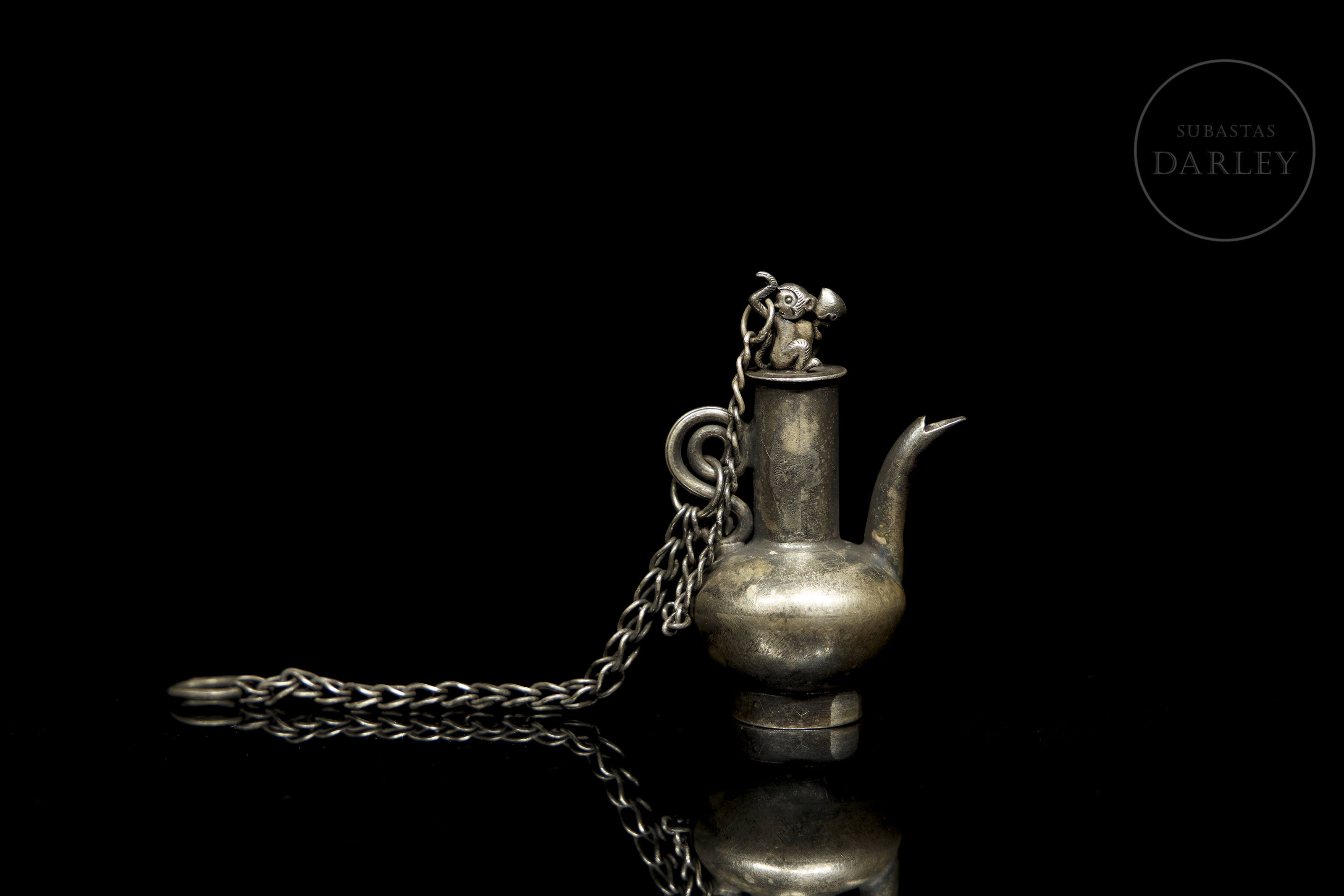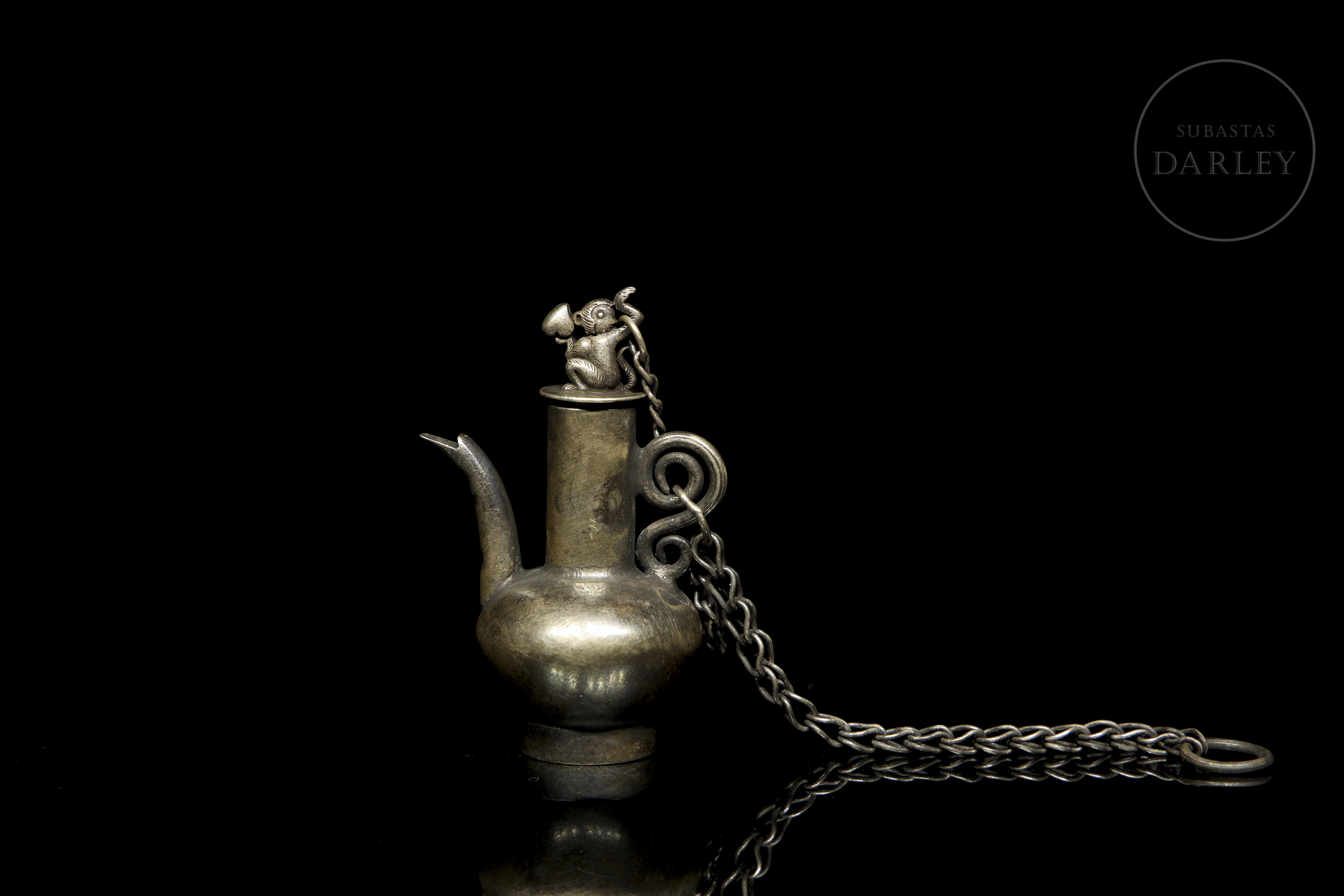A small silver jug with a rounded body that stands on a short flared foot. It has a long tubular neck, a curved mouthpiece and a spiral handle that joins the body and neck. The piece is surmounted by a thin lid, on which is placed the image of a small monkey, its tail curled up, its limbs bent and its face turned upside down, while holding a large peach fruit in its hands. The lid is attached to the handle by a long link chain.