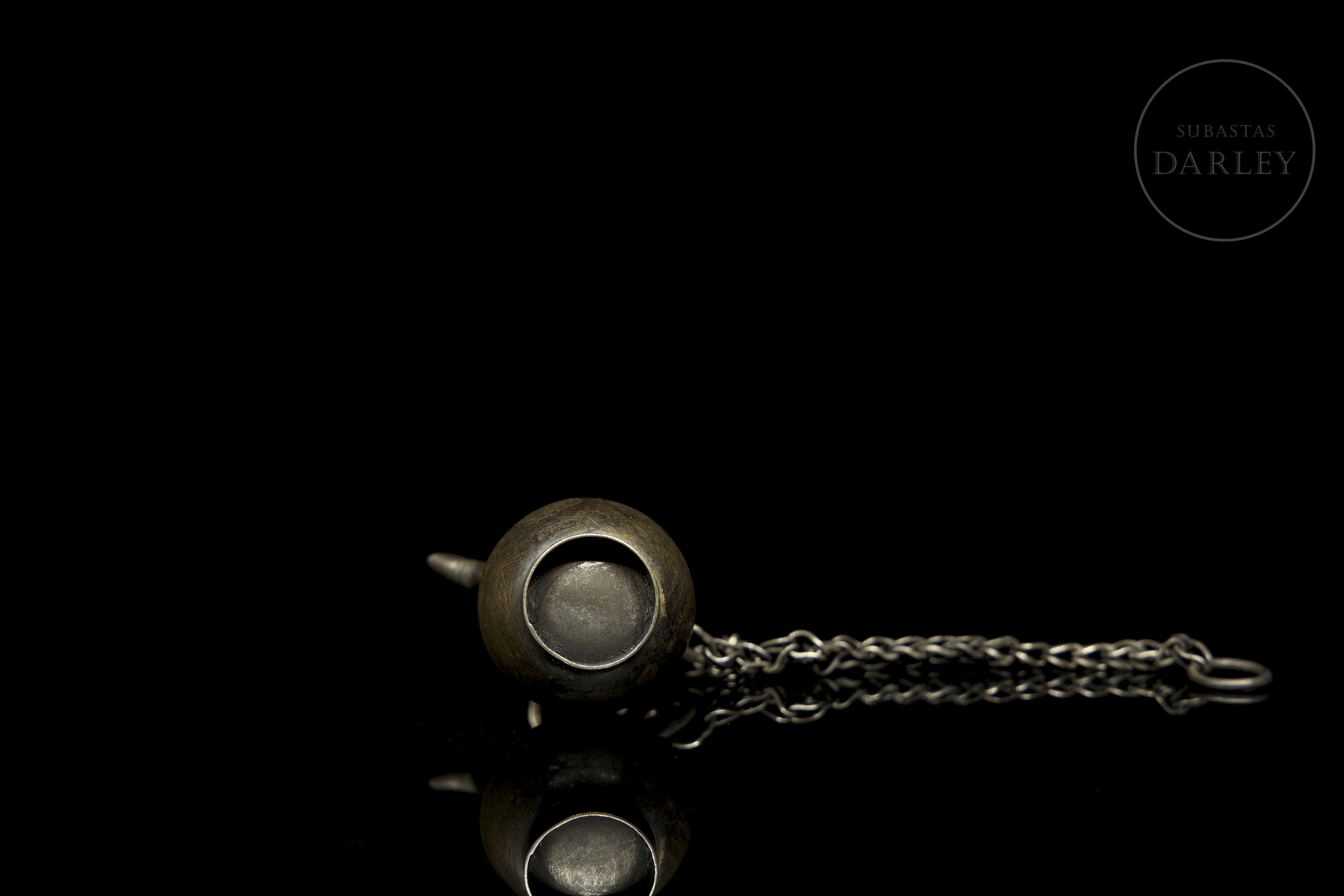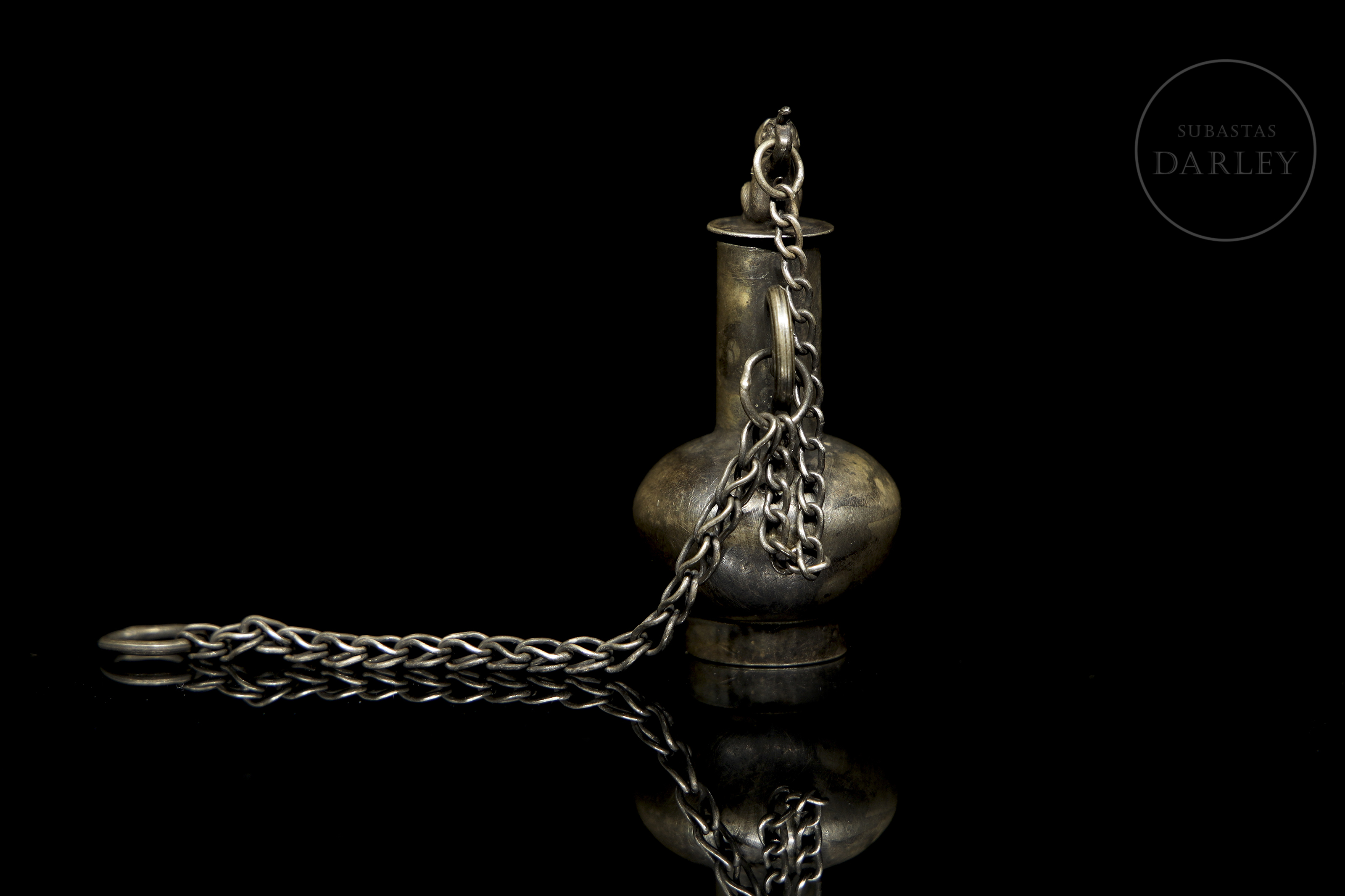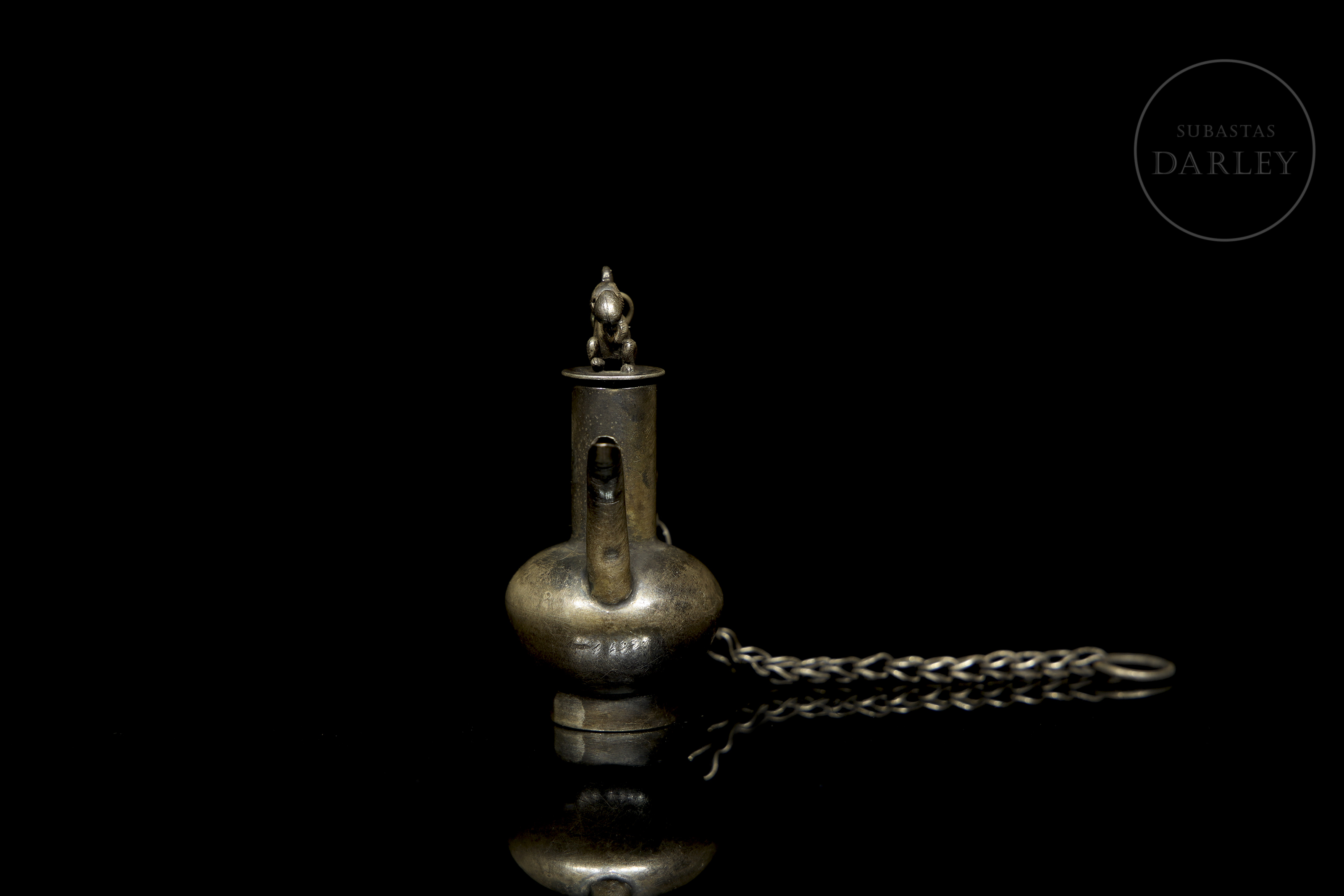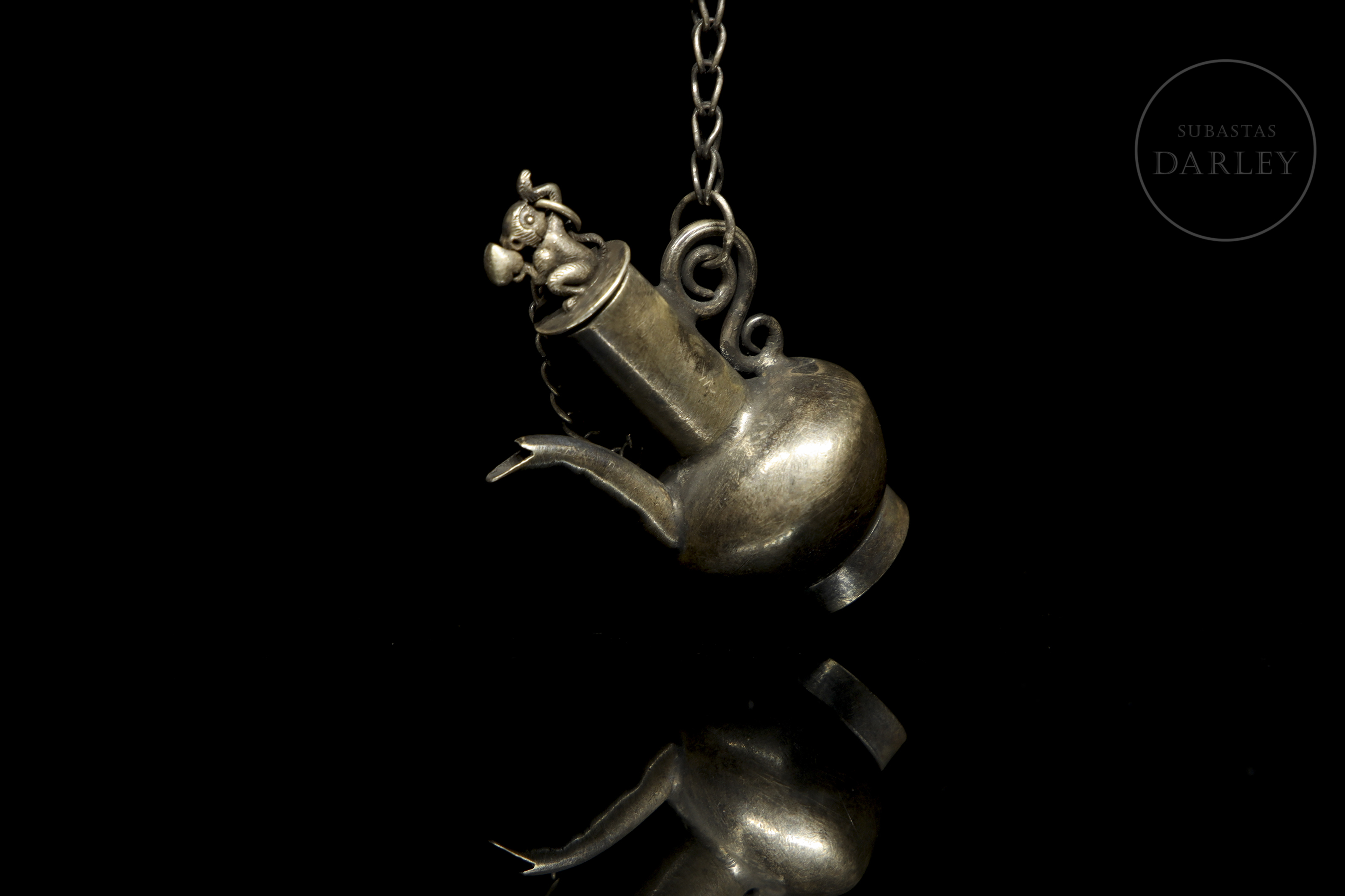 A small silver jug with a rounded body that stands on a short flared foot. It has a long tubular neck, a curved mouthpiece and a spiral handle that joins the body and neck. The piece is surmounted by a thin lid, on which is placed the image of a small monkey, its tail curled up, its limbs bent and its face turned upside down, while holding a large peach fruit in its hands. The lid is attached to the handle by a long link chain.