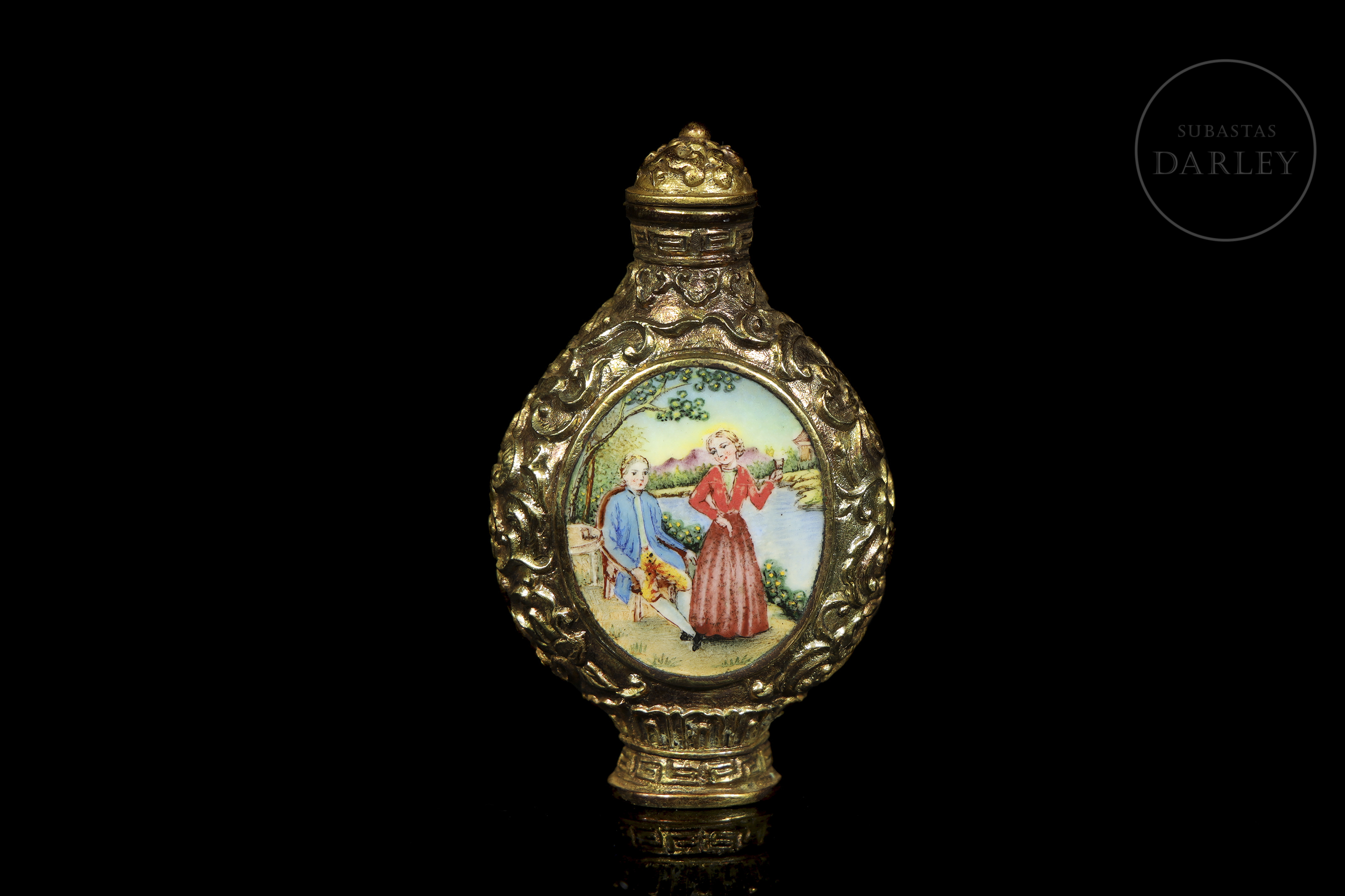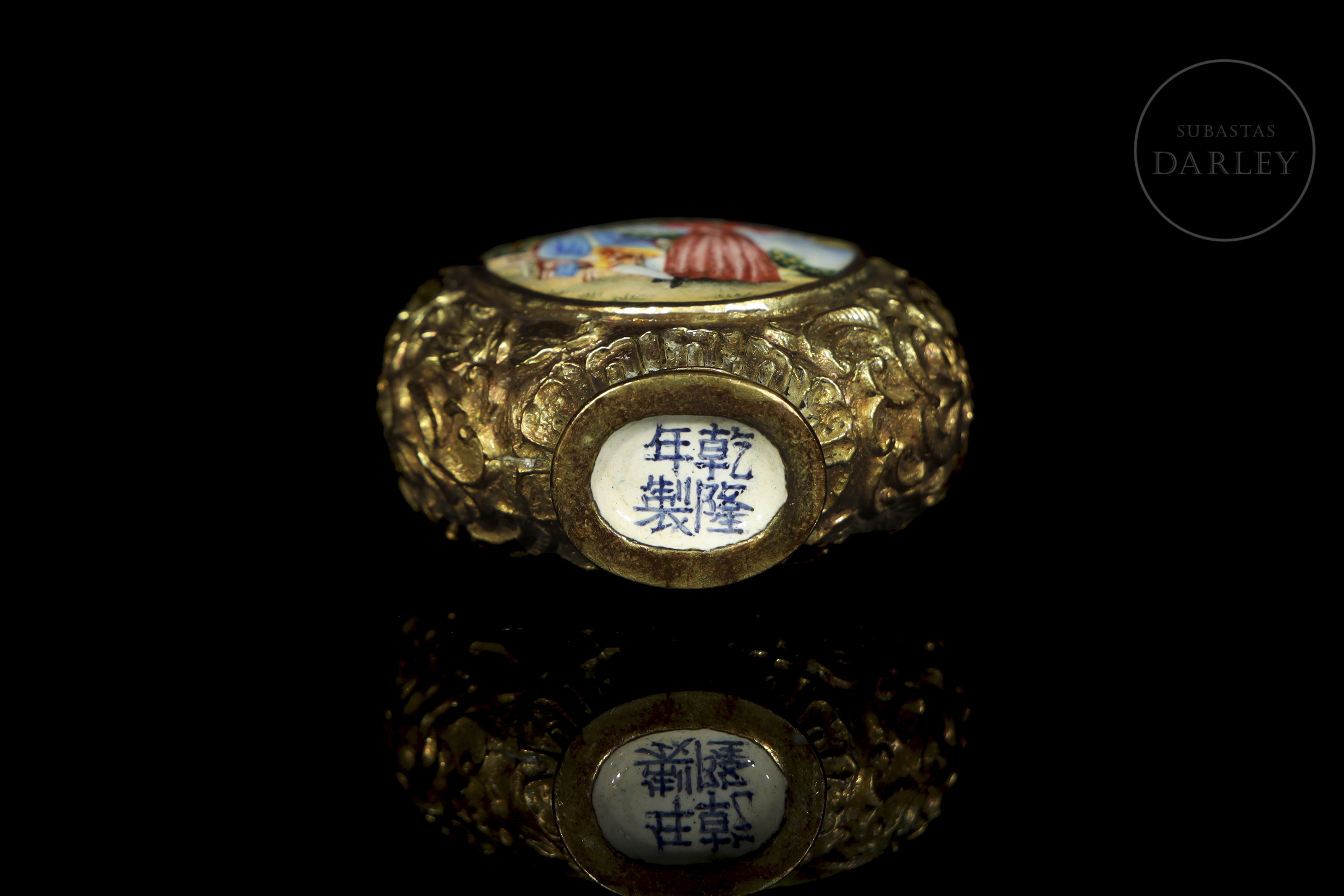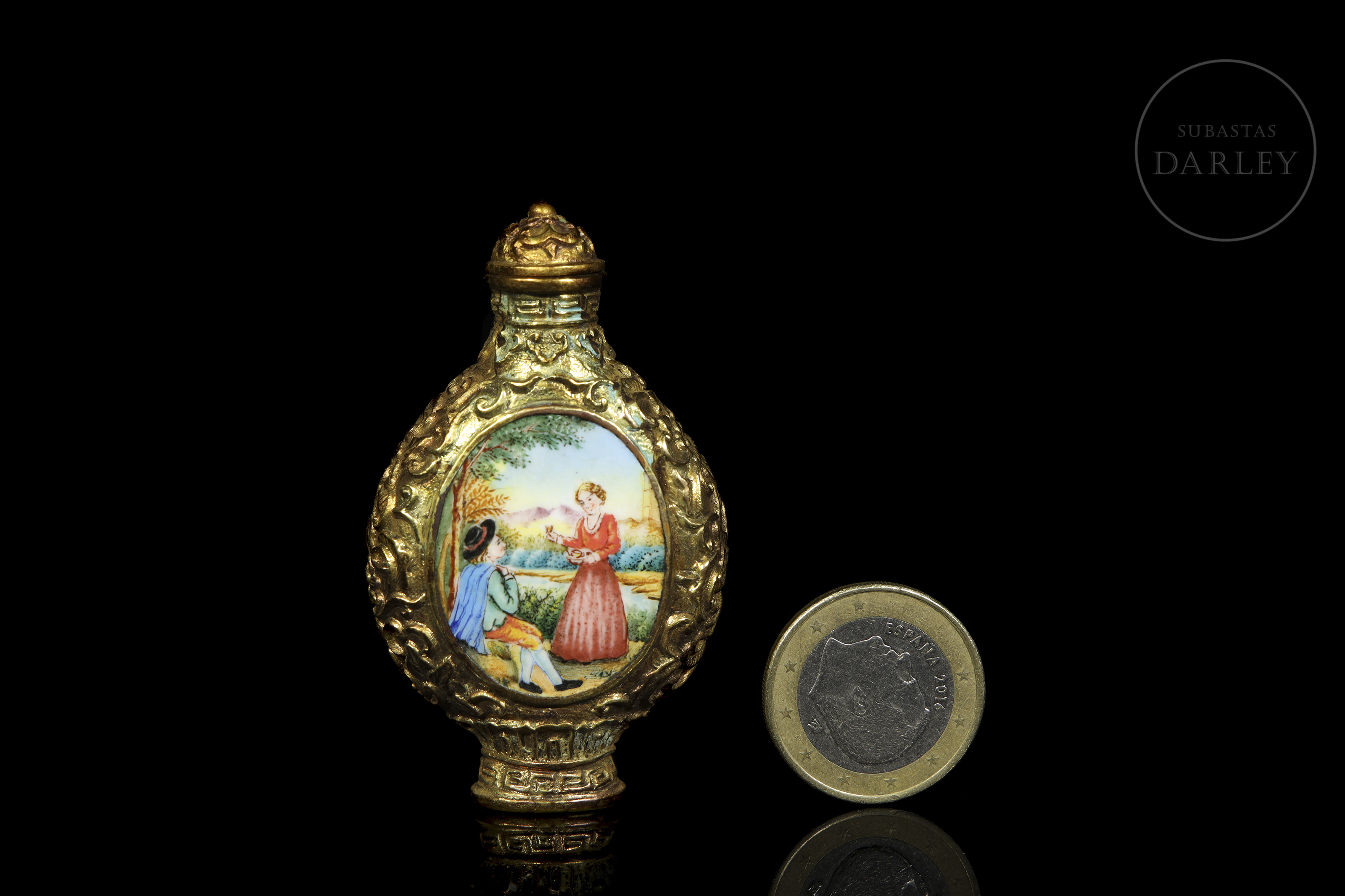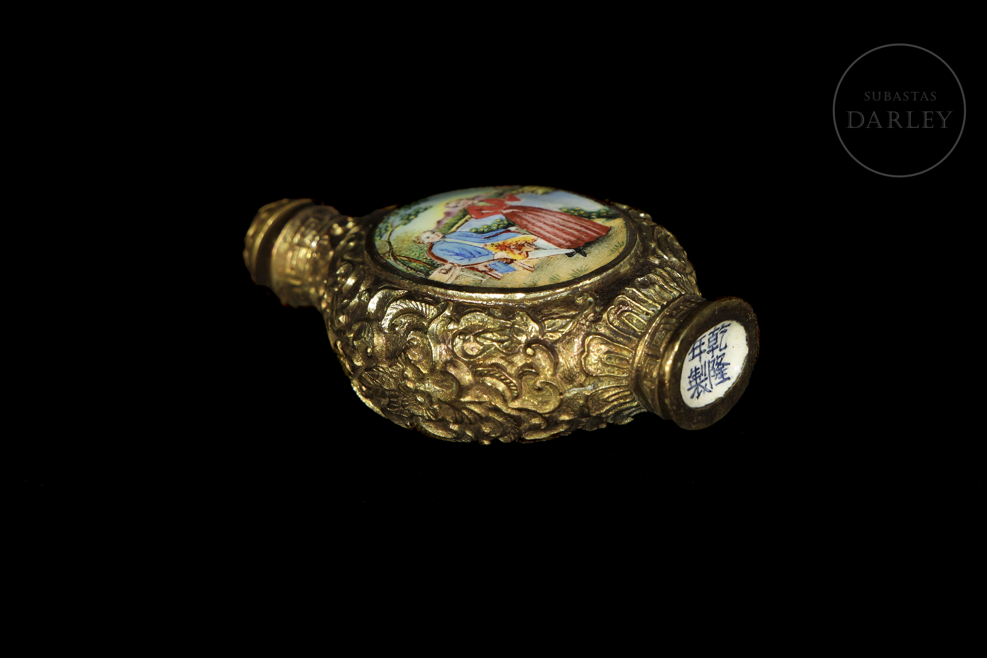A small gilt-metal snuff bottle with a flared foot on which stands an oval body with a flat profile, crowned by a thin neck and a rounded mouth. It is decorated with two central medallions depicting a gallant scene, with a man and a lady of clear Western influence. The rest of the body is decorated with gilded reliefs of floral motifs and geometric spiral borders. On the base there is a four-character mark in blue enamel ‘乾隆年制’.