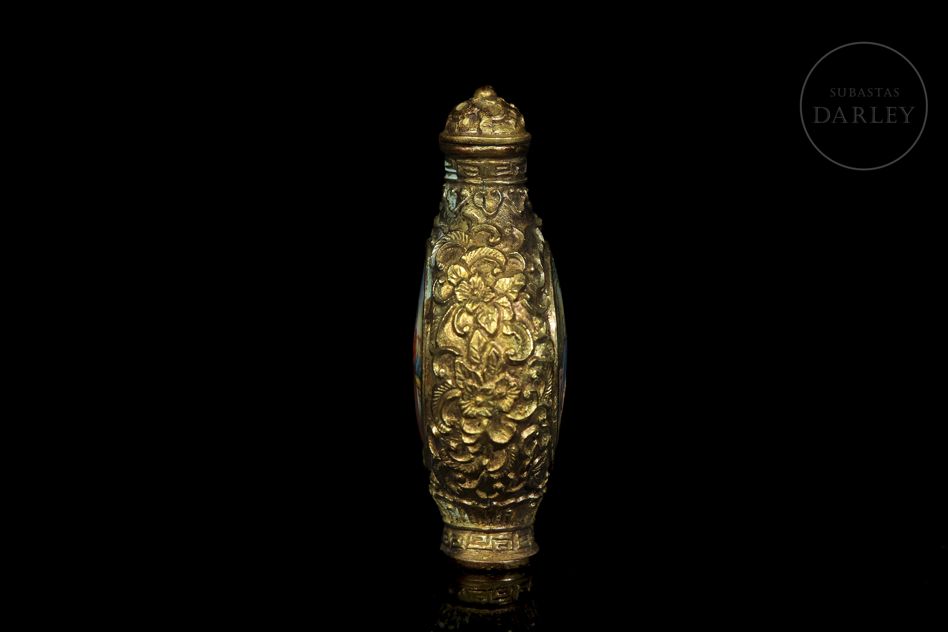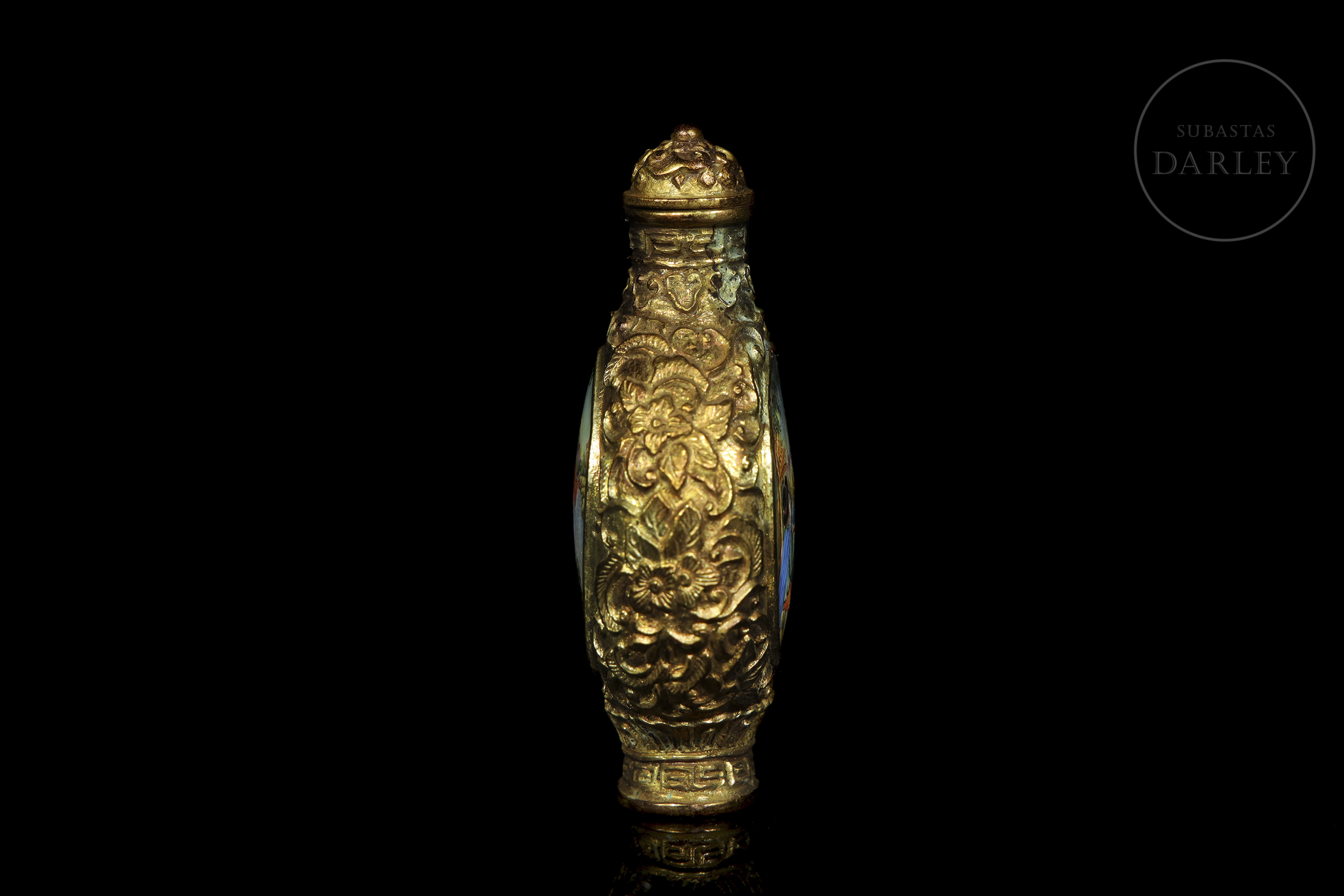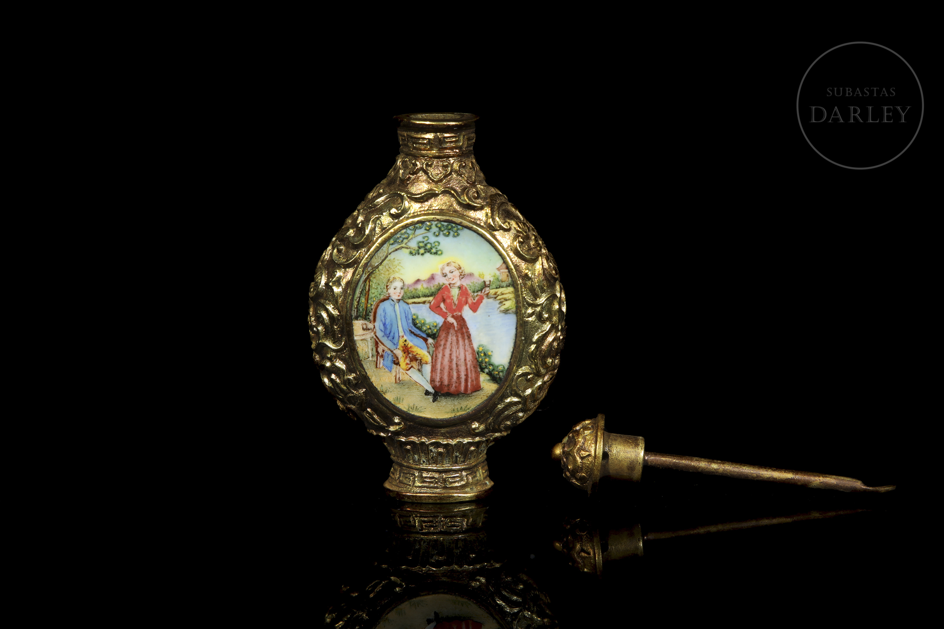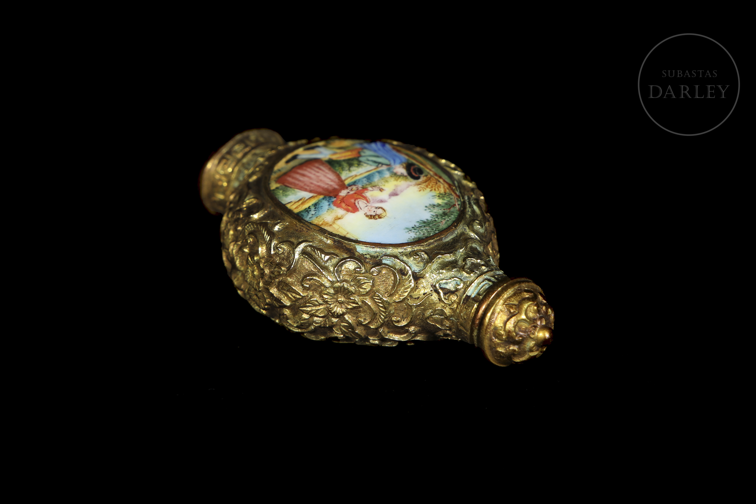 A small gilt-metal snuff bottle with a flared foot on which stands an oval body with a flat profile, crowned by a thin neck and a rounded mouth. It is decorated with two central medallions depicting a gallant scene, with a man and a lady of clear Western influence. The rest of the body is decorated with gilded reliefs of floral motifs and geometric spiral borders. On the base there is a four-character mark in blue enamel ‘乾隆年制’.